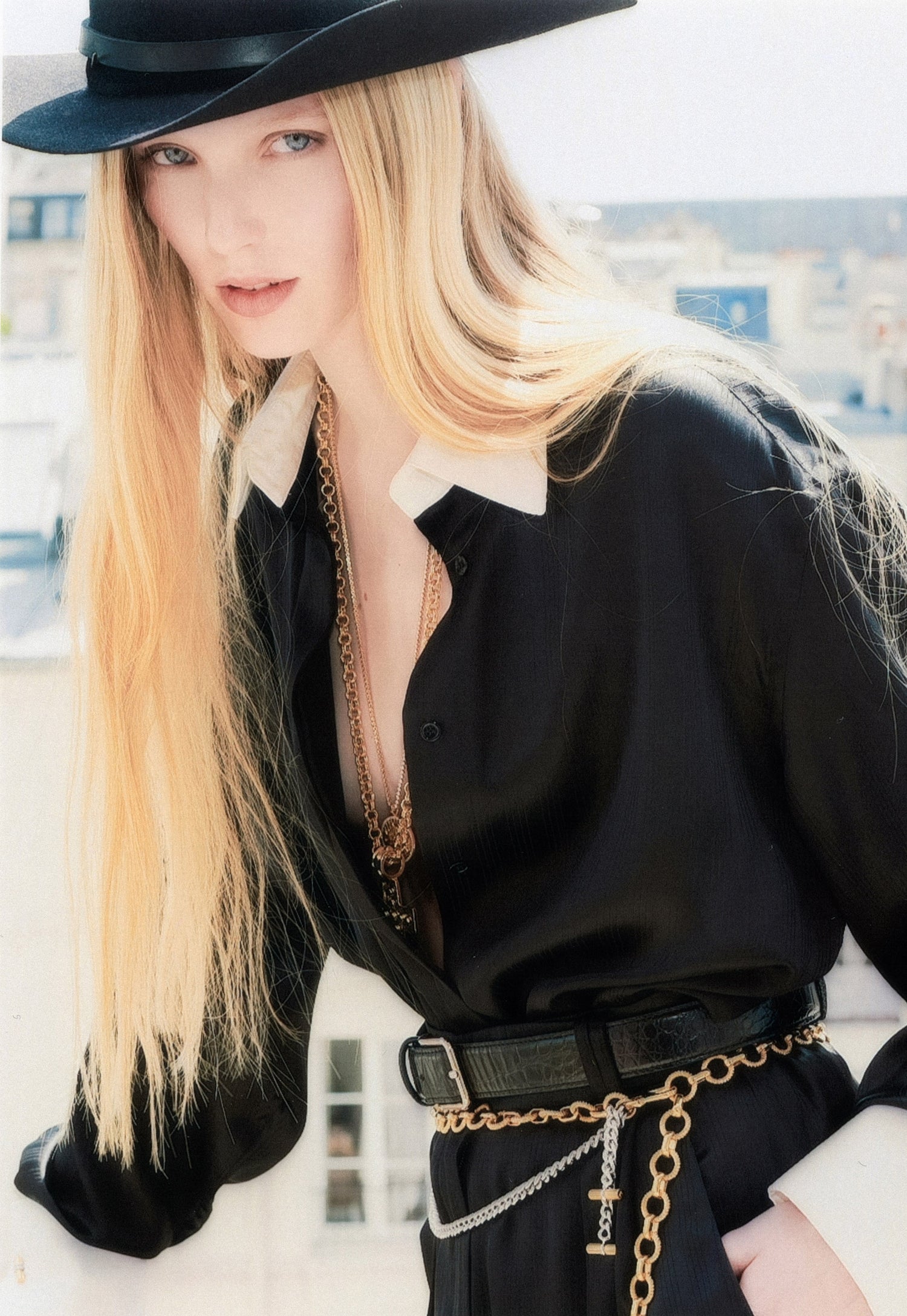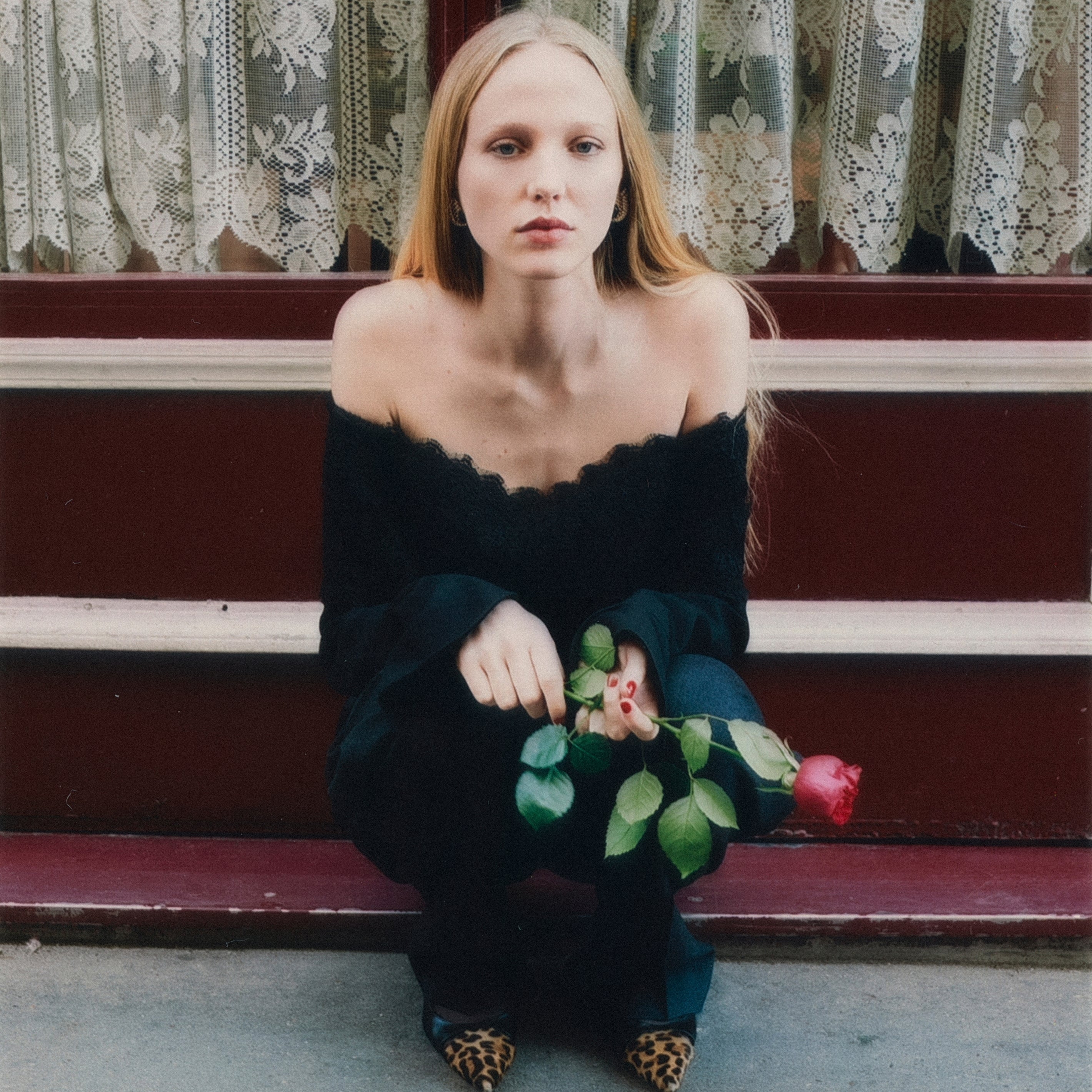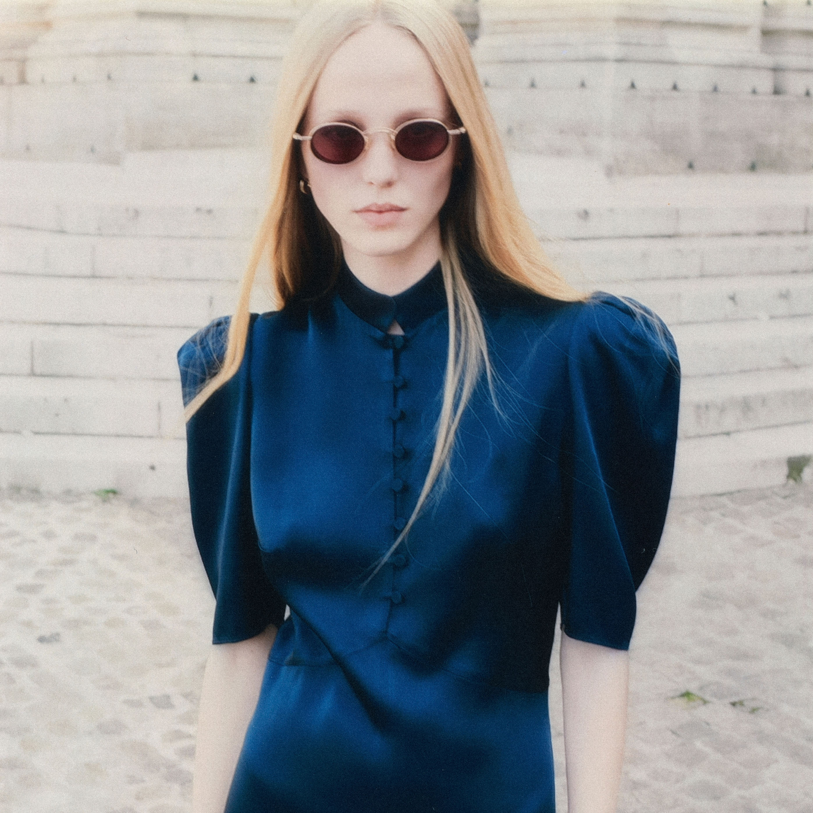 Cut in two variations, a top and a long dress, it is defined by its plunging collar and delicate Japanese lace, a tension of sharp lines and intricate softness. In porcelain or deep black, The Tildi carries a dark, moody allure, always balanced with elegance.