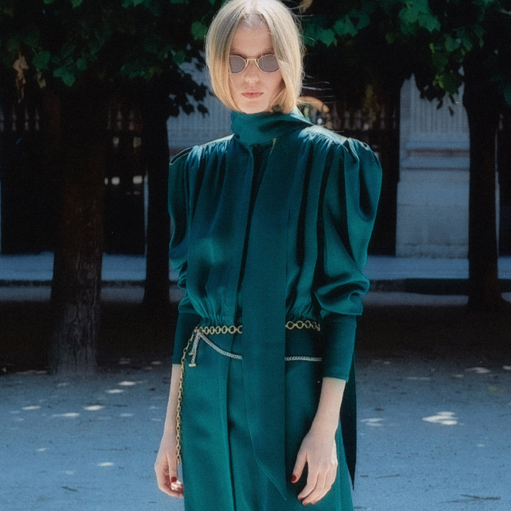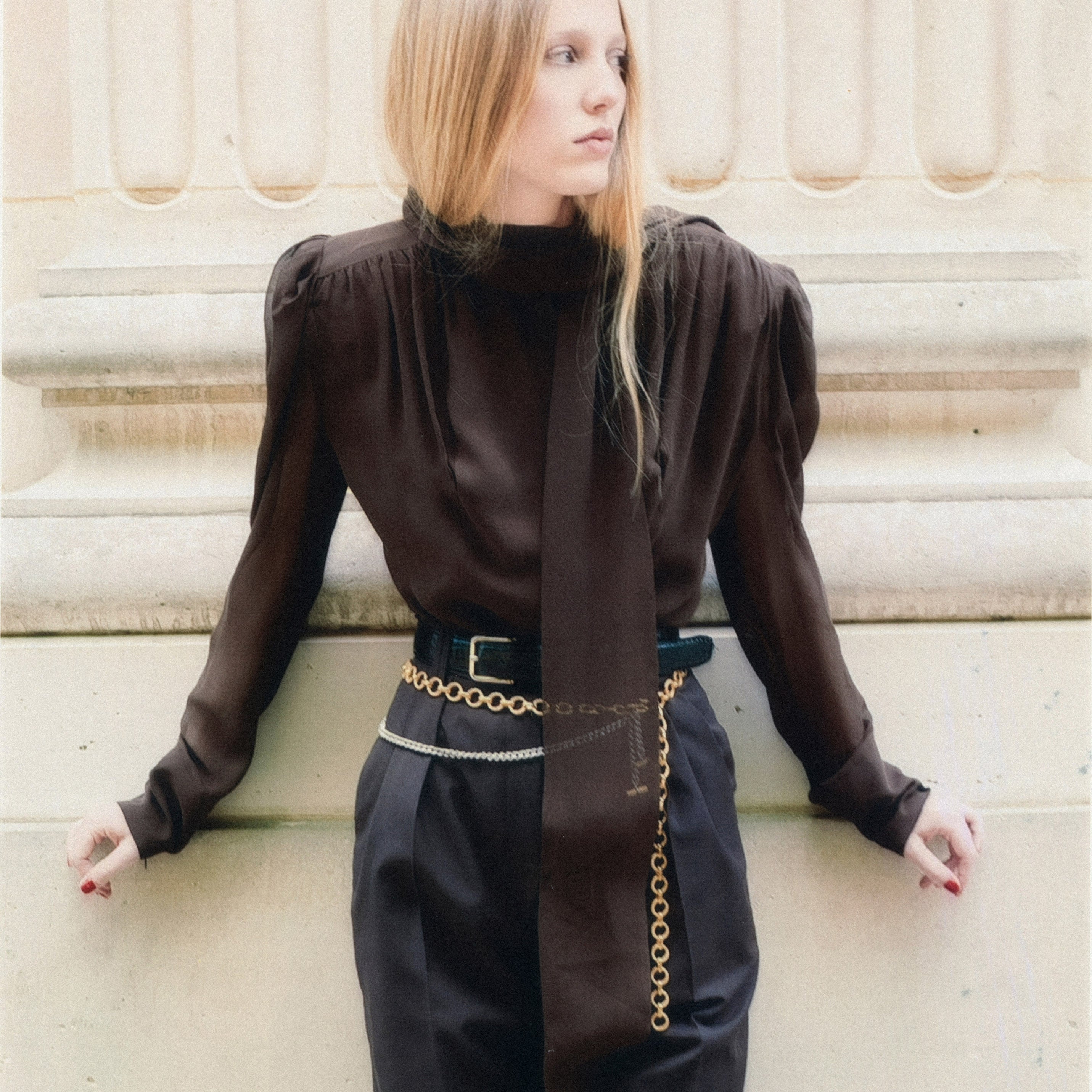 Tension is the driving force. Strength meets softness. Clarity meets movement. Masculine and feminine codes are placed in conversation: leather and Japanese lace, poplin and silk chiffon, strict tailoring and fluid drape.