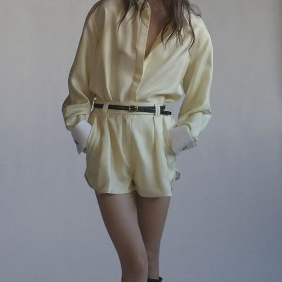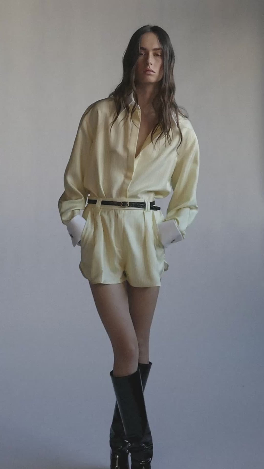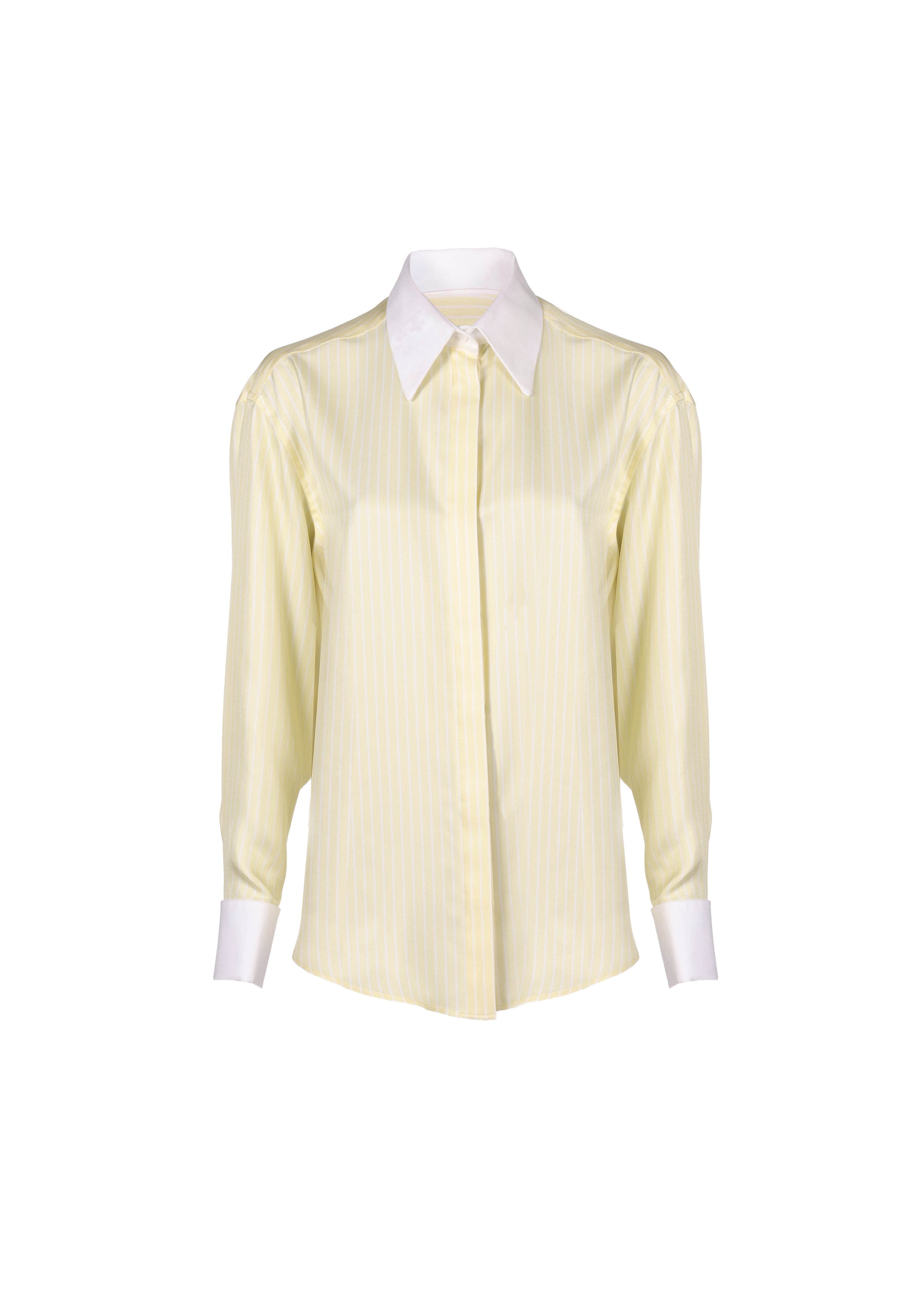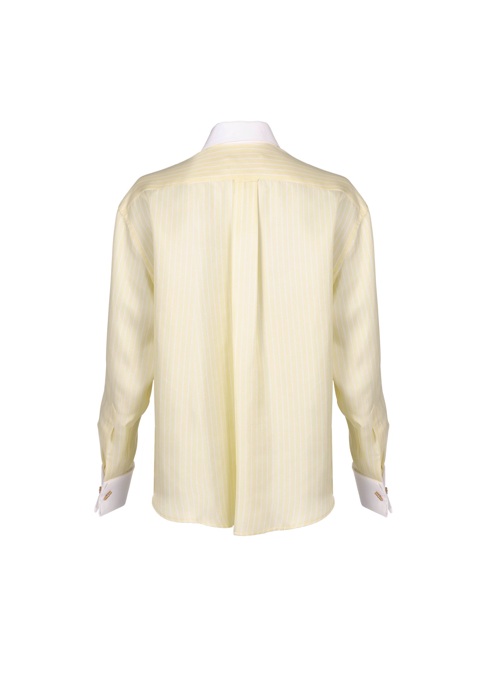 Chemise masculine à col et poignets contrastés, ornée de boutons de manchette en laiton gravé. Ourlet arrondi.