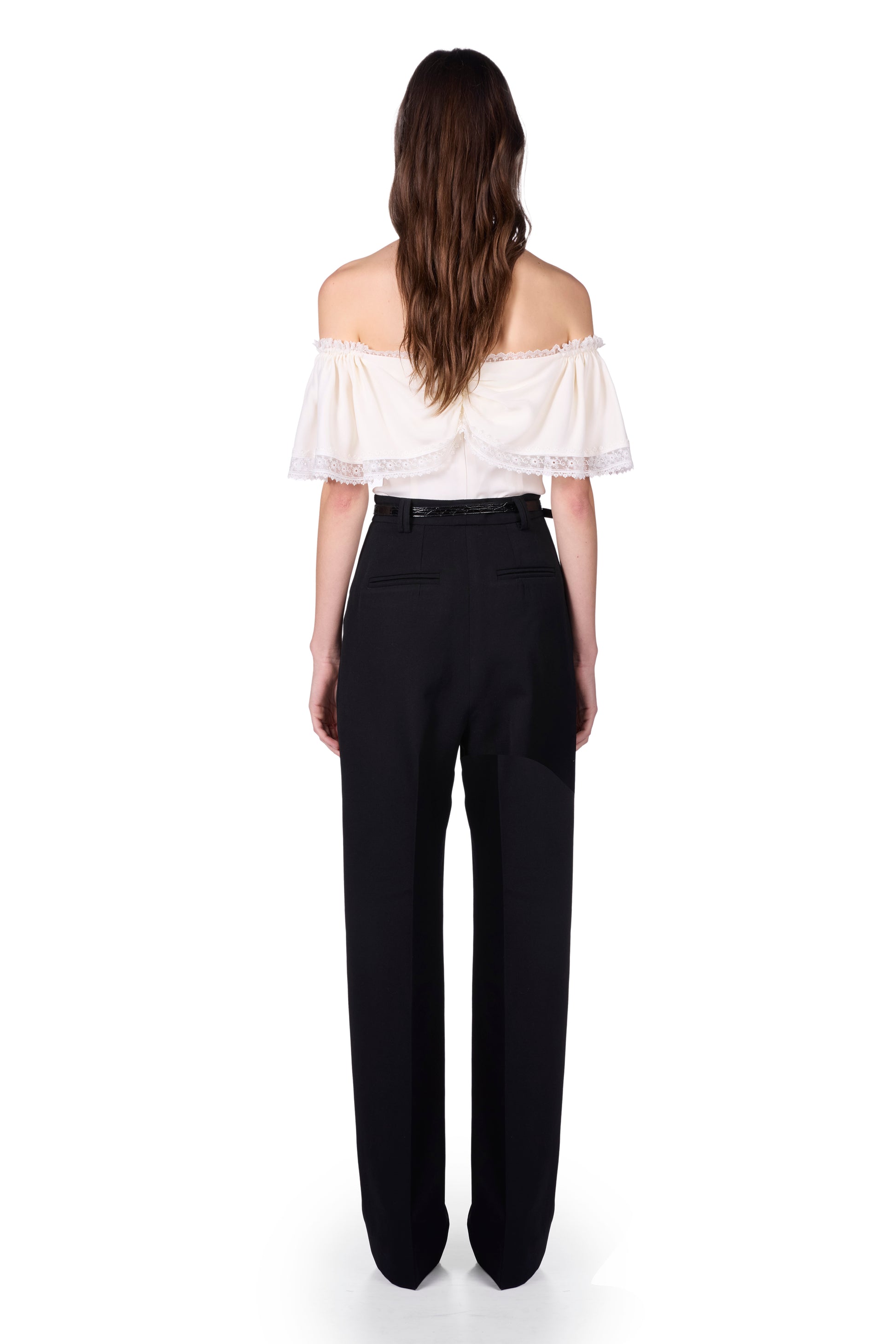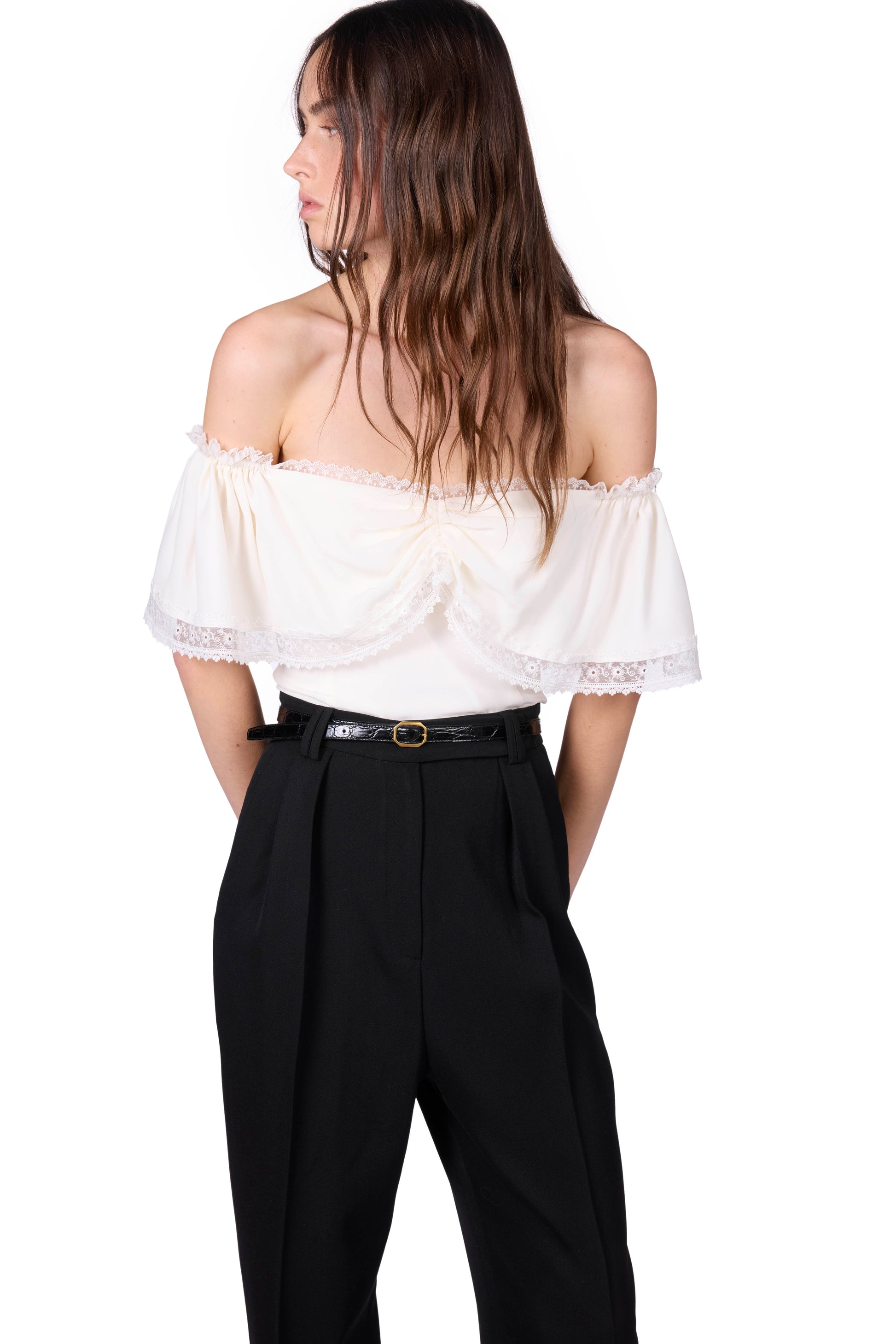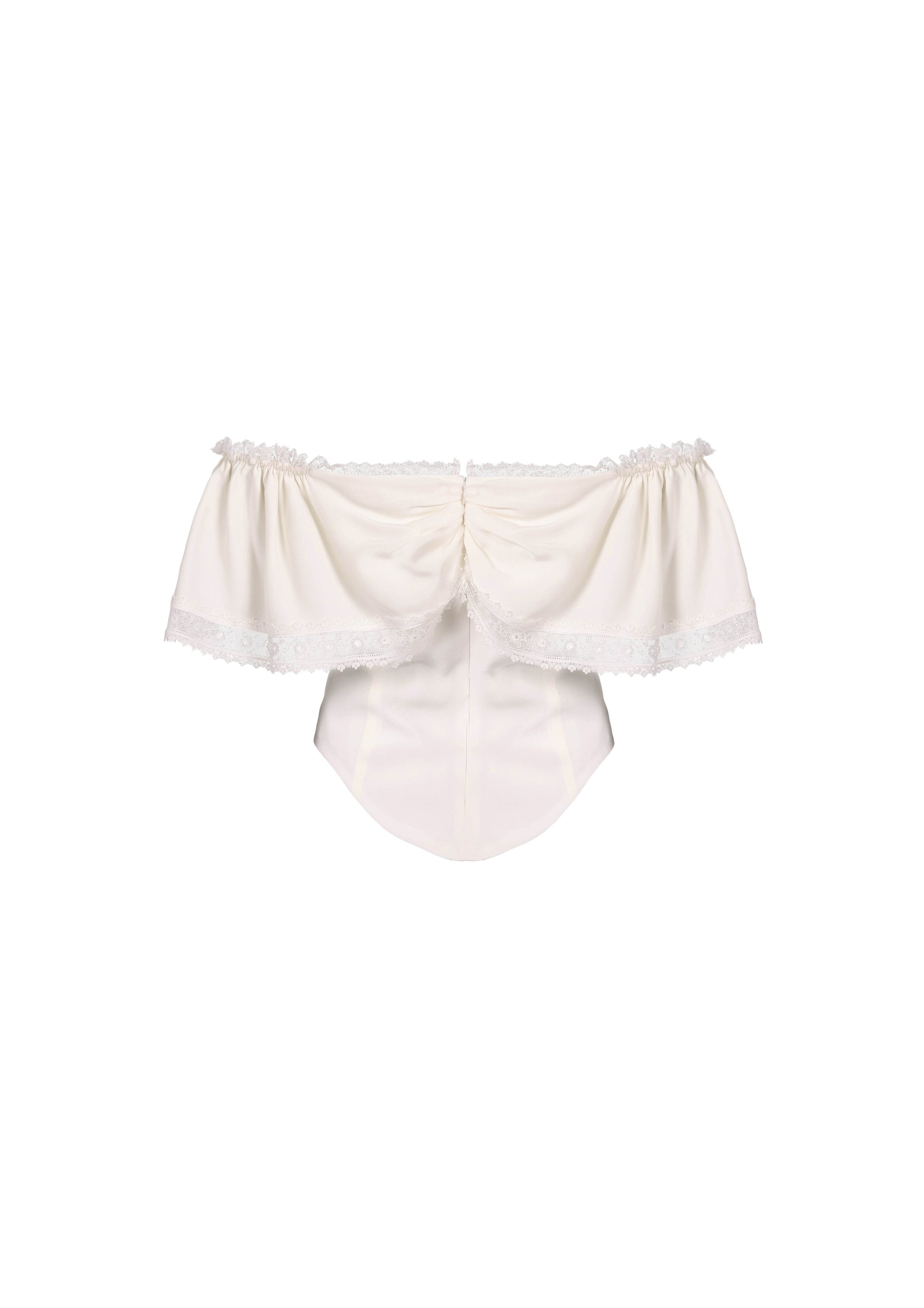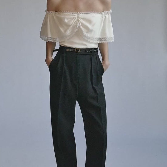 Top en soie à épaules bouffantes et col profond orné de dentelle japonaise. Fermeture éclair invisible au dos.