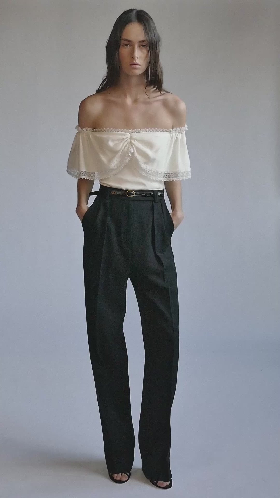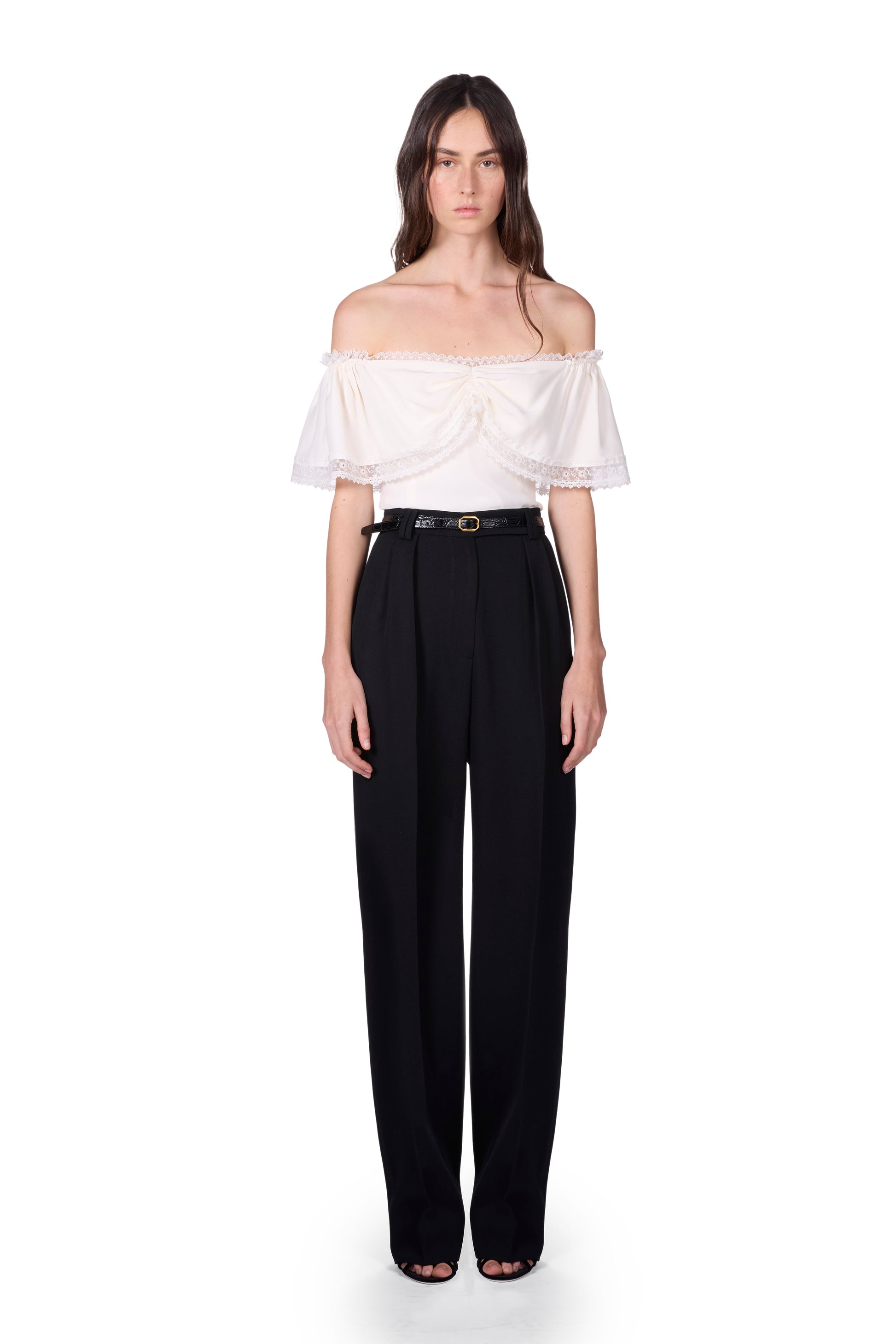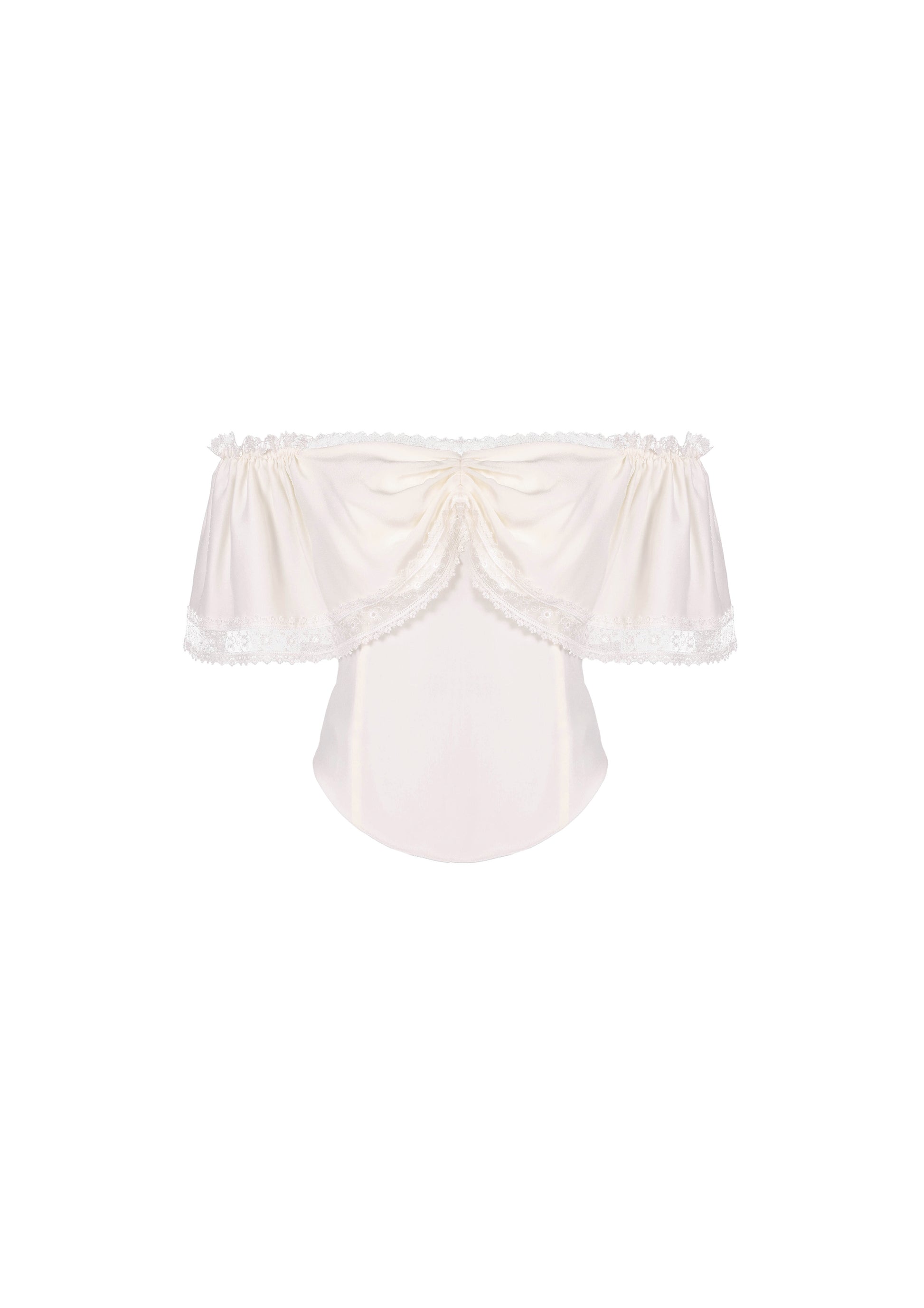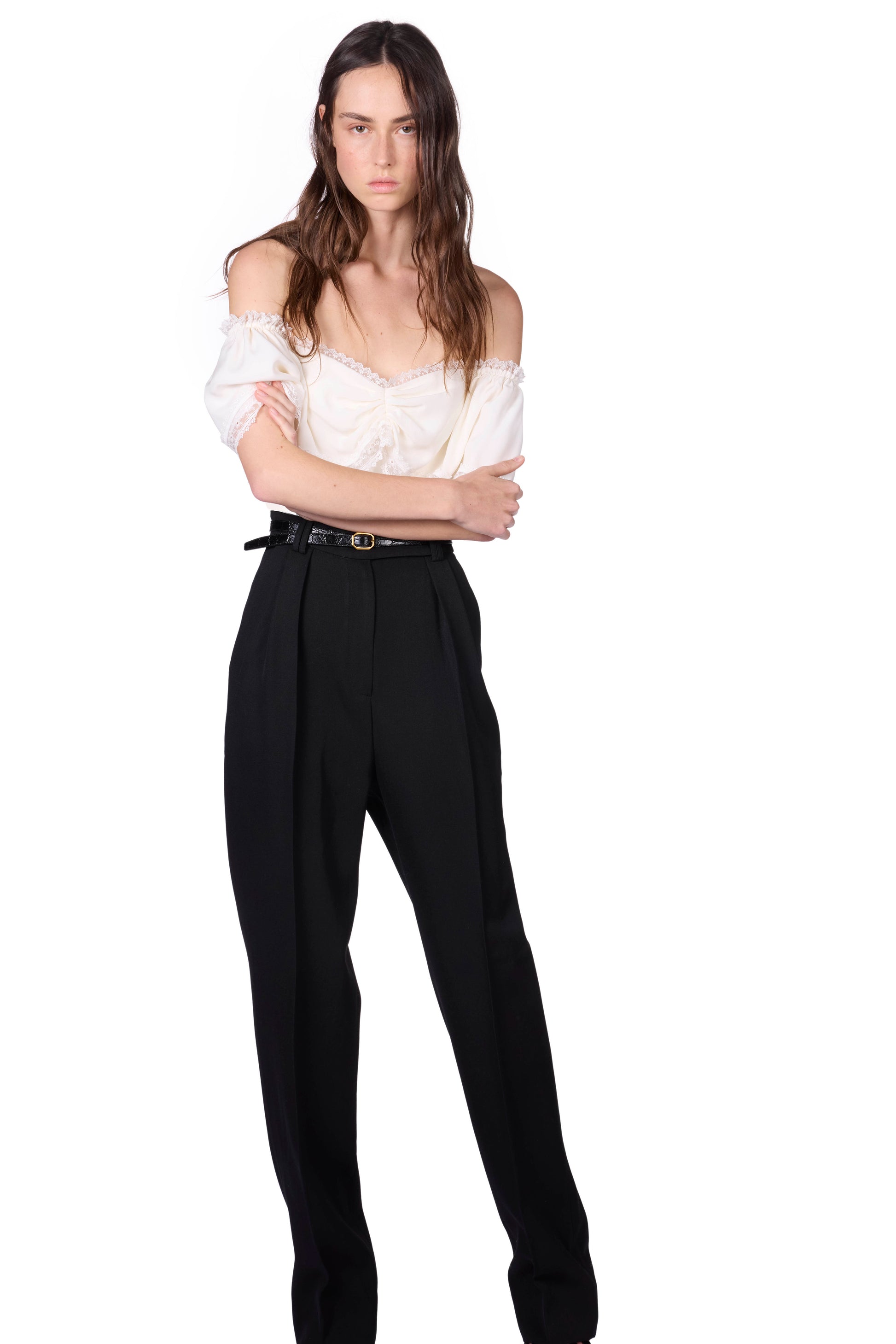 Top en soie à épaules bouffantes et col profond orné de dentelle japonaise. Fermeture éclair invisible au dos.