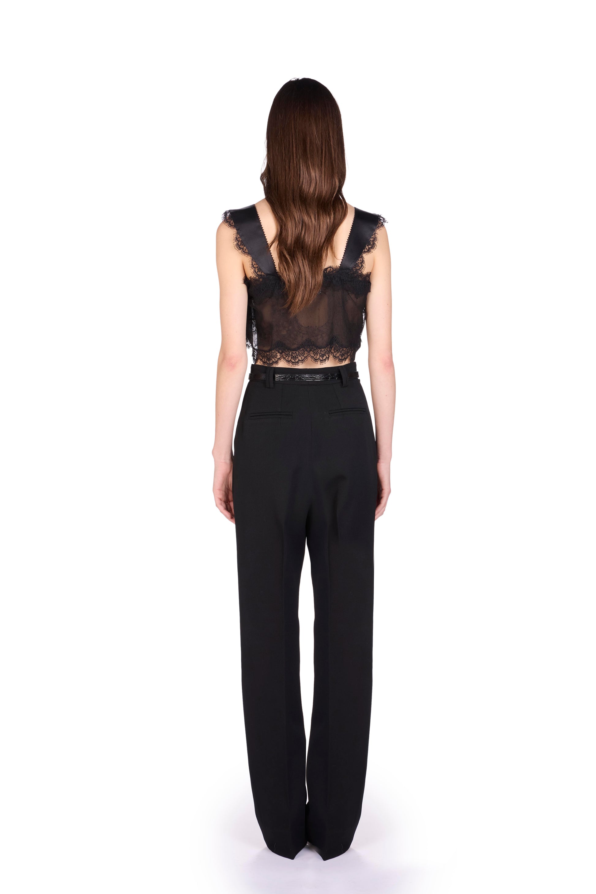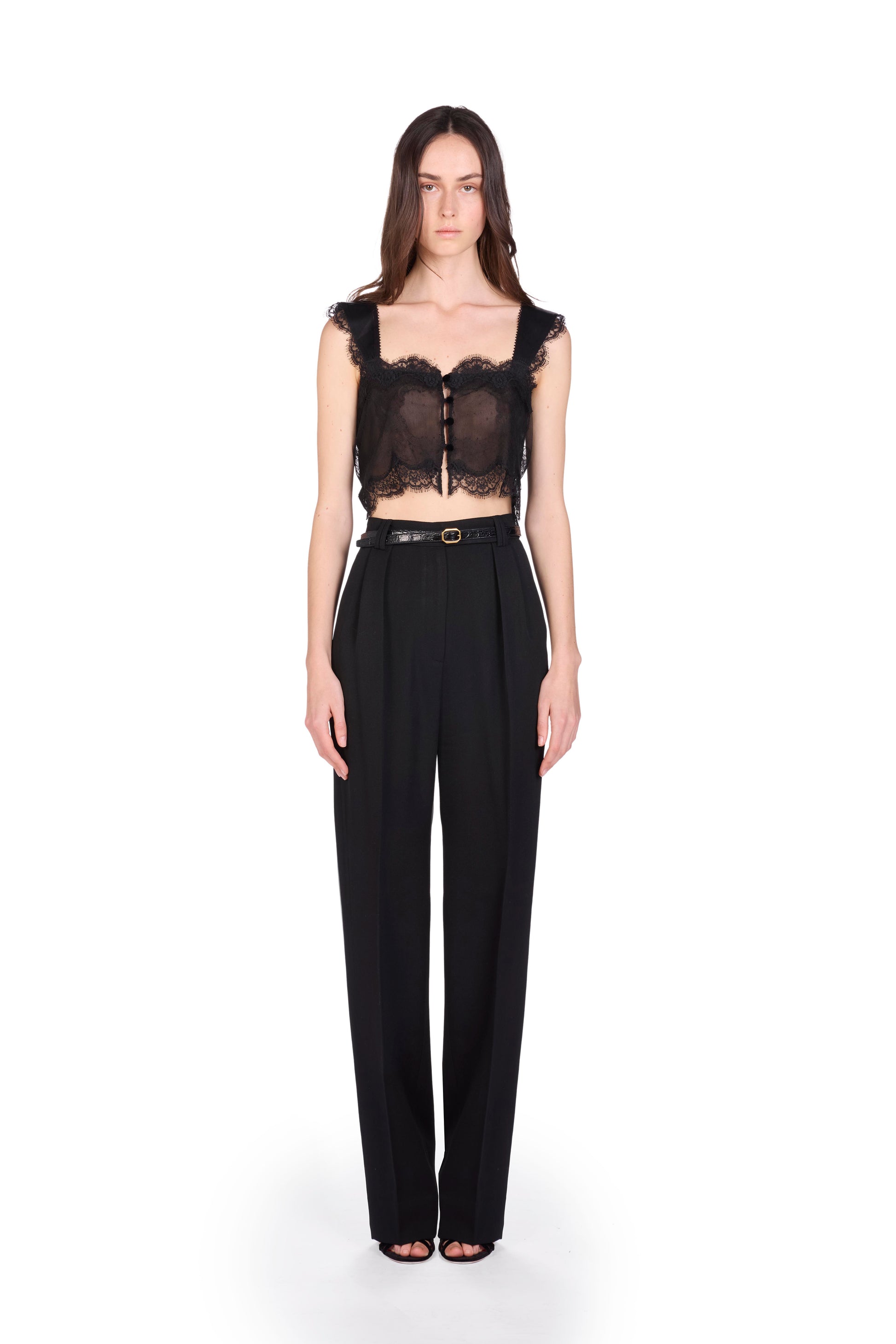 Silk chiffon top with Calais lace details and matching buttons.