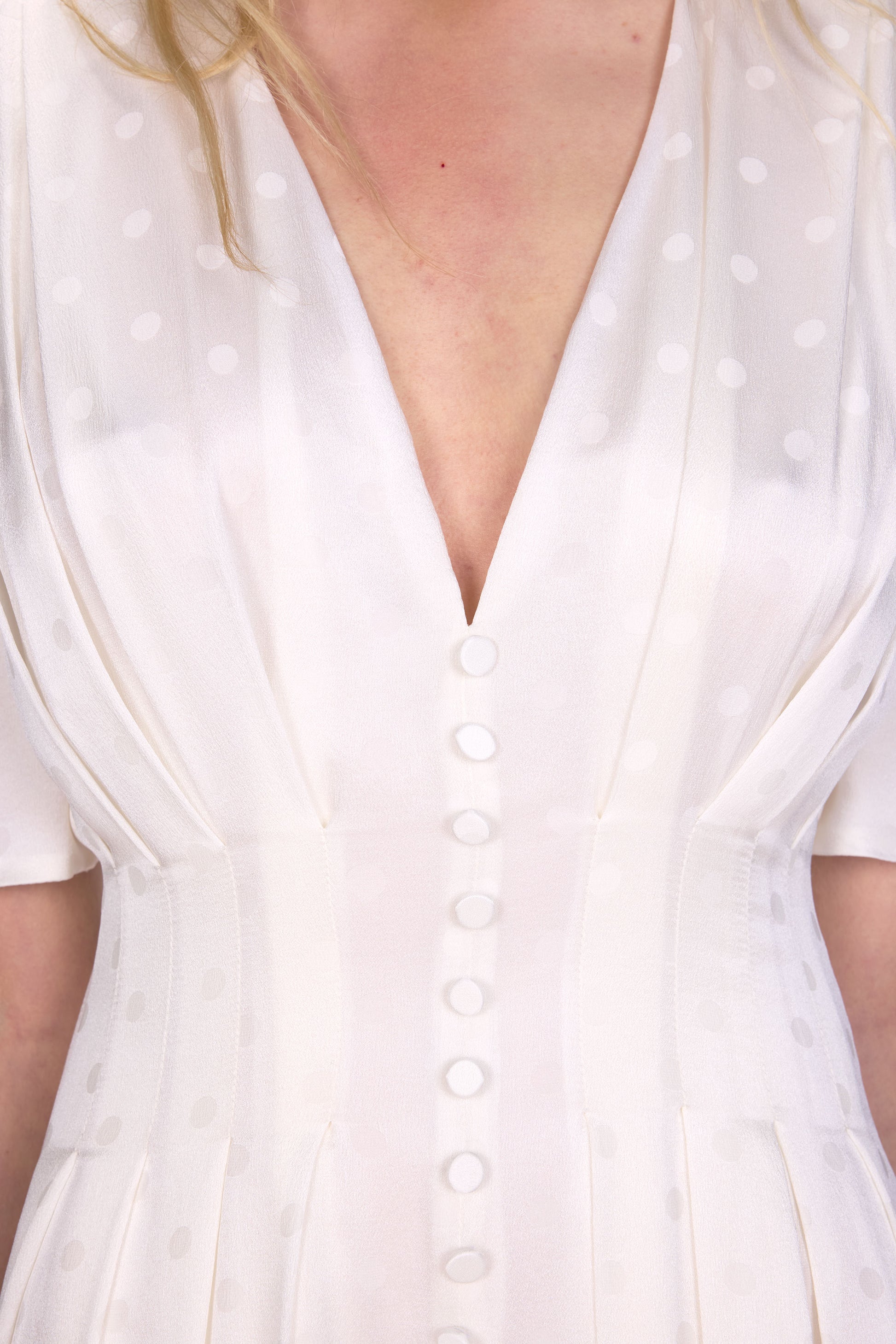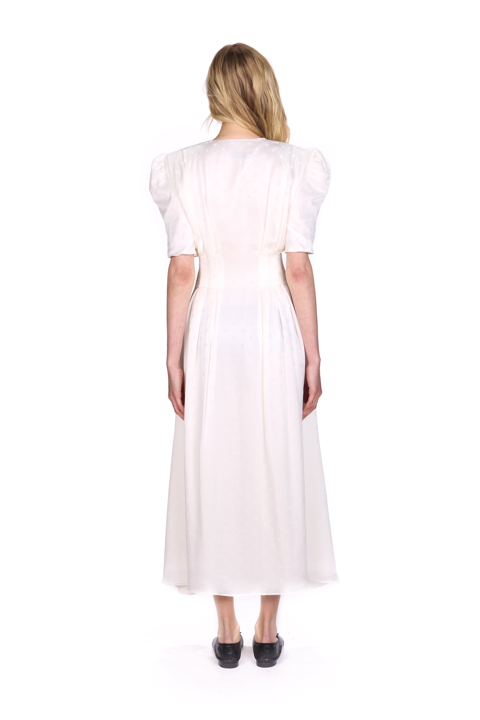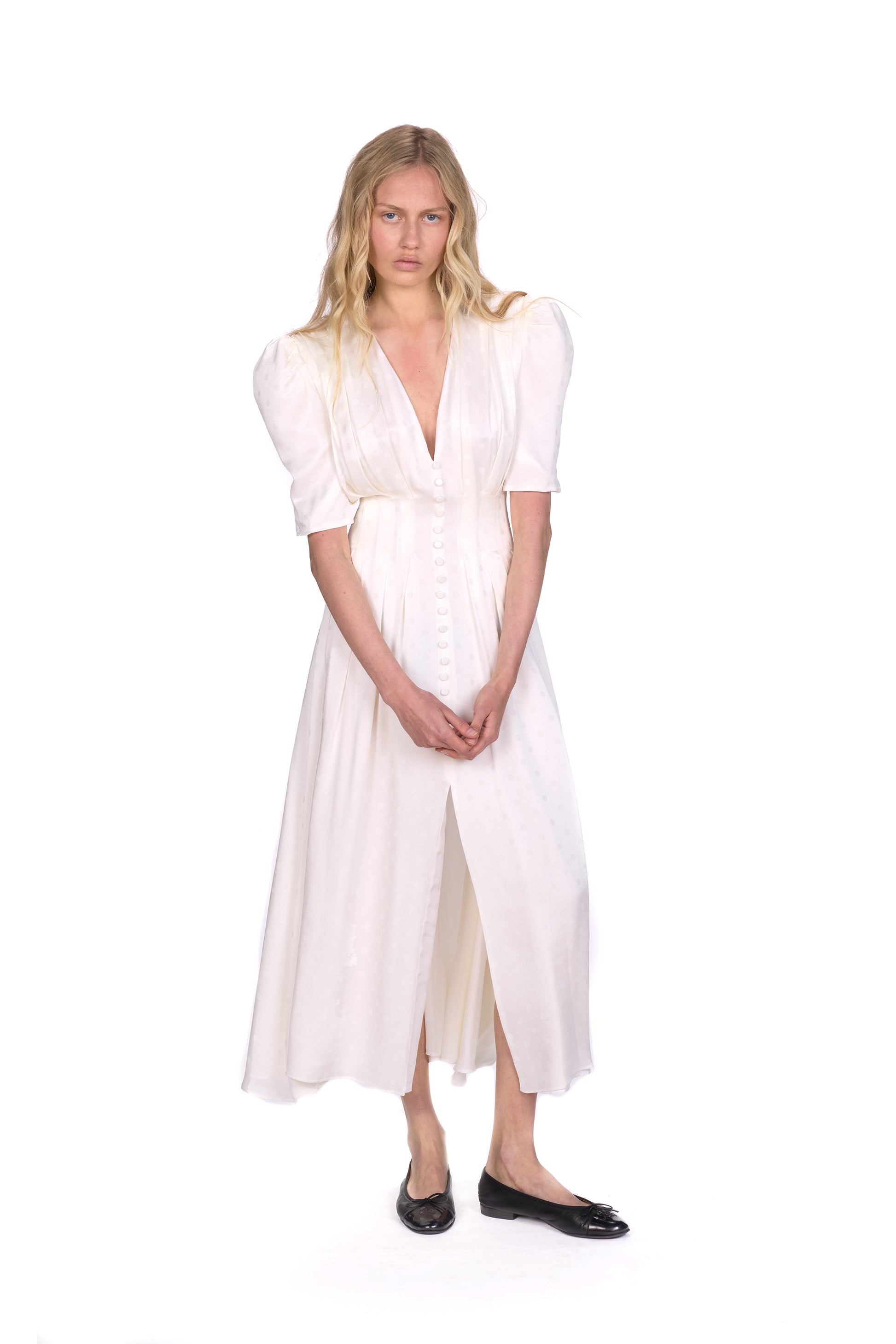 Pleated silk jacquard midi dress with inserted shoulder pads and deep V neckline. Side invisible zip closure.