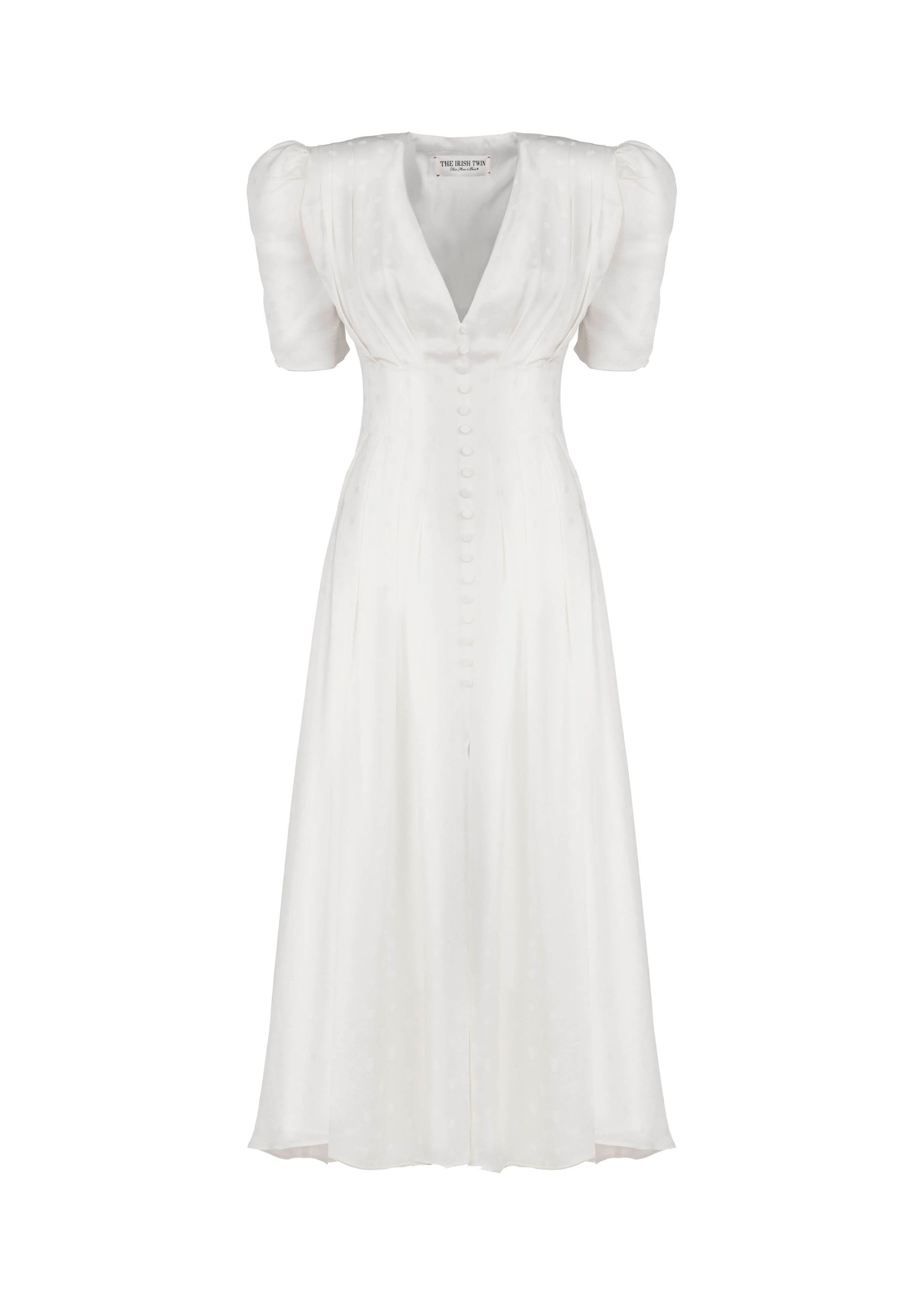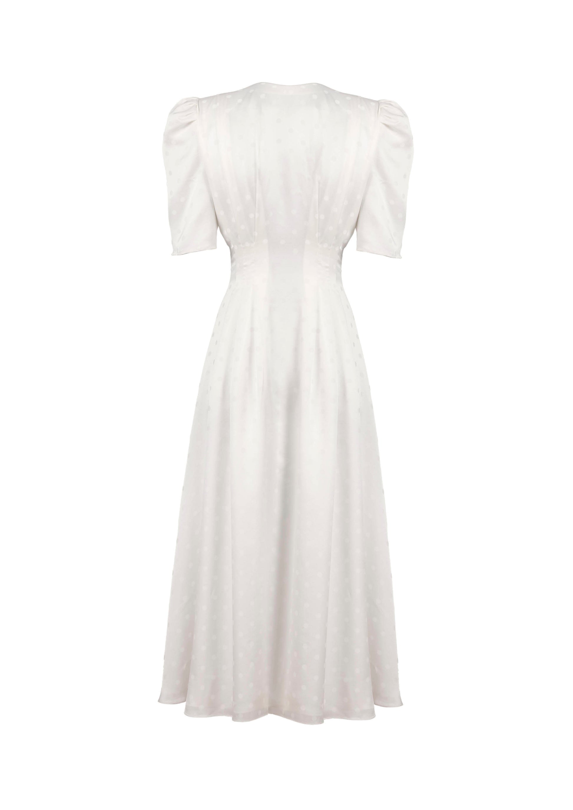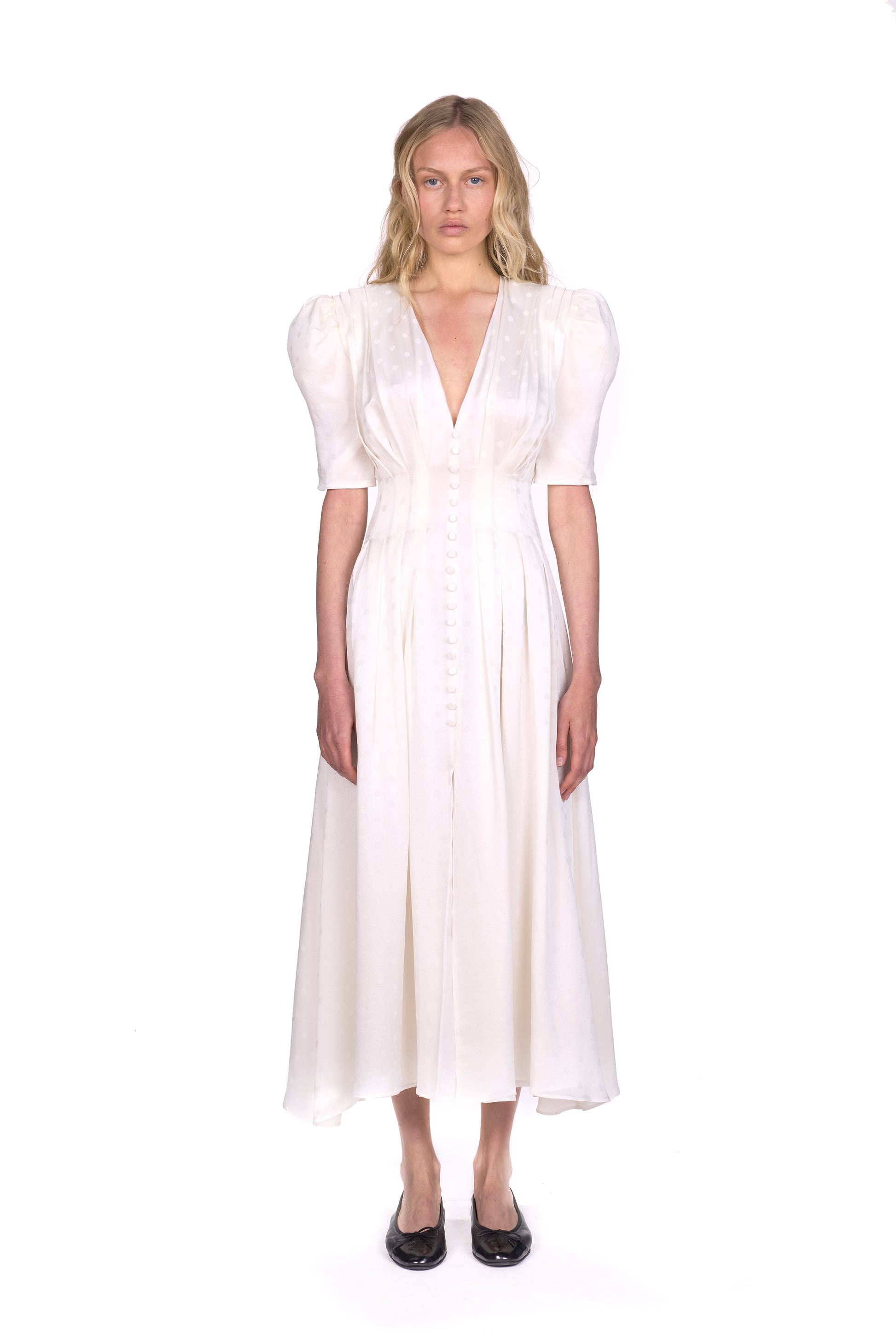 Pleated silk jacquard midi dress with inserted shoulder pads and deep V neckline. Side invisible zip closure.