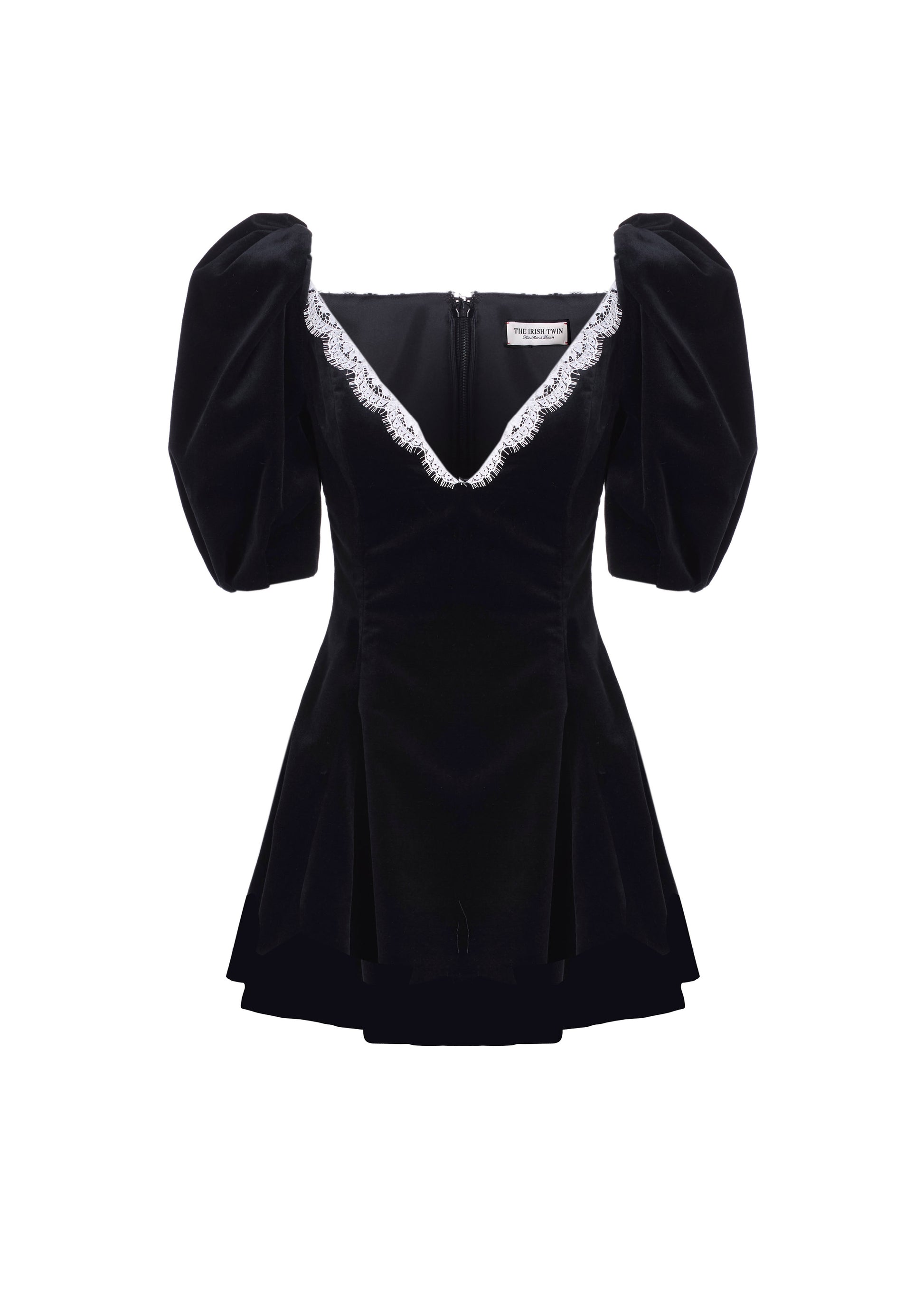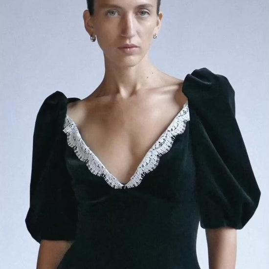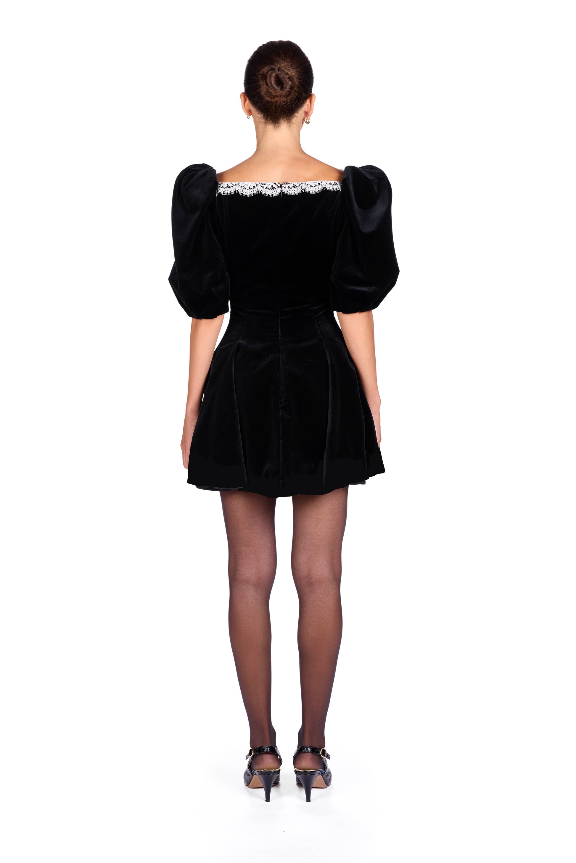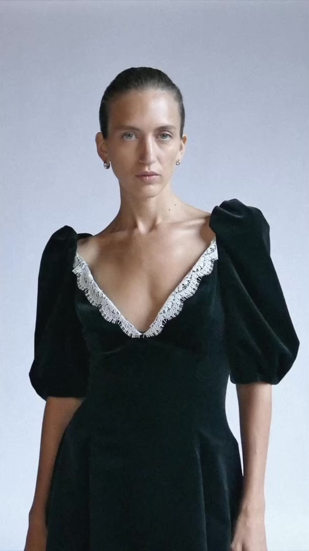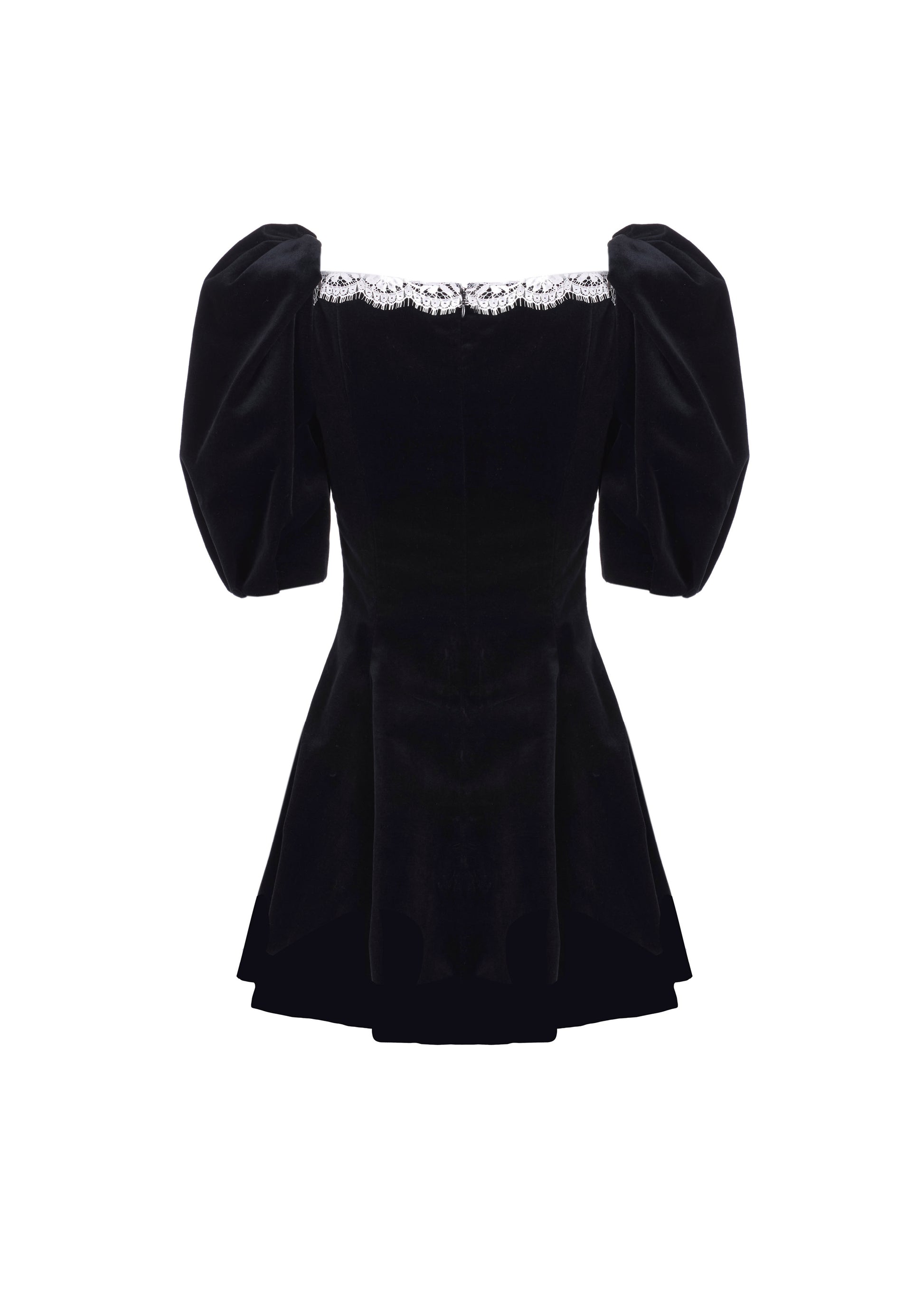 Velvet mini dress with puffed shoulders and decolleté with Calais lace detail. Center back invisible zip closure.
