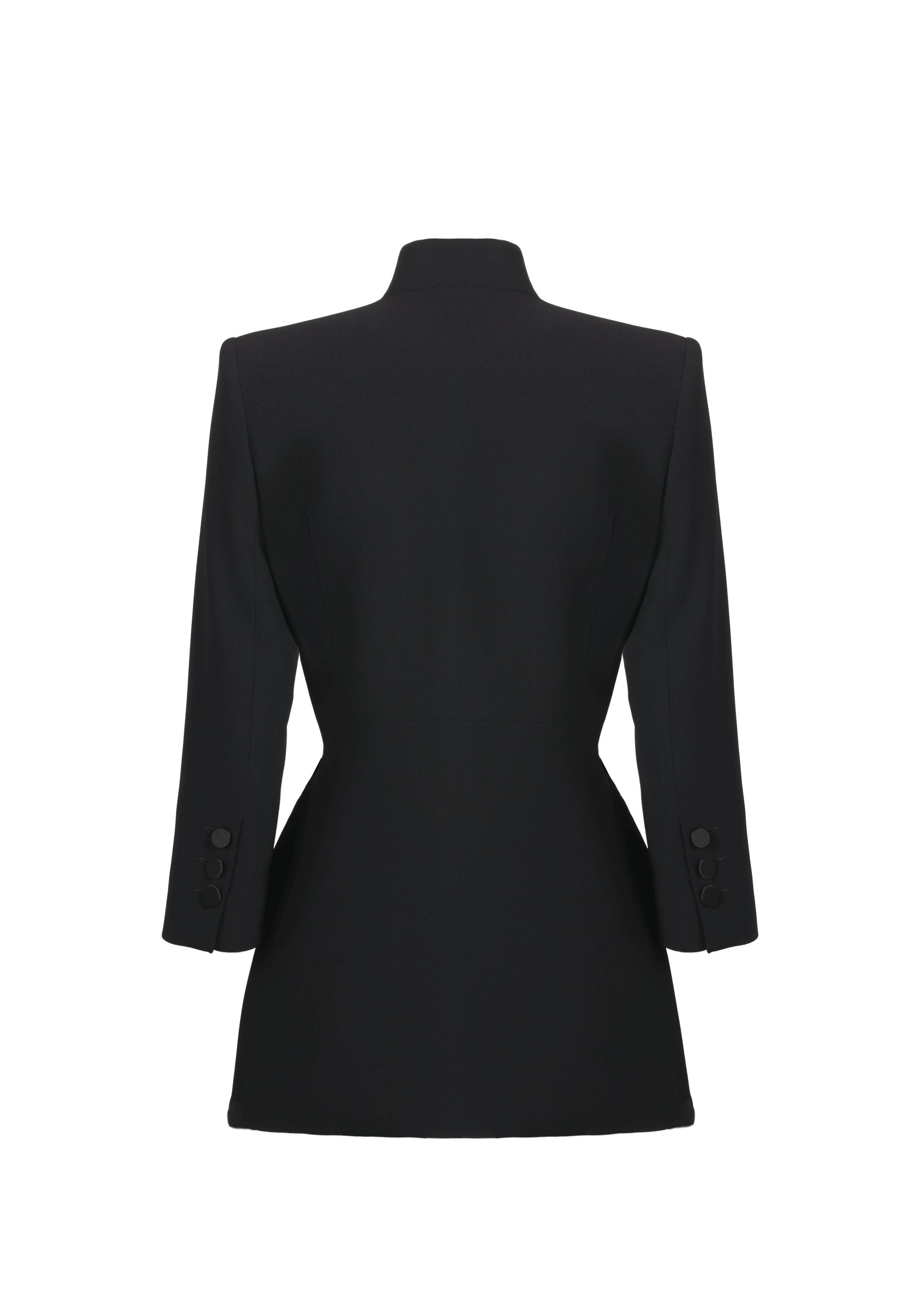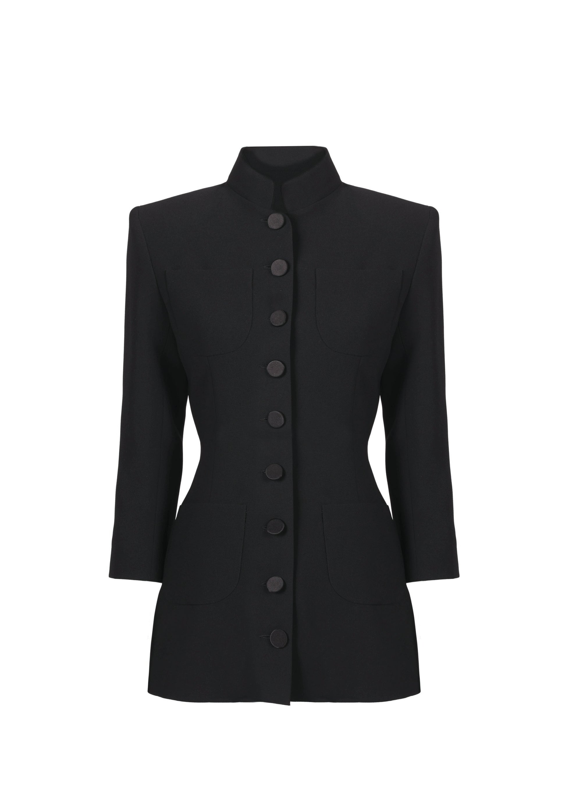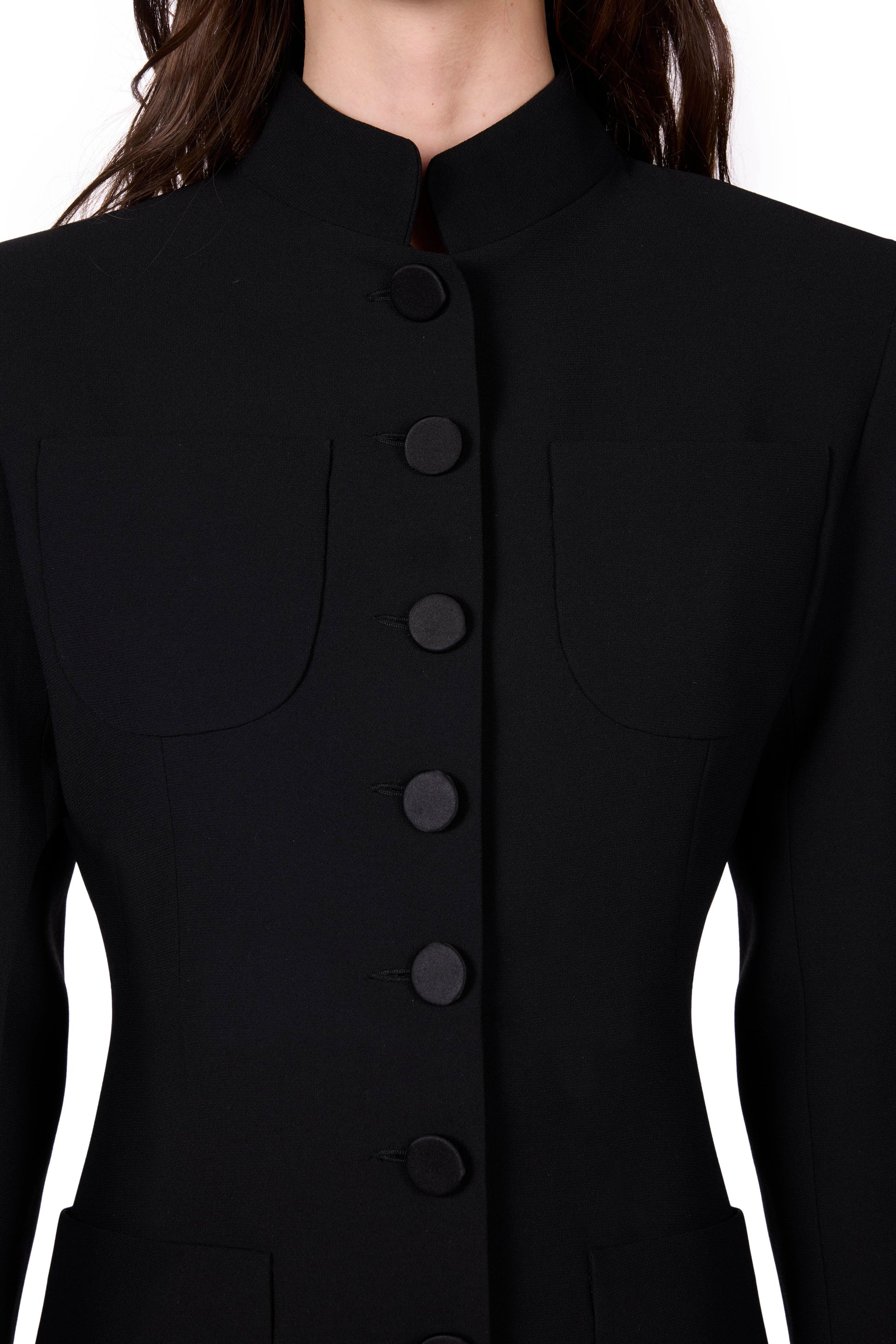 Wool-crêpe jacket with satin buttons and stand up collar.