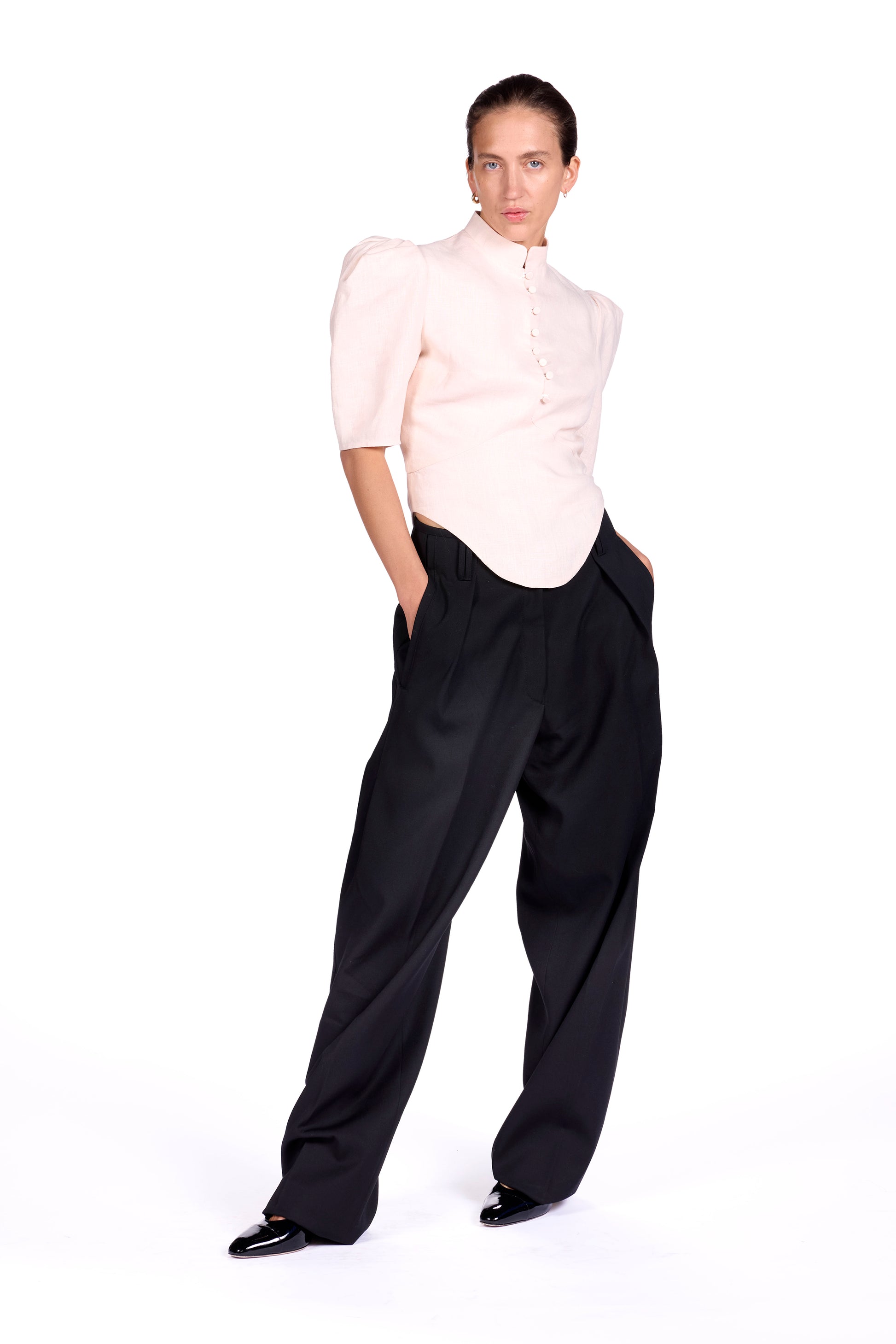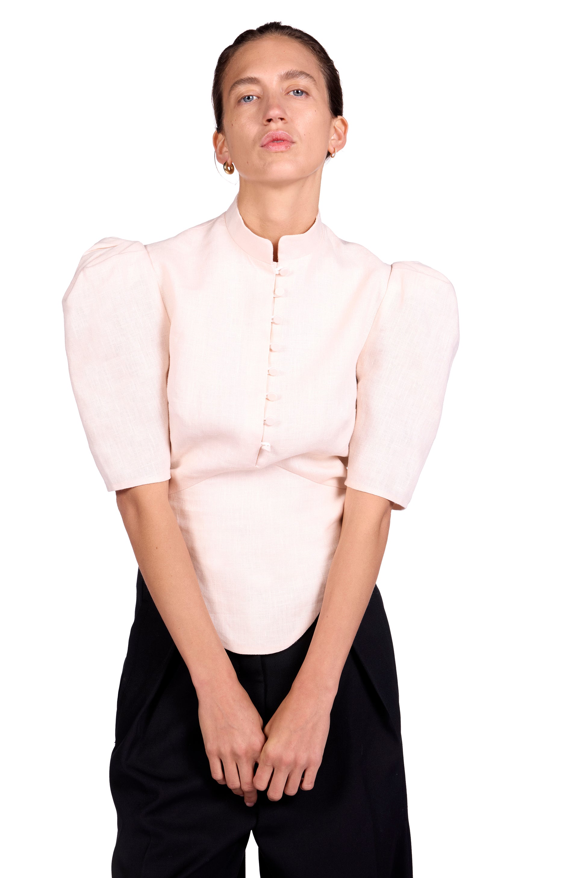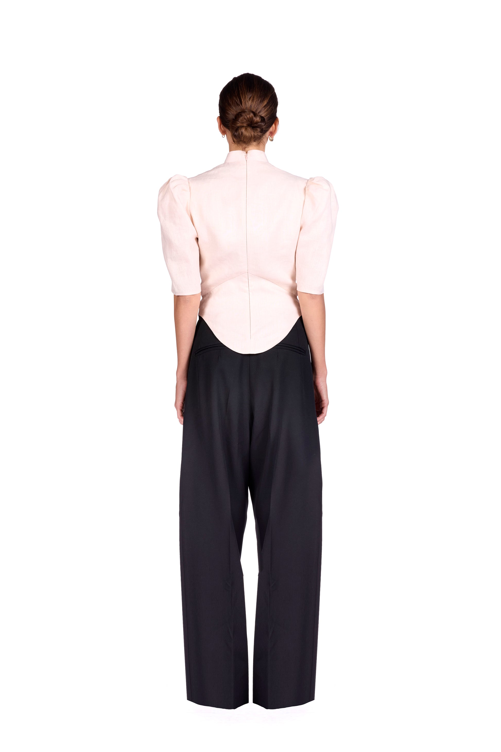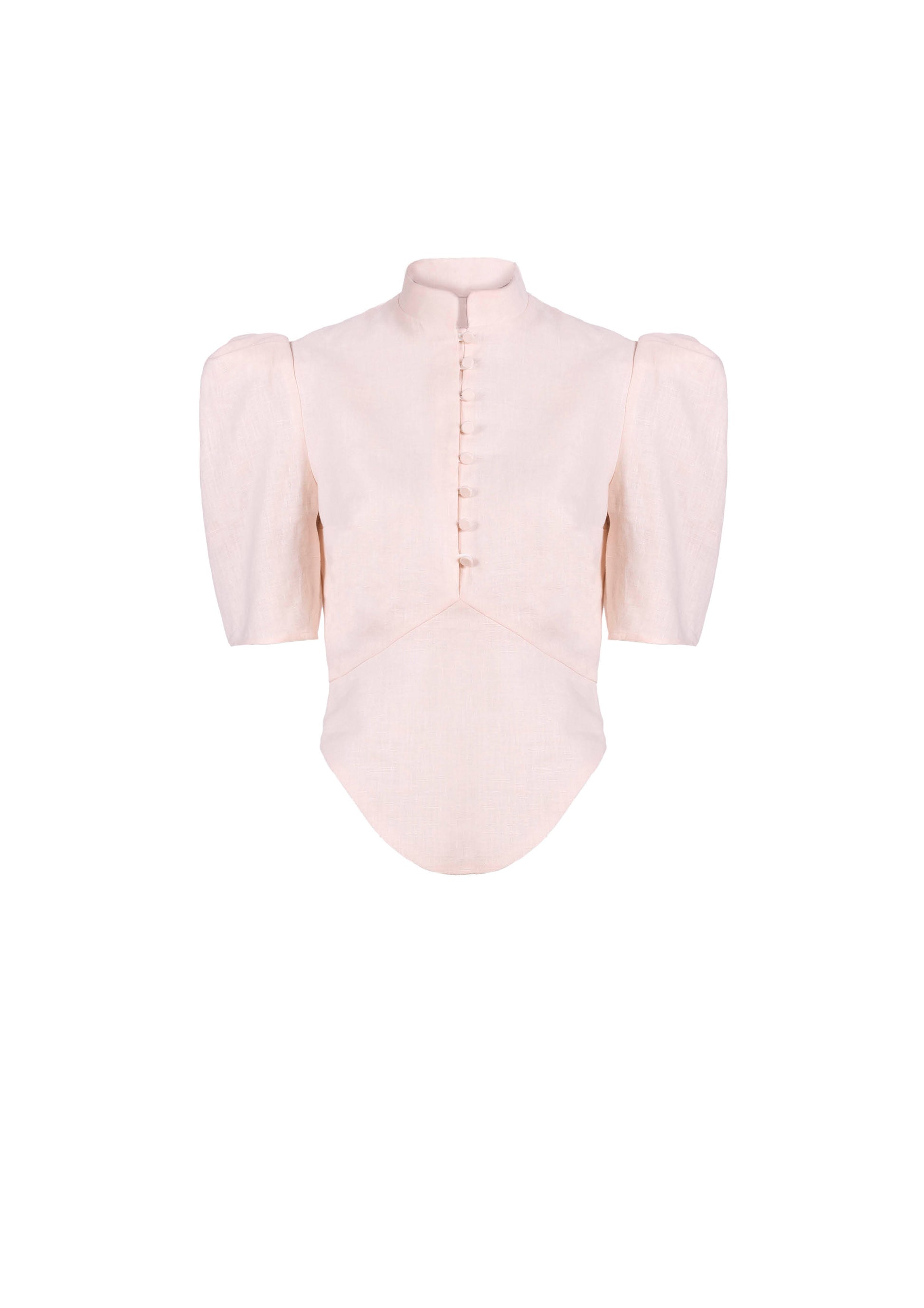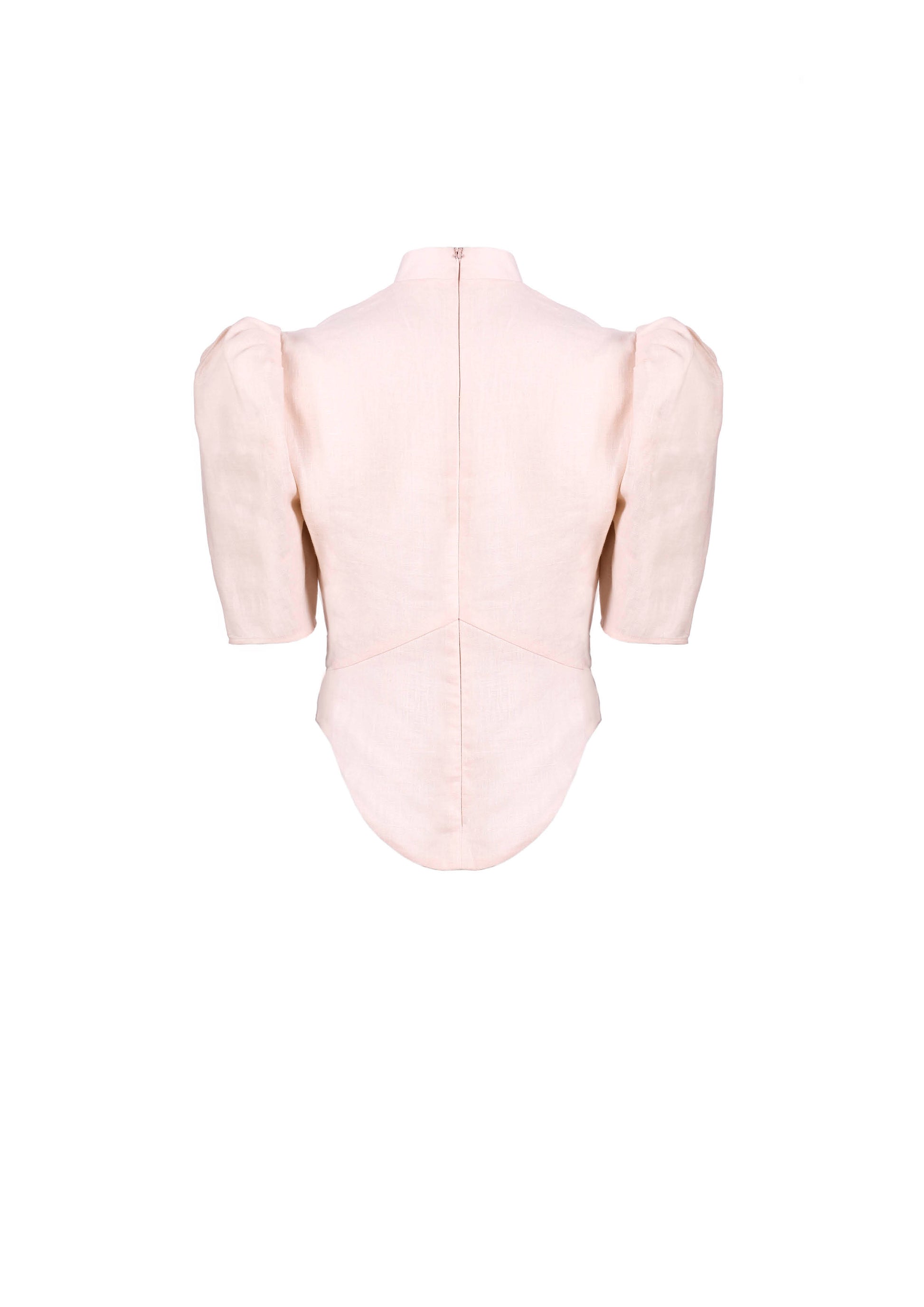 Linen top with standup collar and puffed shoulders. Center back invisible closure.