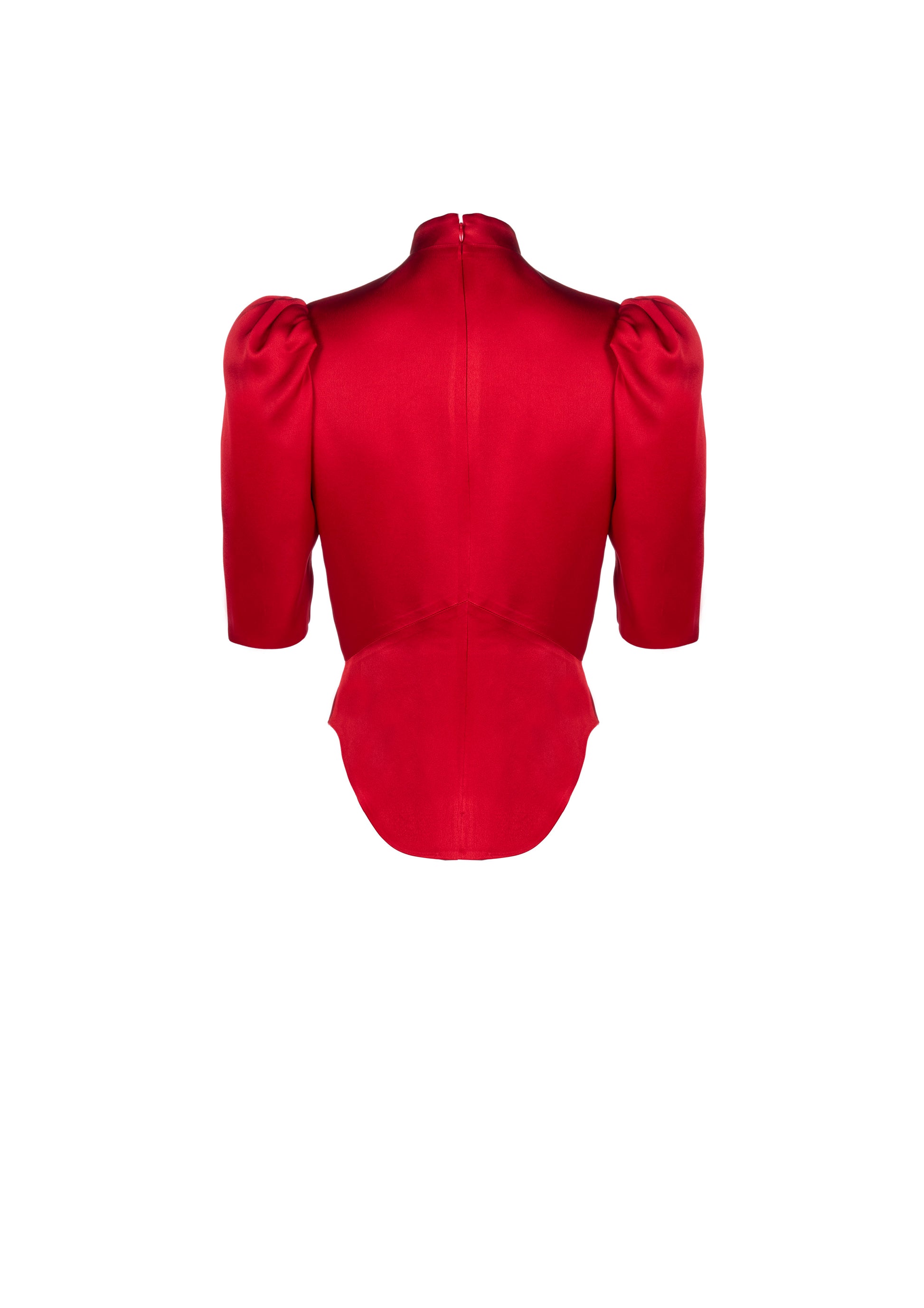 Satin crepe top with standup collar and puffed shoulders. Center back invisible closure.
