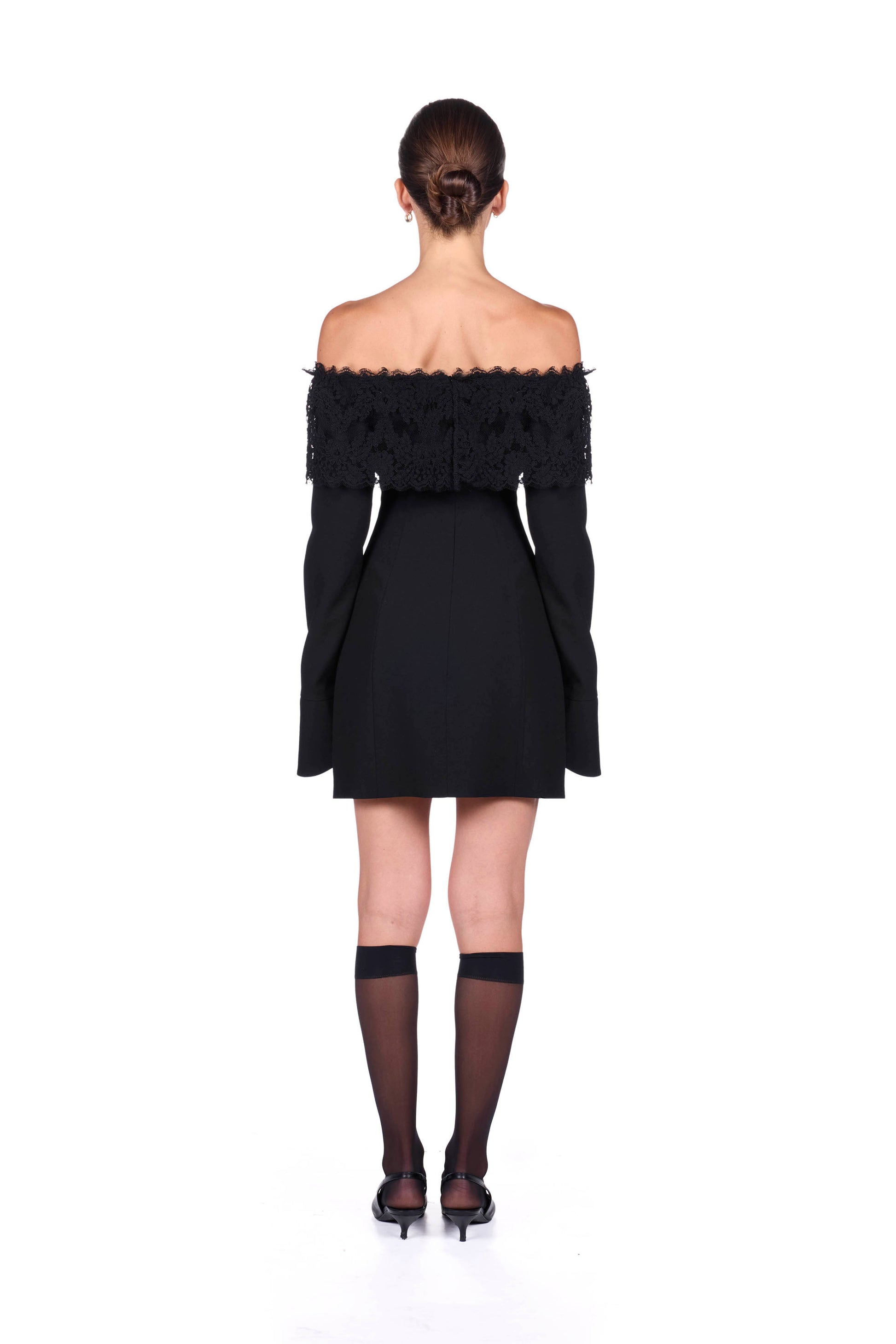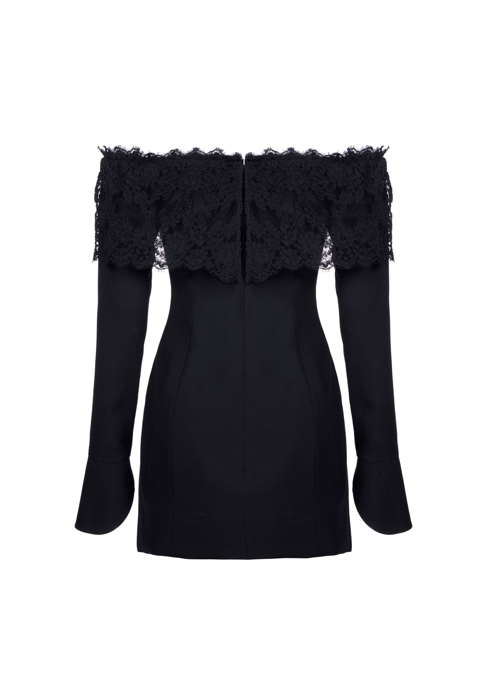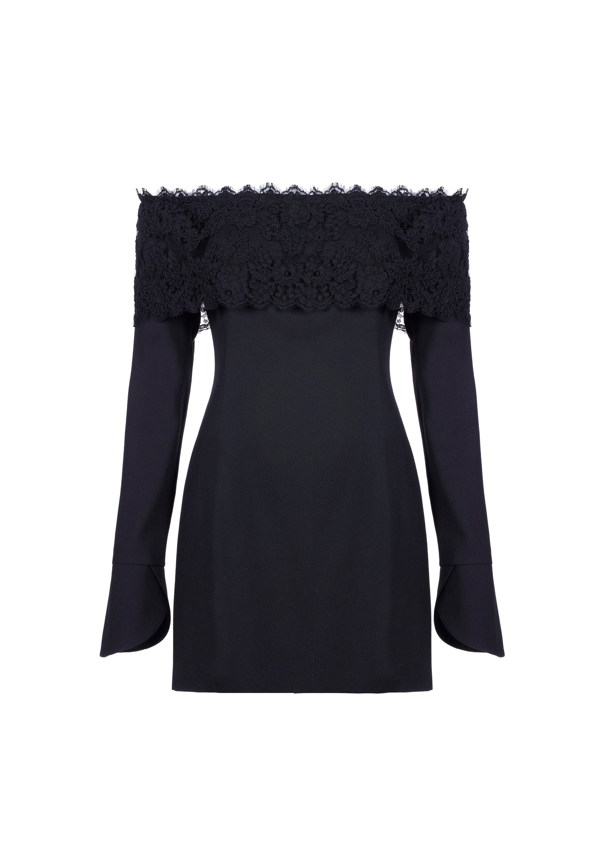 Crepe mini dress with guipure lace ‘Bardot’ neckline and long sleeves. Center back invisible zip closure.