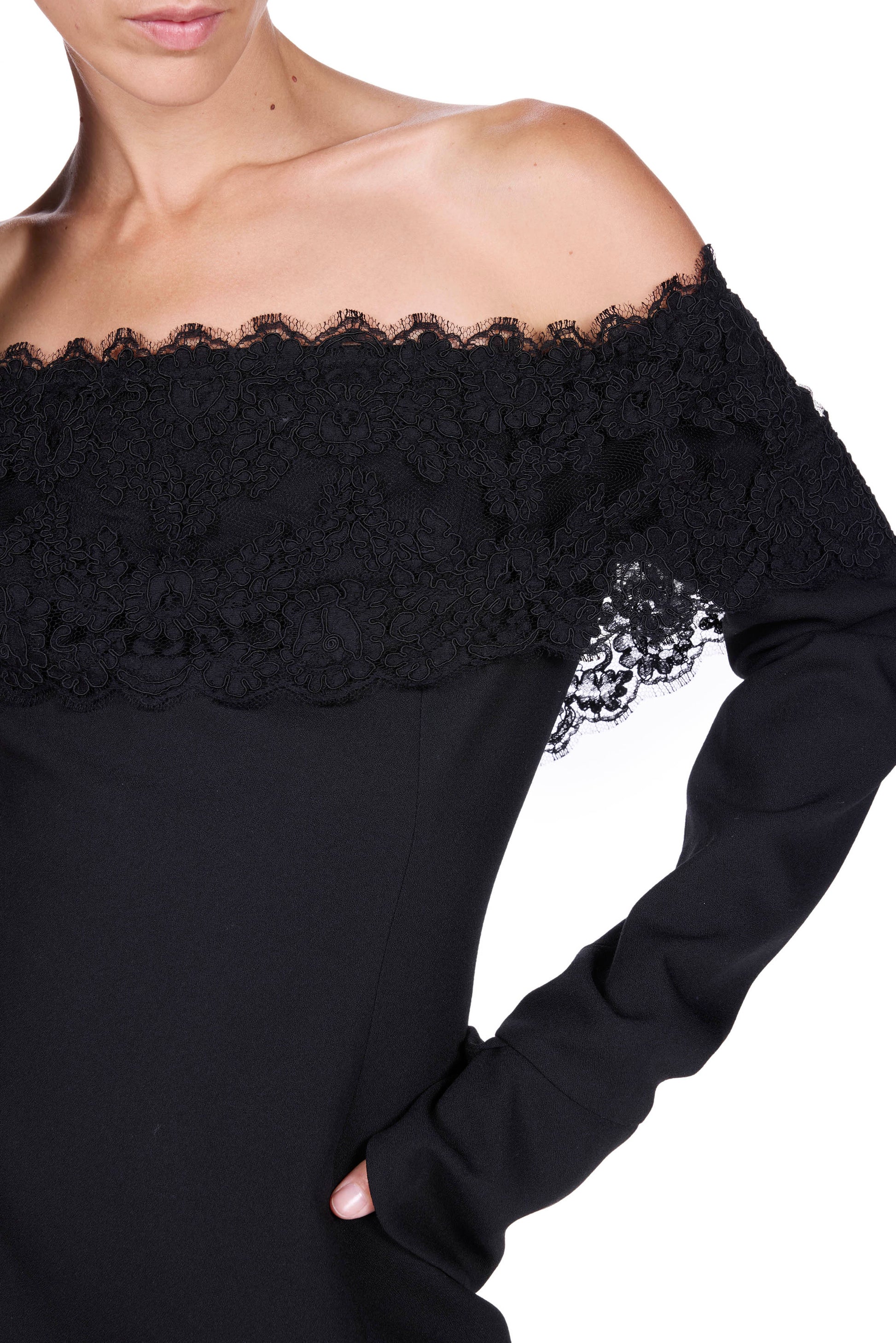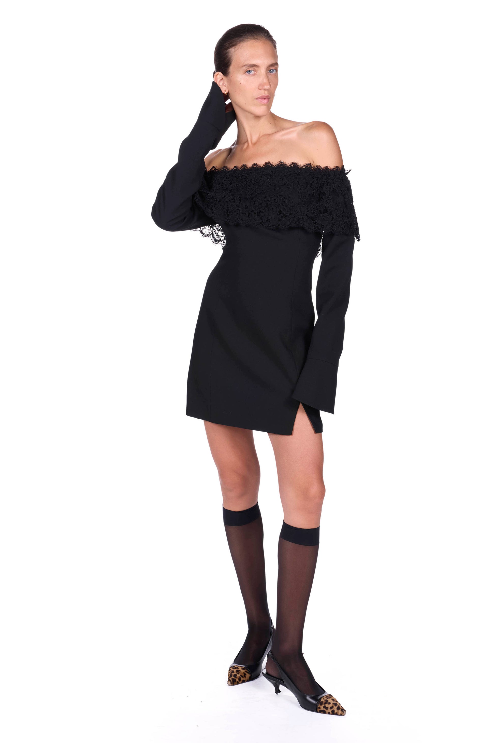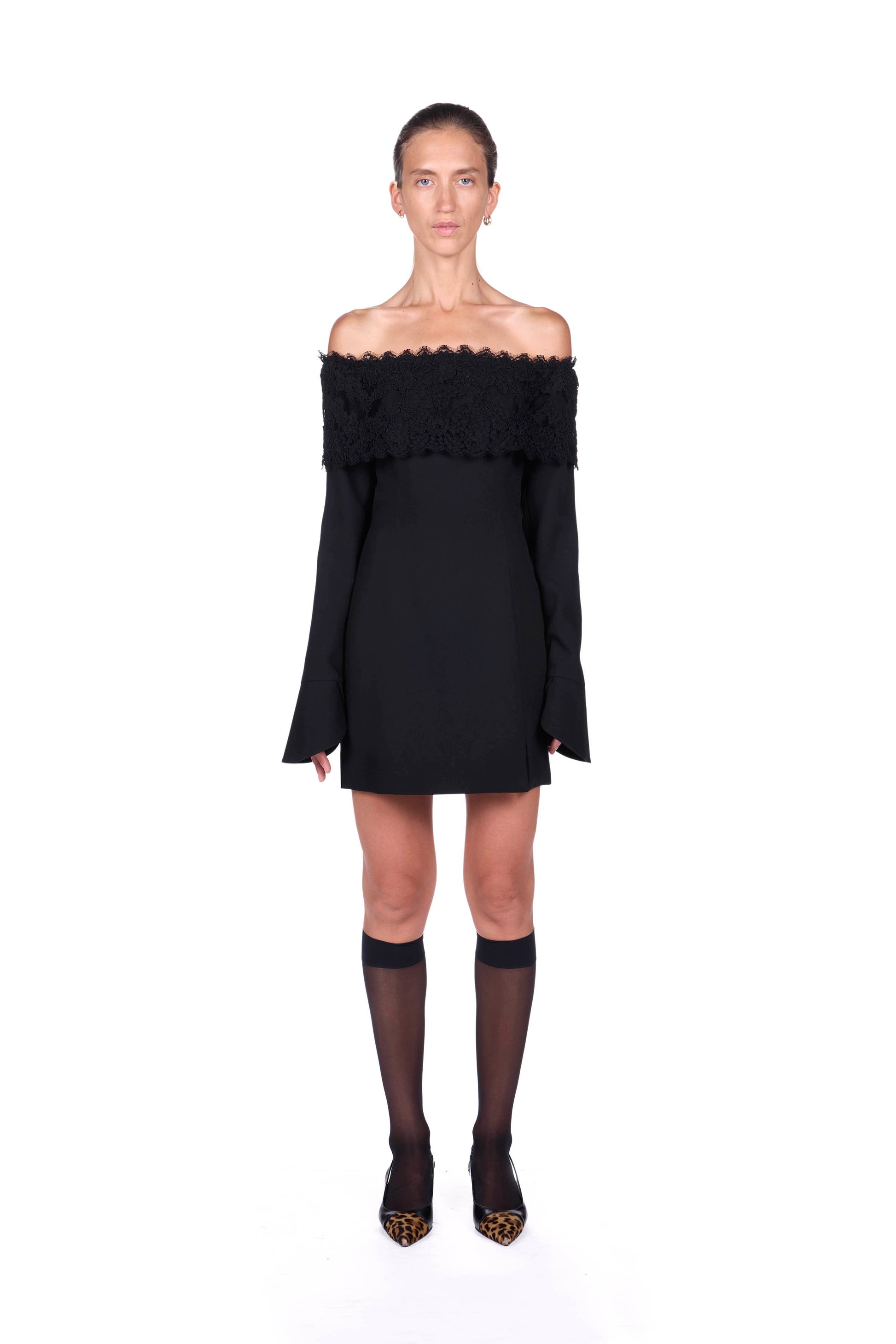 Crepe mini dress with guipure lace ‘Bardot’ neckline and long sleeves. Center back invisible zip closure.