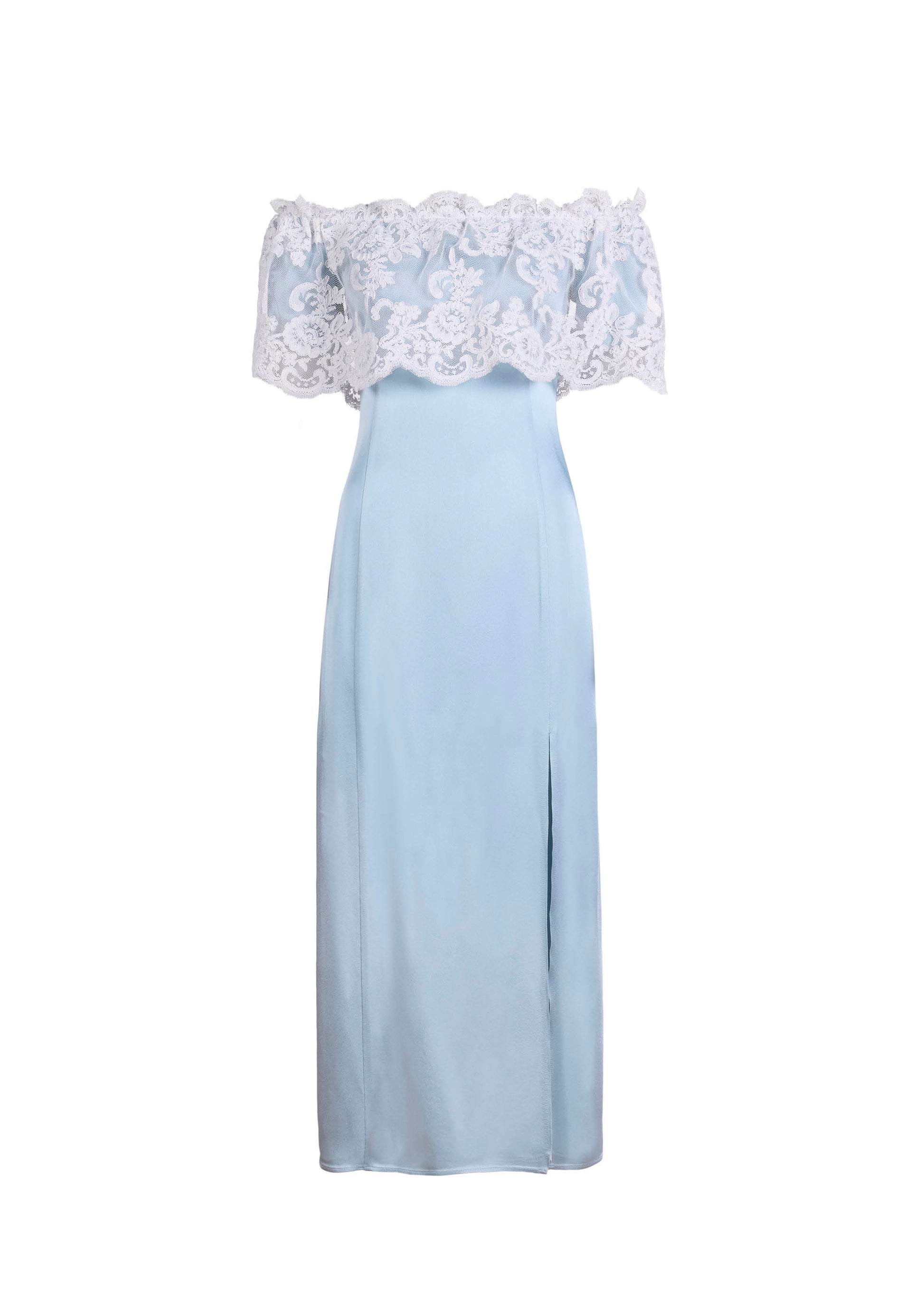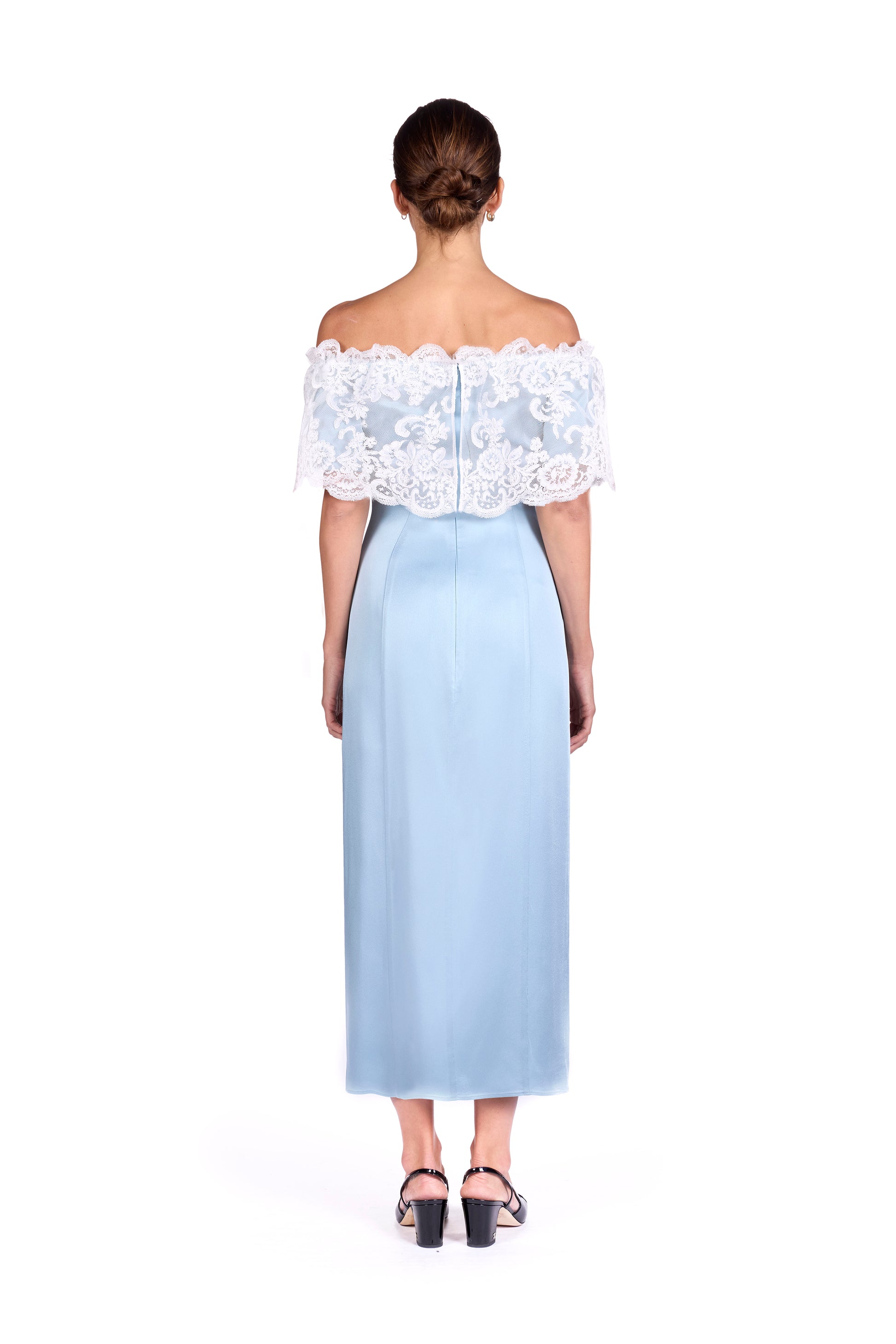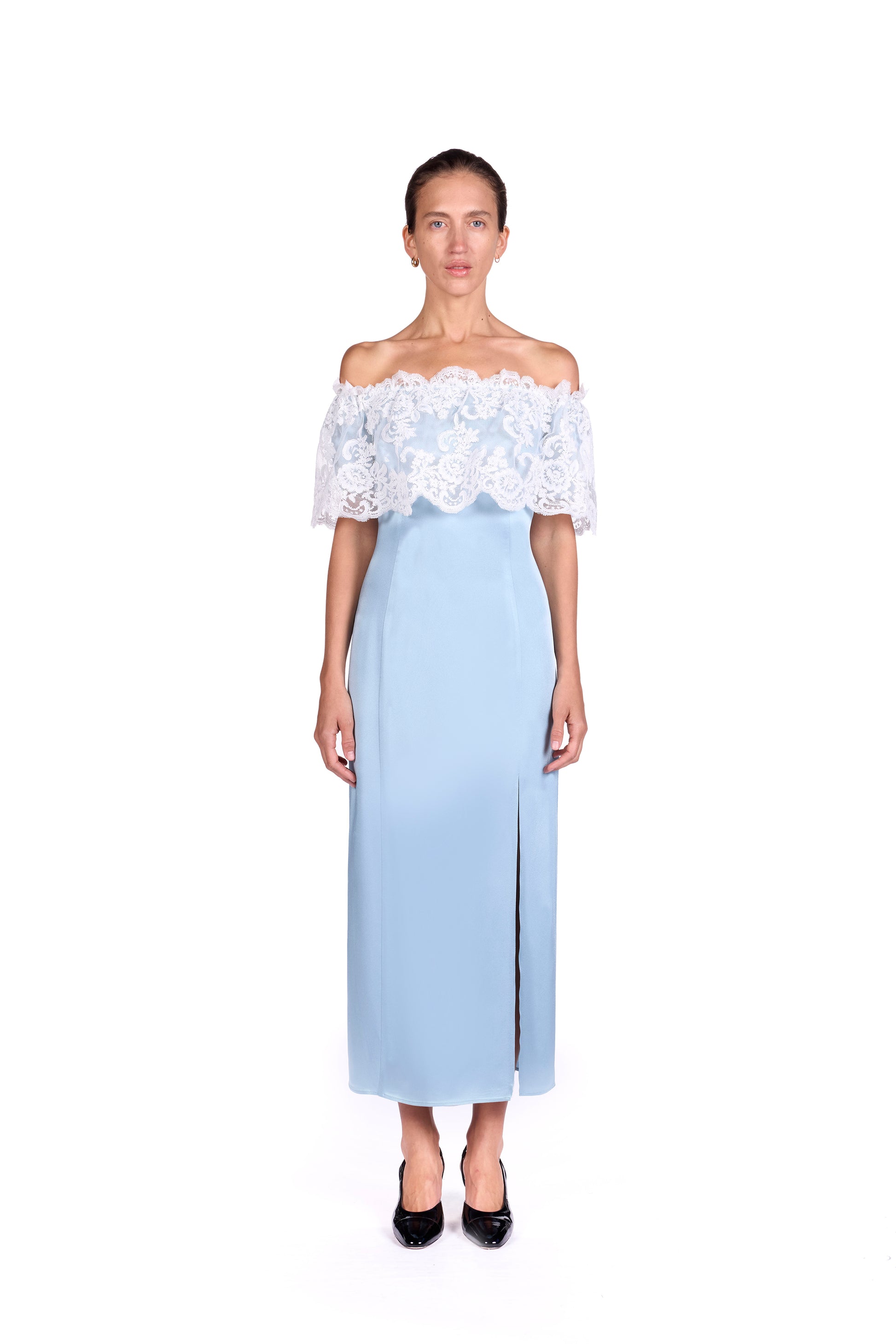 Silk midi dress with guipure lace ‘Bardot’ neckline and sharp side slit. Center back invisible zip closure.