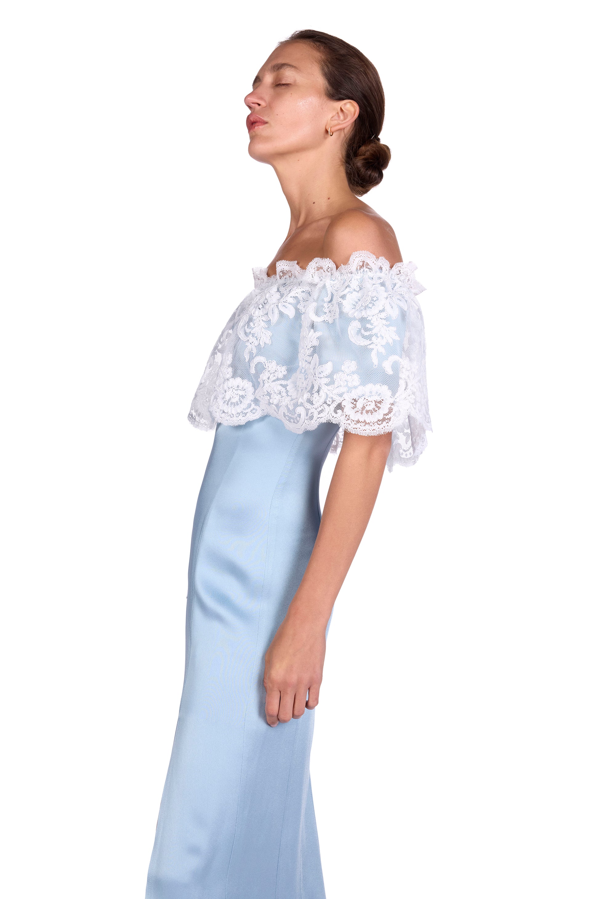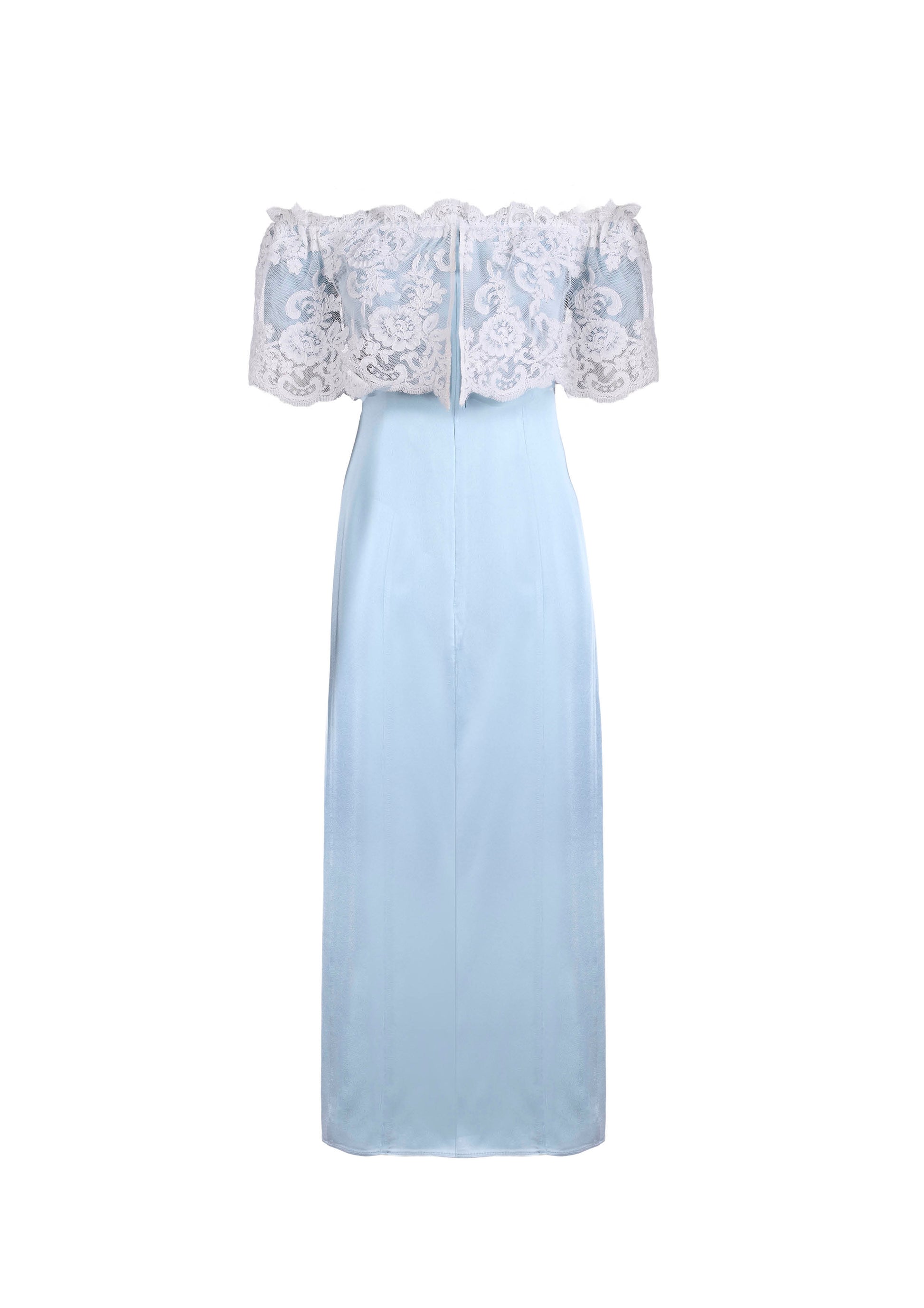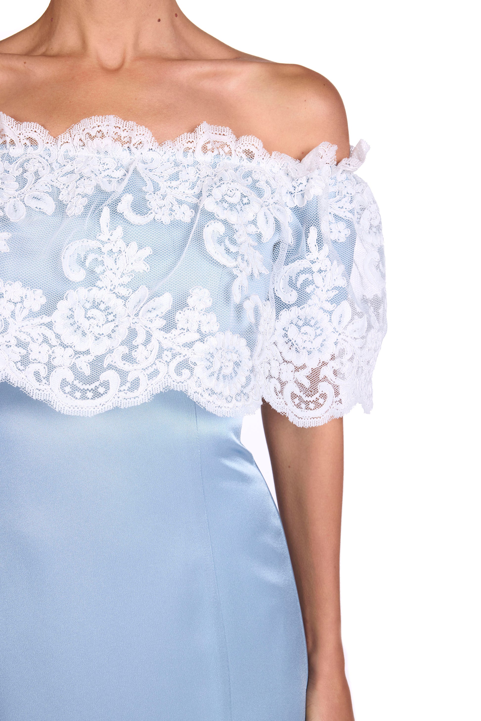 Silk midi dress with guipure lace ‘Bardot’ neckline and sharp side slit. Center back invisible zip closure.