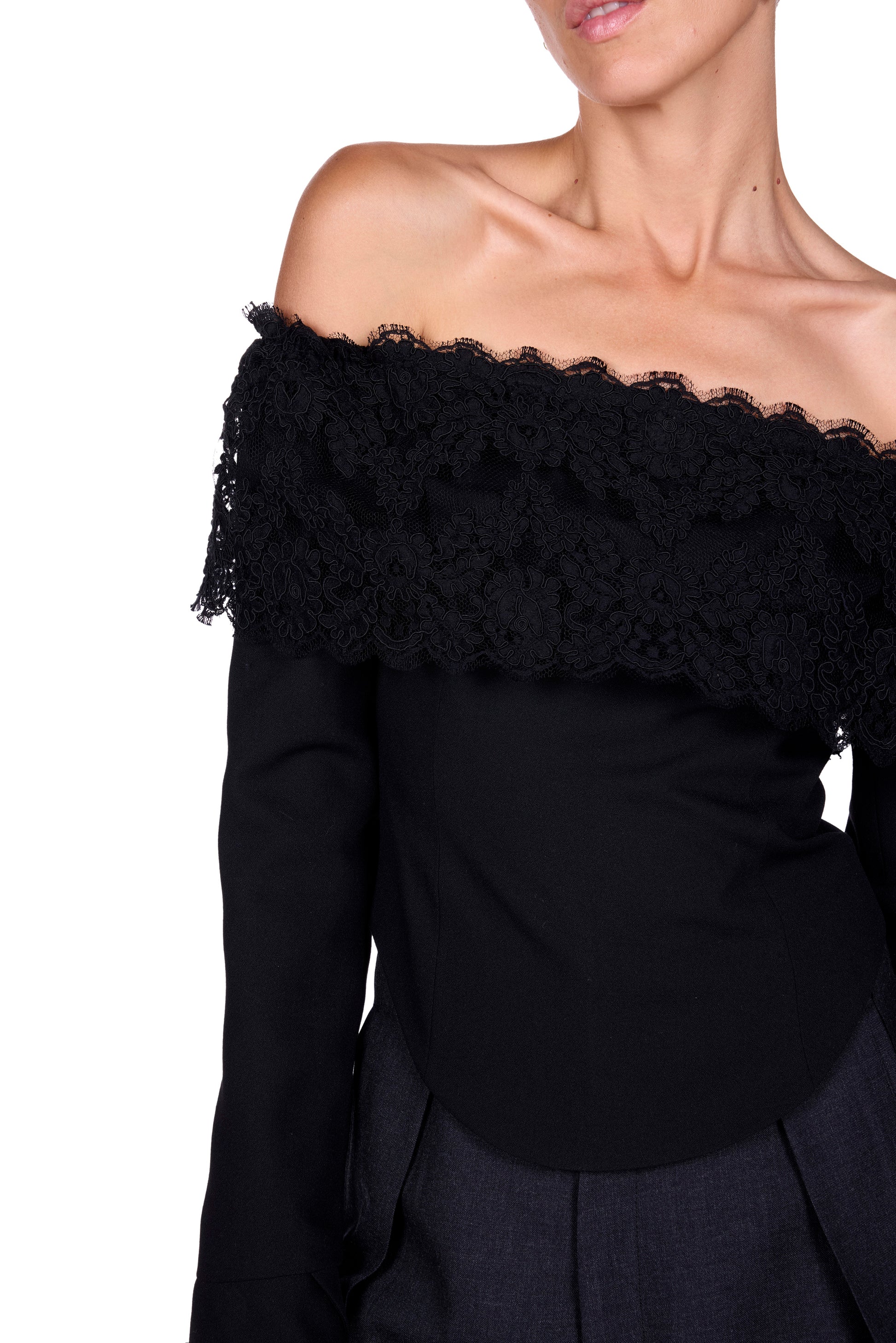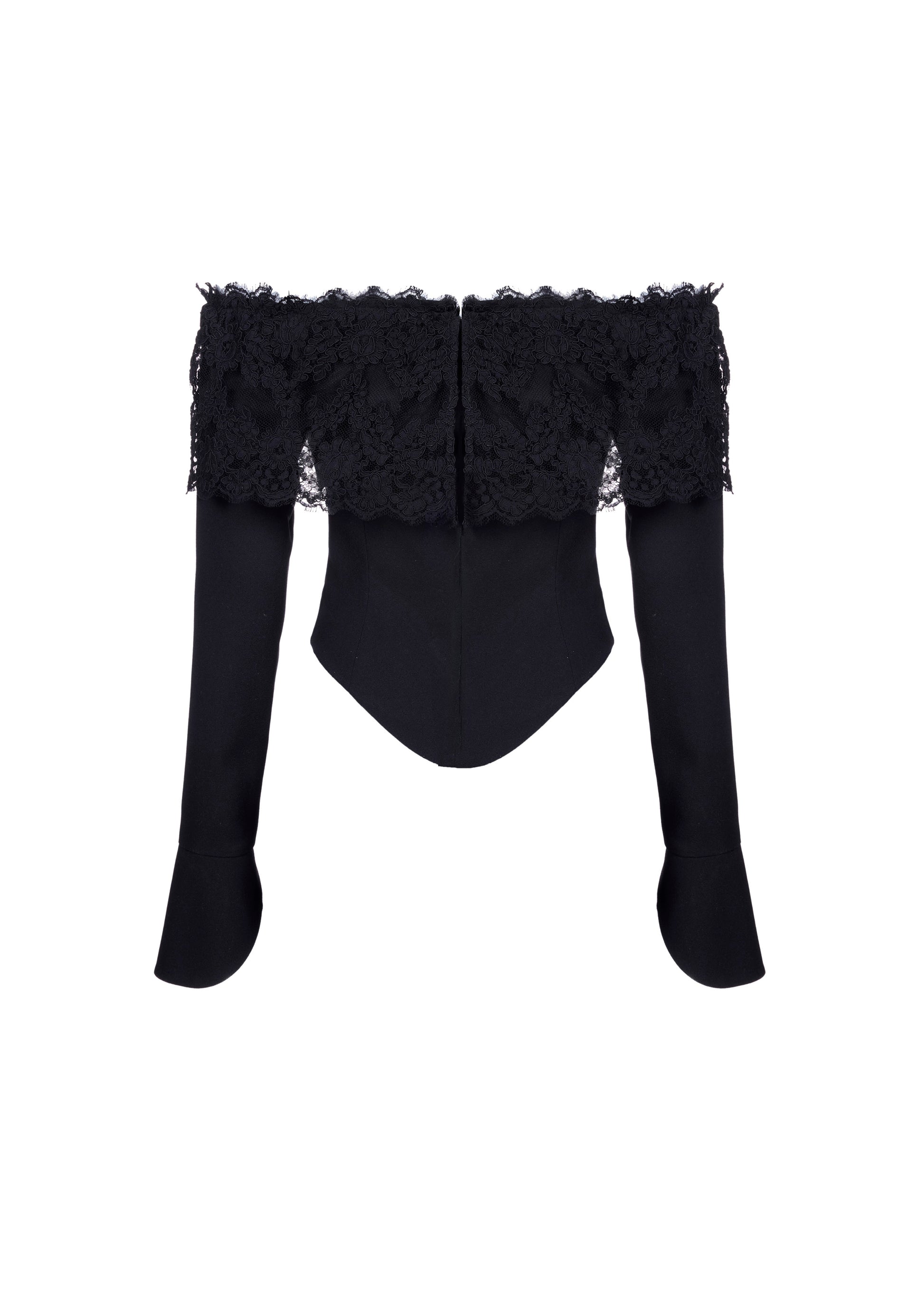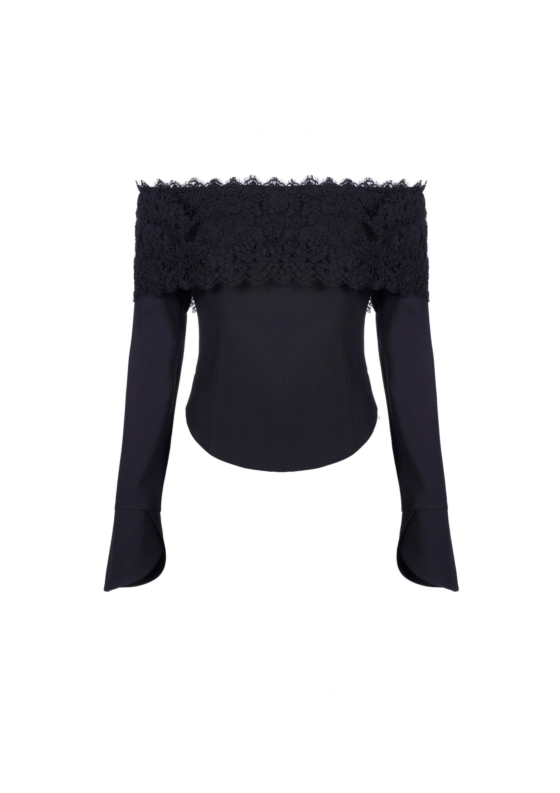 Crepe top with guipure lace ‘Bardot’ neckline, and long sleeves. Center back invisible zip closure.