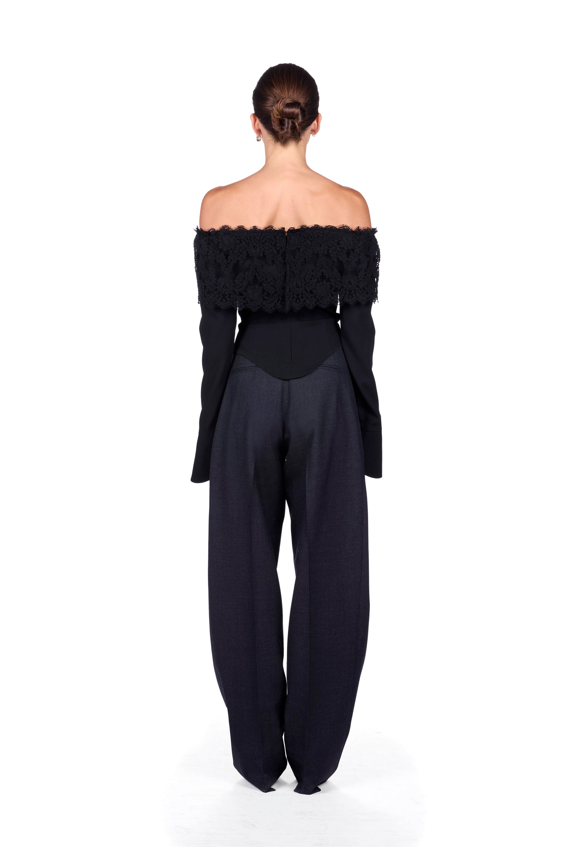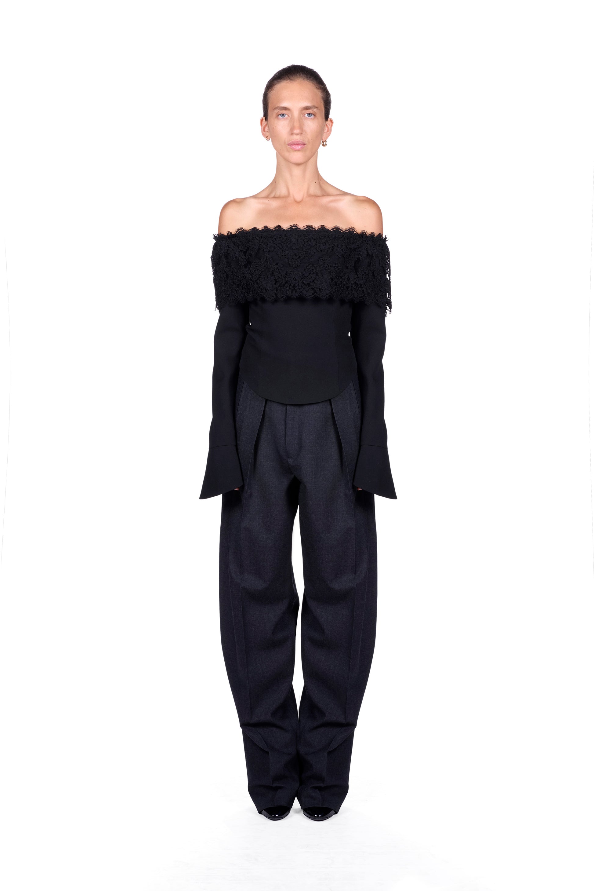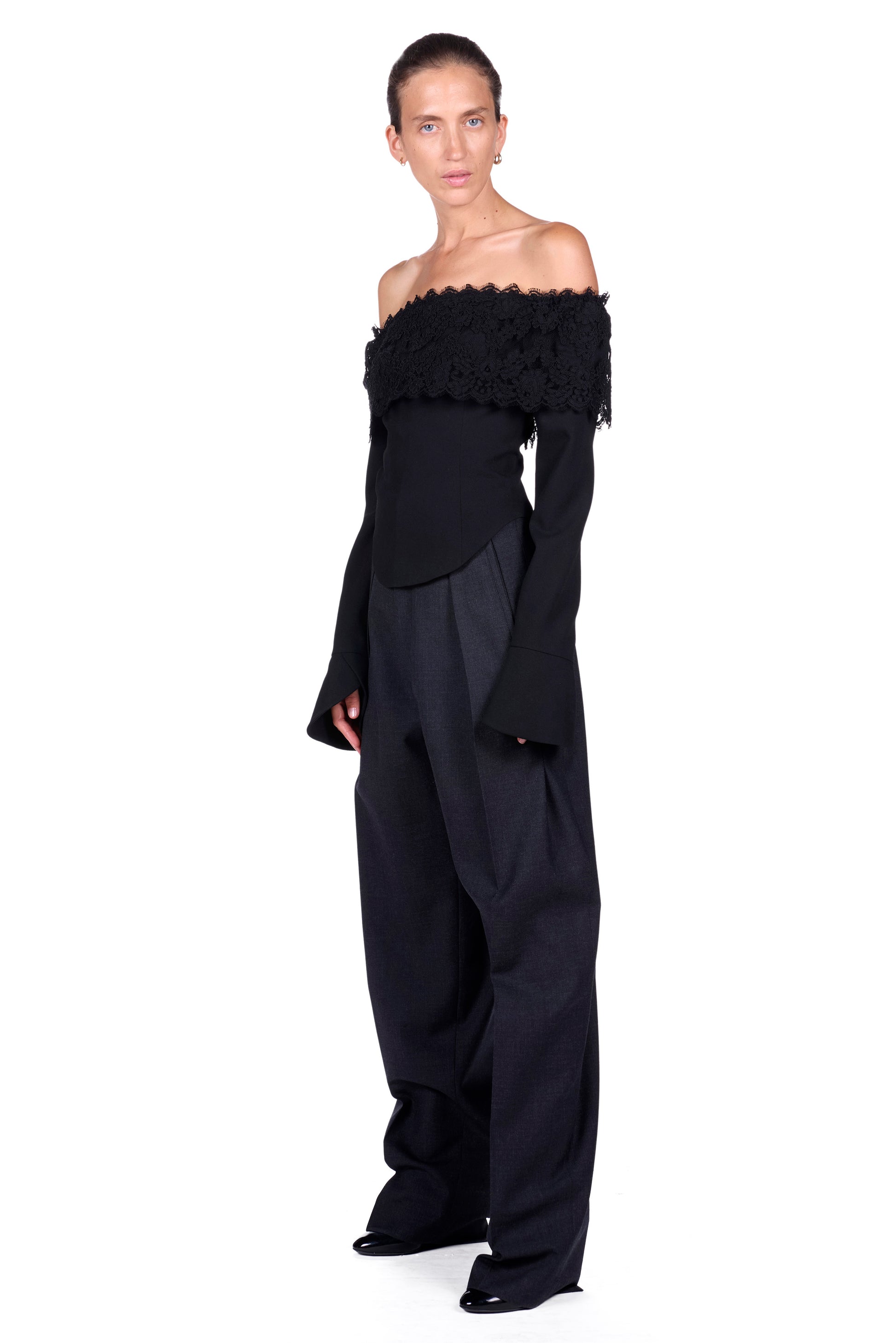 Crepe top with guipure lace ‘Bardot’ neckline, and long sleeves. Center back invisible zip closure.