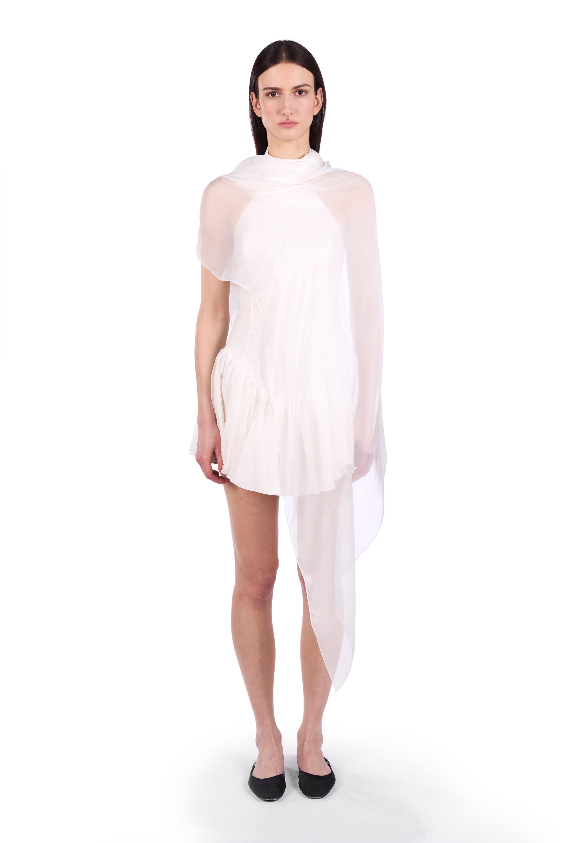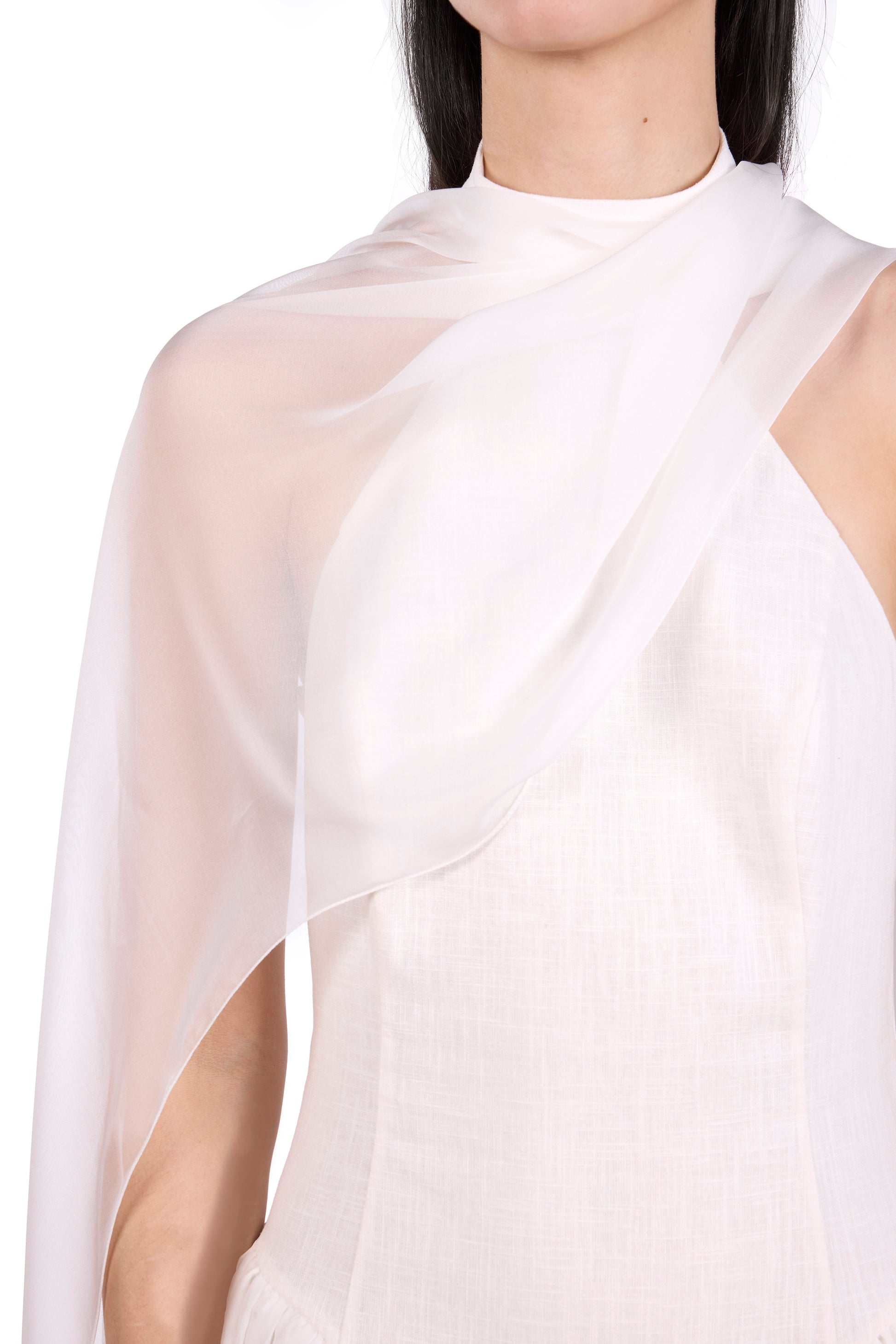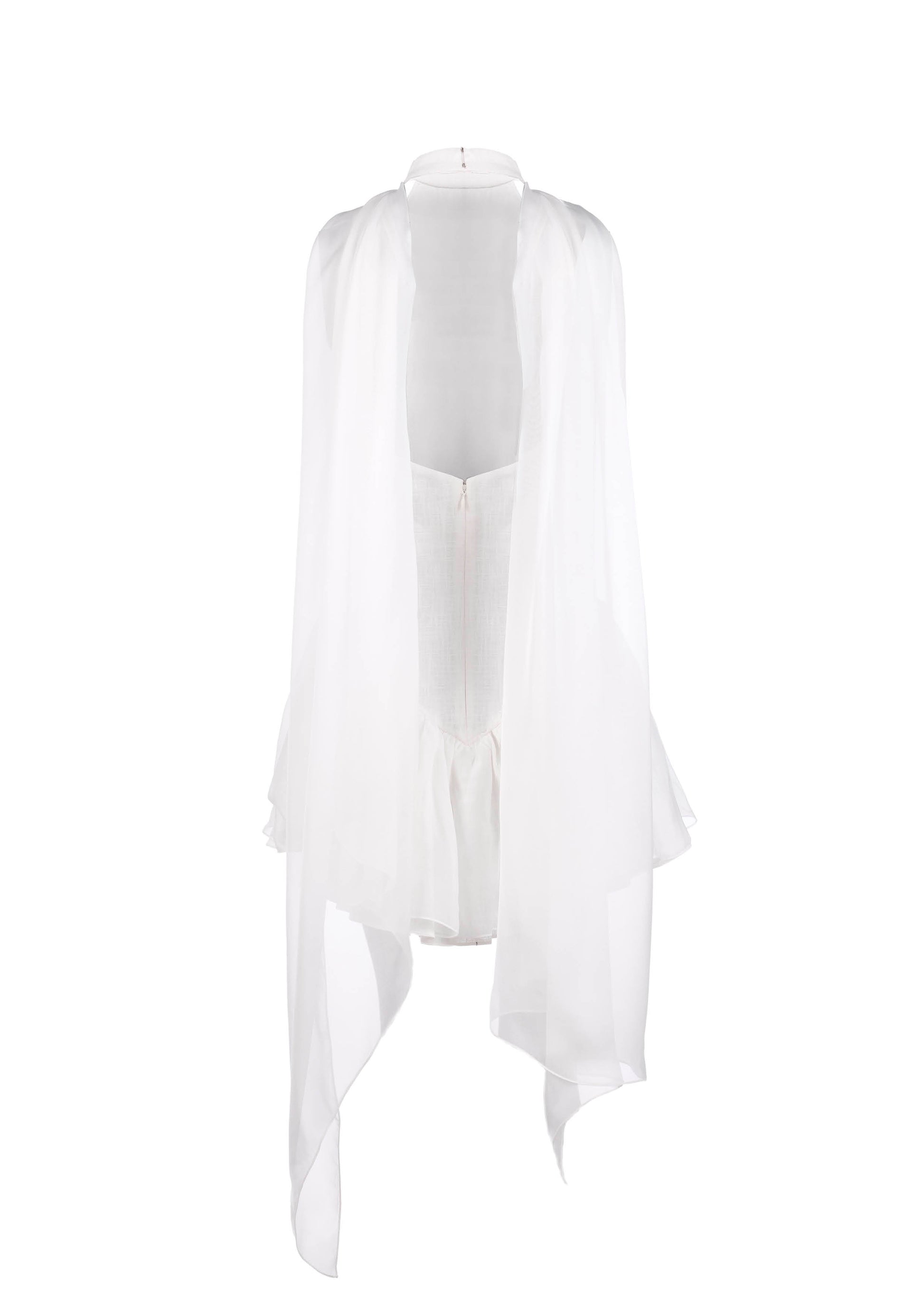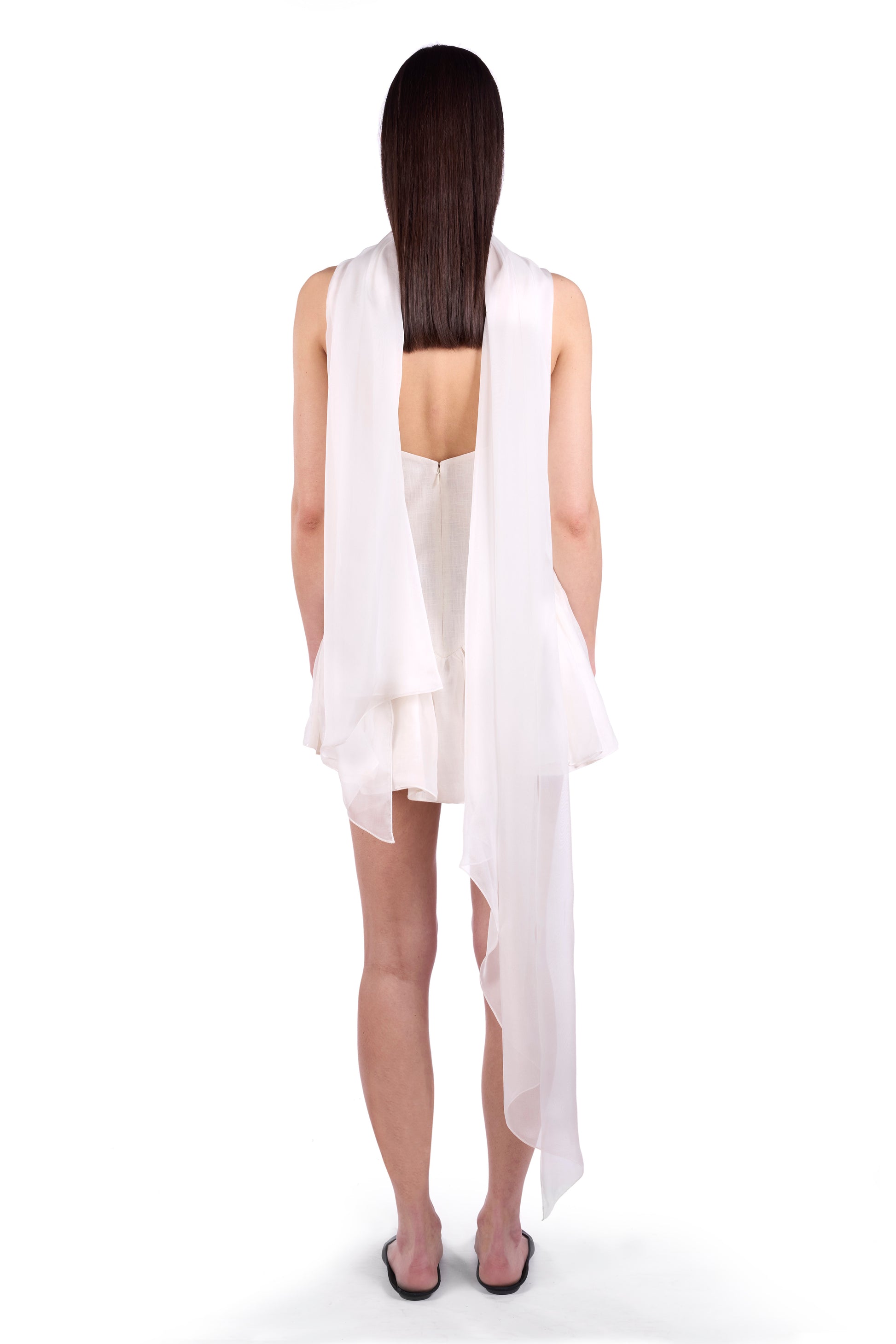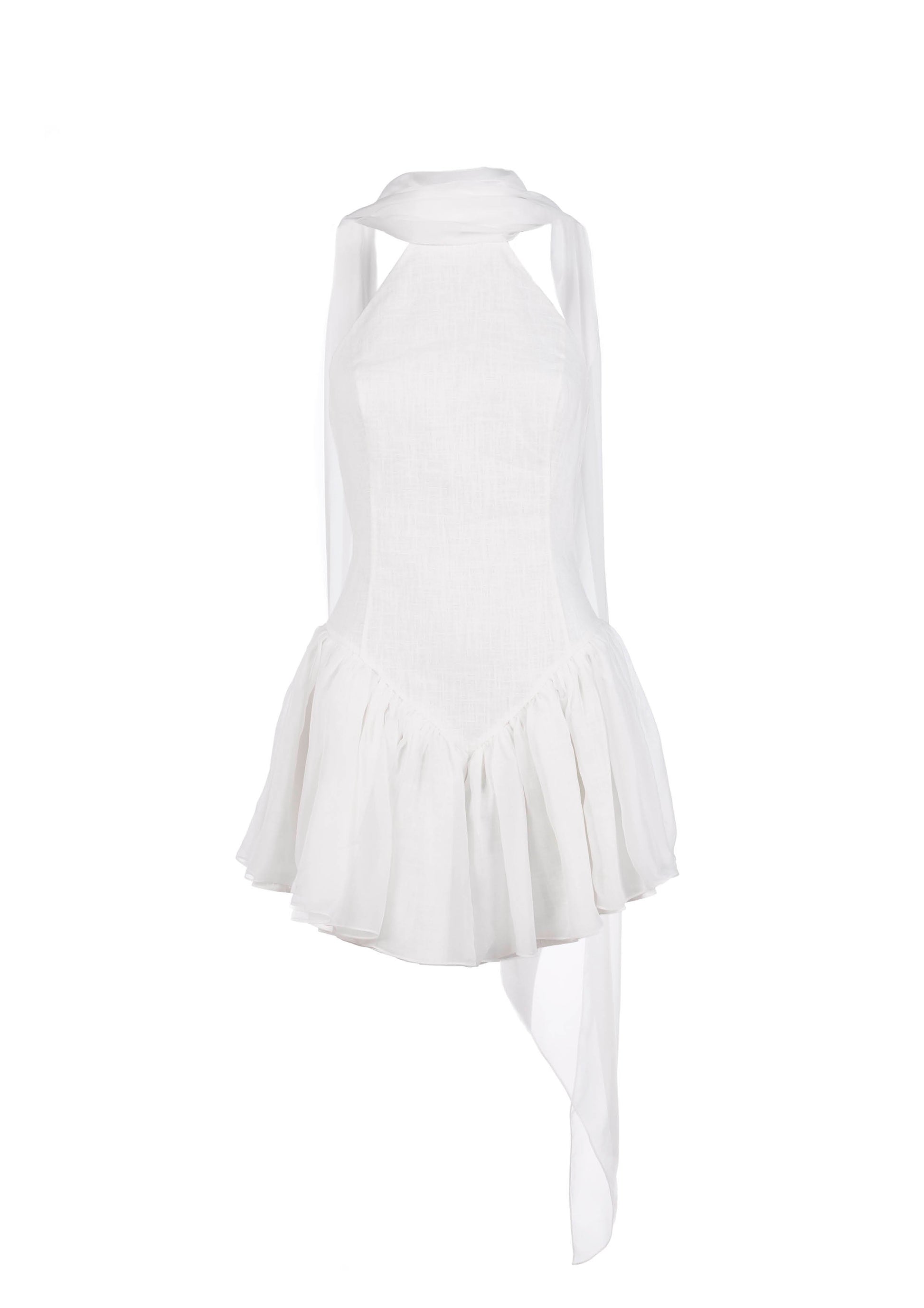 Short linen dress with halter neckline and open back. This dress has a silk mousseline scarf attached to its collar and can be thrown to the back or front as a scarf. Center back invisible zip closure.