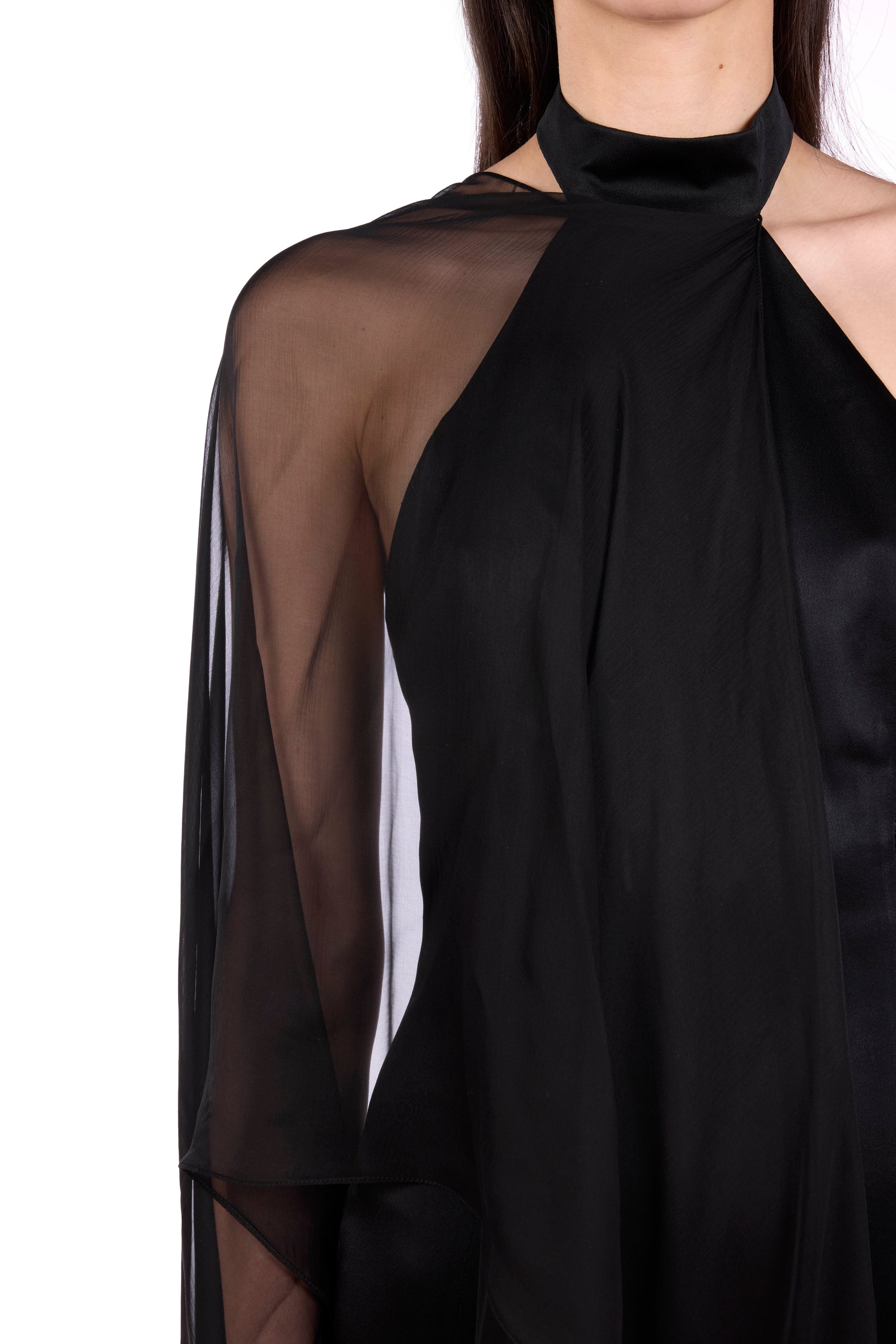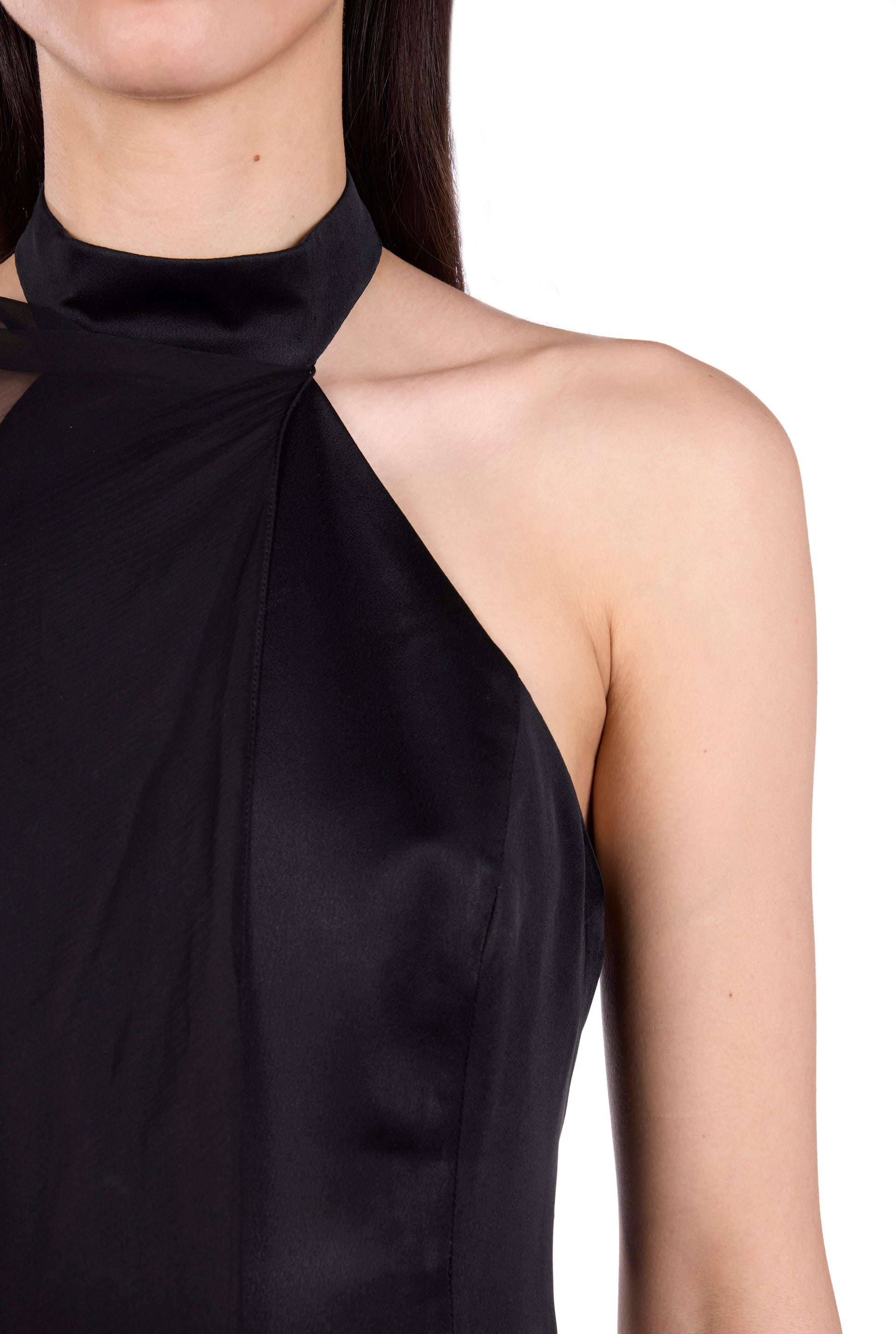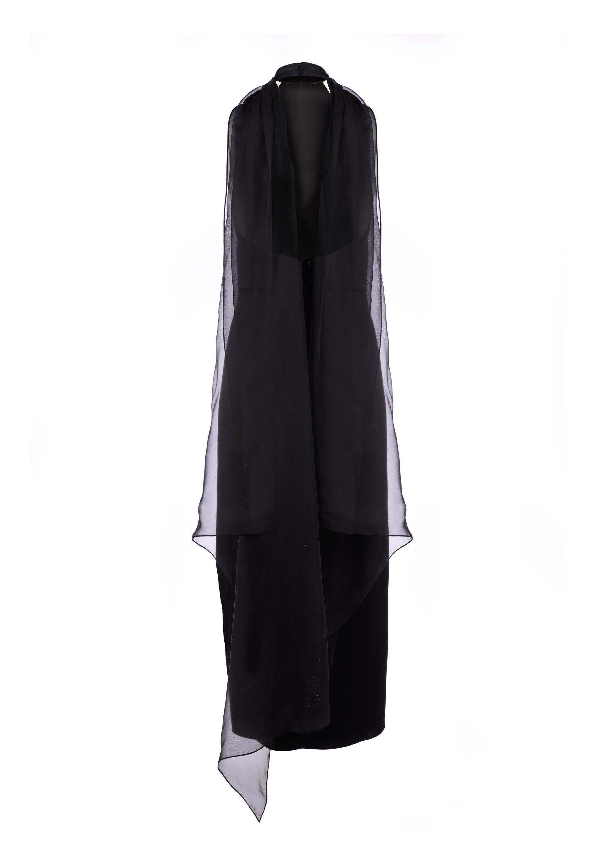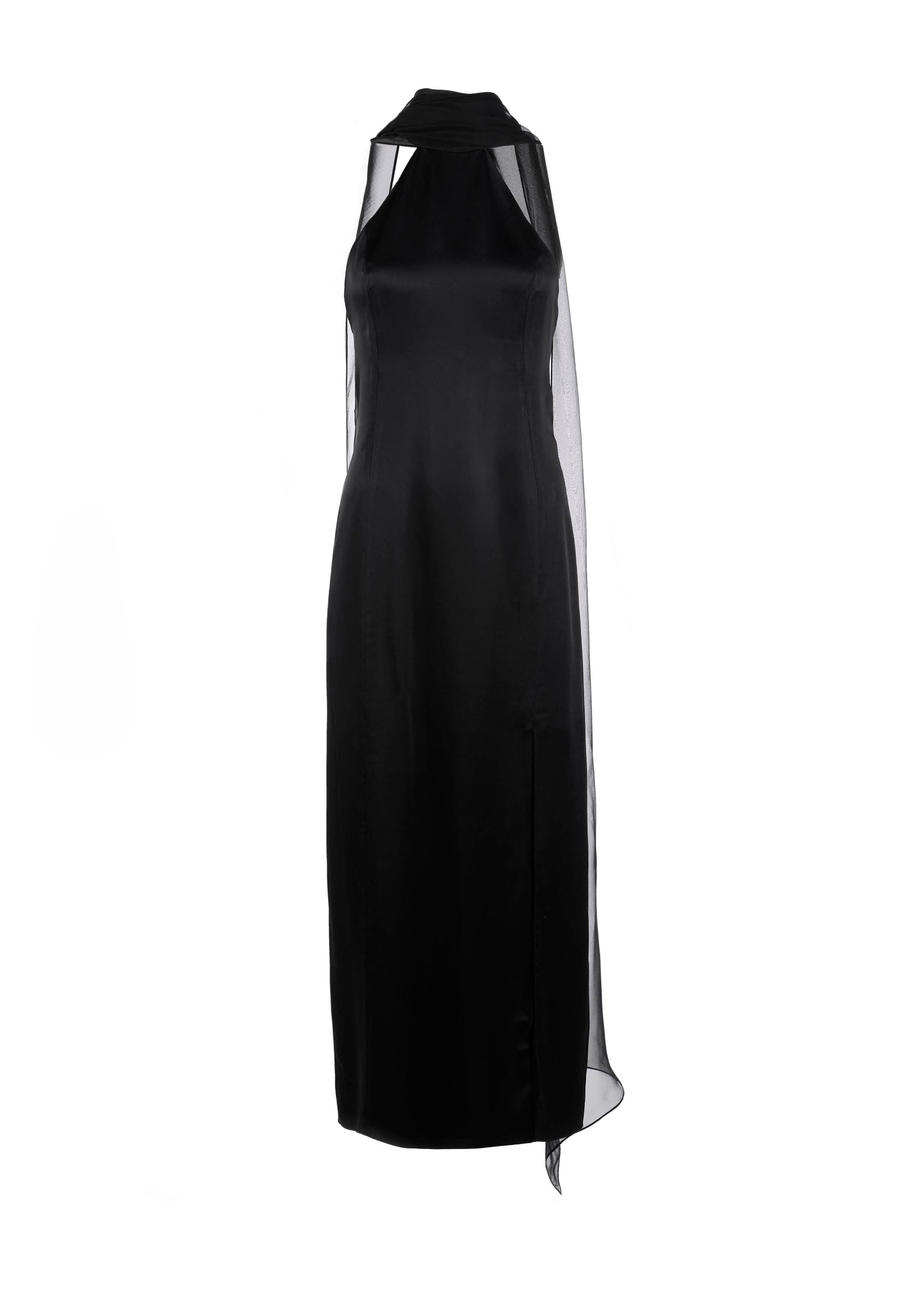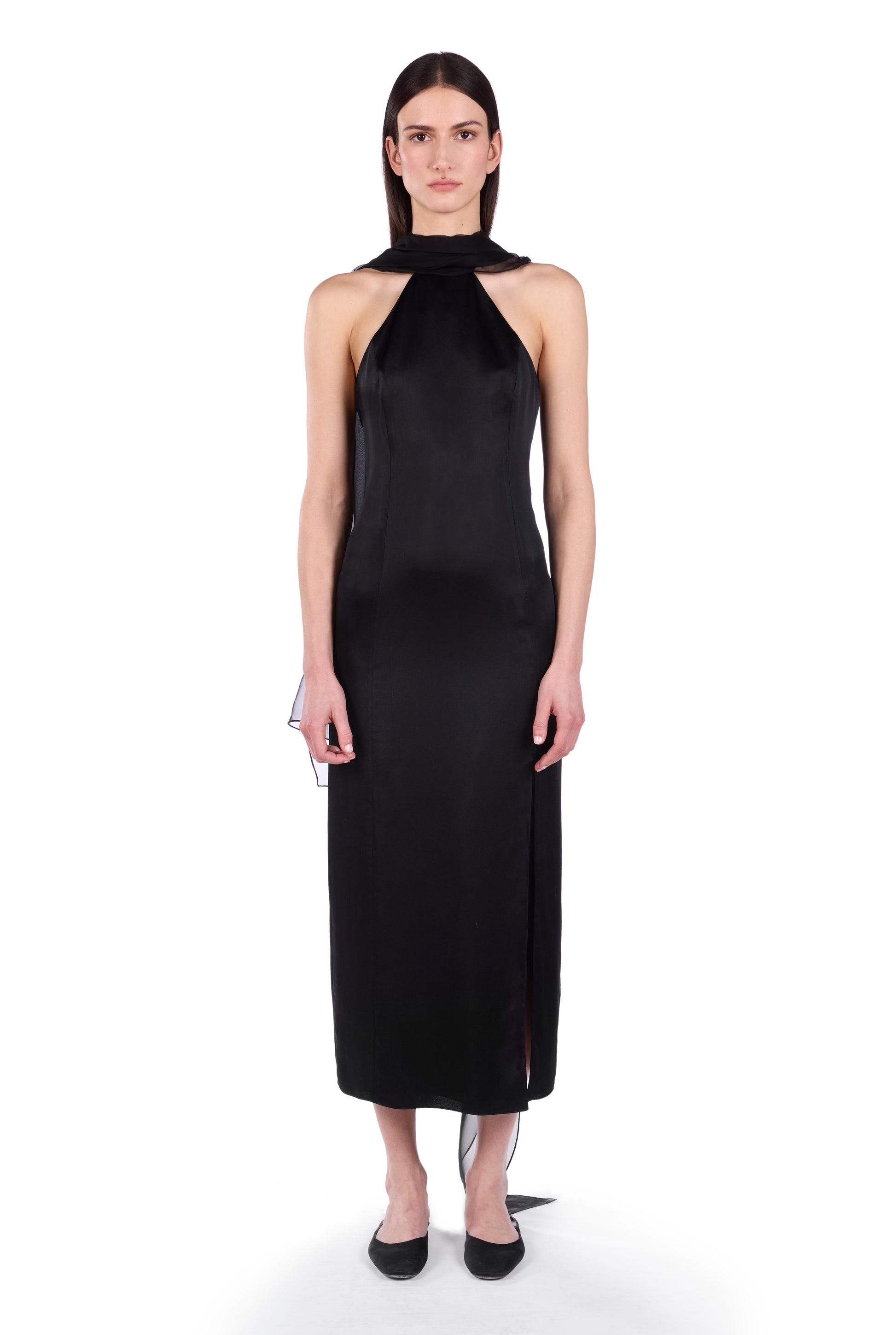 Satin midi dress with halter neckline and open back. This dress has a silk mousseline scarf attached to its collar and can be thrown to the back or front as a scarf. Center back invisible zip closure.
