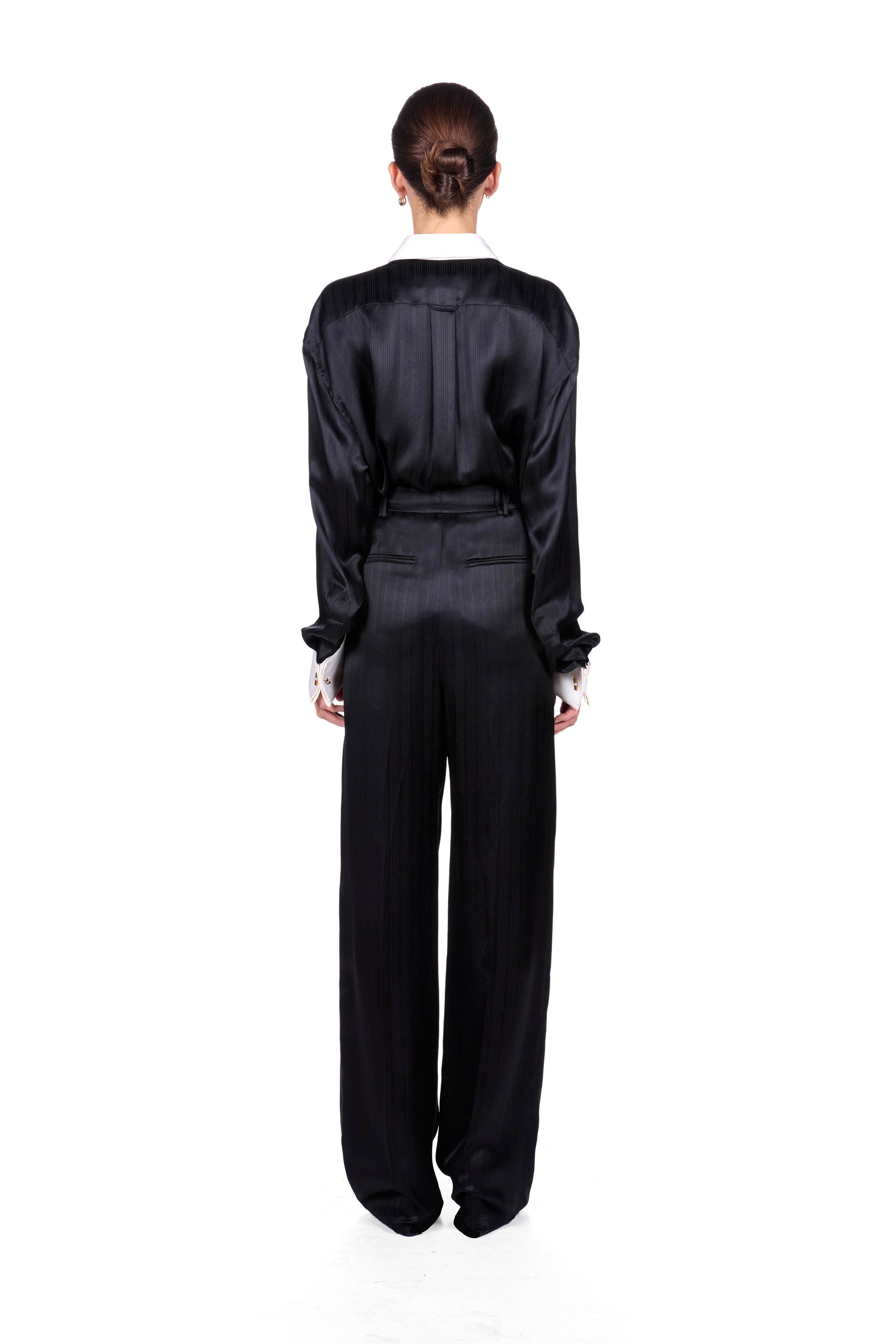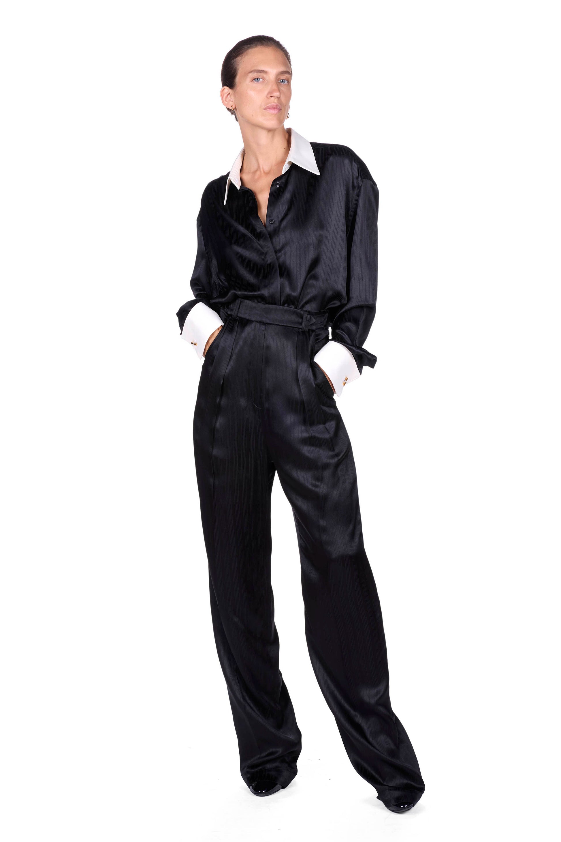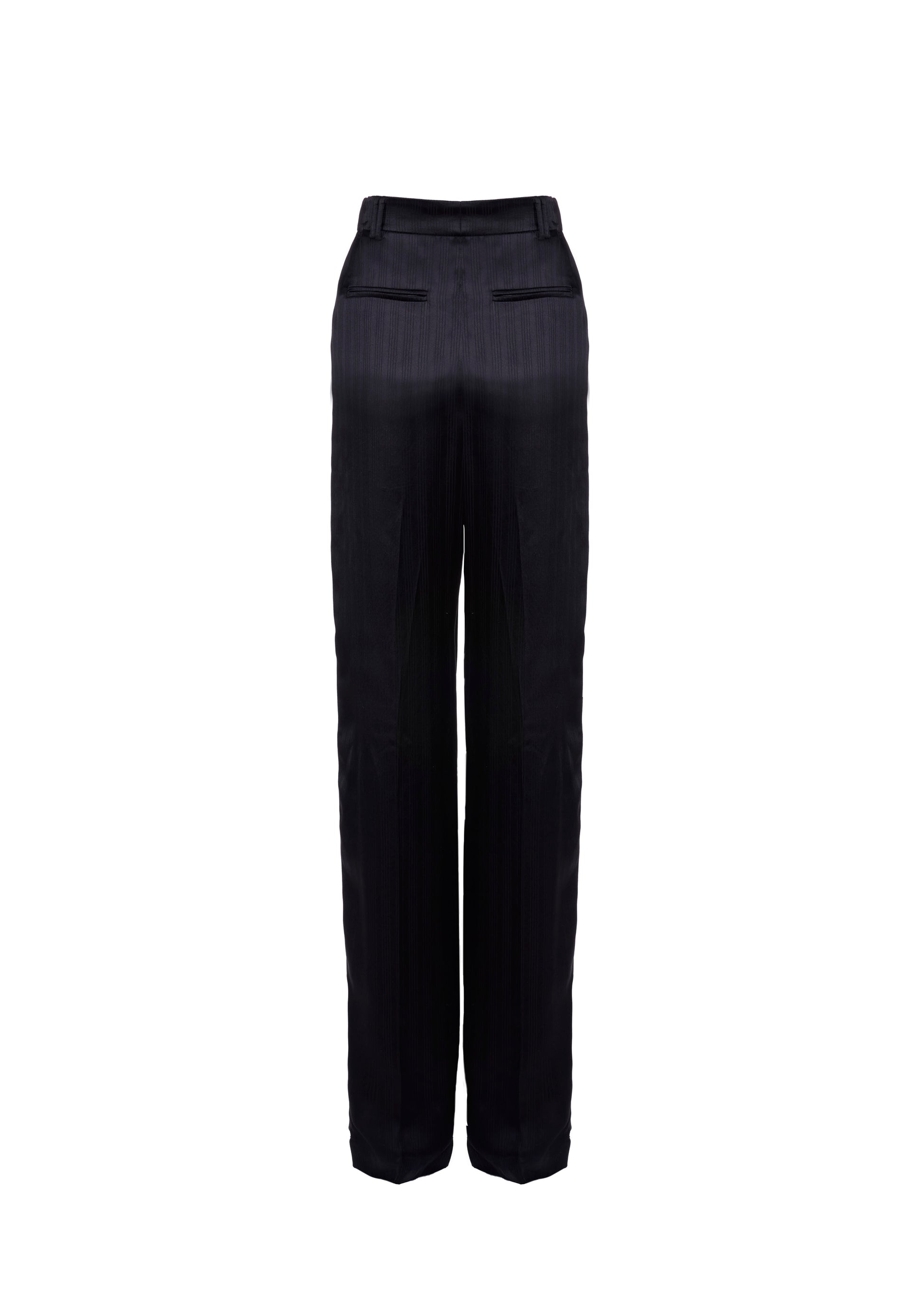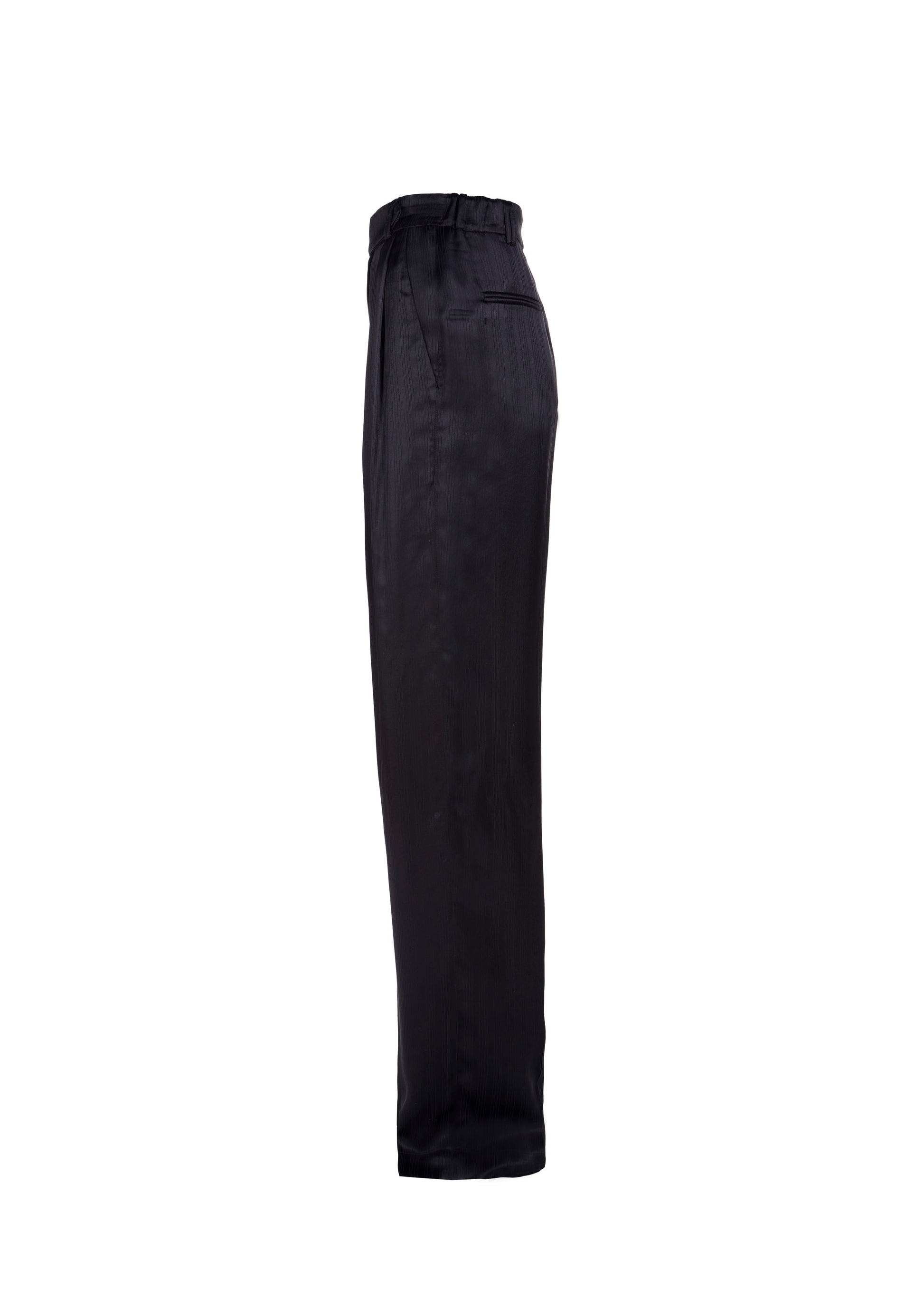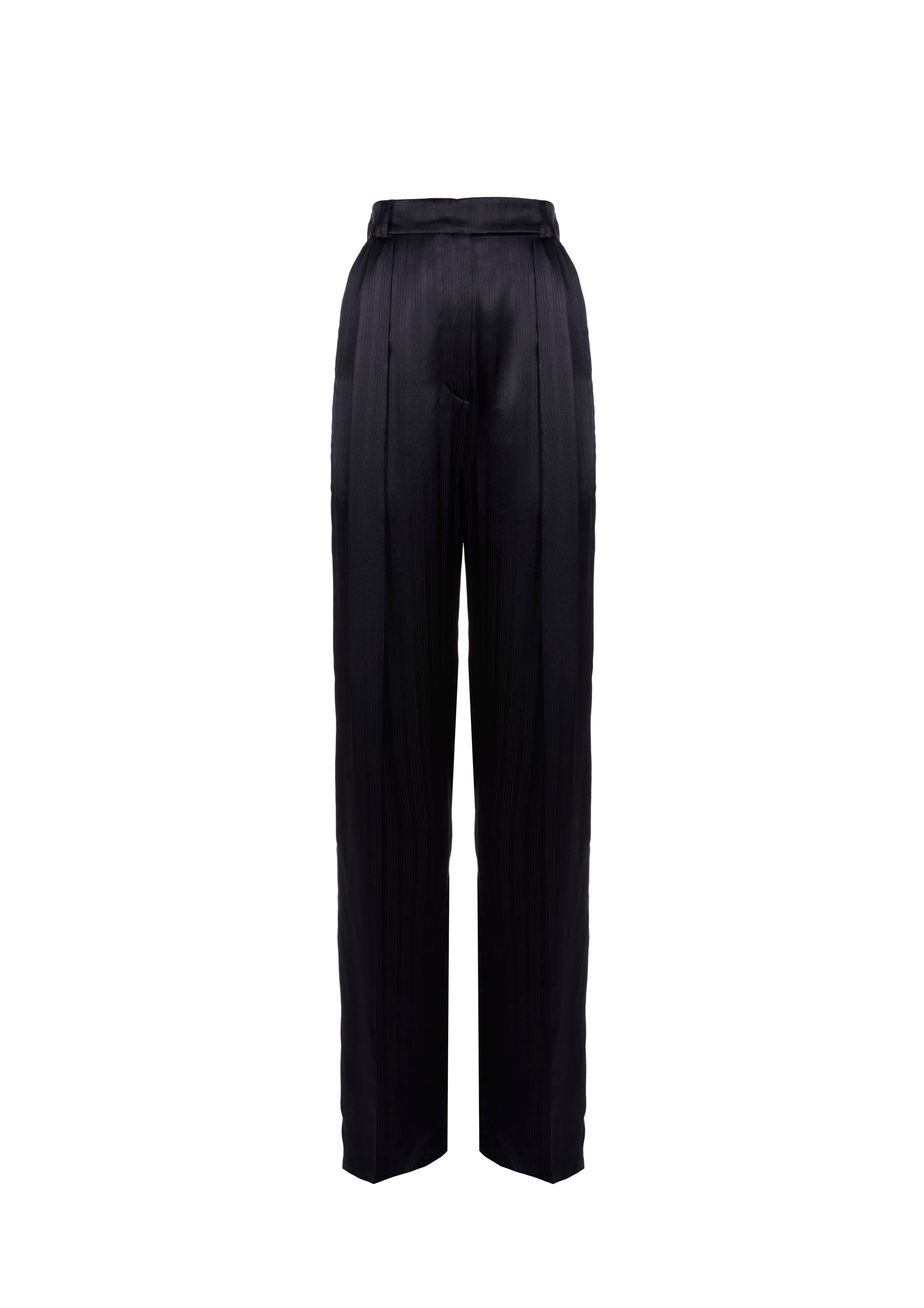 Double-pleated high-waisted pants in silk satin with elastic detail at the waist.