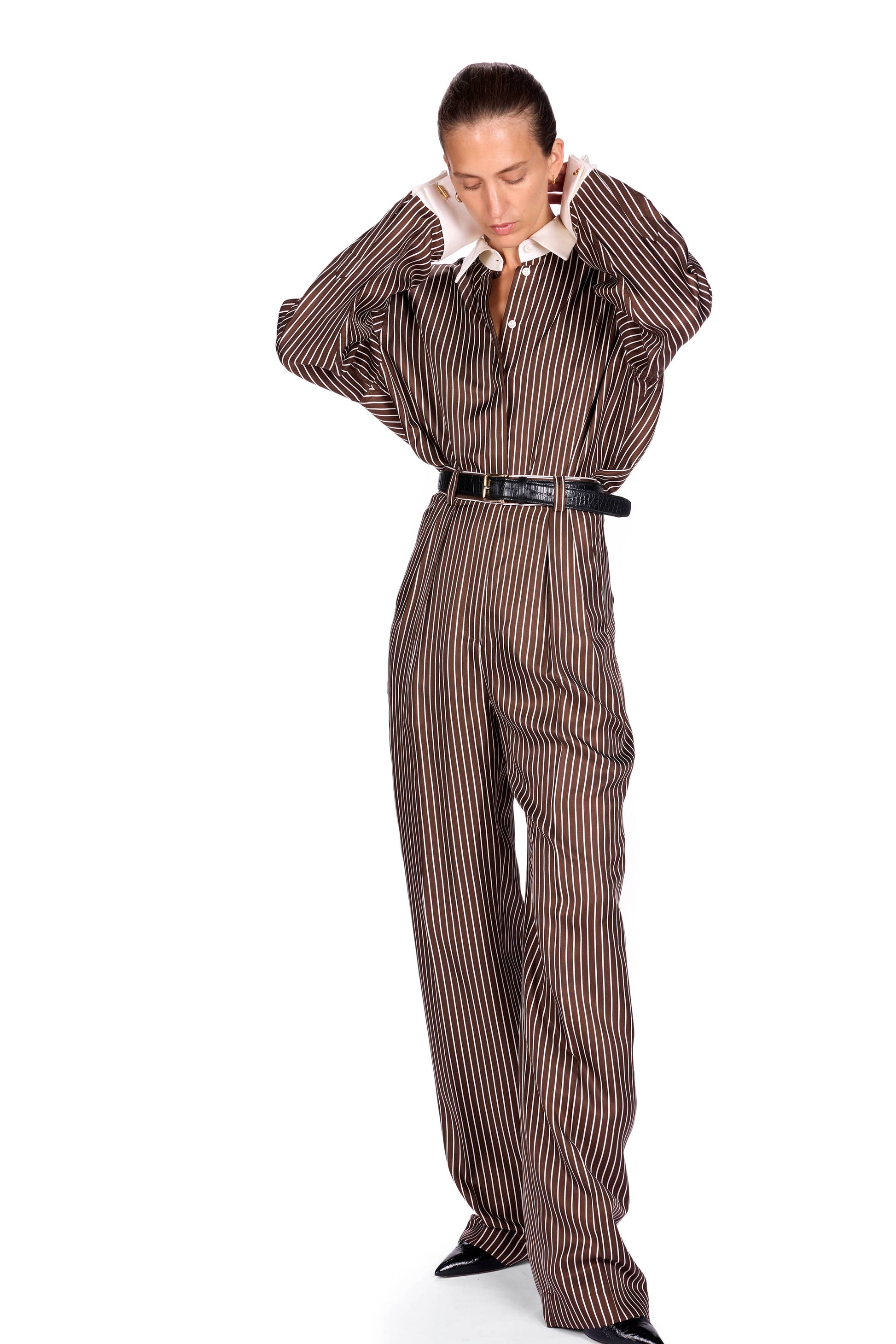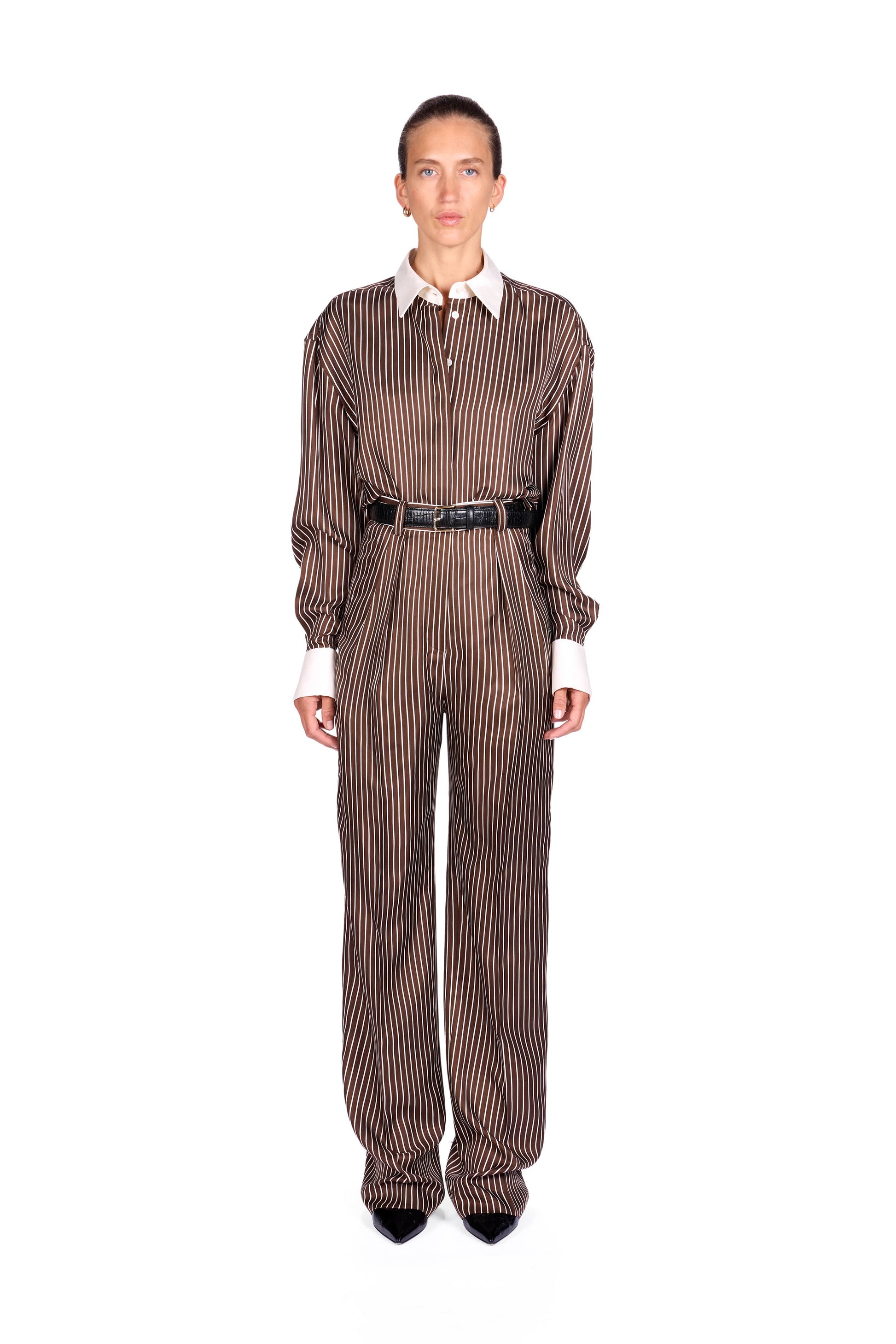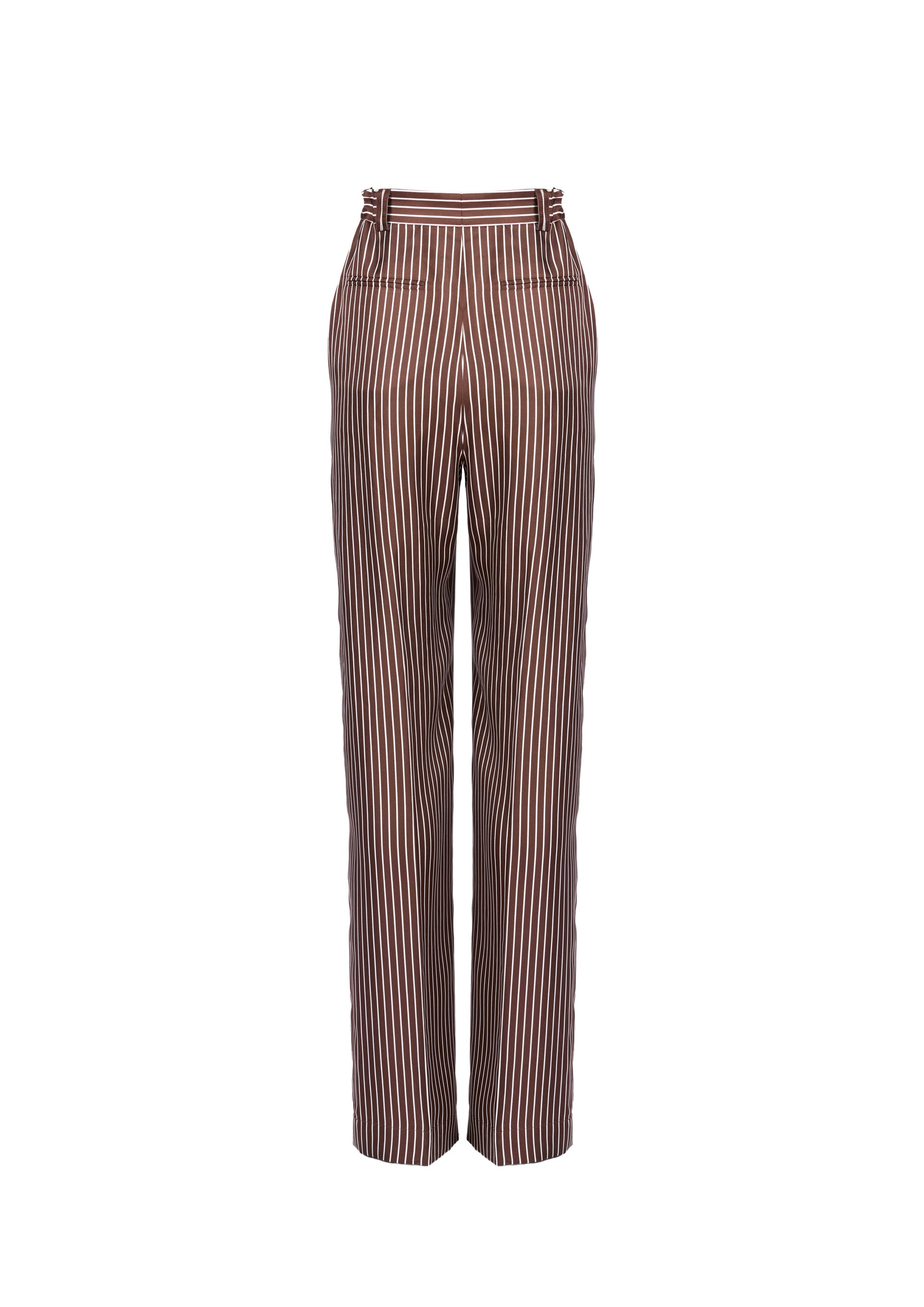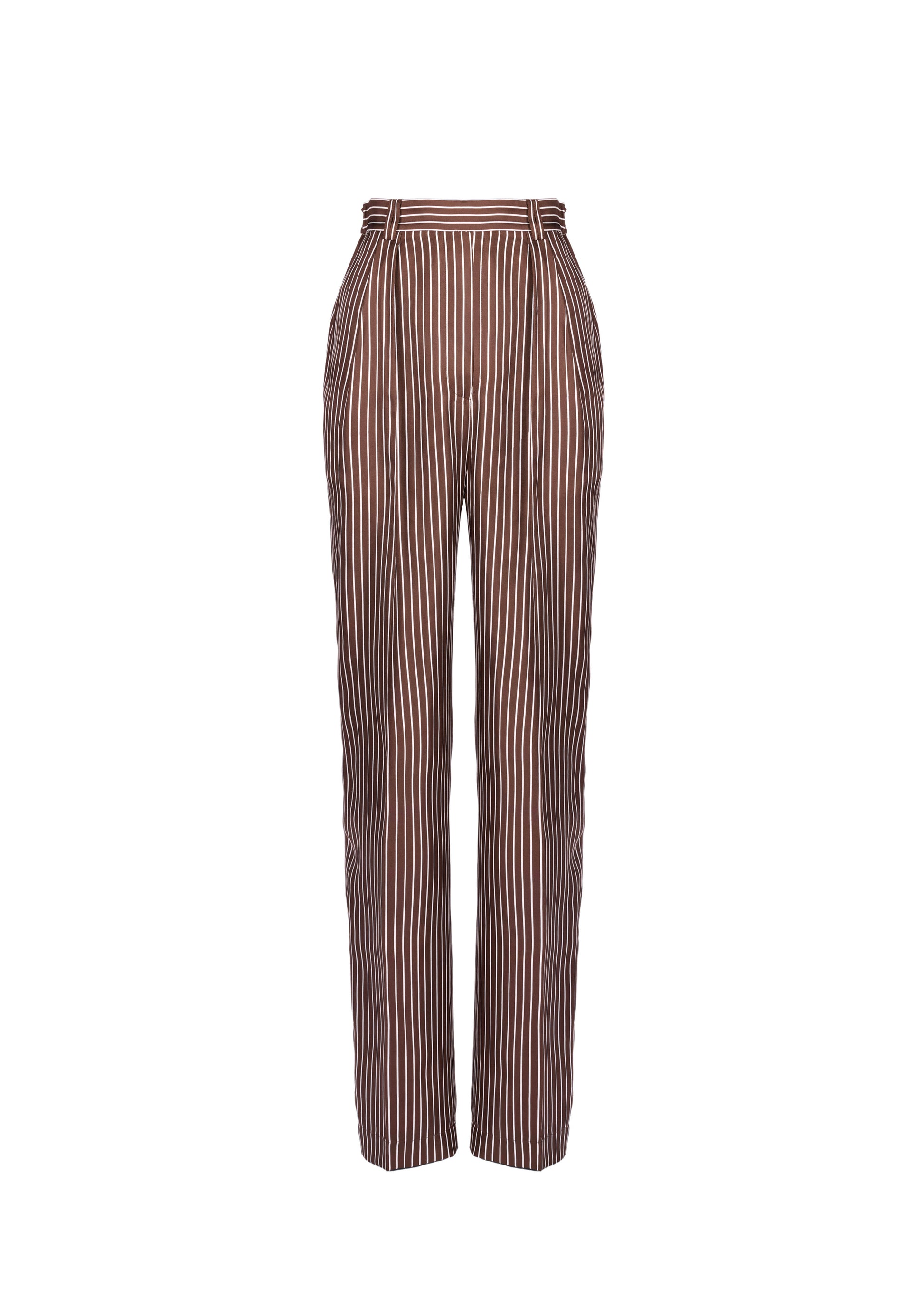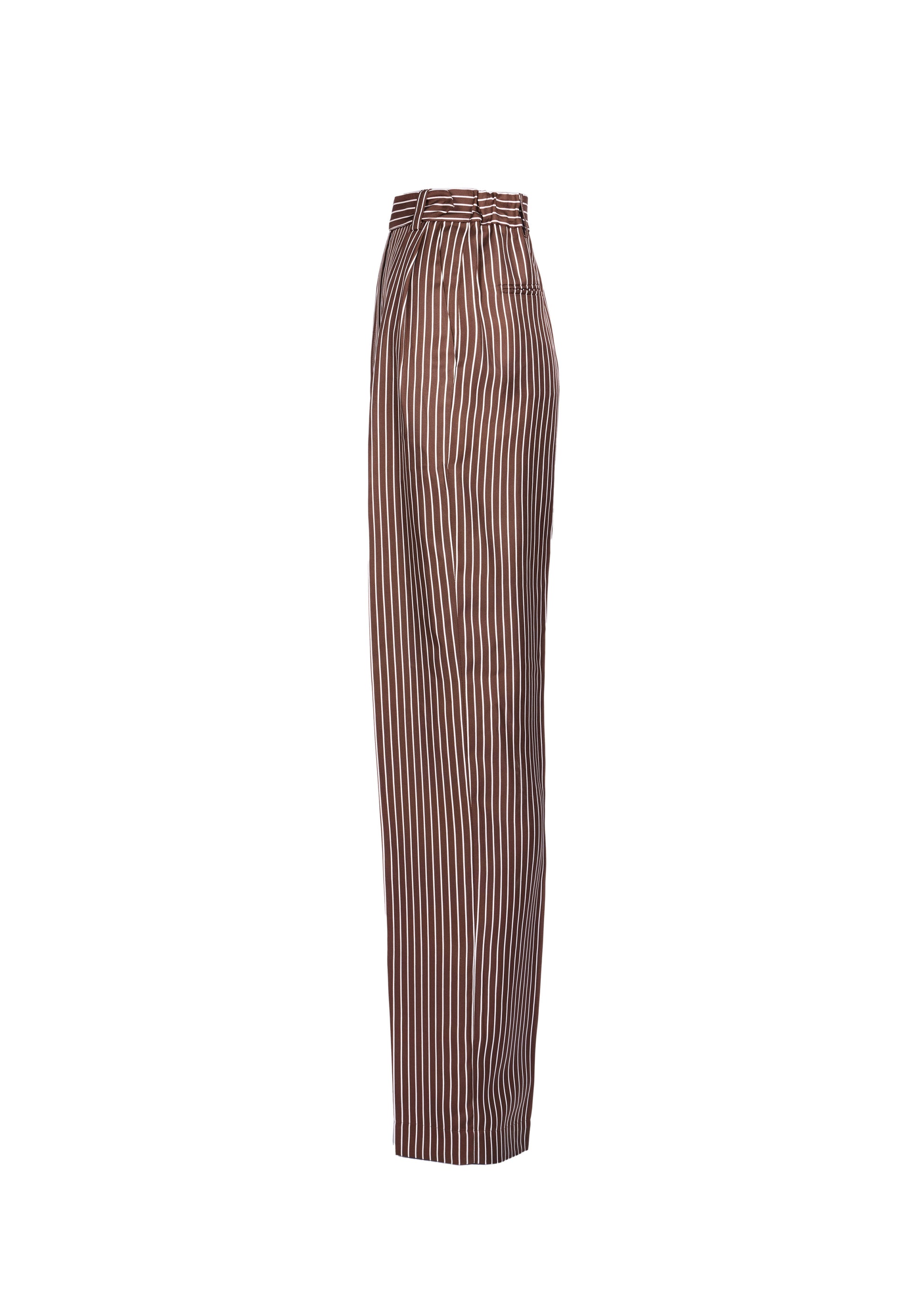 Double-pleated high-waisted pants in silk satin with elastic detail at the waist.