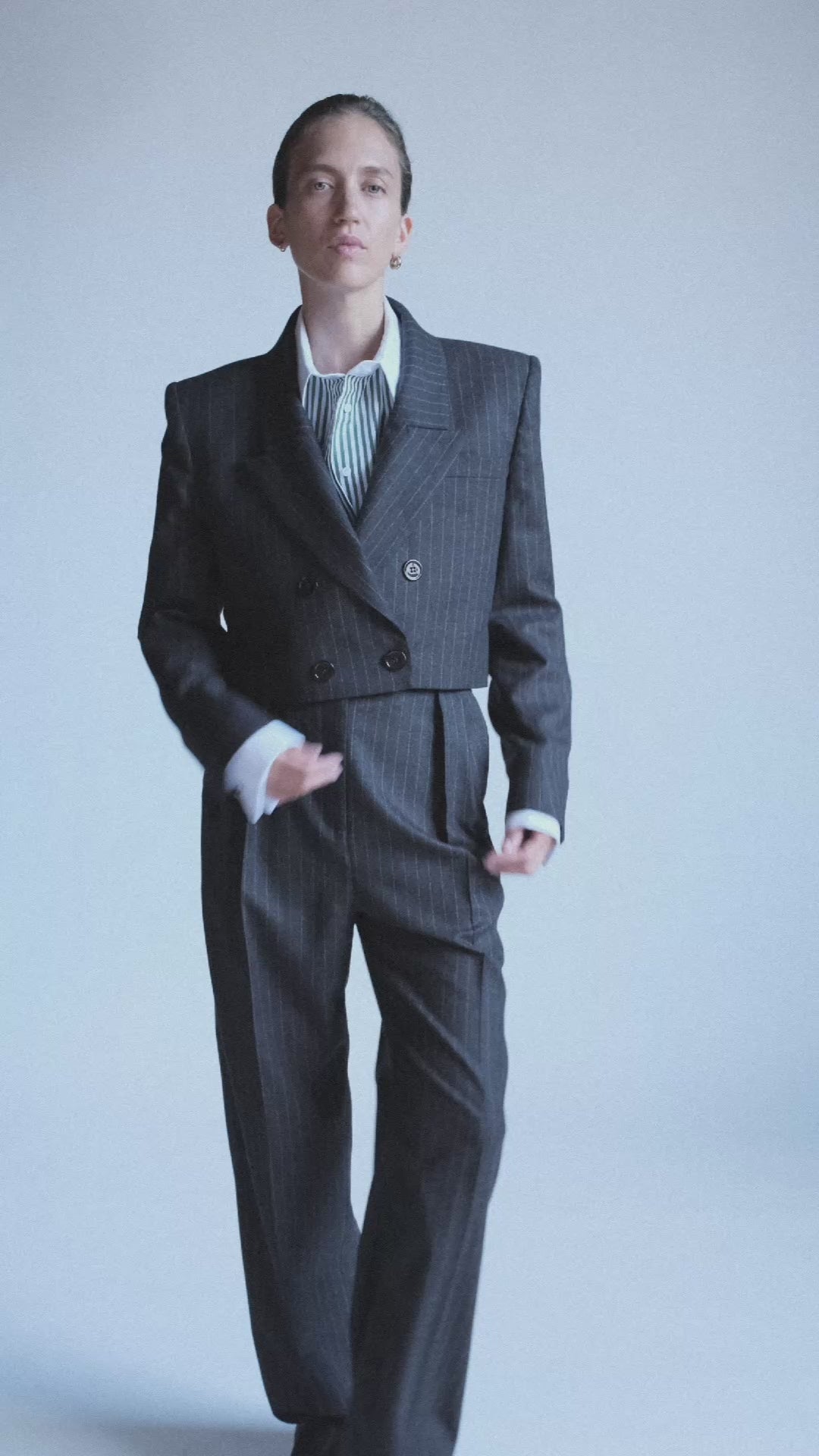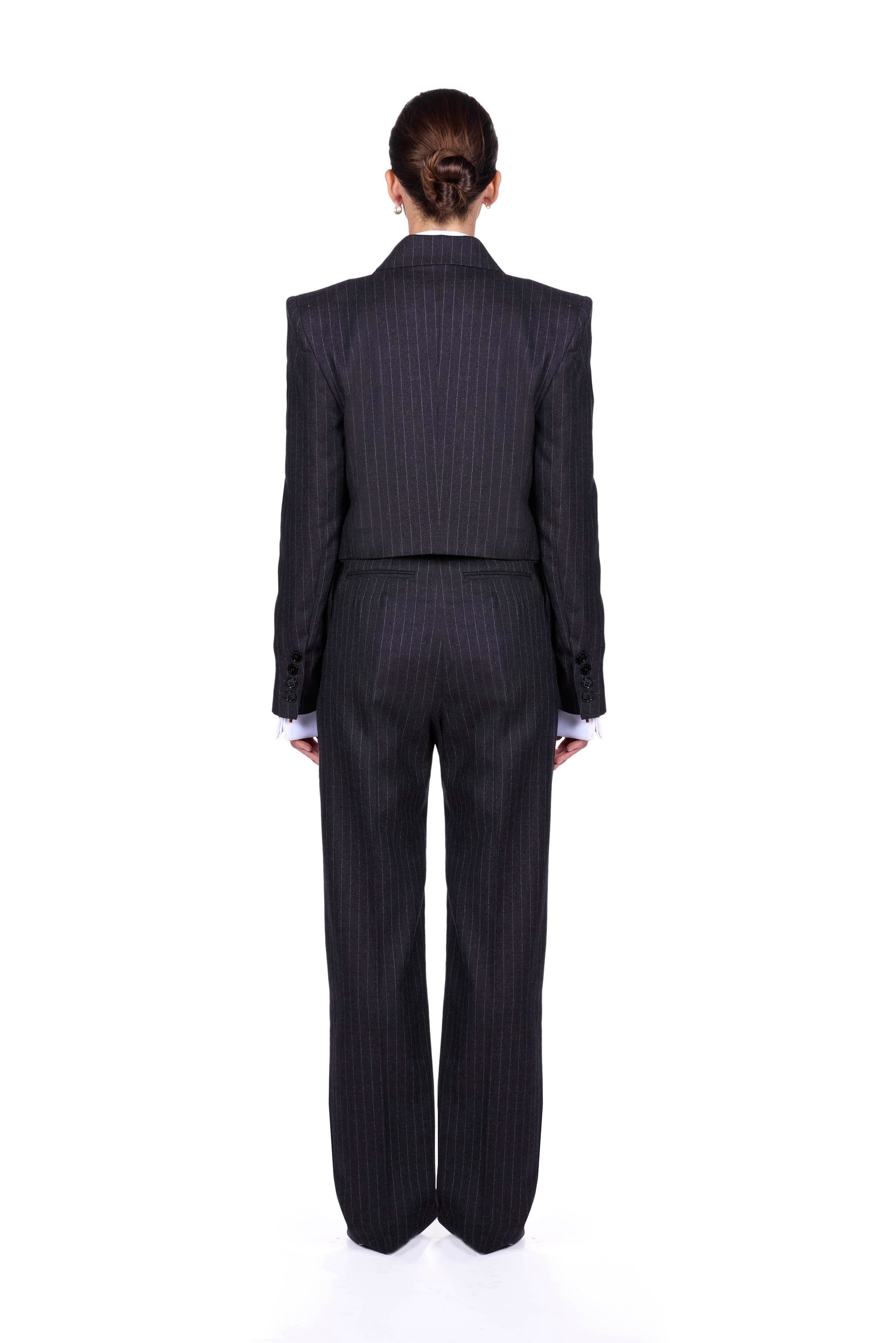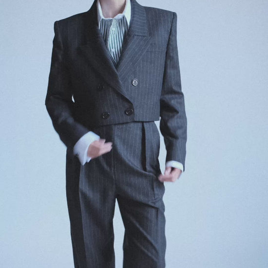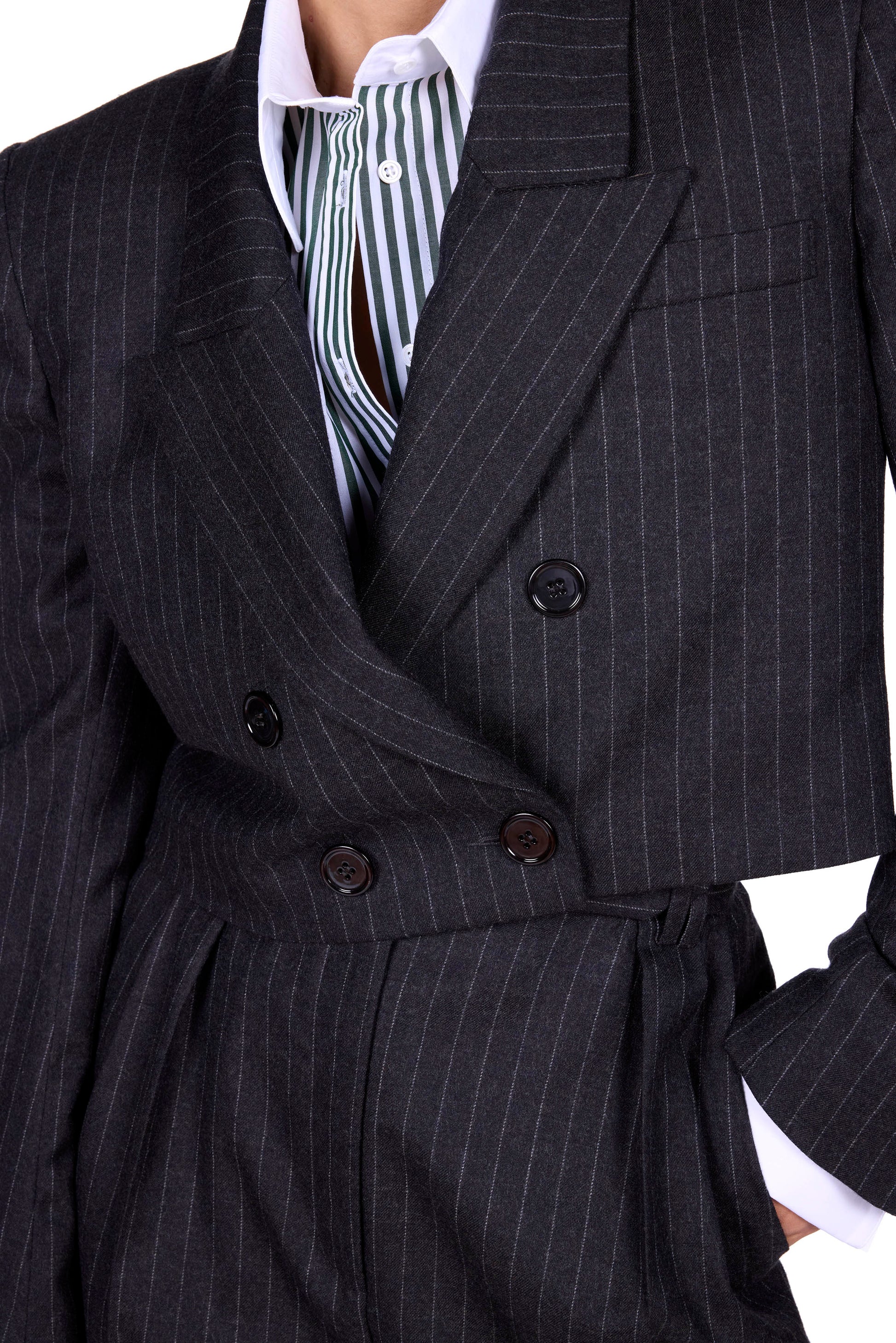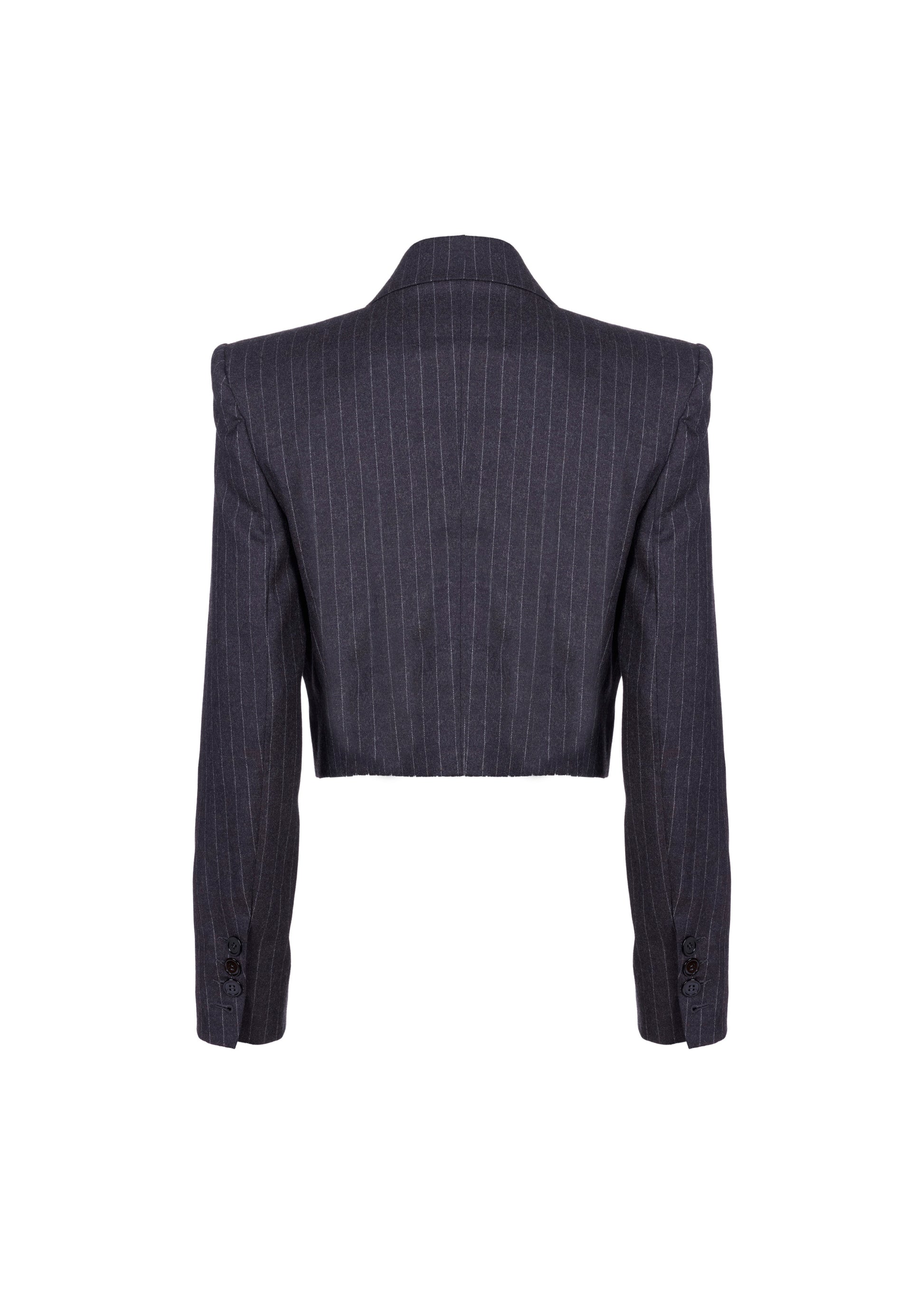 Light-weight striped wool cropped jacket with peak collar. Tailored with lightweight front panel and shoulder pads.