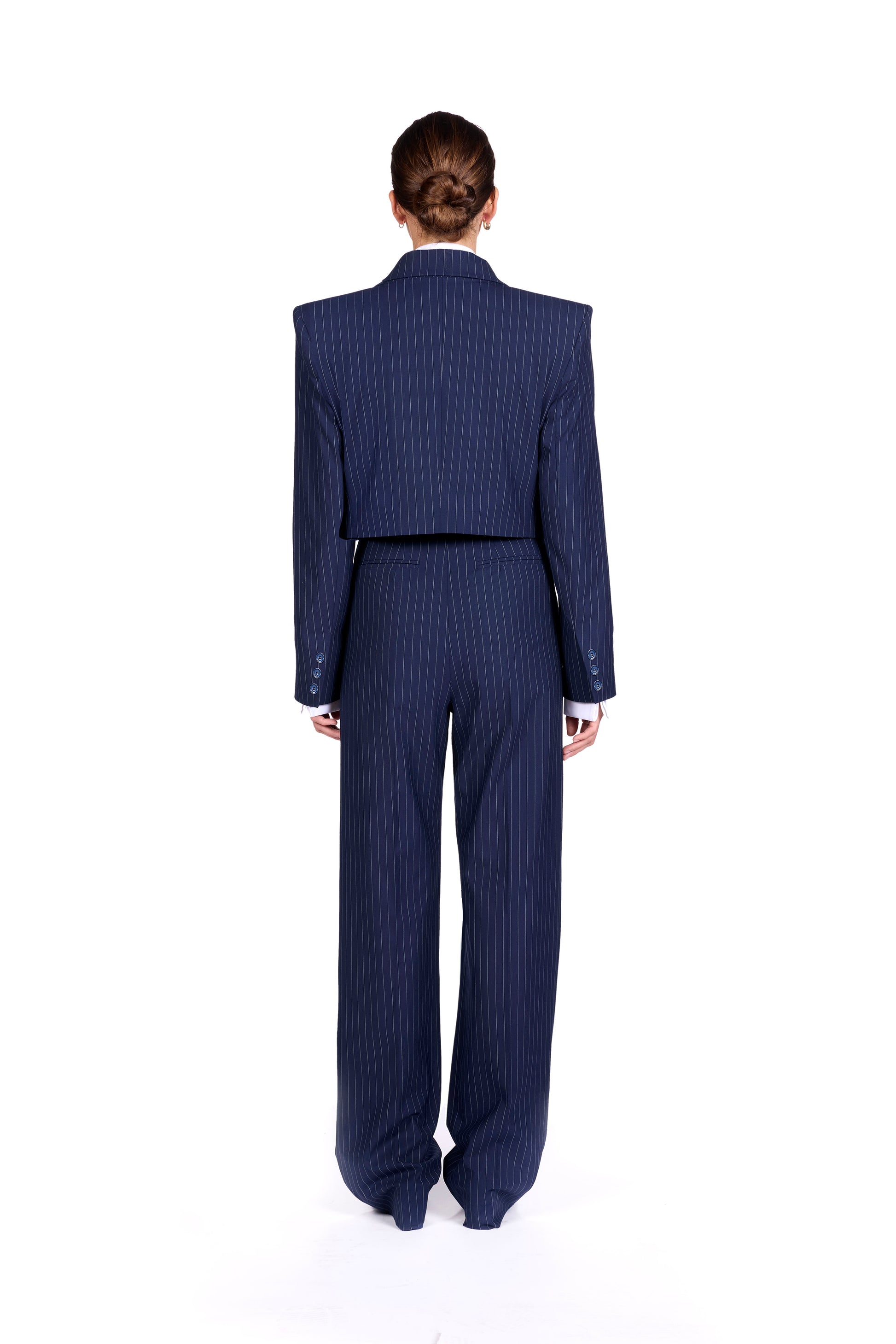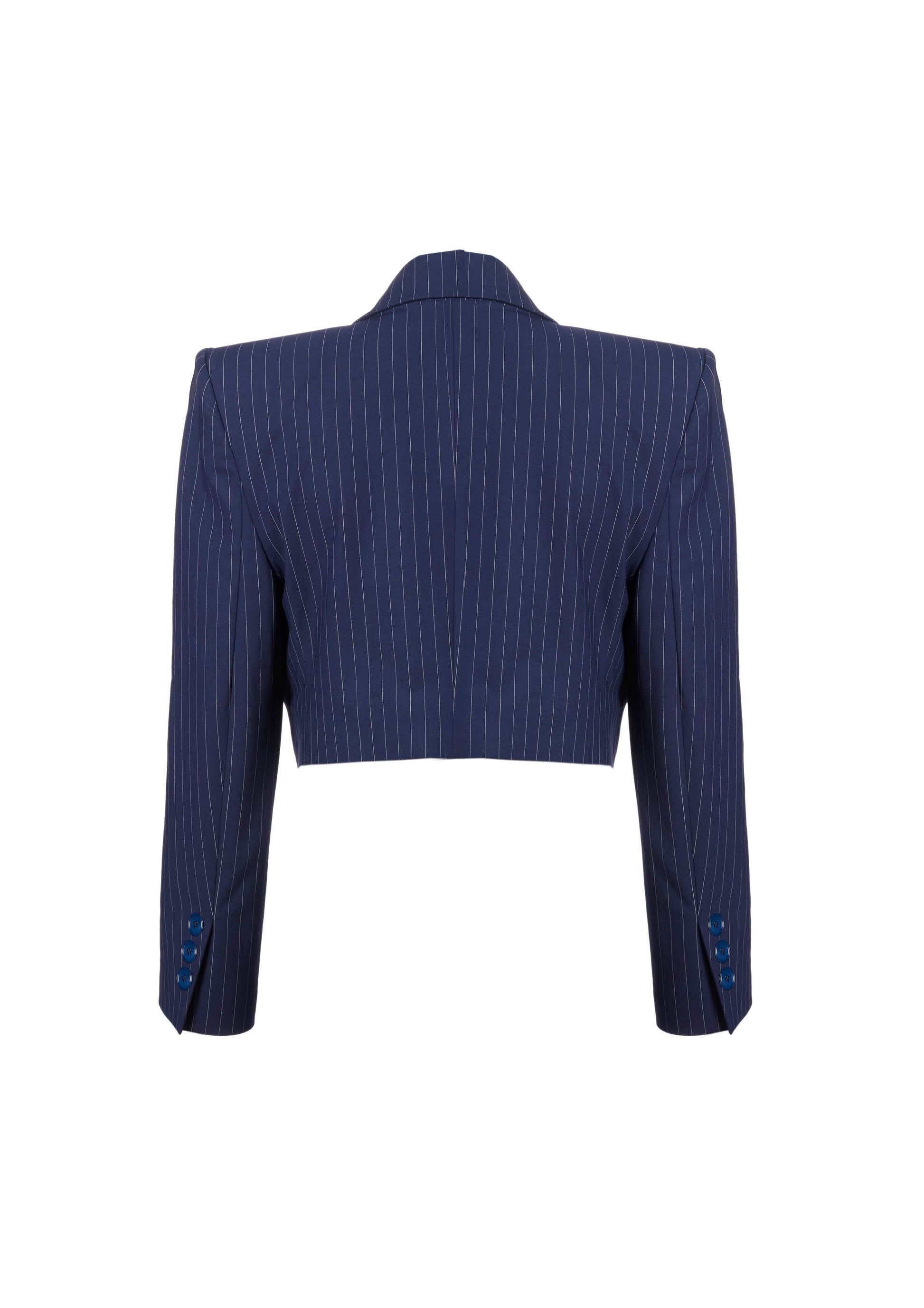 Lightweight striped wool cropped jacket with peak collar. Tailored with lightweight front panel and shoulder pads.
