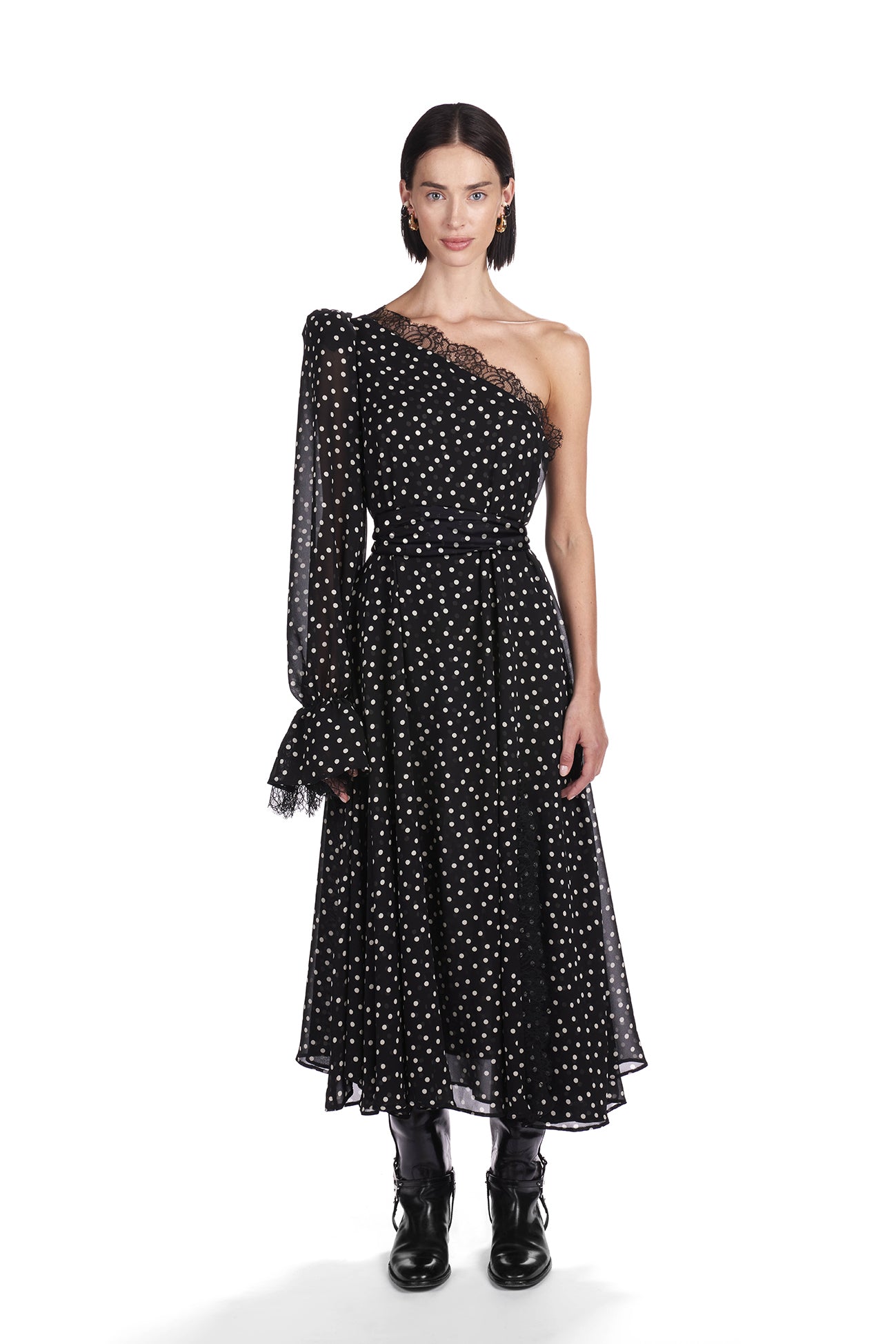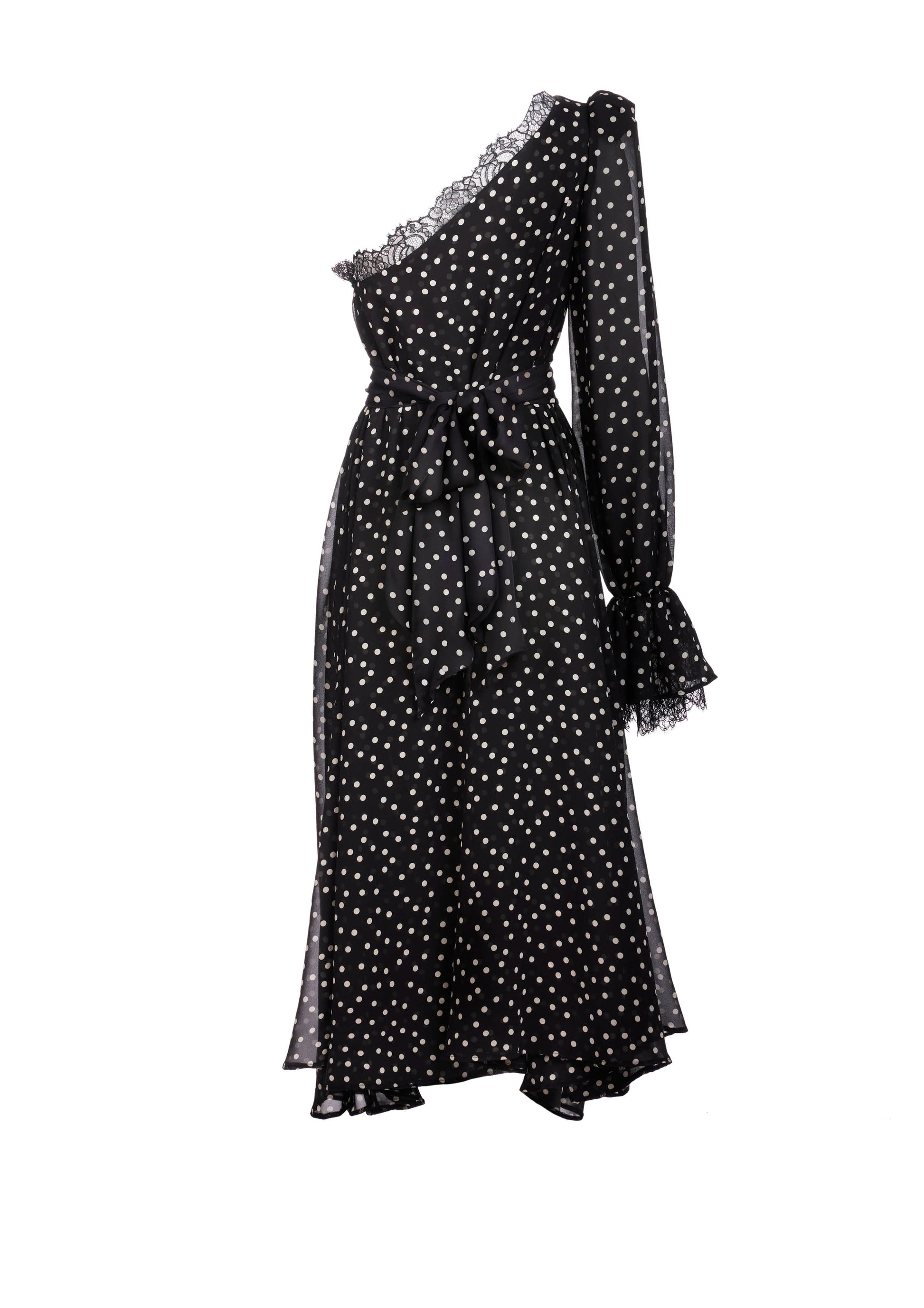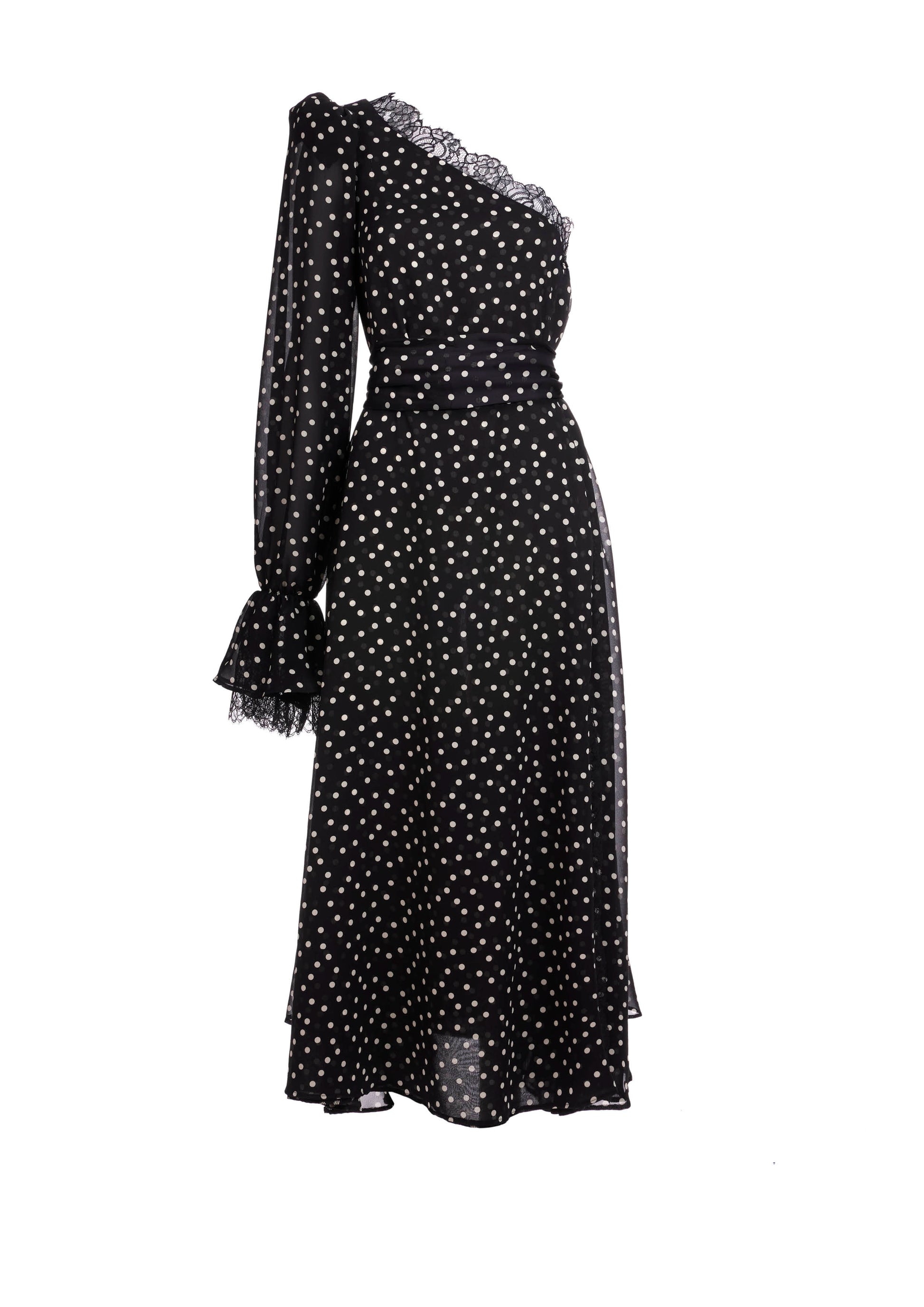 Silk midi dress with asymmetric puffed shoulder and lace details. Detachable silk belt.