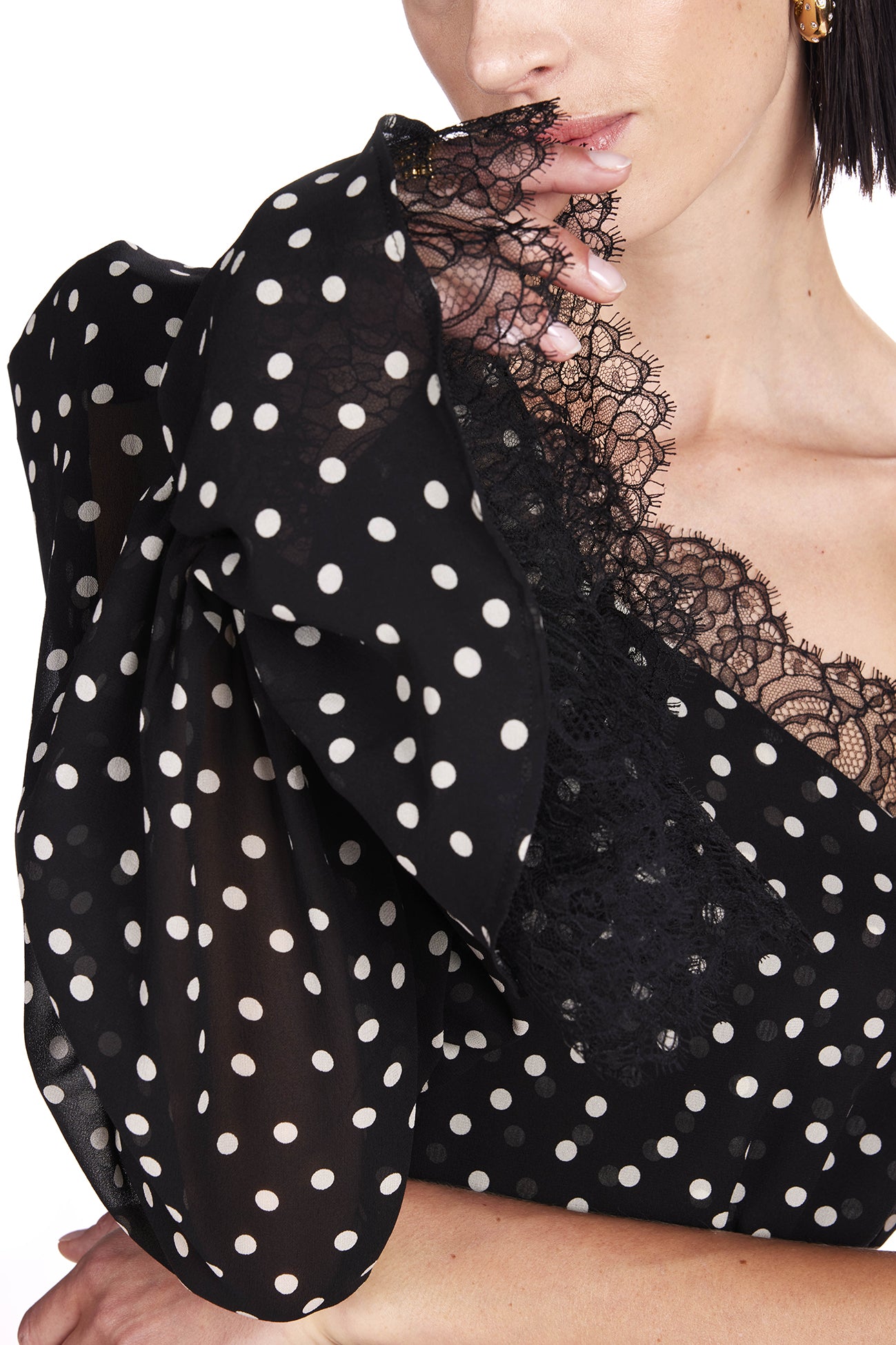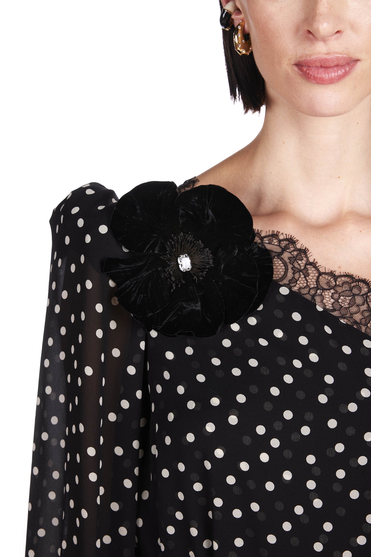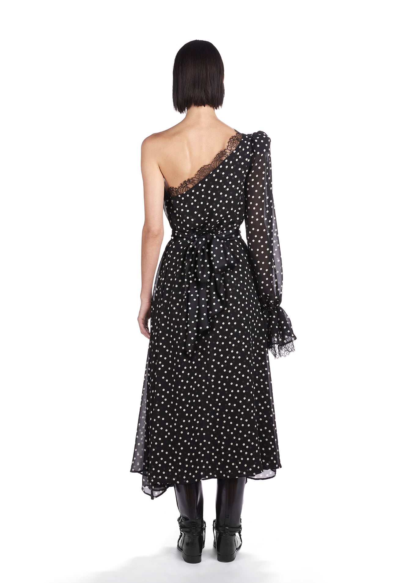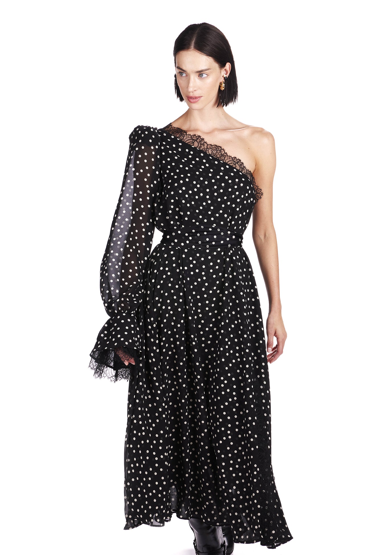 Silk midi dress with asymmetric puffed shoulder and lace details. Detachable silk belt.