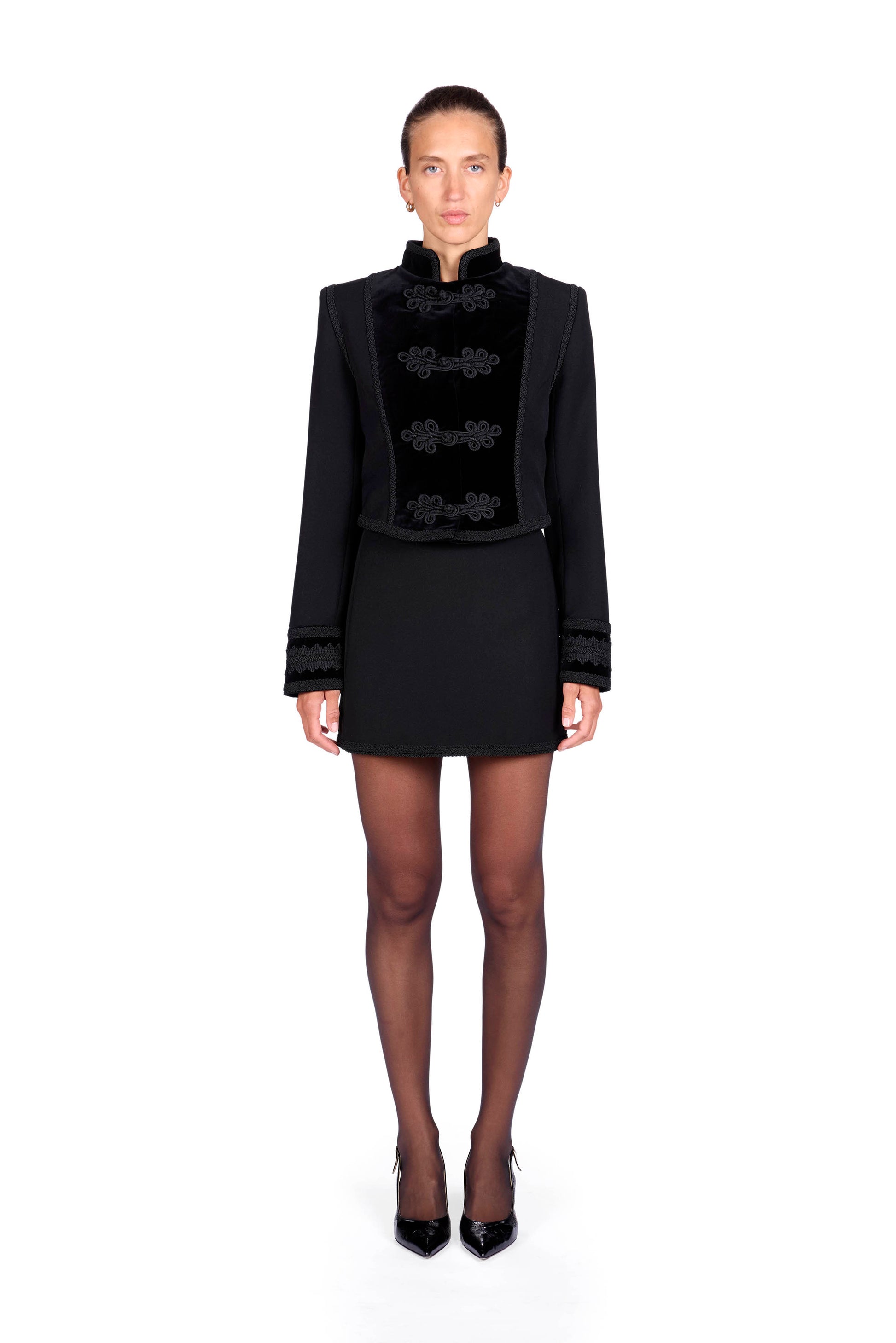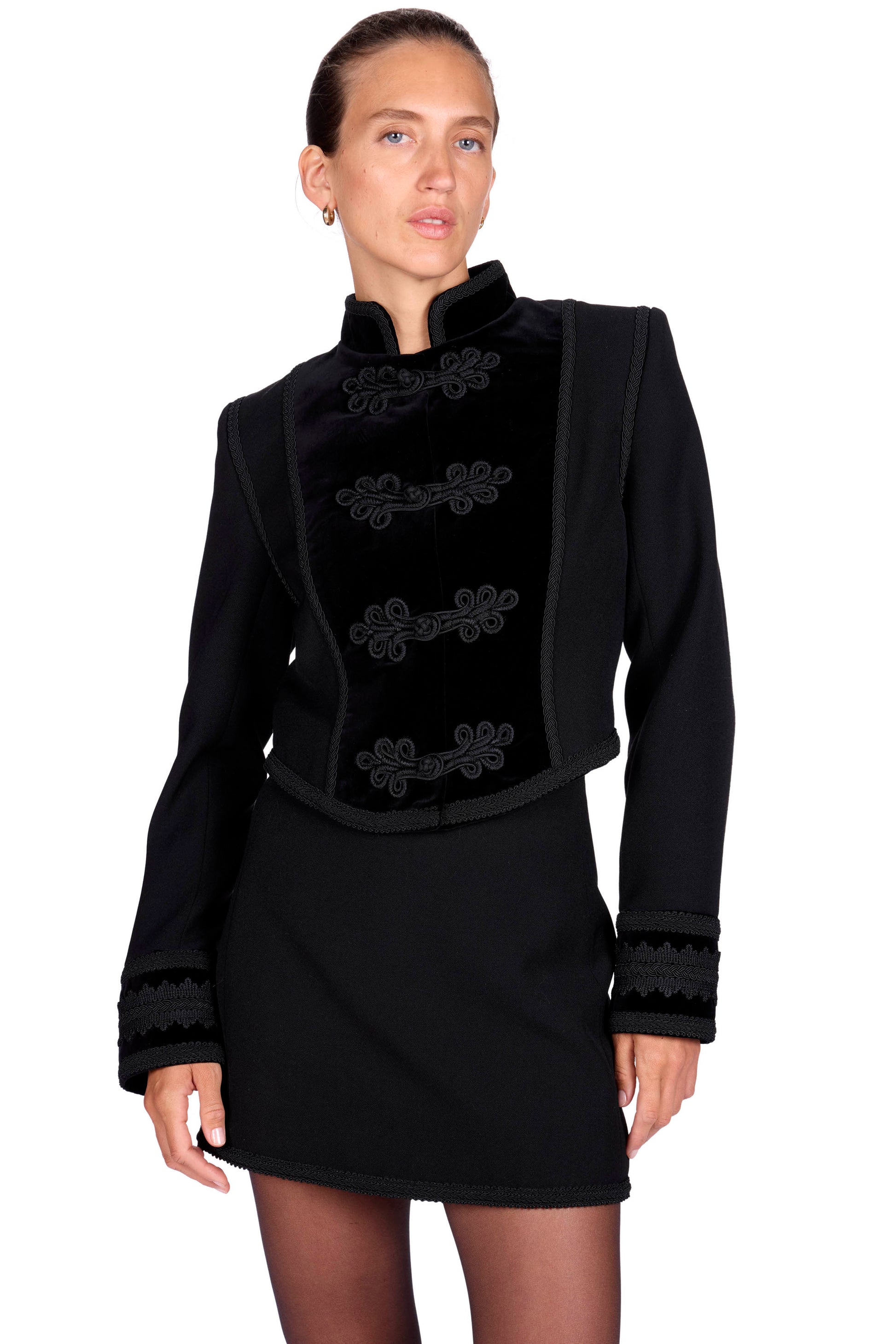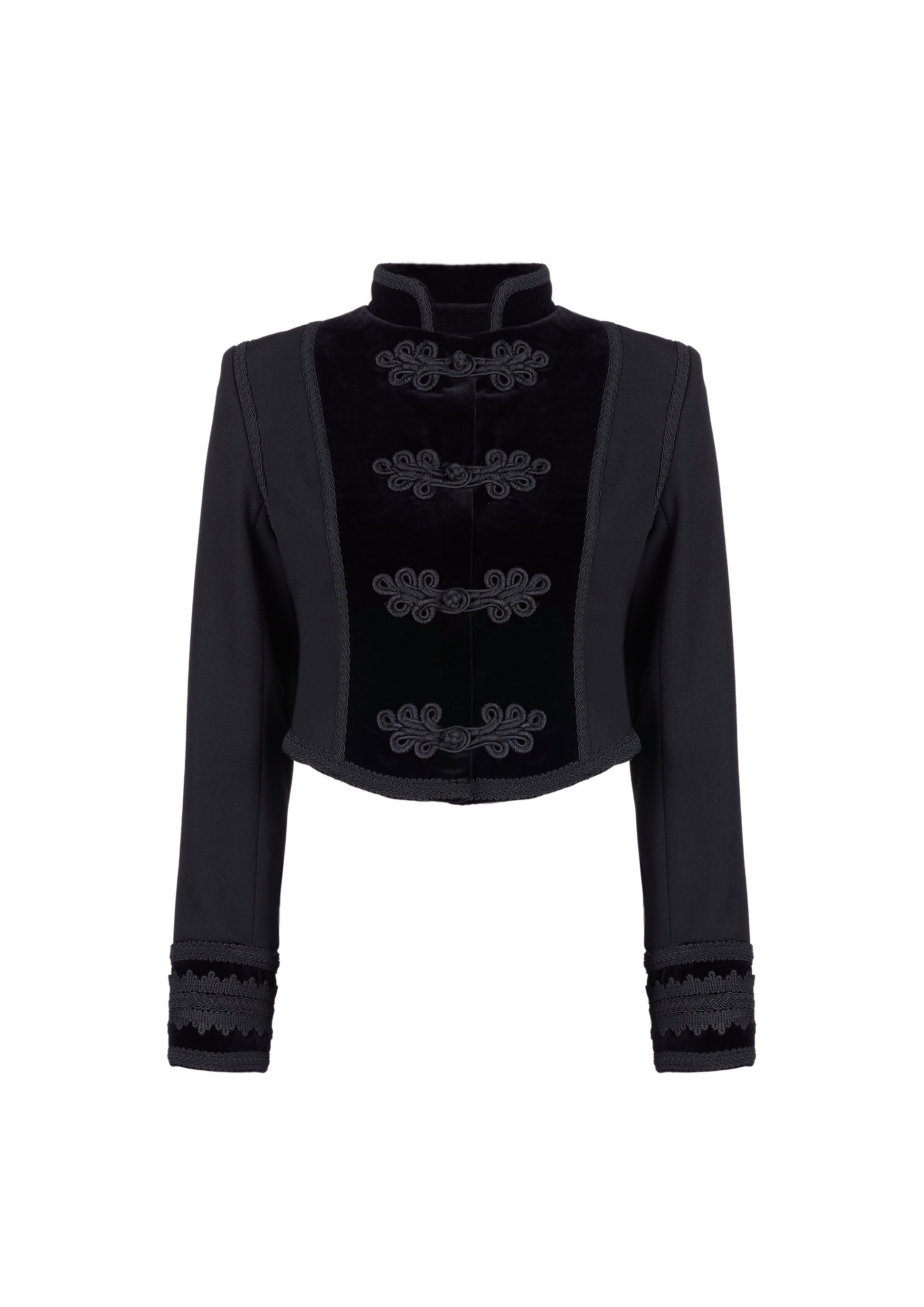 Embellished cropped wool Jacket with standup collar and velvet details.