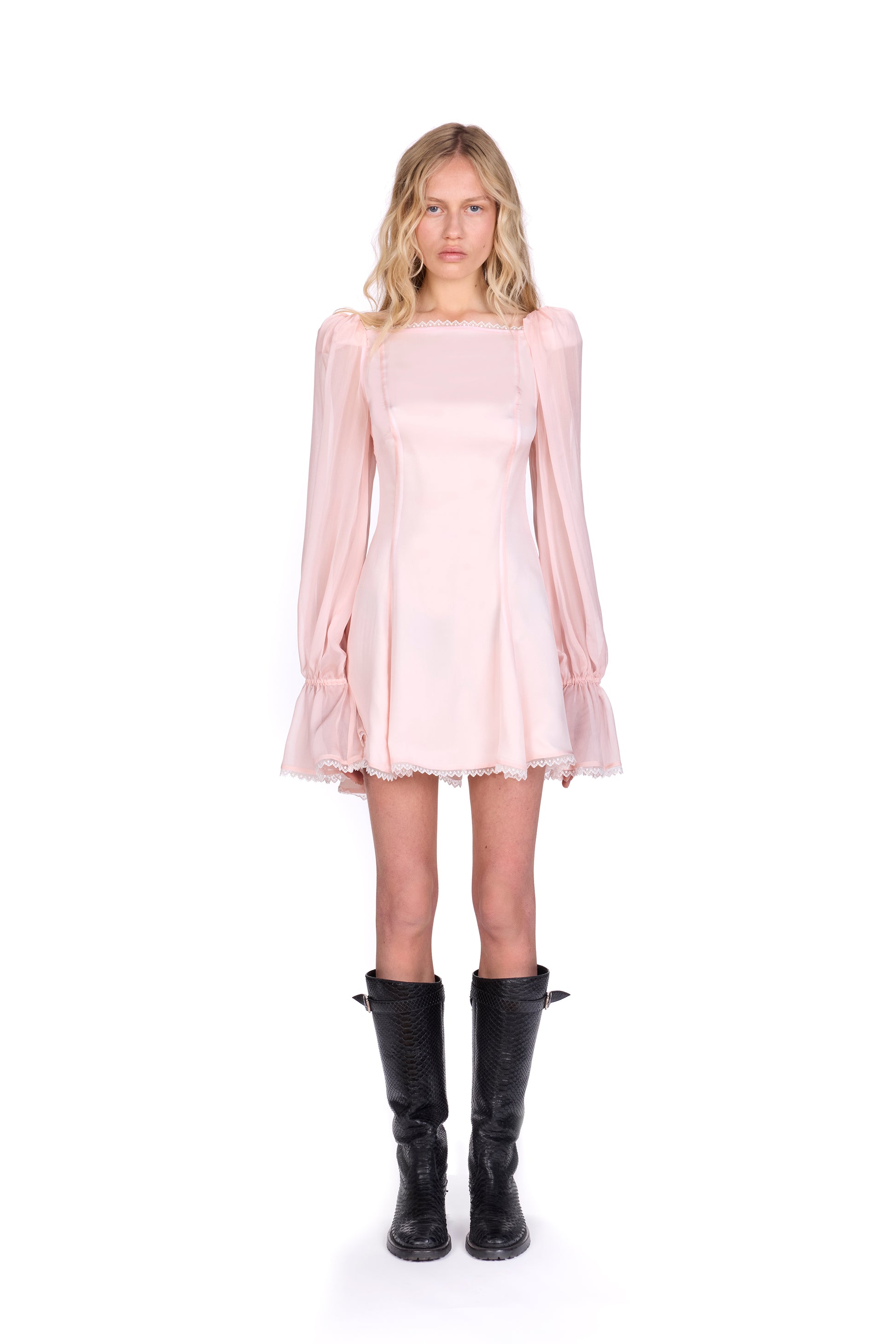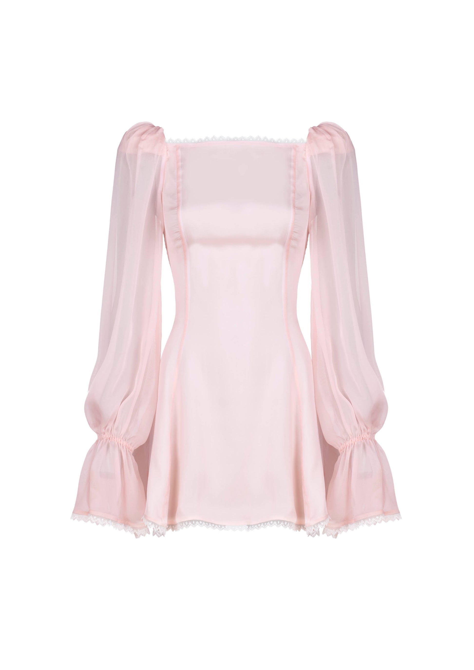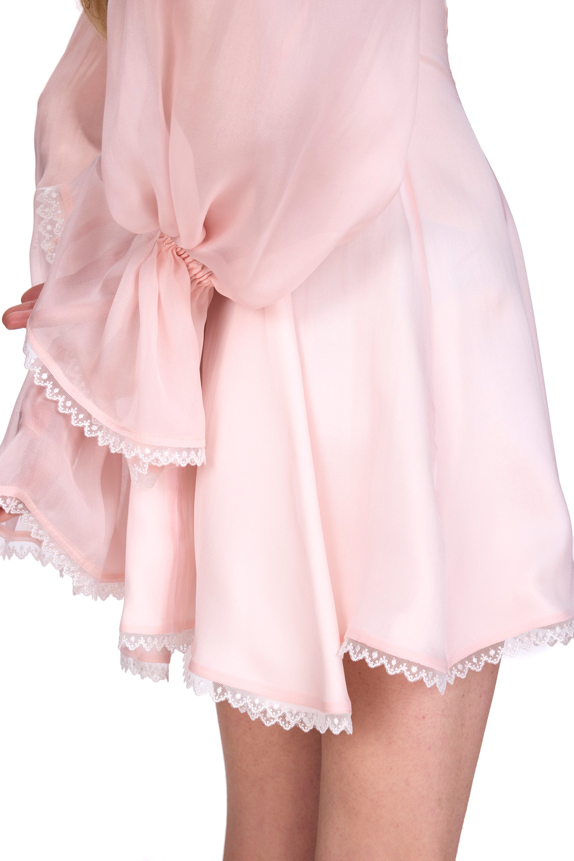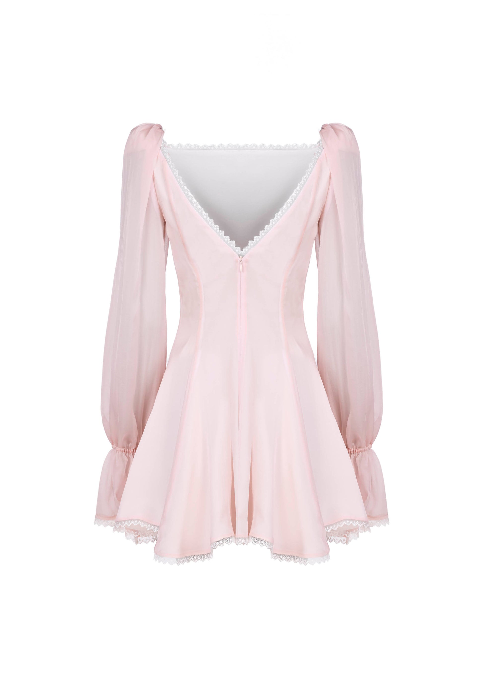 Silk chiffon mini dress with puffed shoulders, open back and Japanese lace trimmings. Center back invisible zip closure.