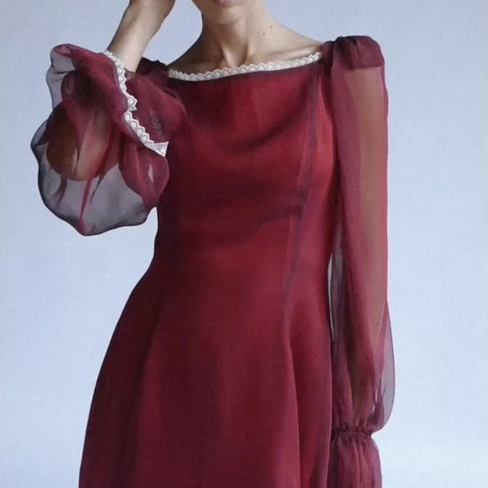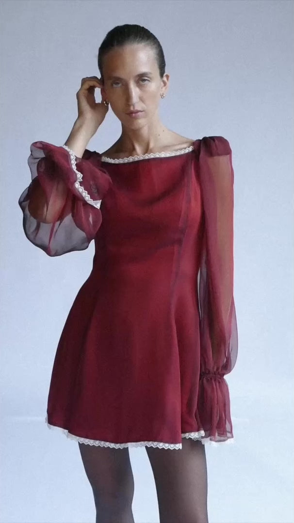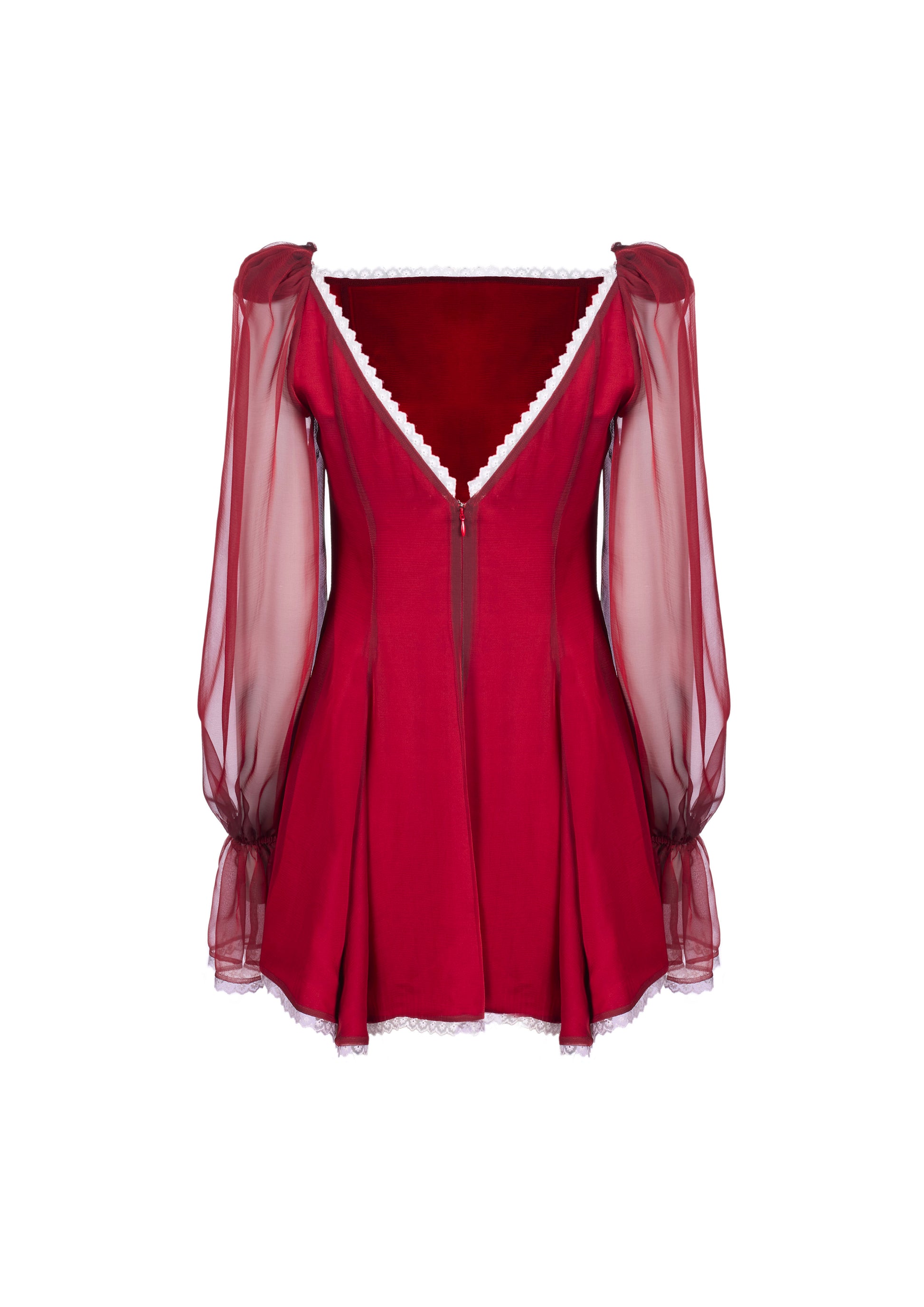 Silk chiffon mini dress with puffed shoulders, open back and Japanese lace detail. Center back invisible zip closure.