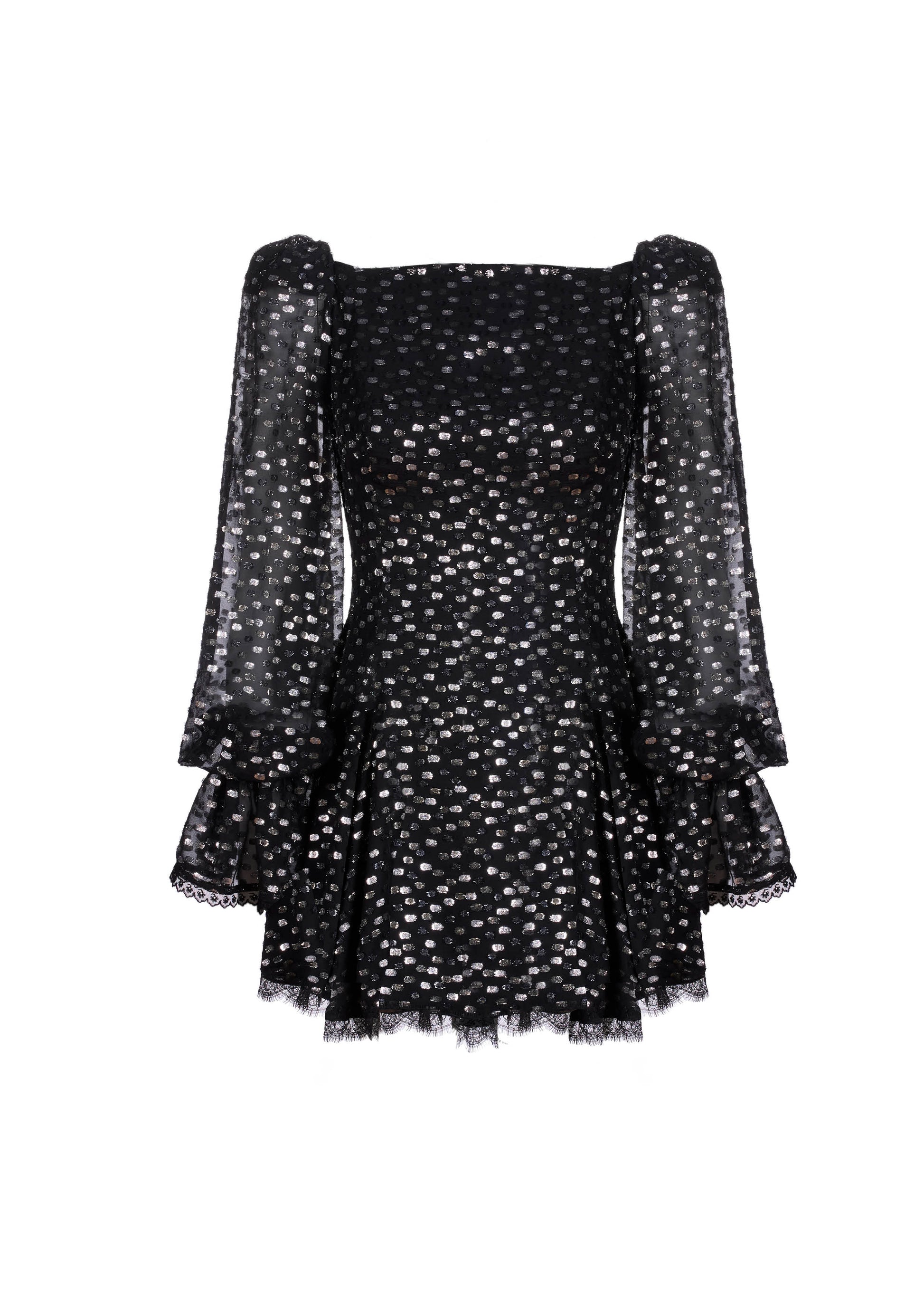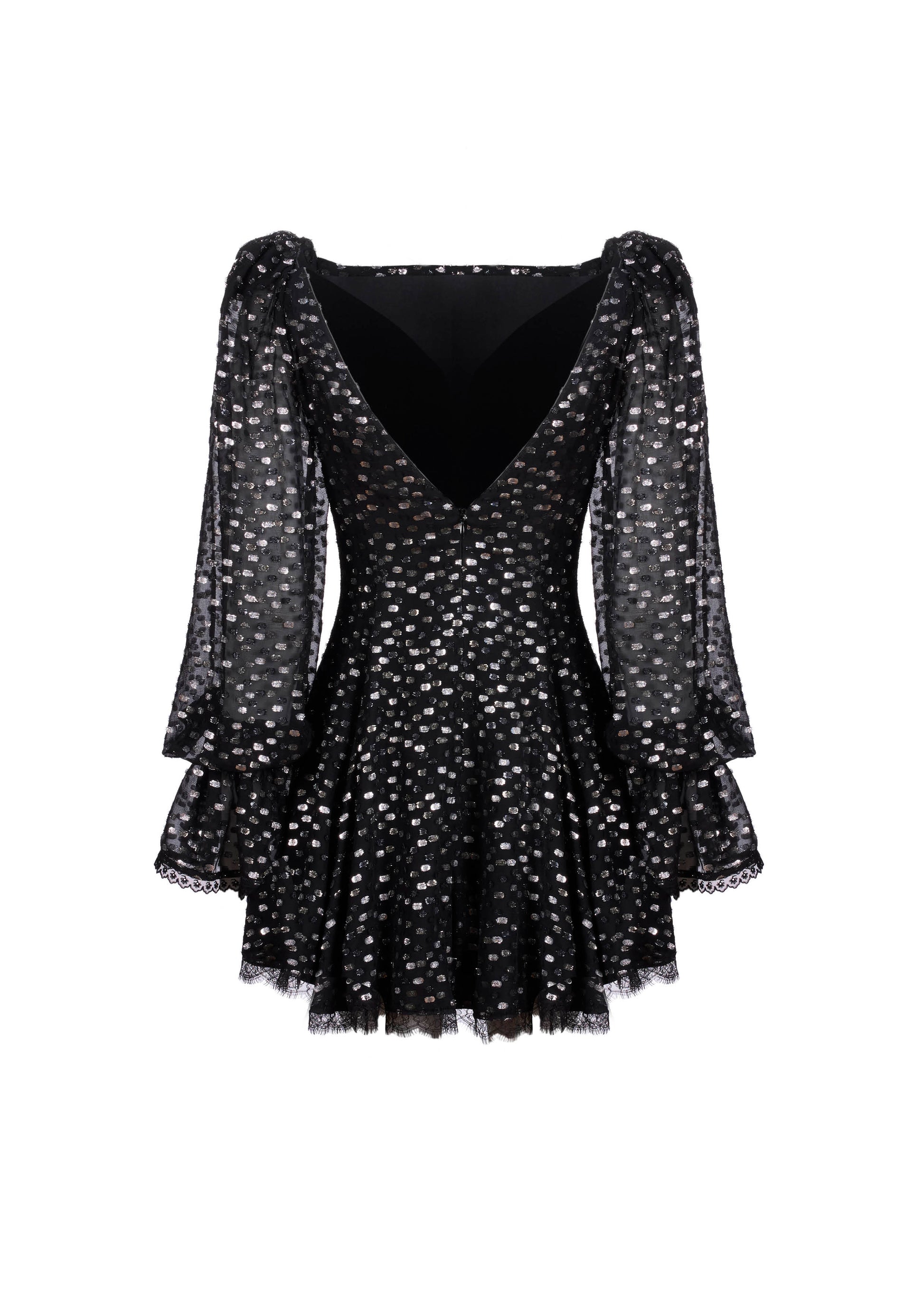Lurex chiffon mini dress with puffed shoulders, open back and Japanese lace trimmings. Center back invisible zip closure.