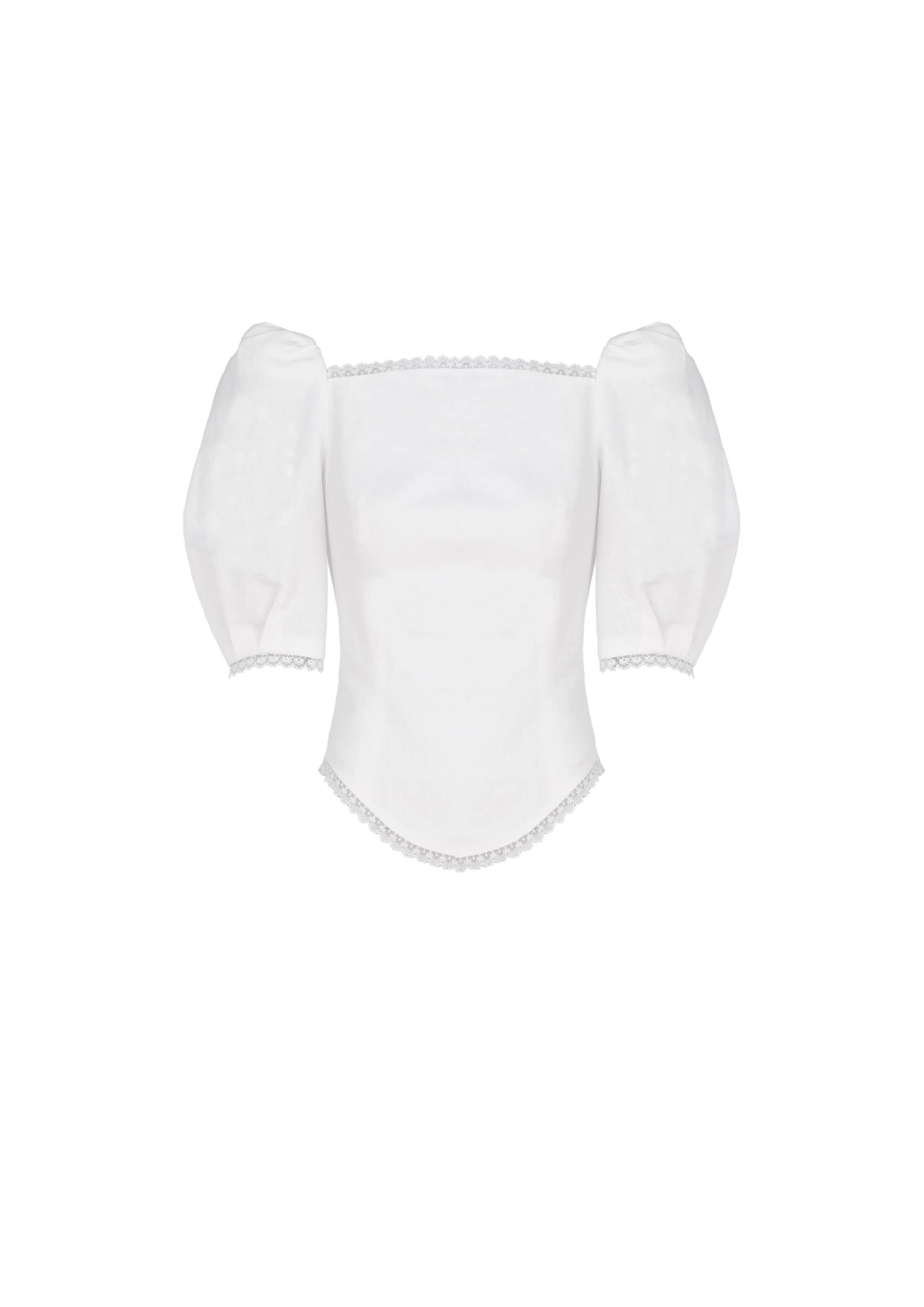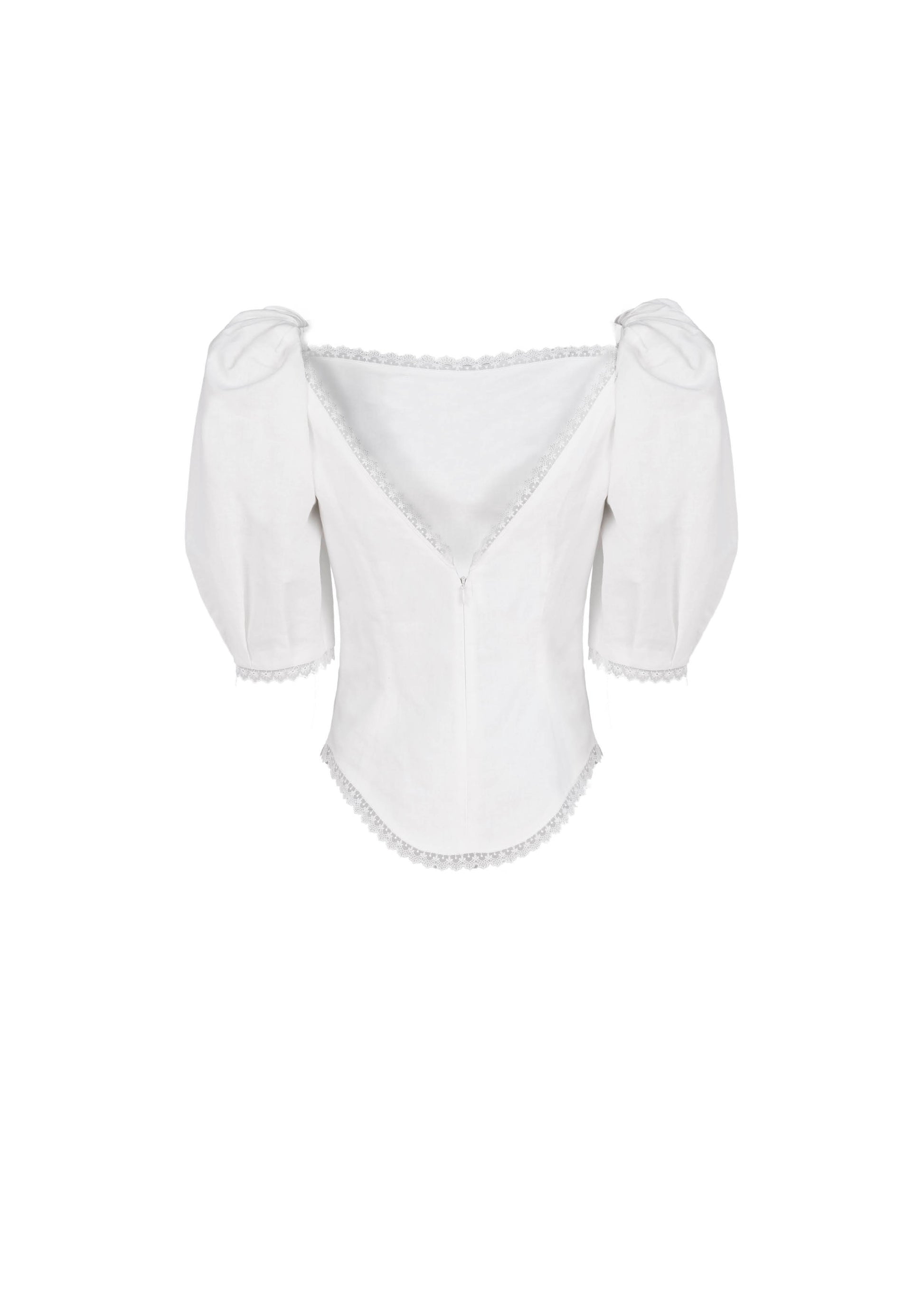 Linen top with puffed shoulders, open back and Japanese lace trim. Center back invisible zip closure.