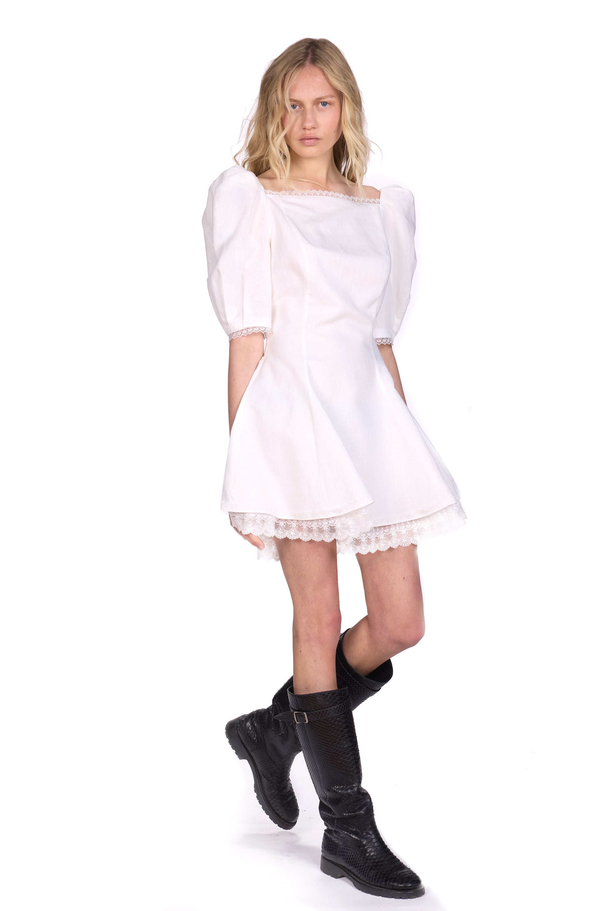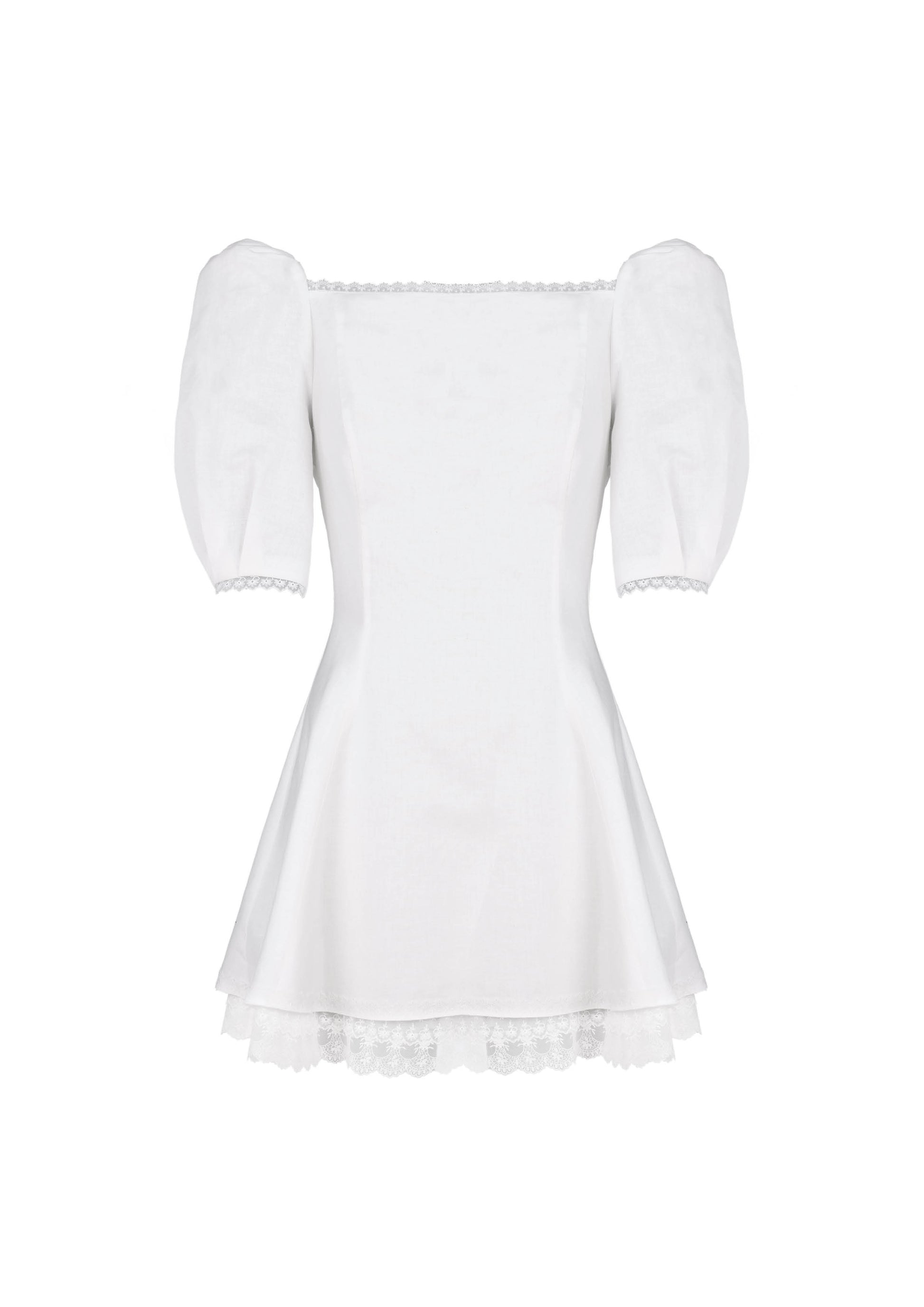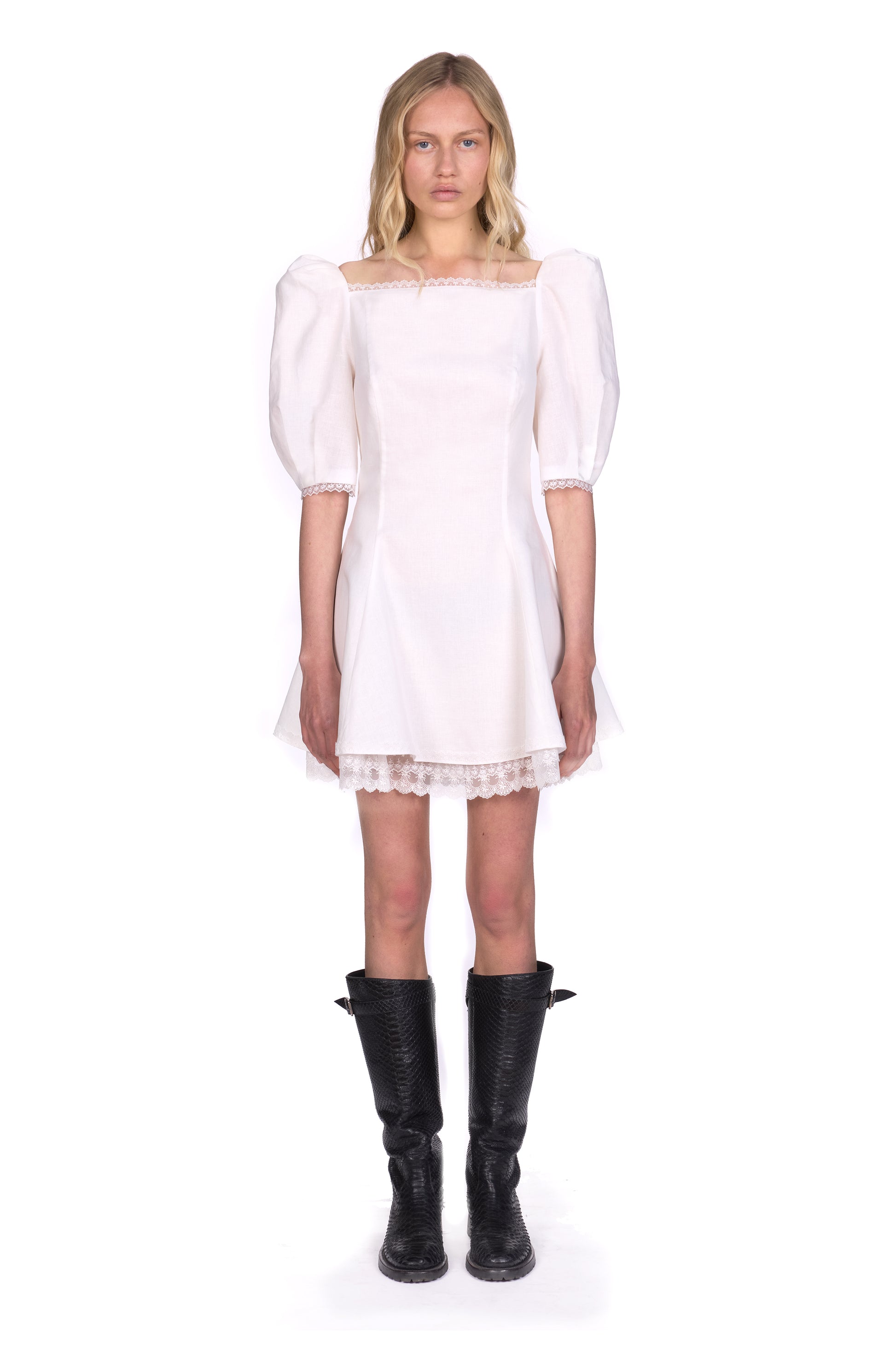 Linen mini dress with puffed shoulders, open back and Japanese lace trim. Center back invisible zip closure.
