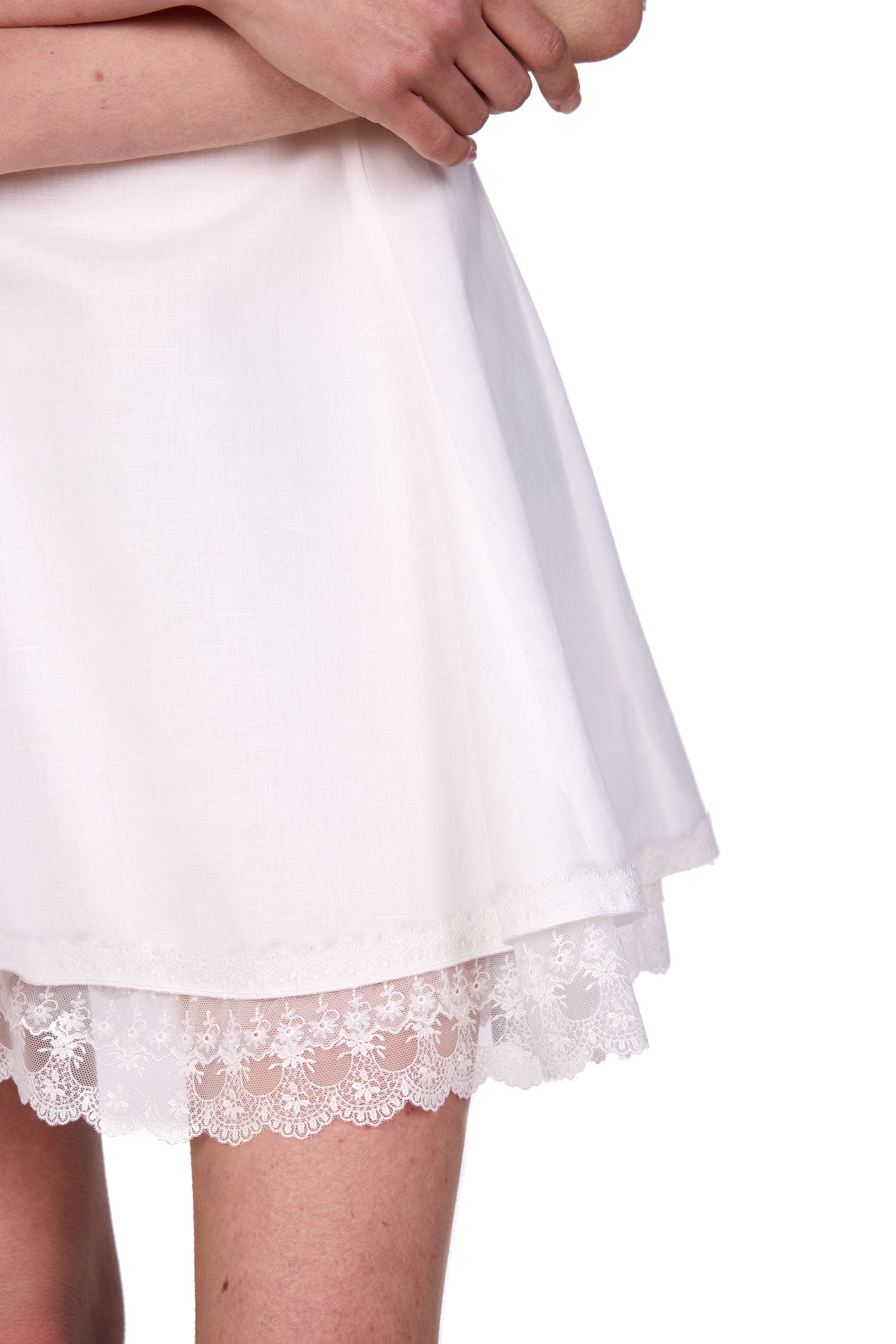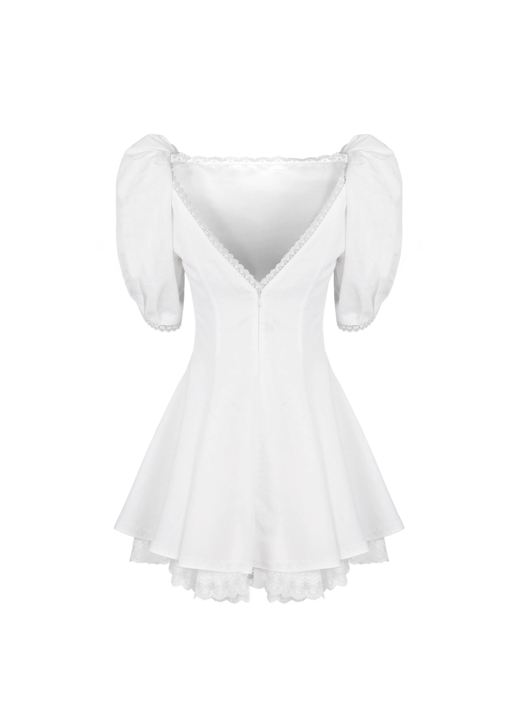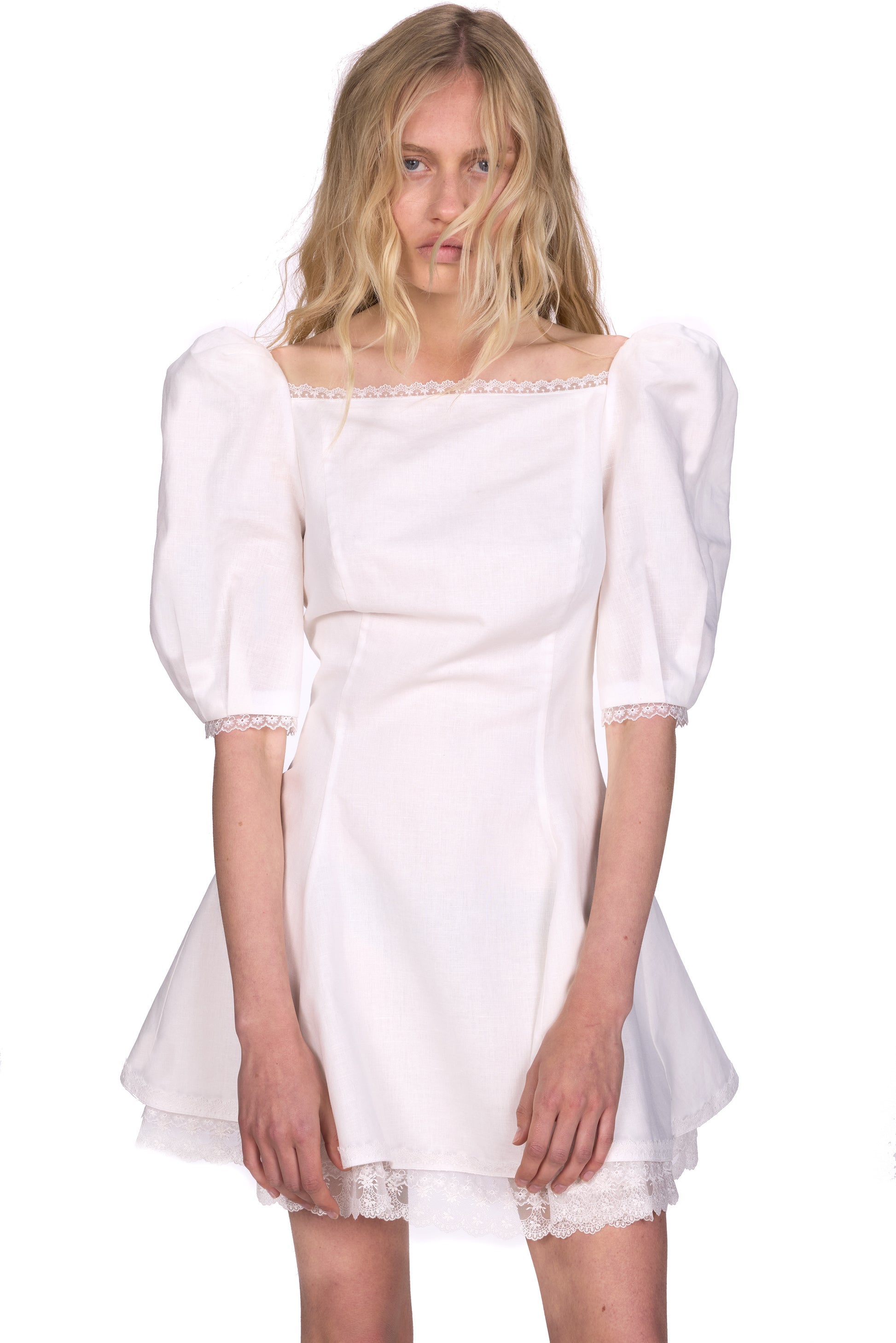 Linen mini dress with puffed shoulders, open back and Japanese lace trim. Center back invisible zip closure.
