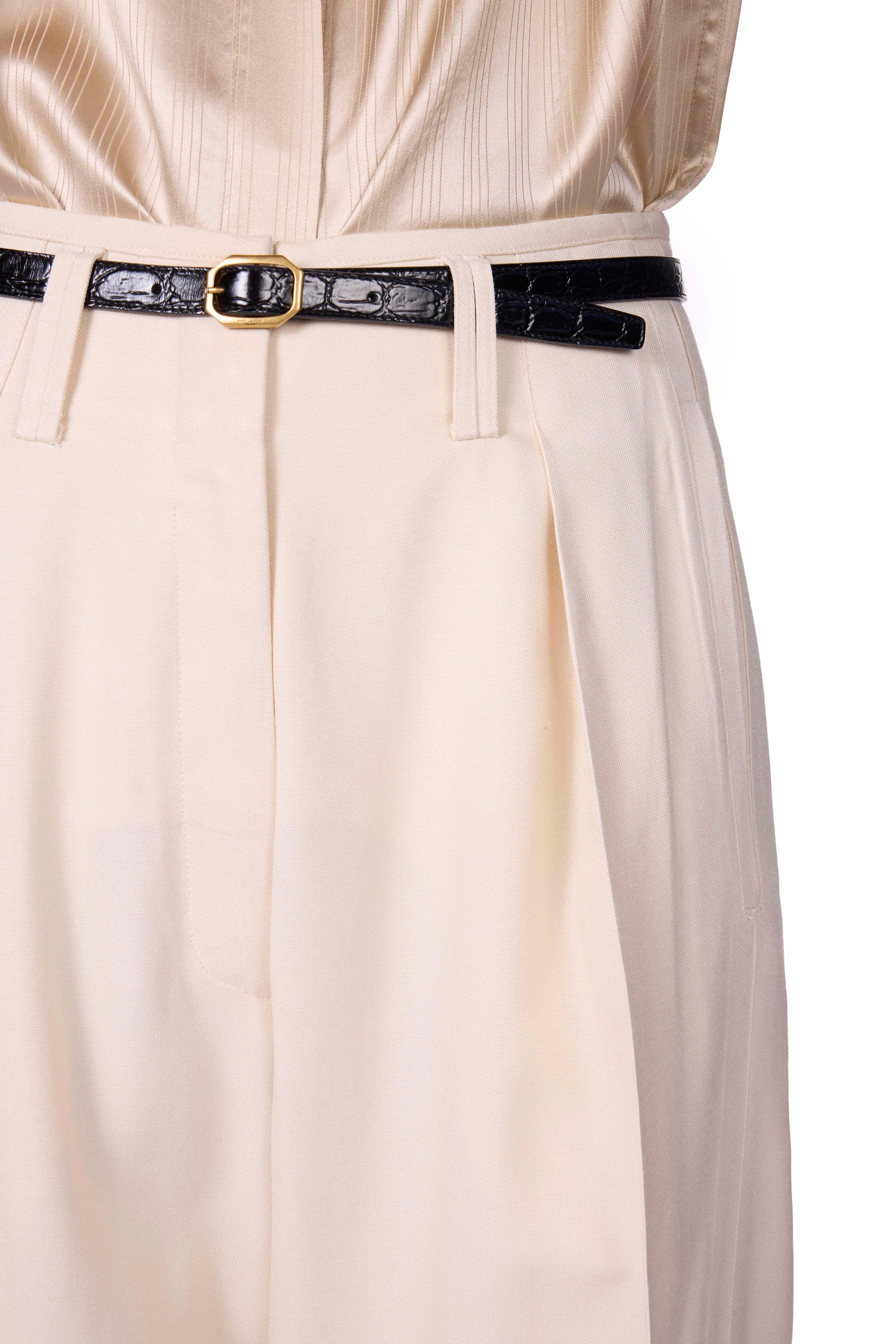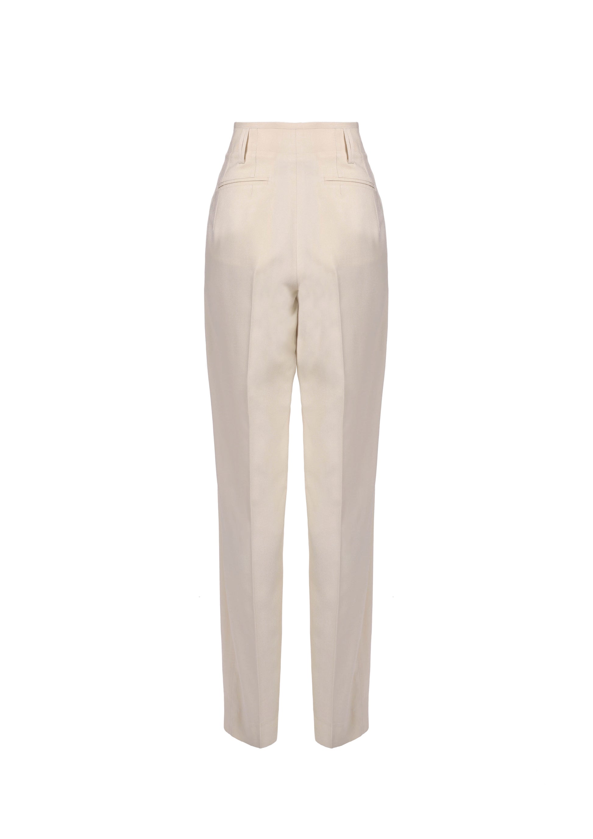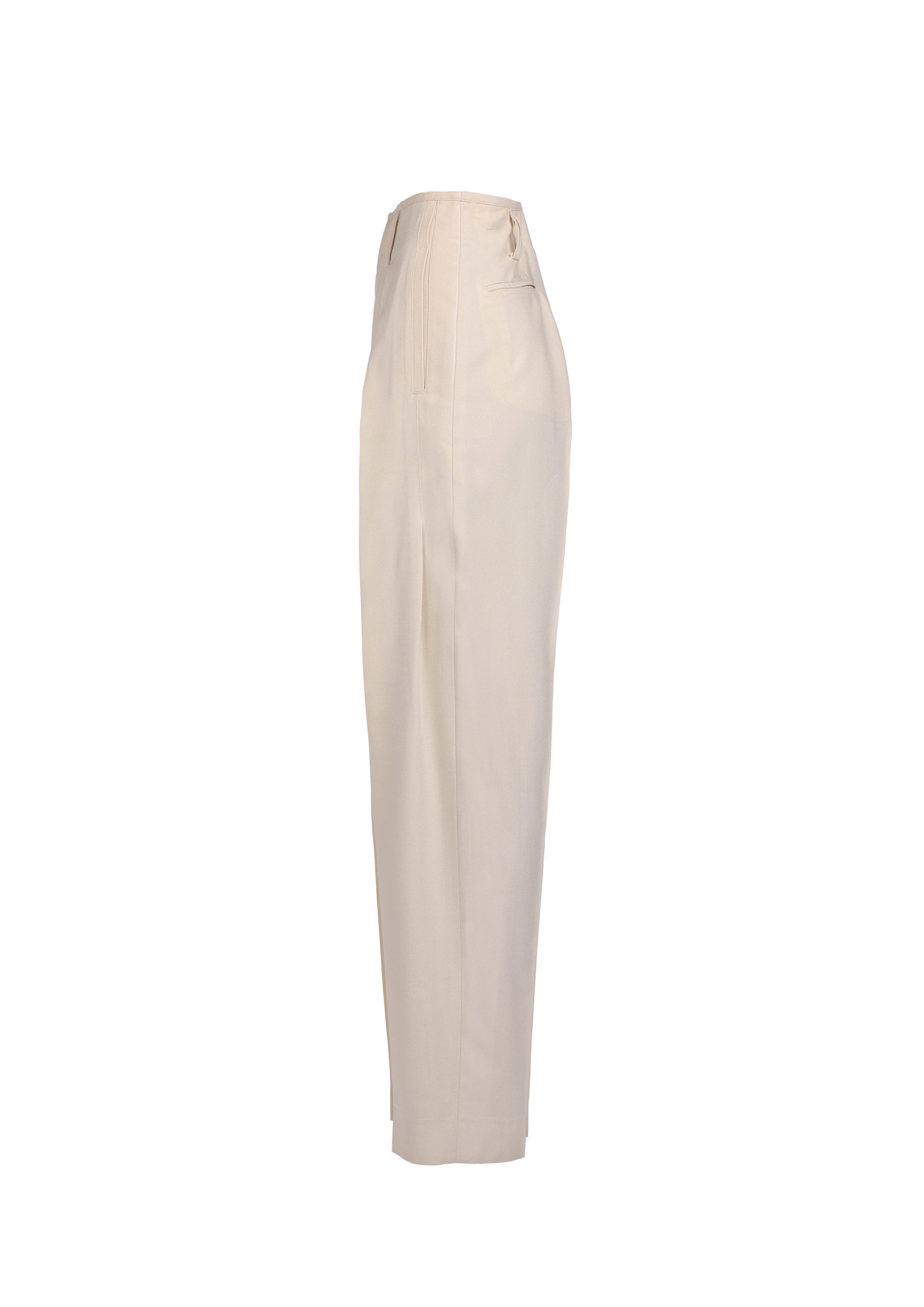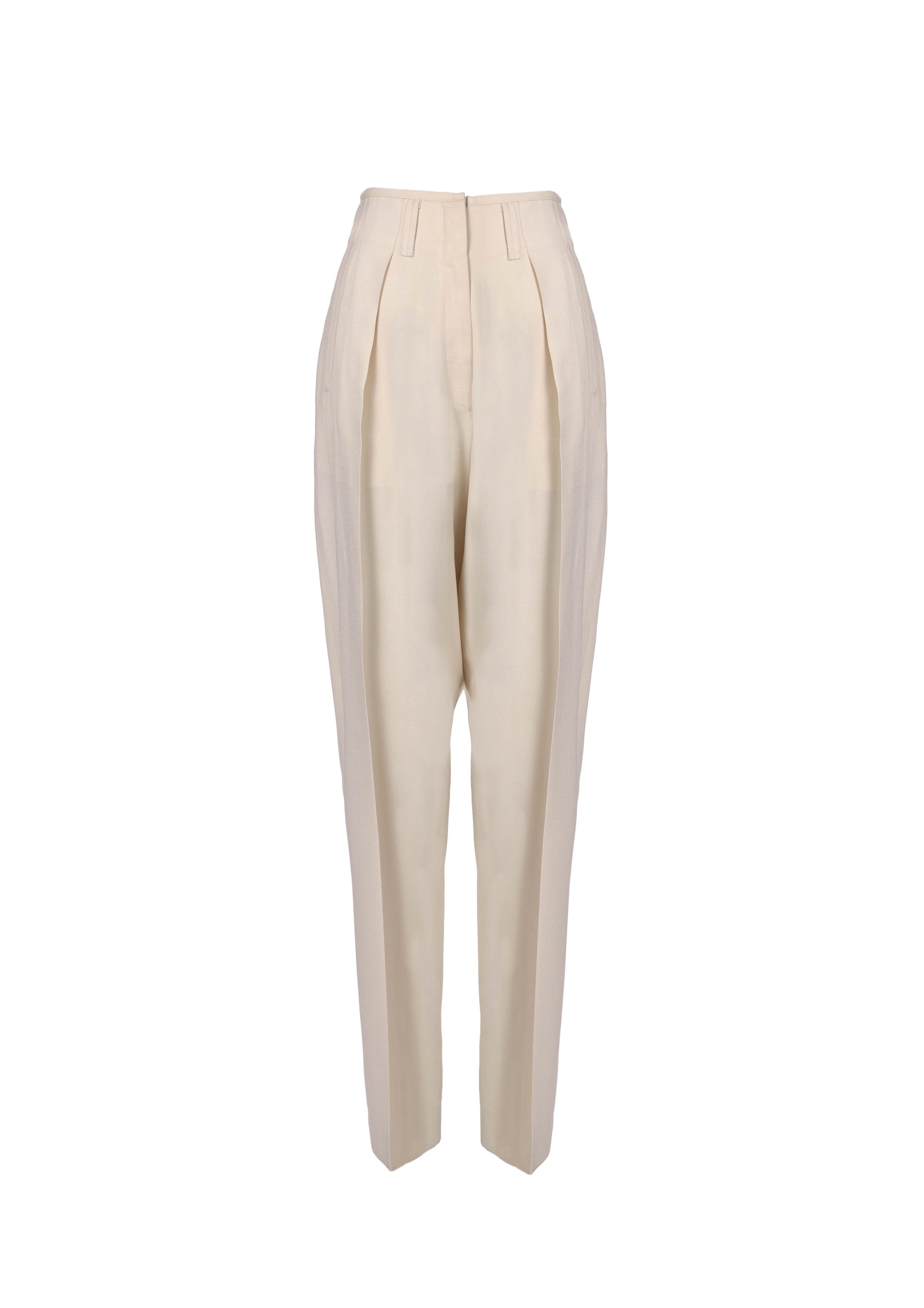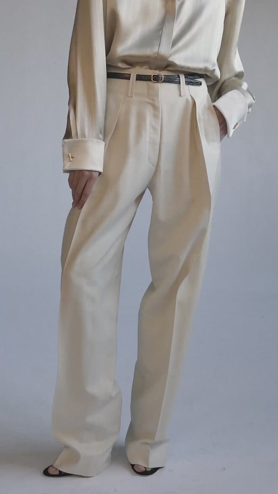 Tailored high-rise pants with pleated wide leg, tapered to the ankle and cut in a light silk papyrus. Concealed hooks and zip fastening at front.