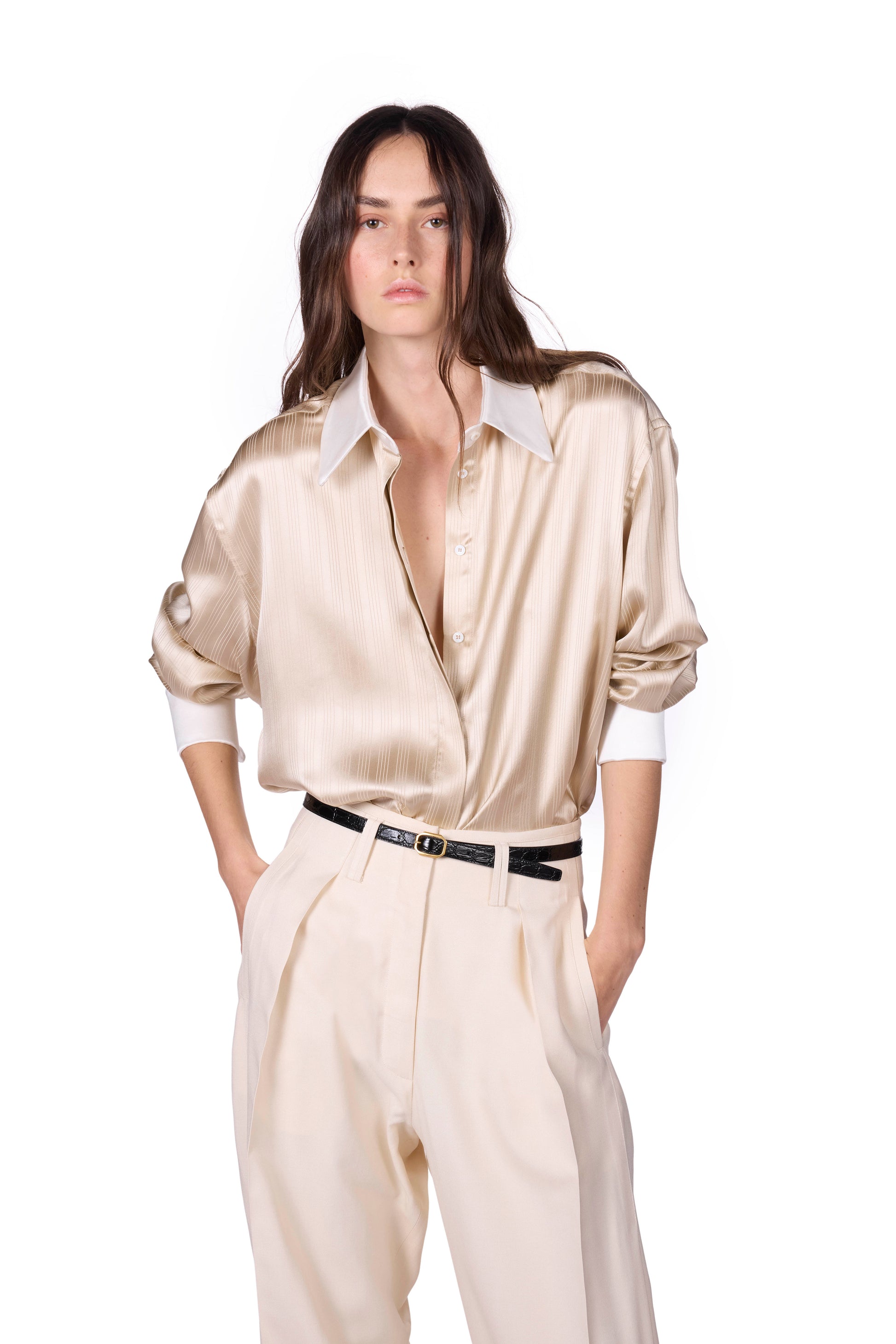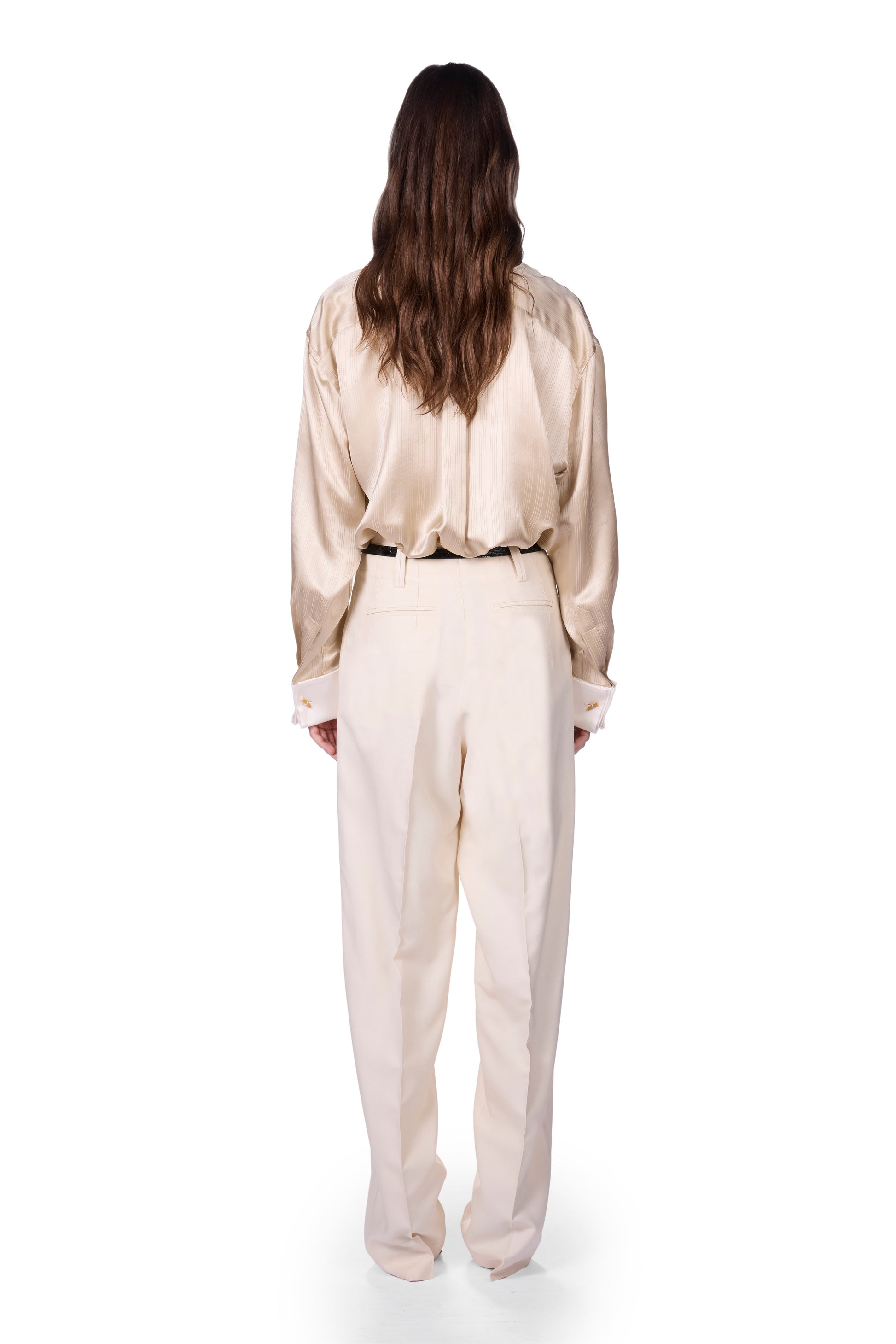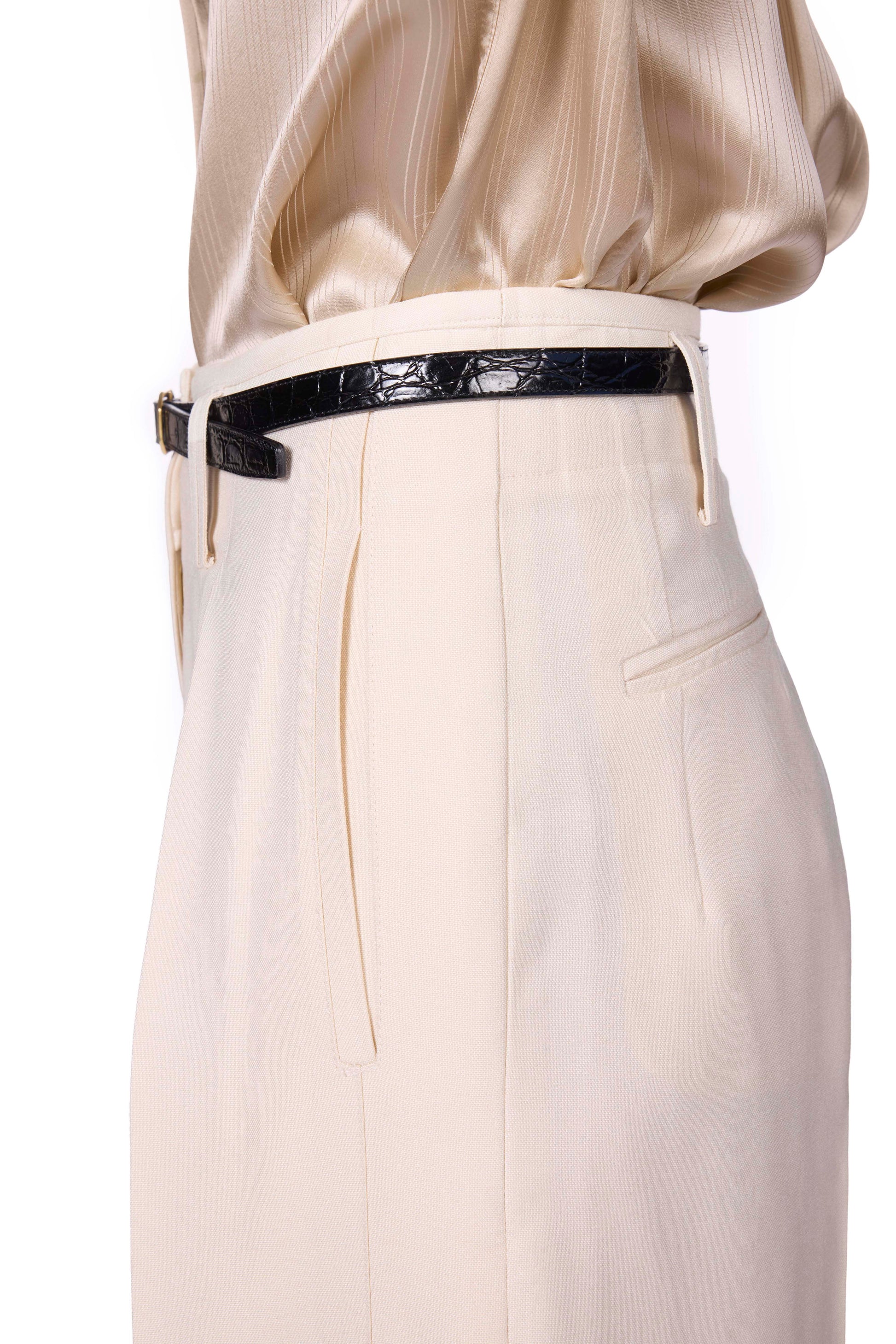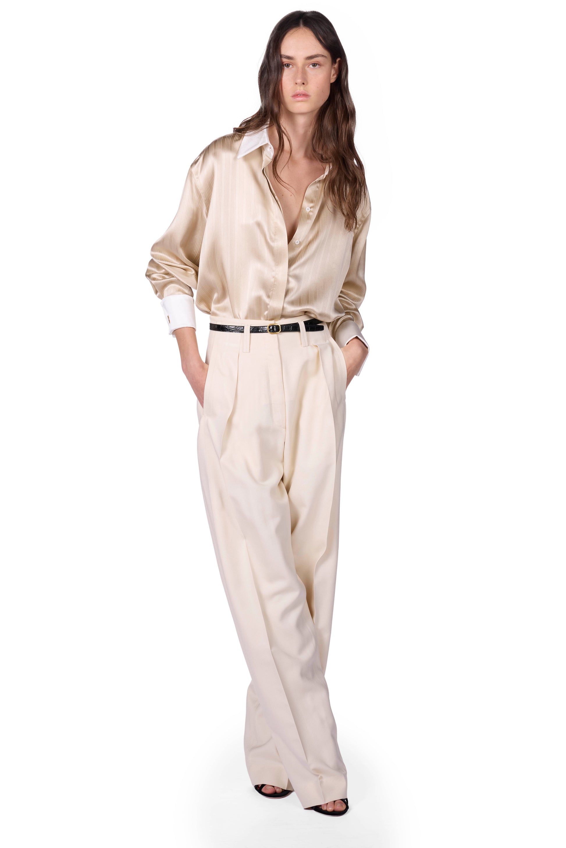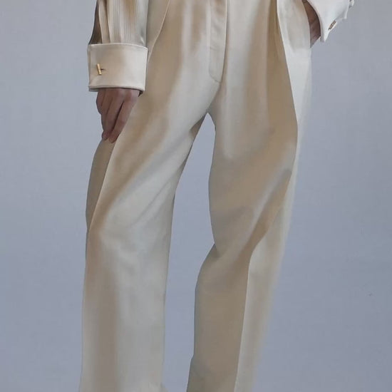 Tailored high-rise pants with pleated wide leg, tapered to the ankle and cut in a light silk papyrus. Concealed hooks and zip fastening at front.