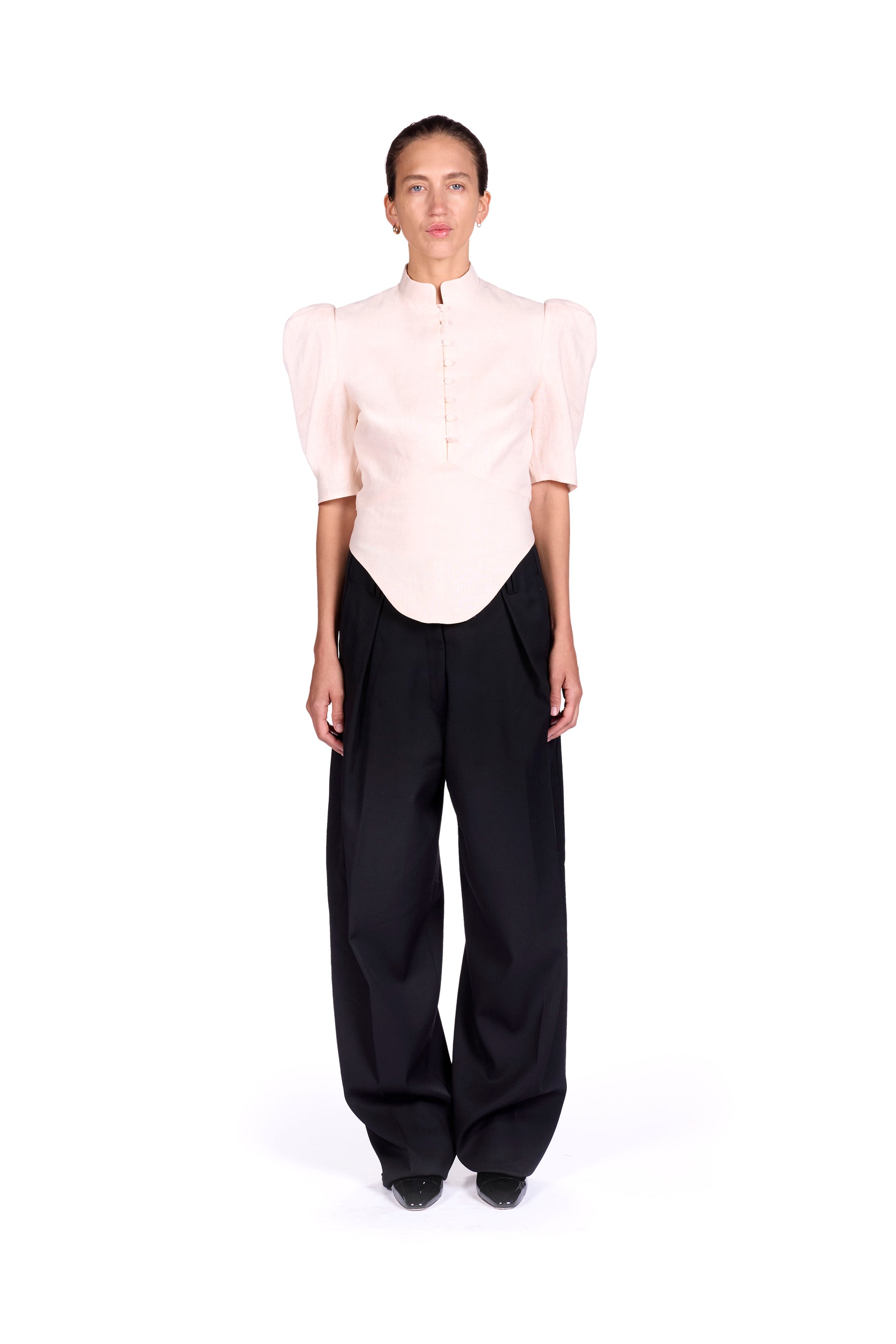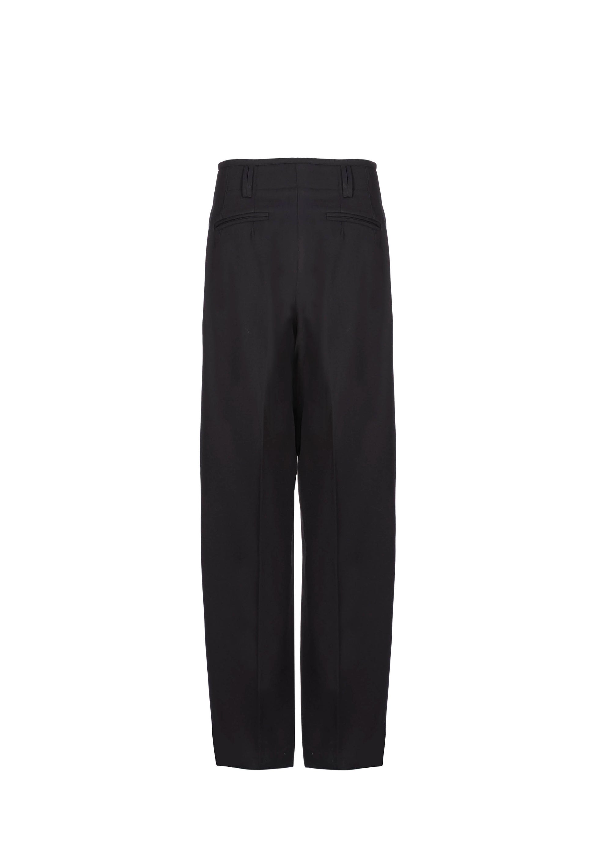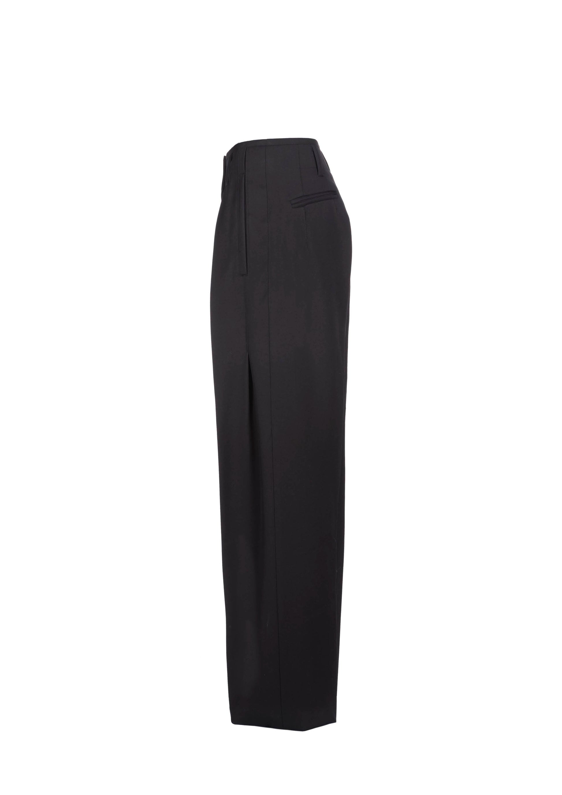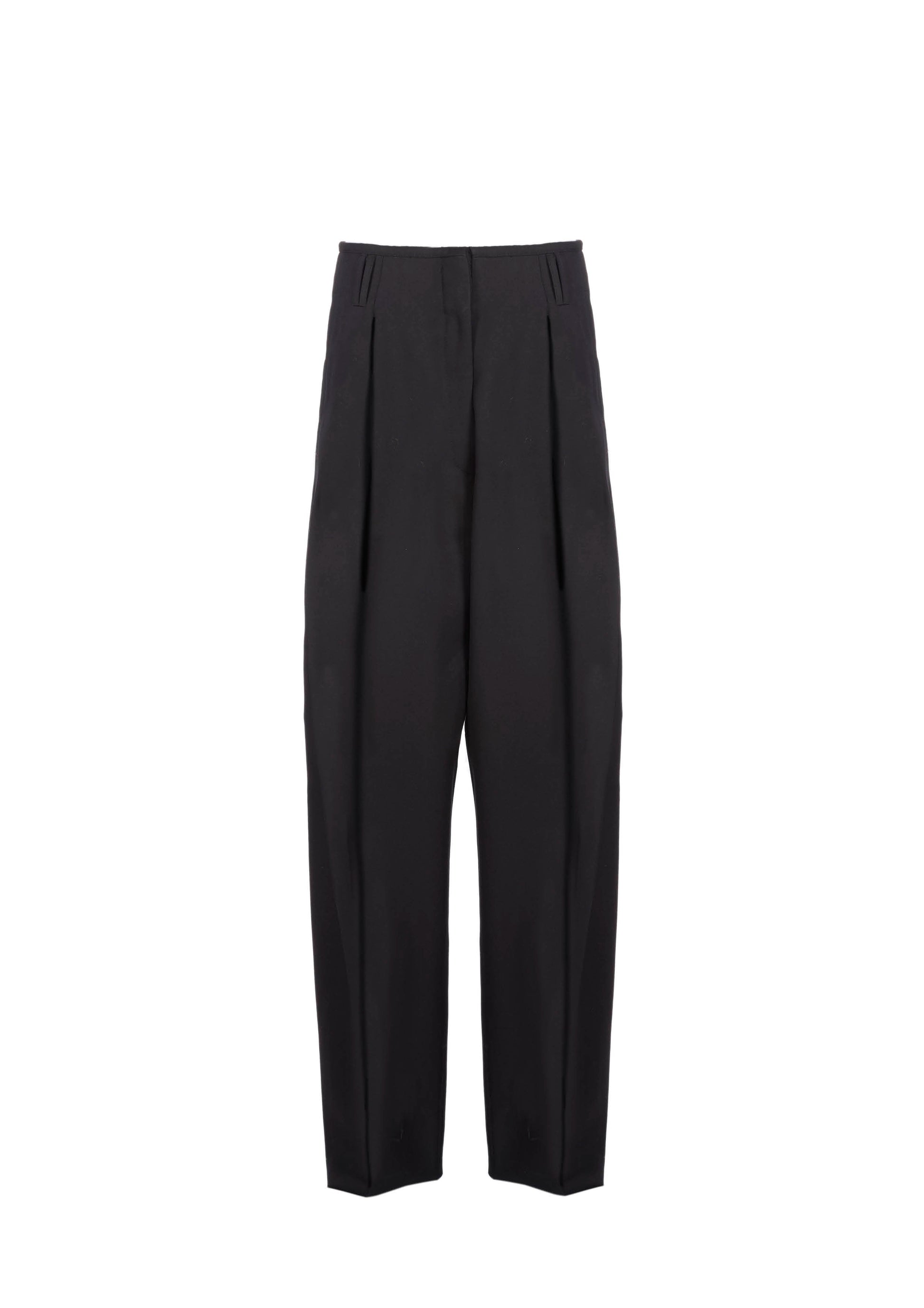 Tailored low-rise pants with pleated wide leg, tapered to the ankle and cut in virgin wool. Concealed hooks and zip fastening at front.