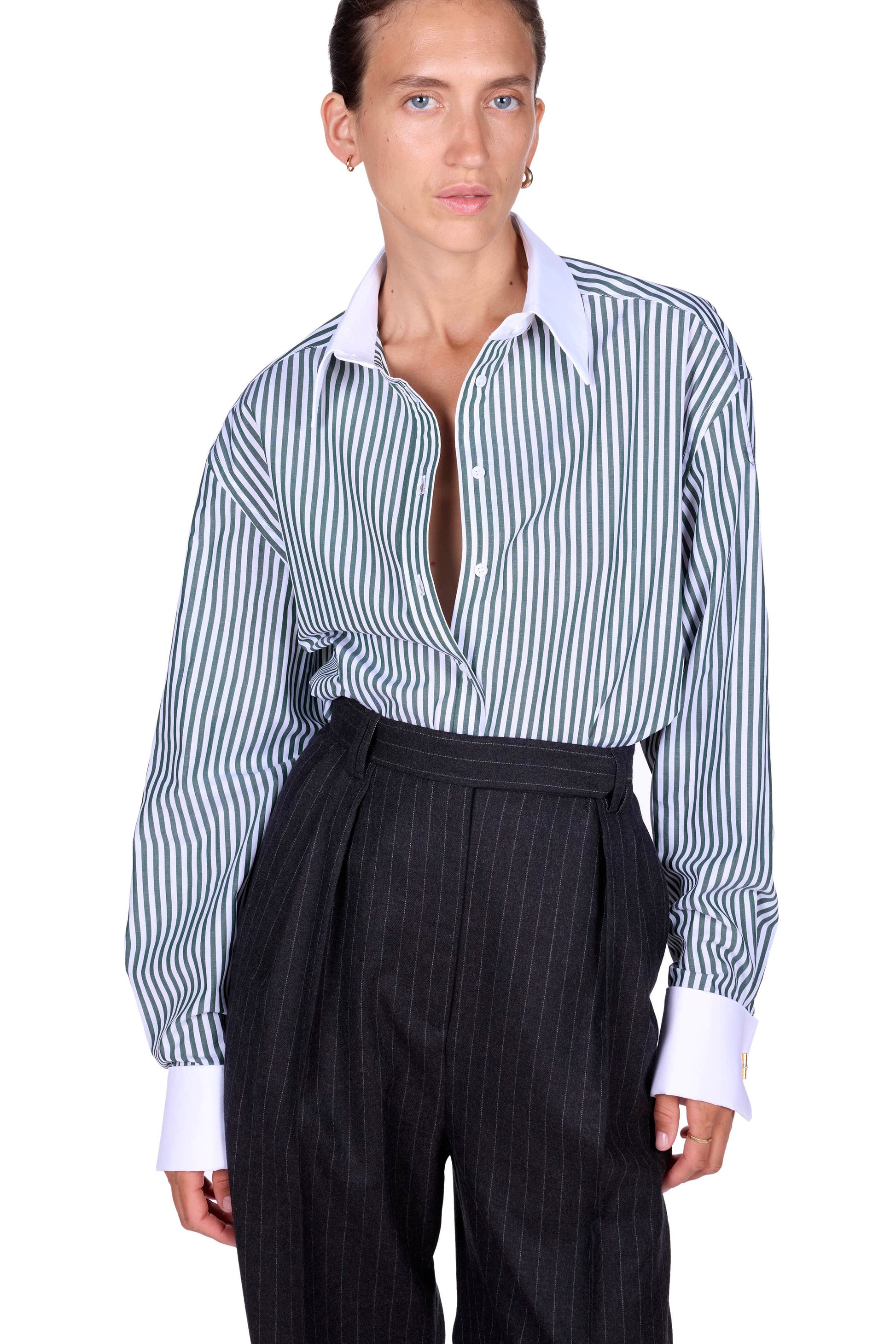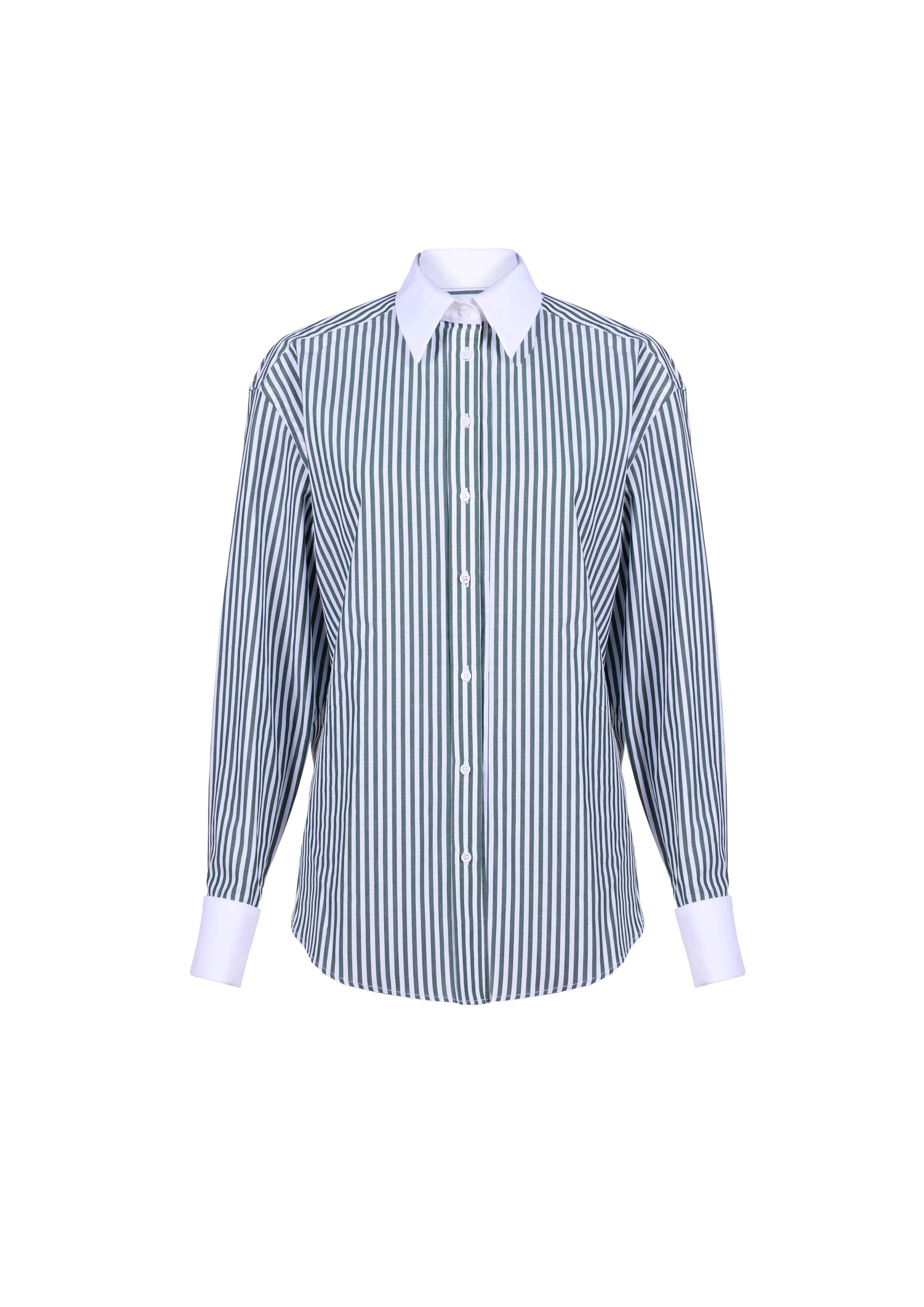 Masculine shirt with contrasted collar and cuffs with engraved brass cufflinks. Rounded hem.