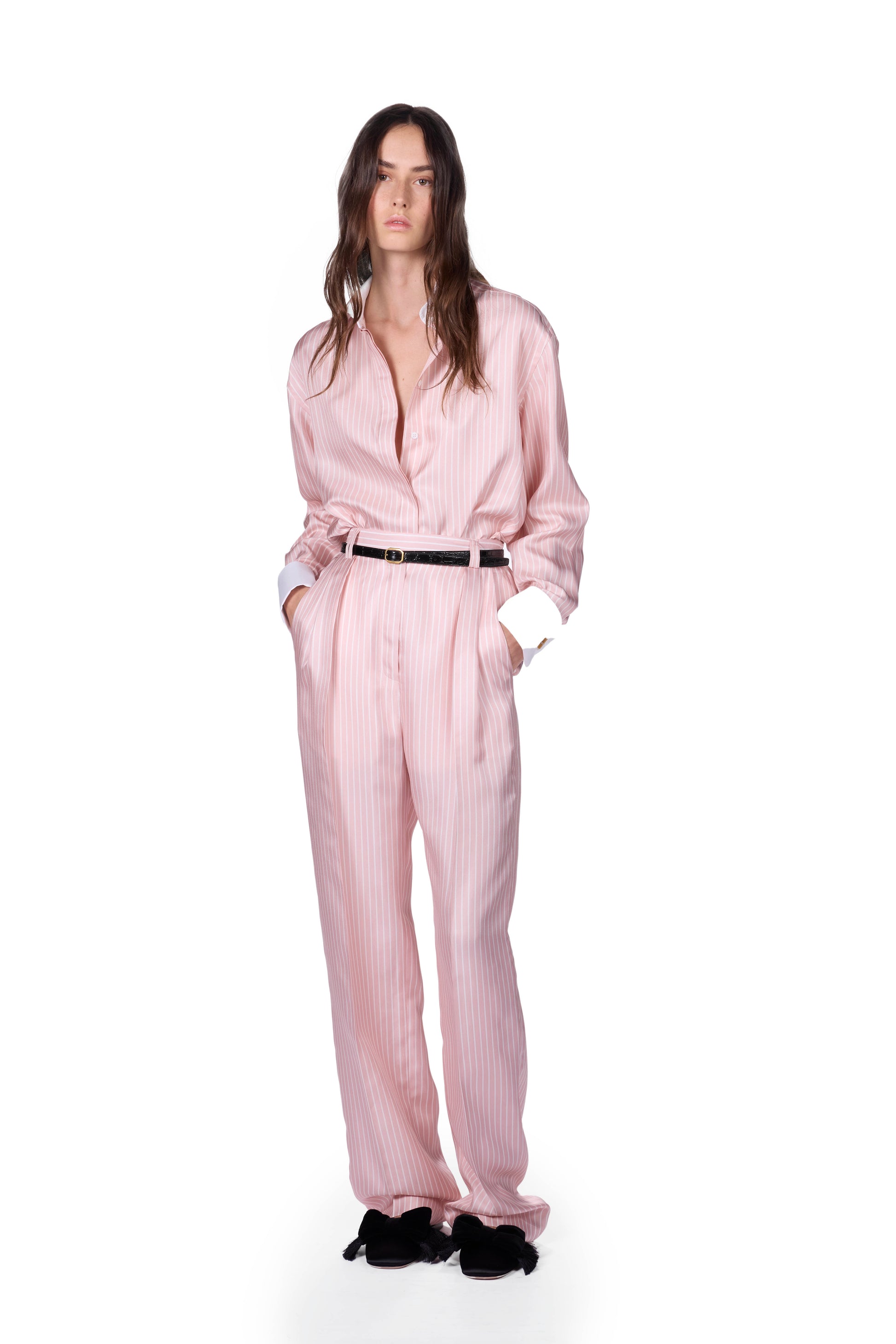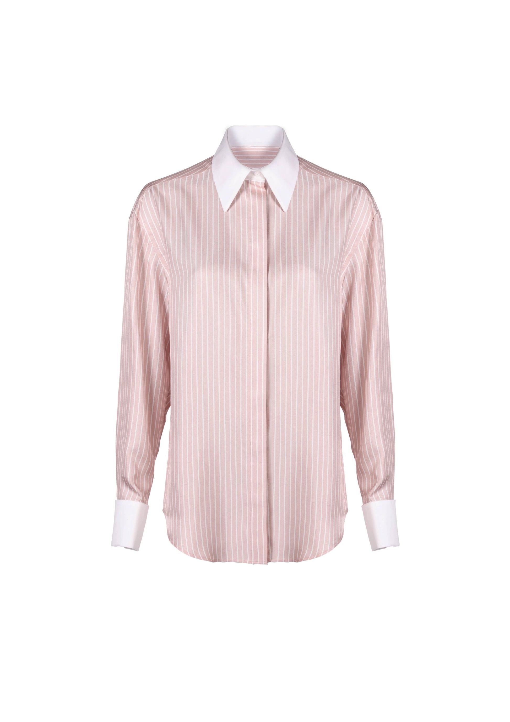 Silk satin masculine shirt with contrasted collar and cuffs with engraved brass cufflinks. Rounded hem.