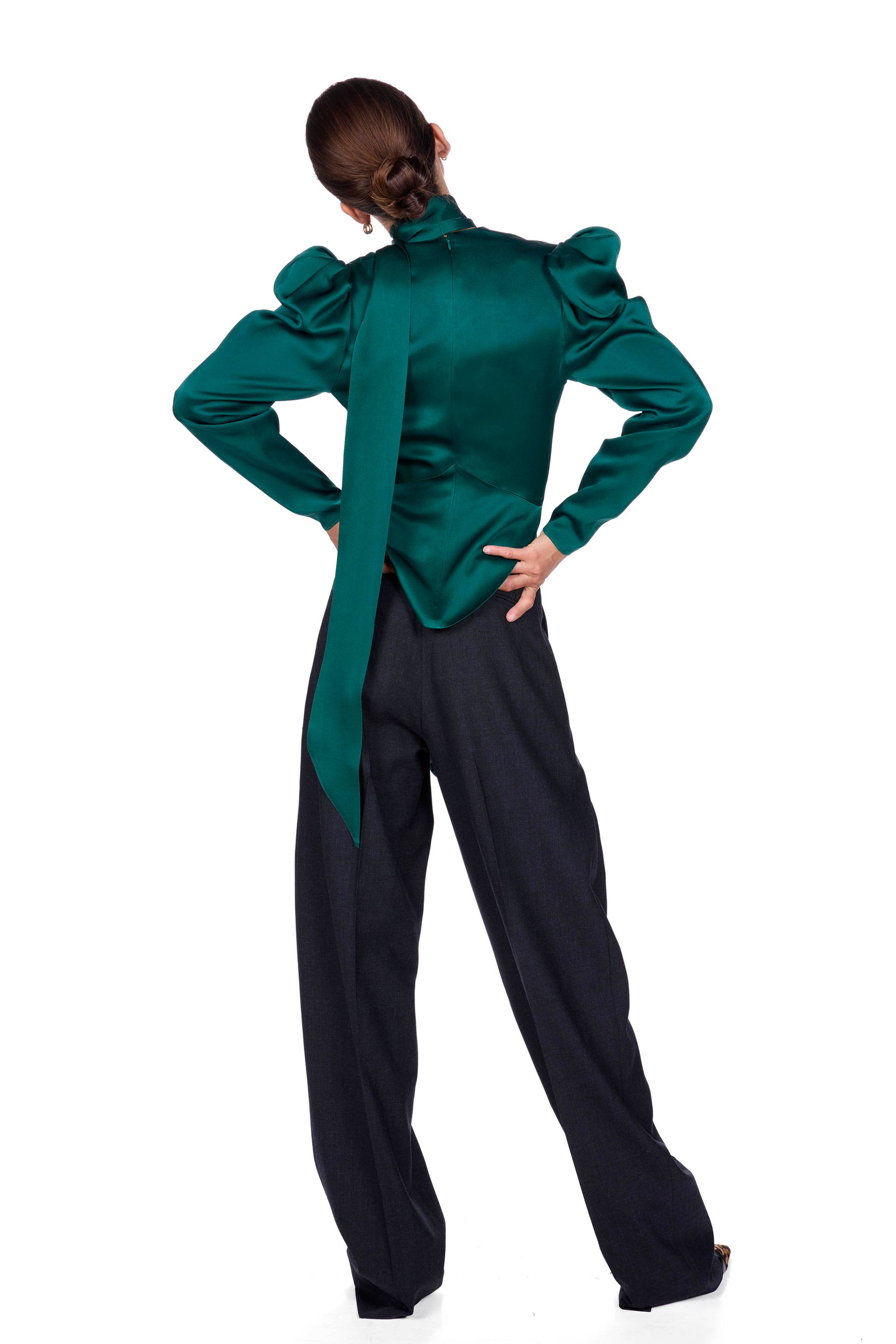 Silk satin top with deep V-neckline. This top has a self-tie collar and can be tied in the back, front or left to drape. Center back invisible zip closure.