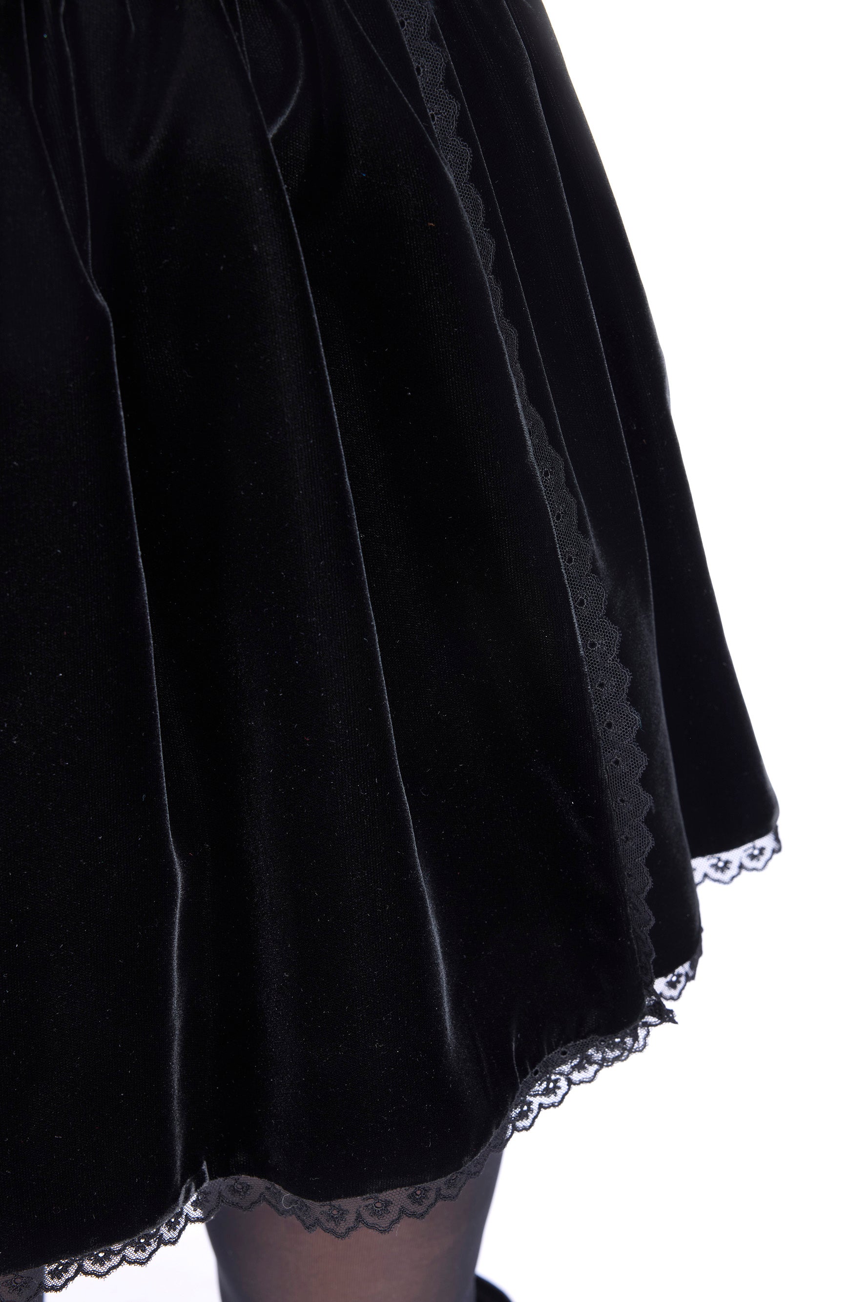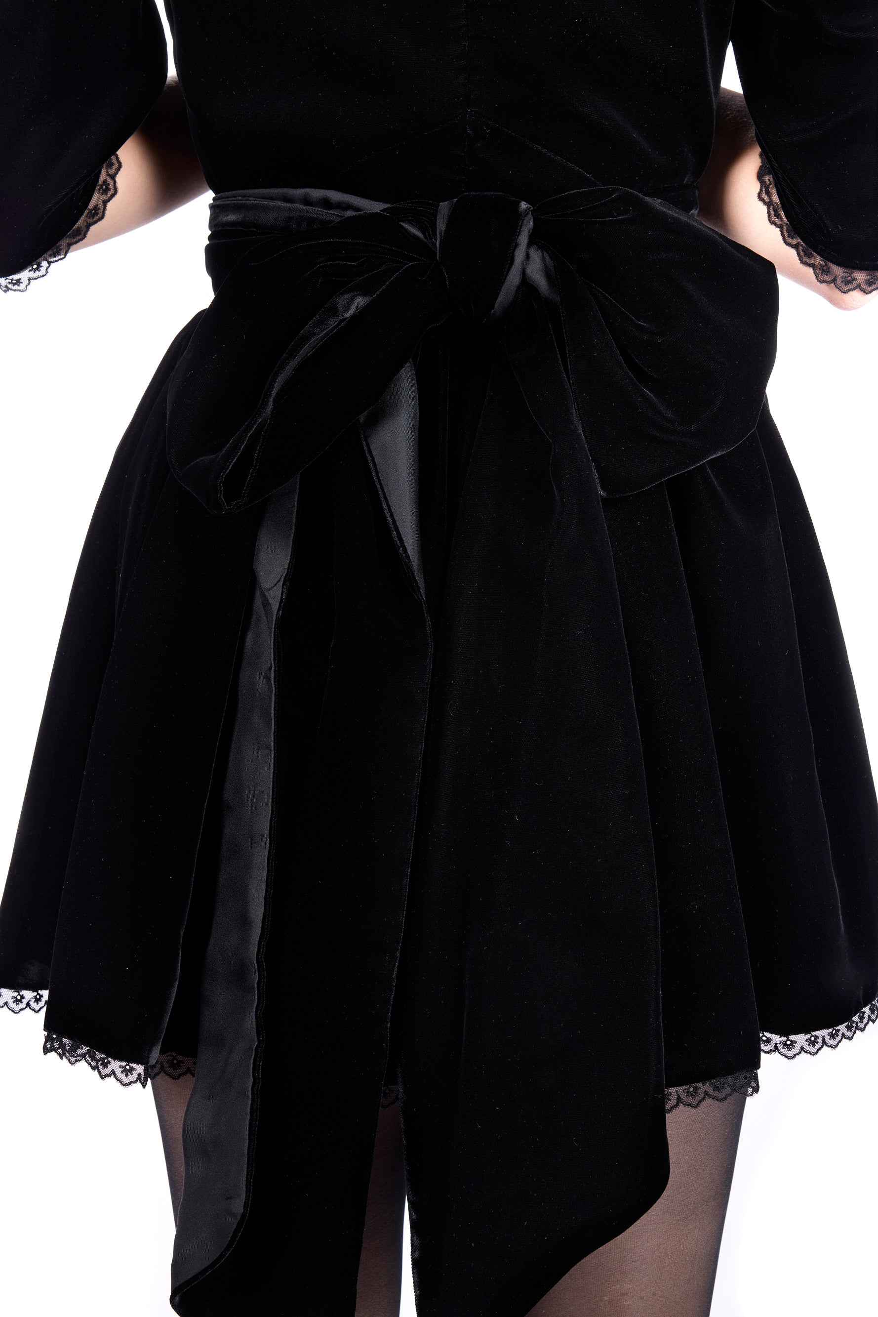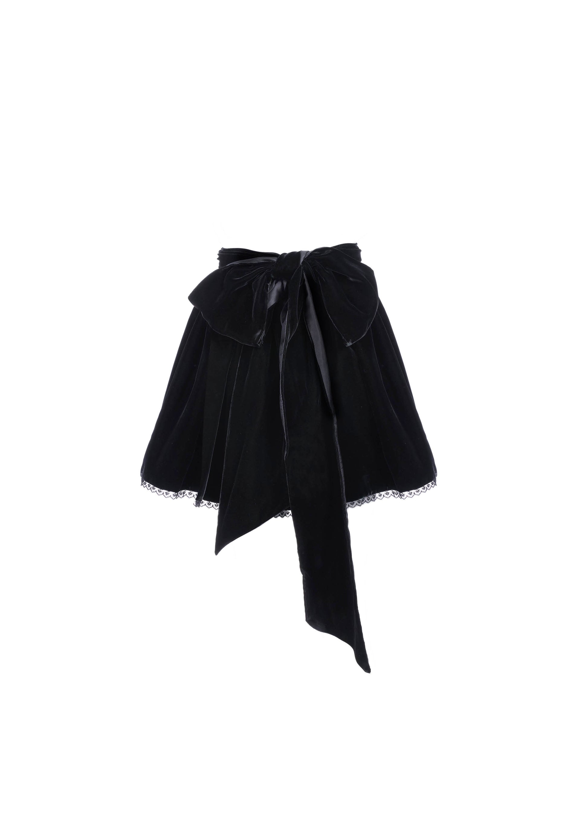 Velvet mini wrap skirt with japanese lace trimmings and center back closure with bow.