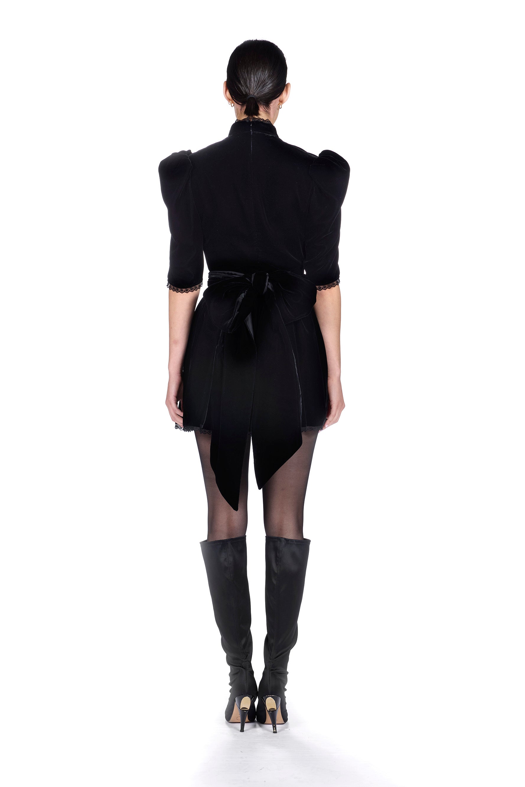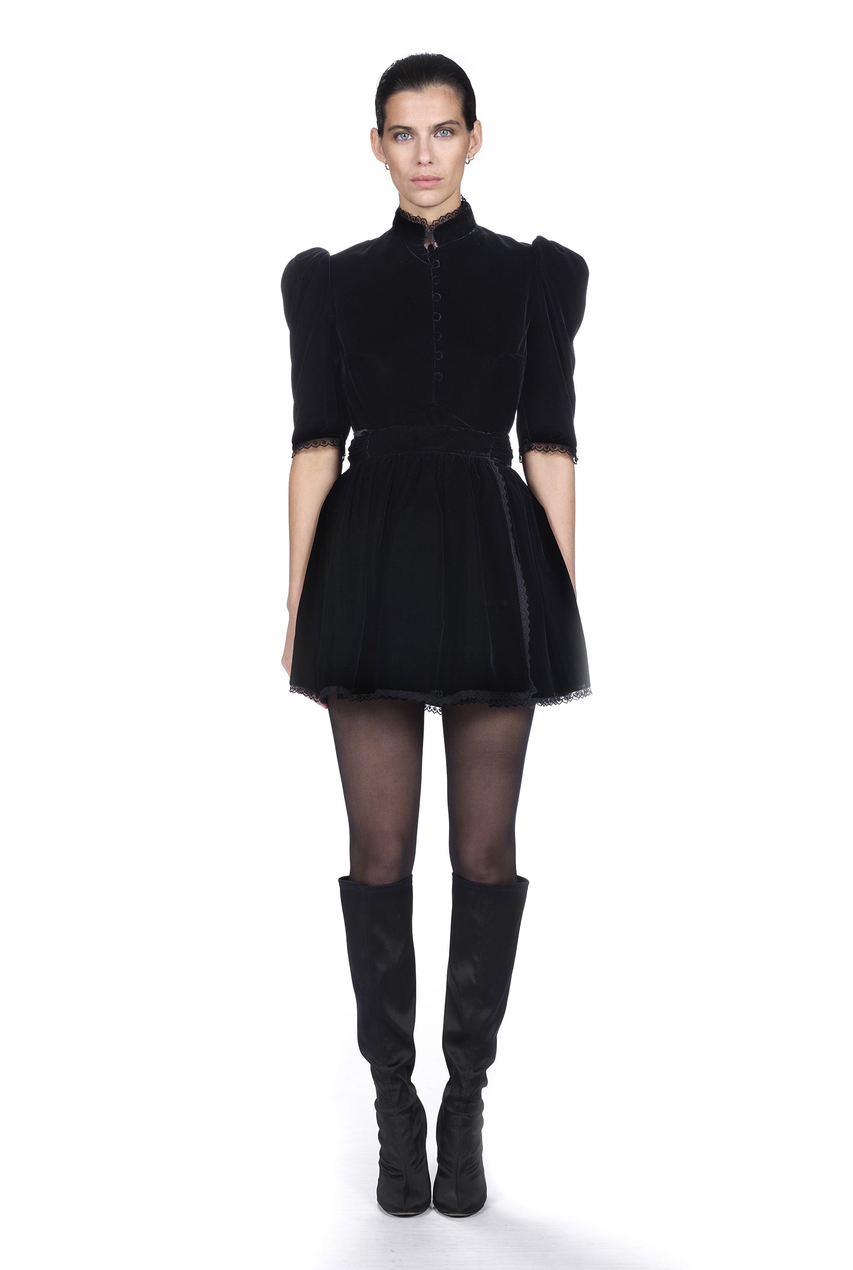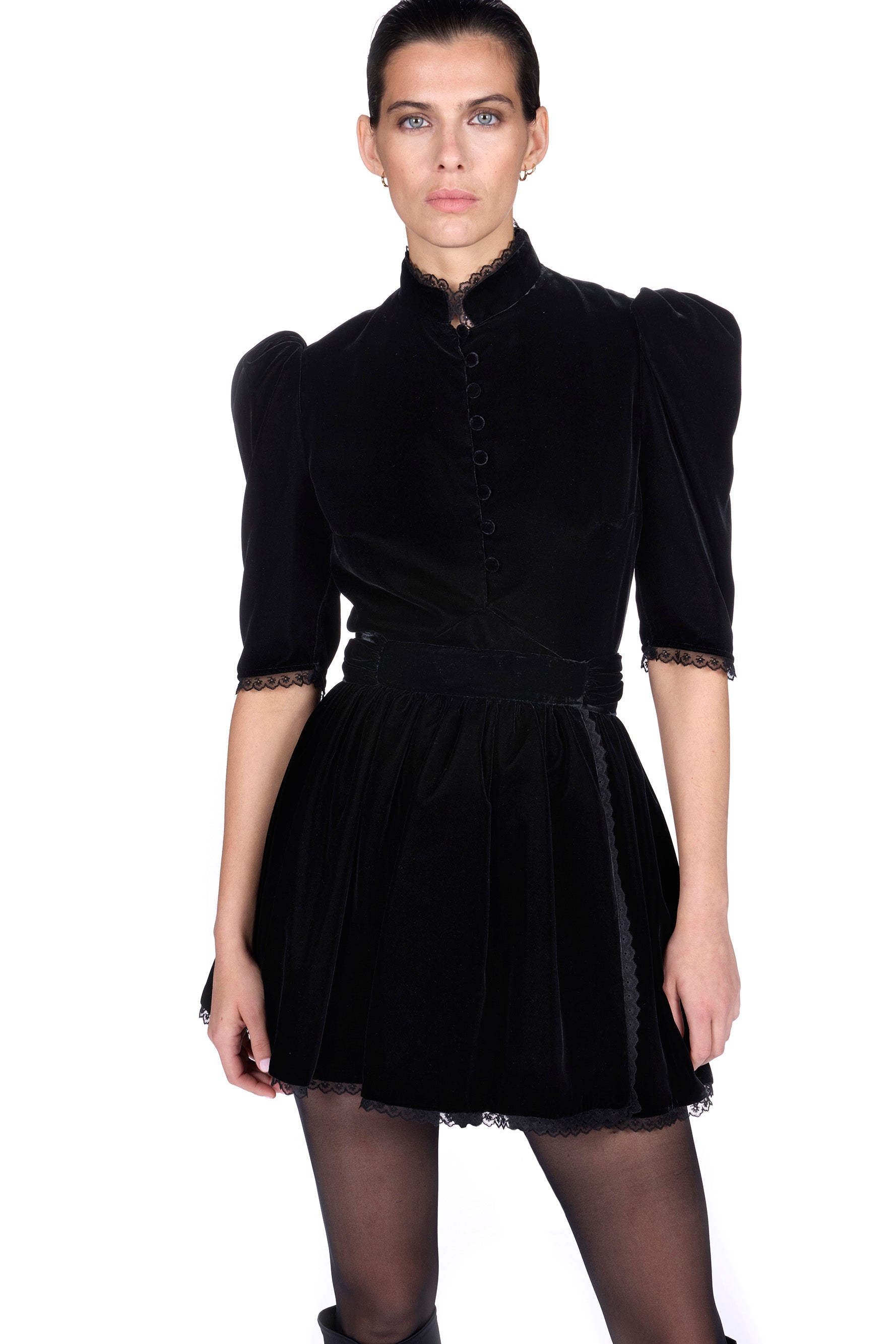 Velvet mini wrap skirt with japanese lace trimmings and center back closure with bow.