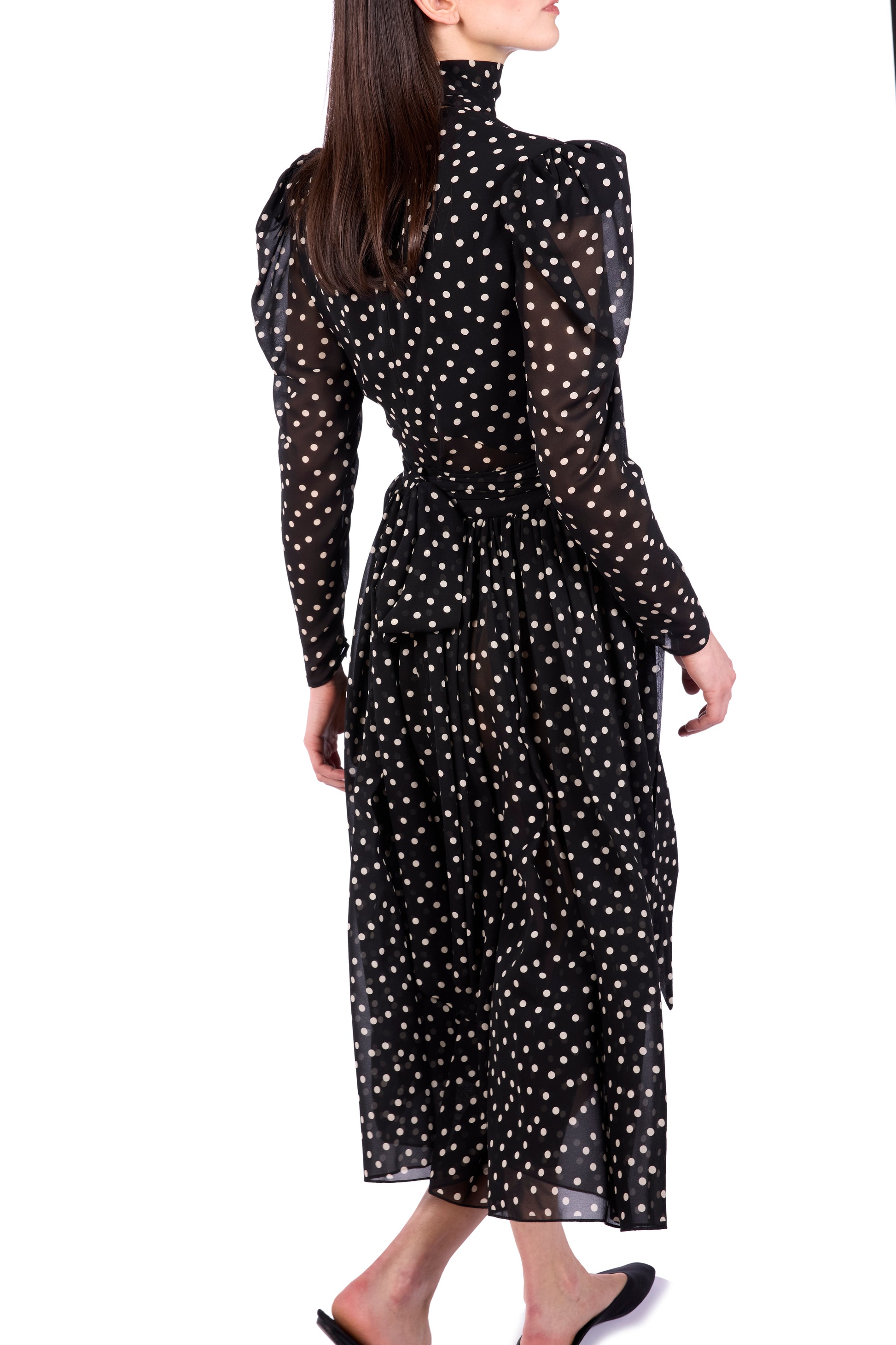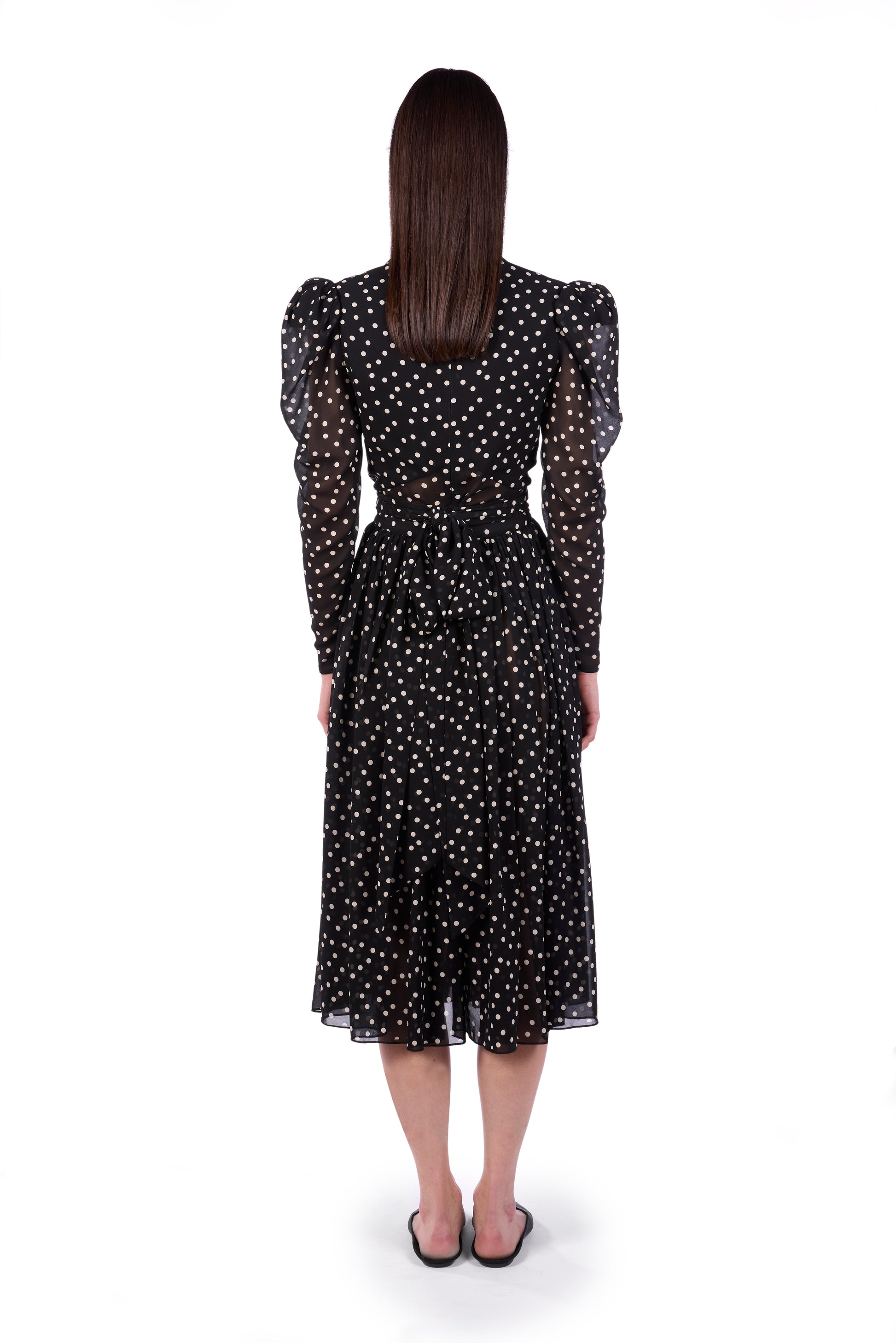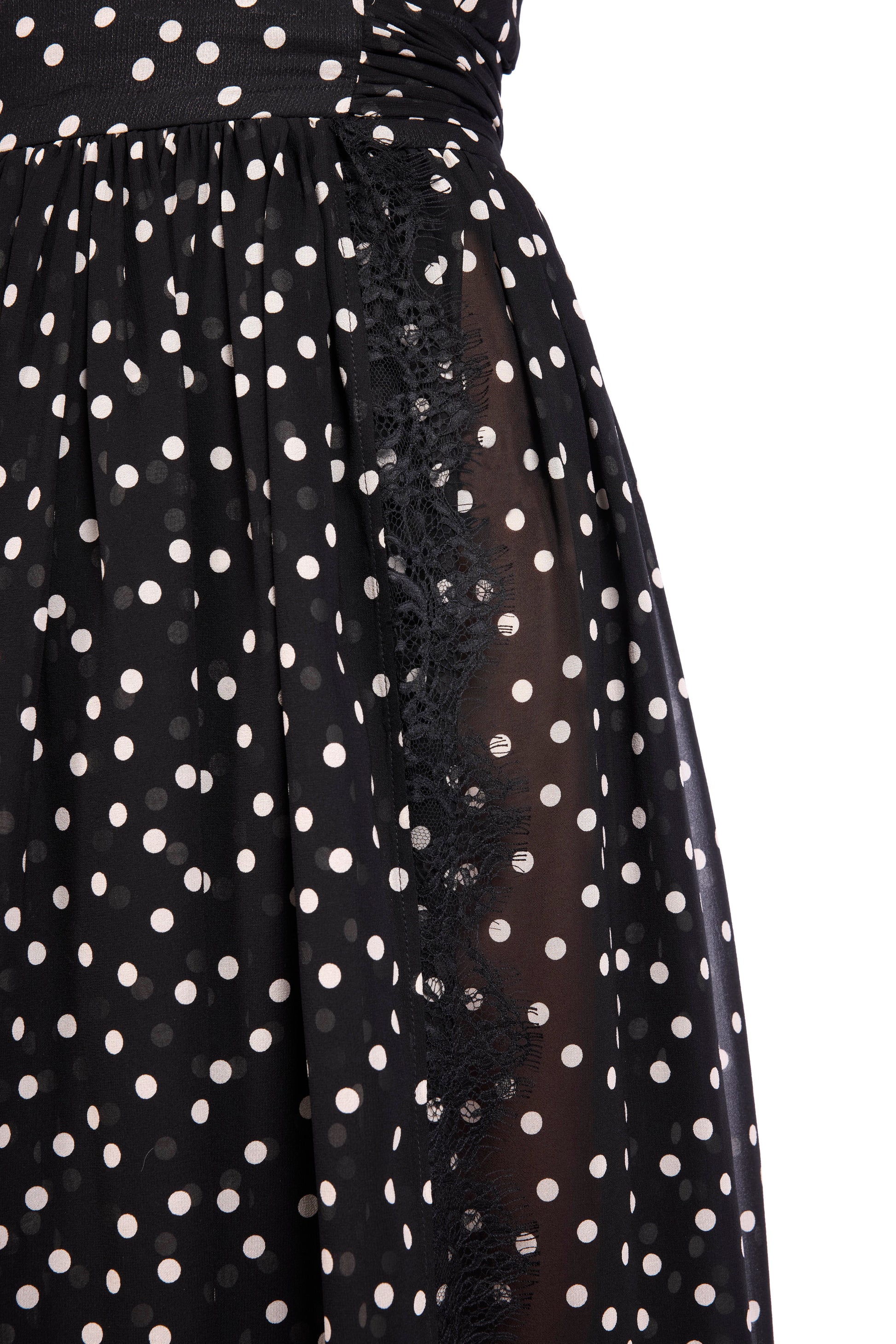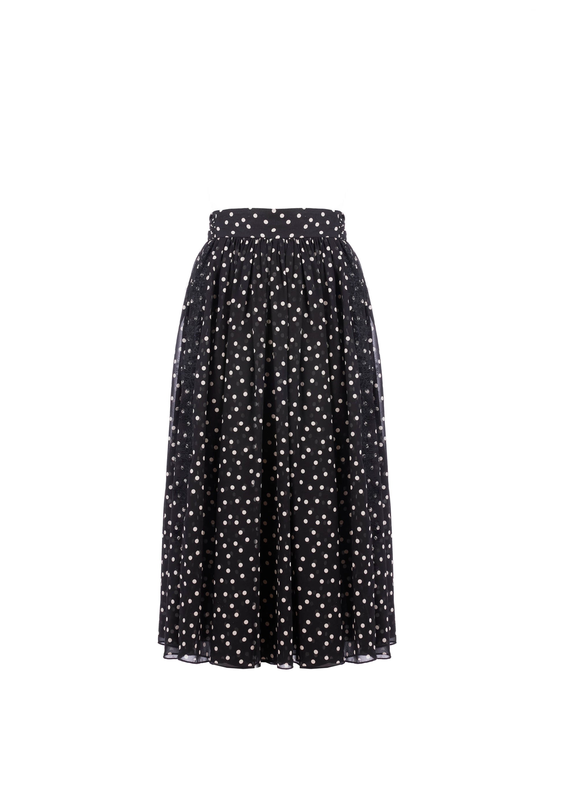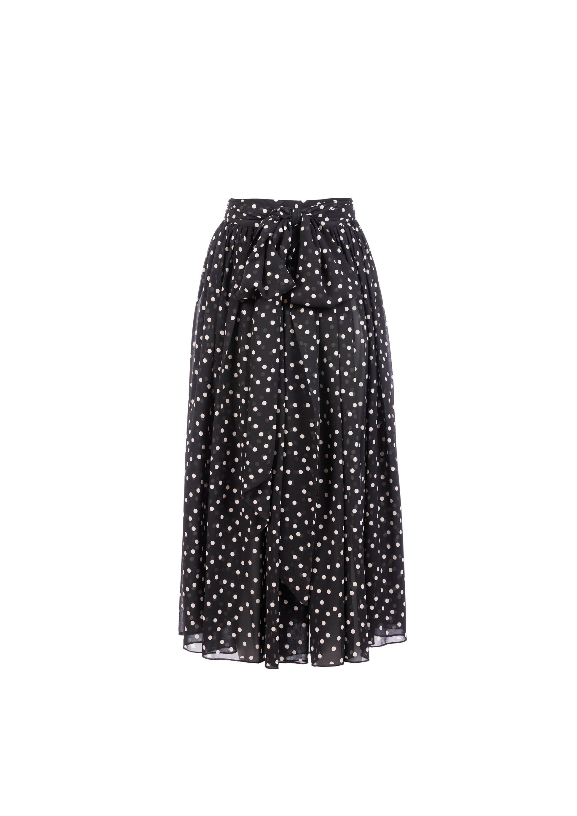 Silk midi wrap skirt with lace detail and center back closure with bow.