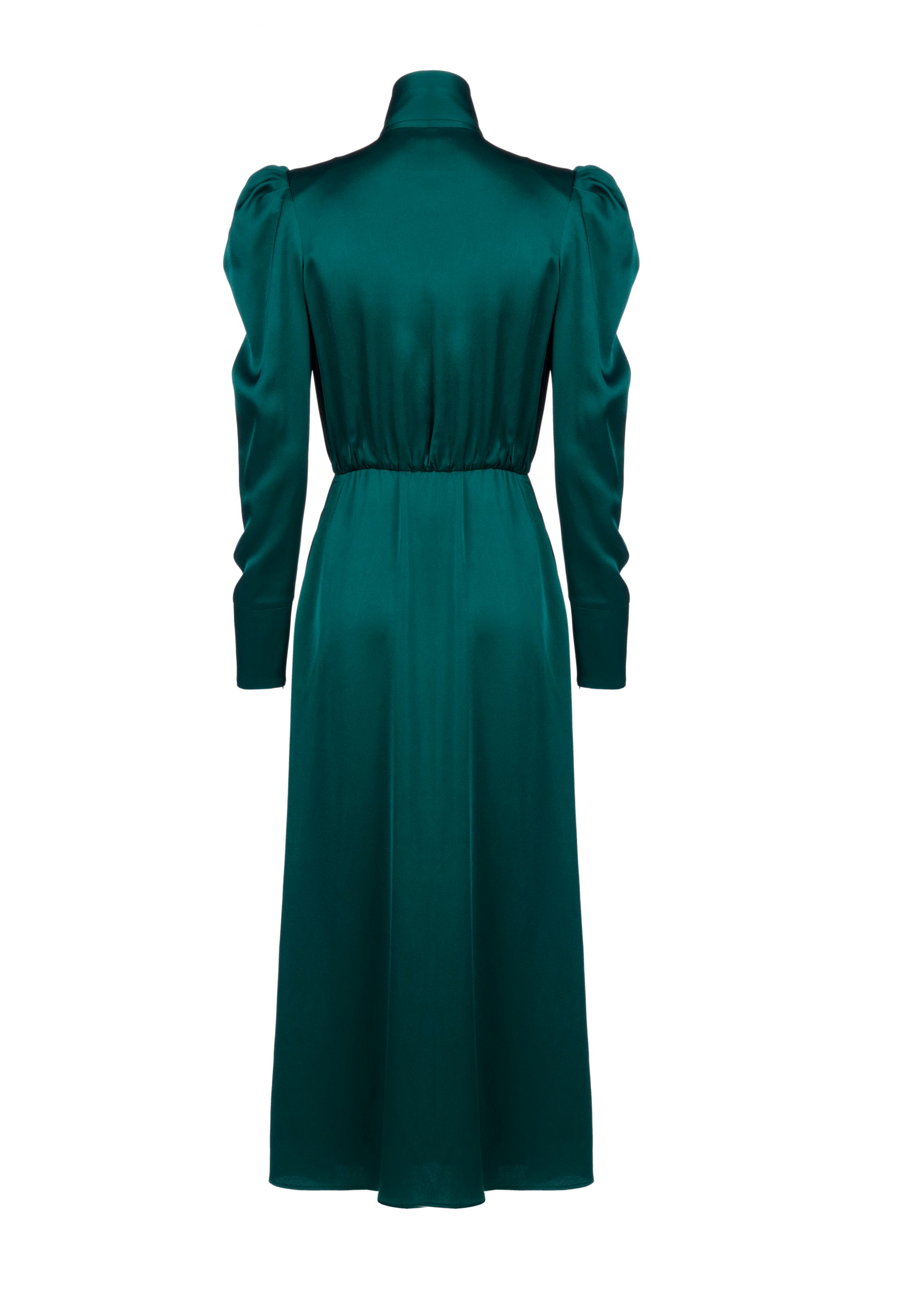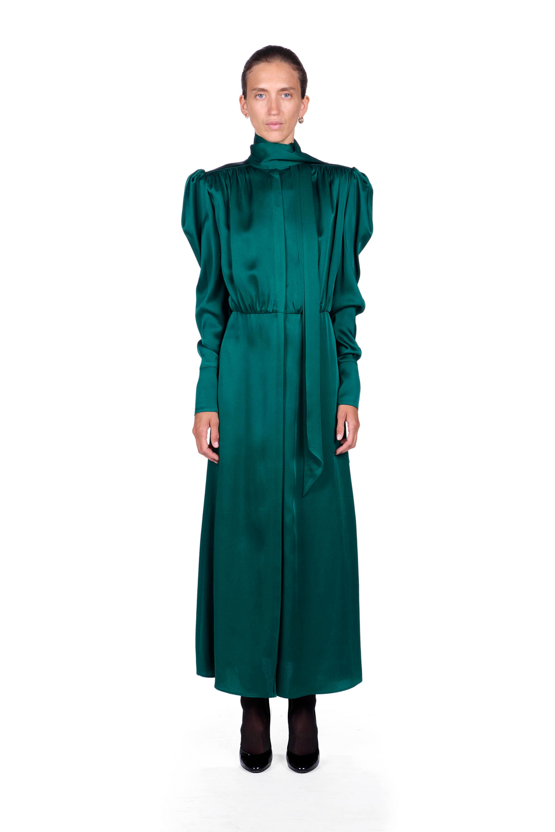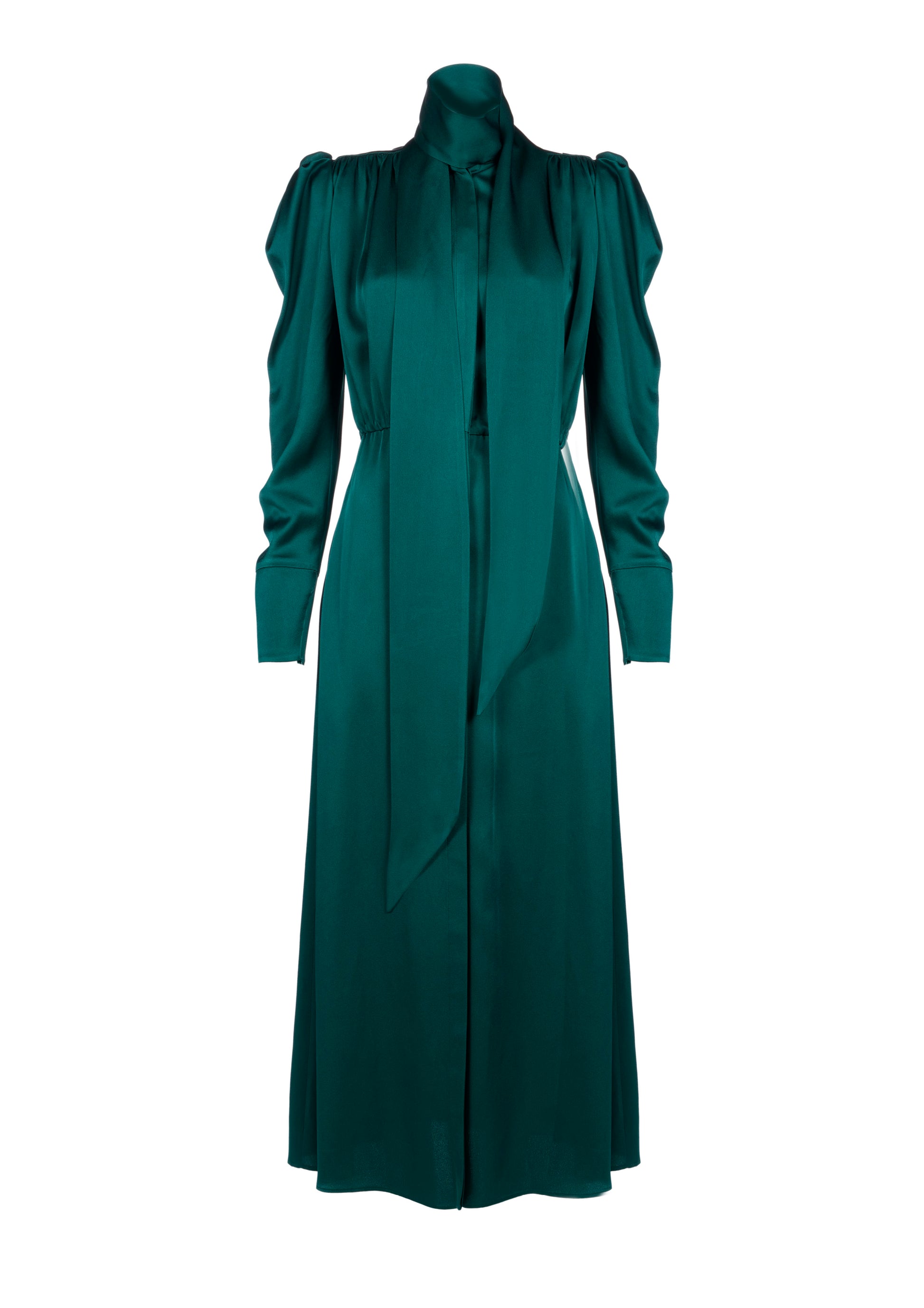 Silk satin midi dress with removable shoulder-pads. Button fastenings through front. This dress has a self-tie collar and can be tied in the back, front or left to drape.