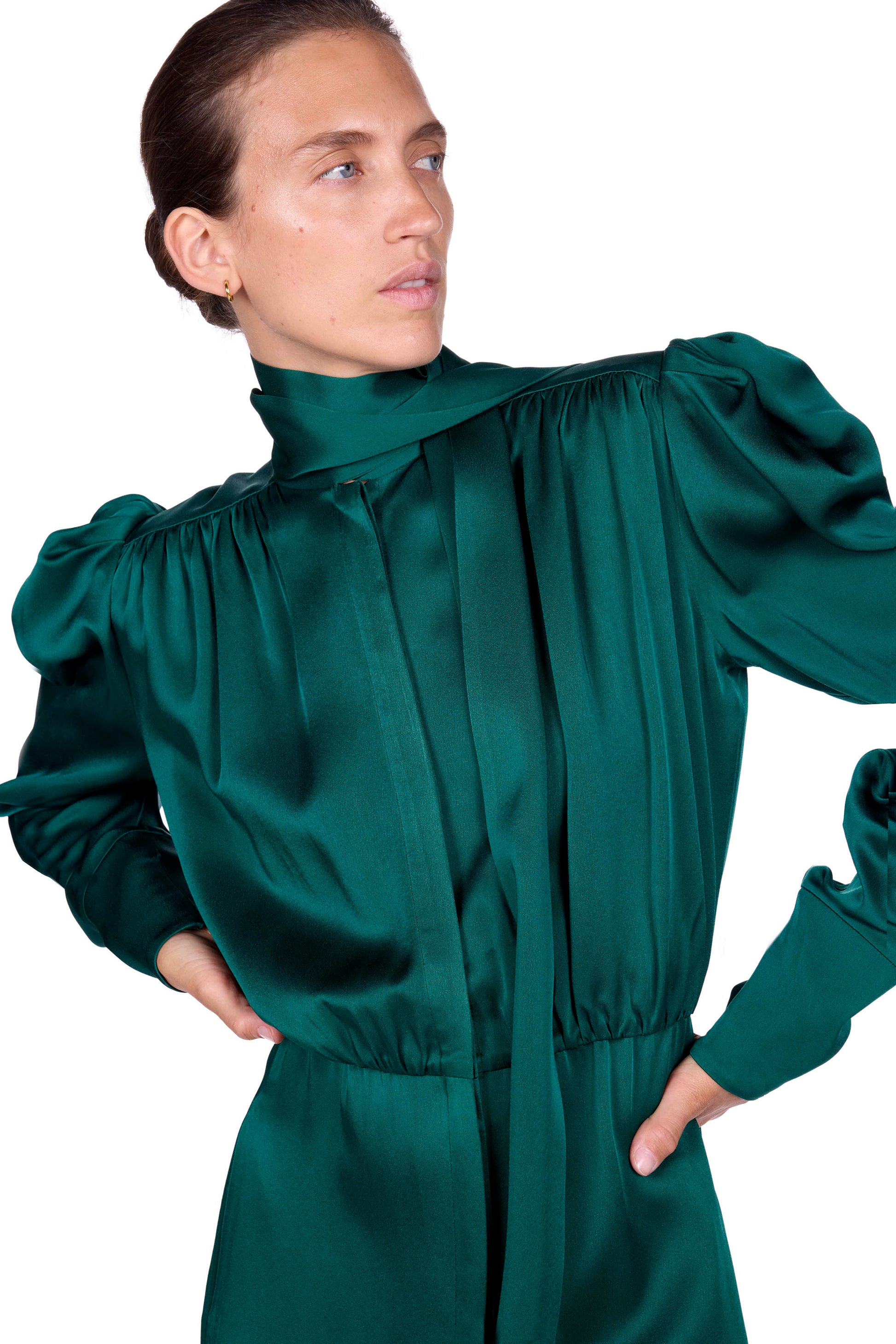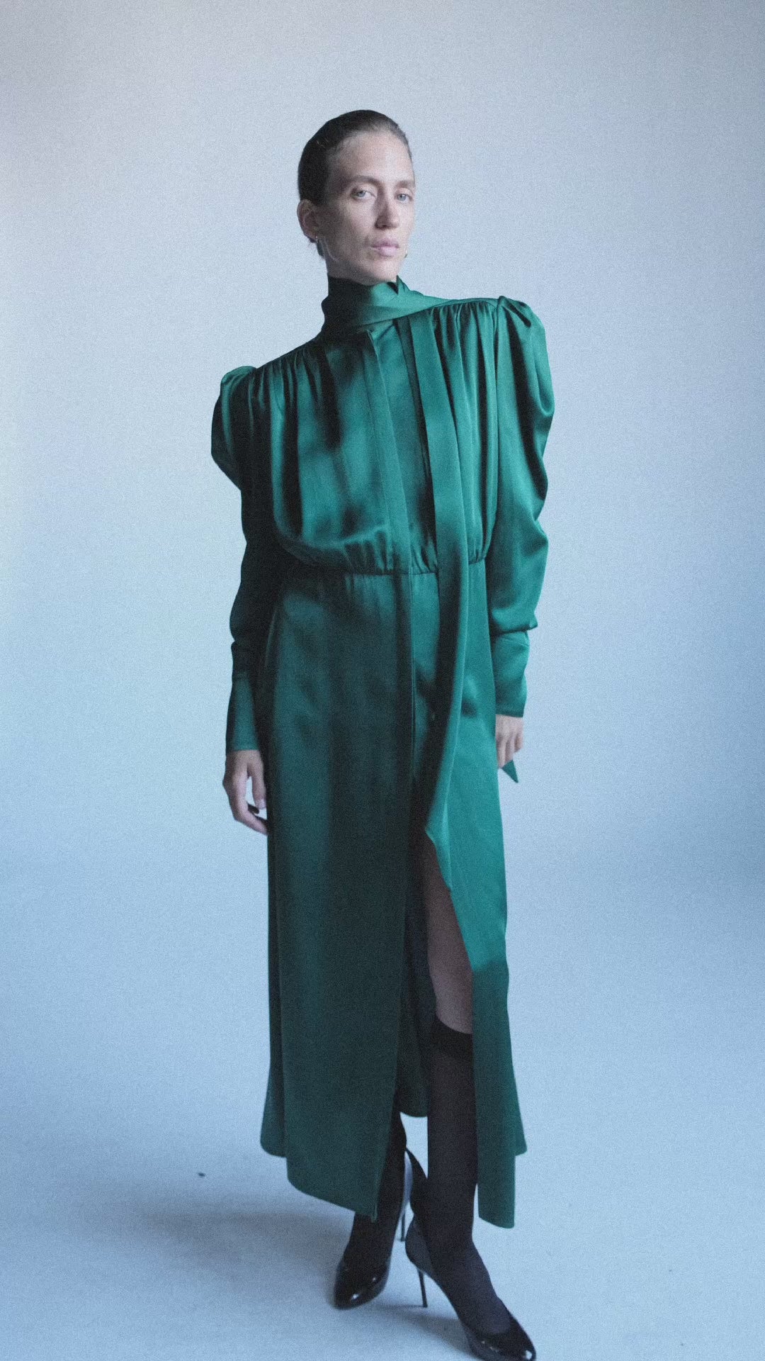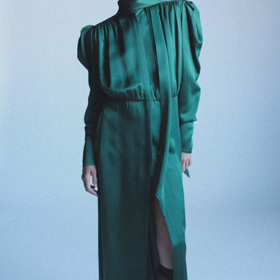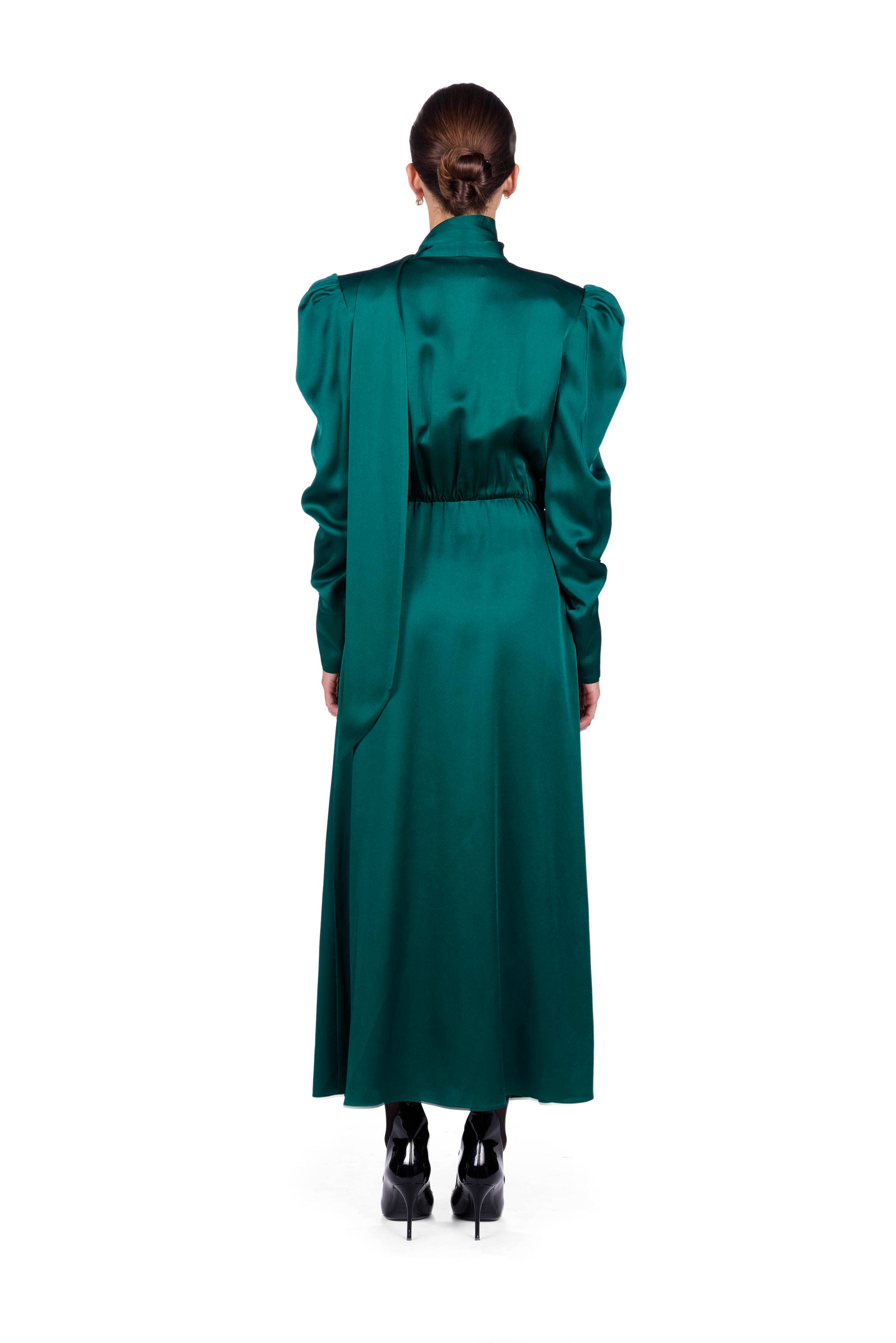 Silk satin midi dress with removable shoulder-pads. Button fastenings through front. This dress has a self-tie collar and can be tied in the back, front or left to drape.