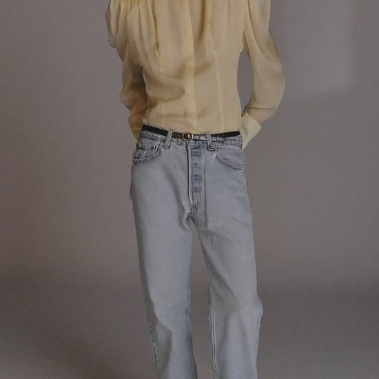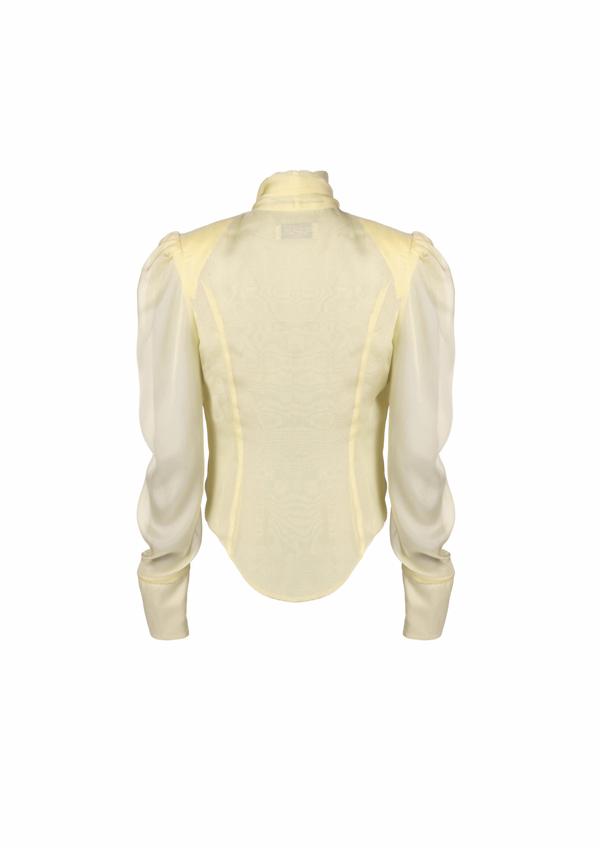 Lavallière silk chiffon blouse with removable shoulder-pads. The lavallière can be tied in the back, front or left to drape.