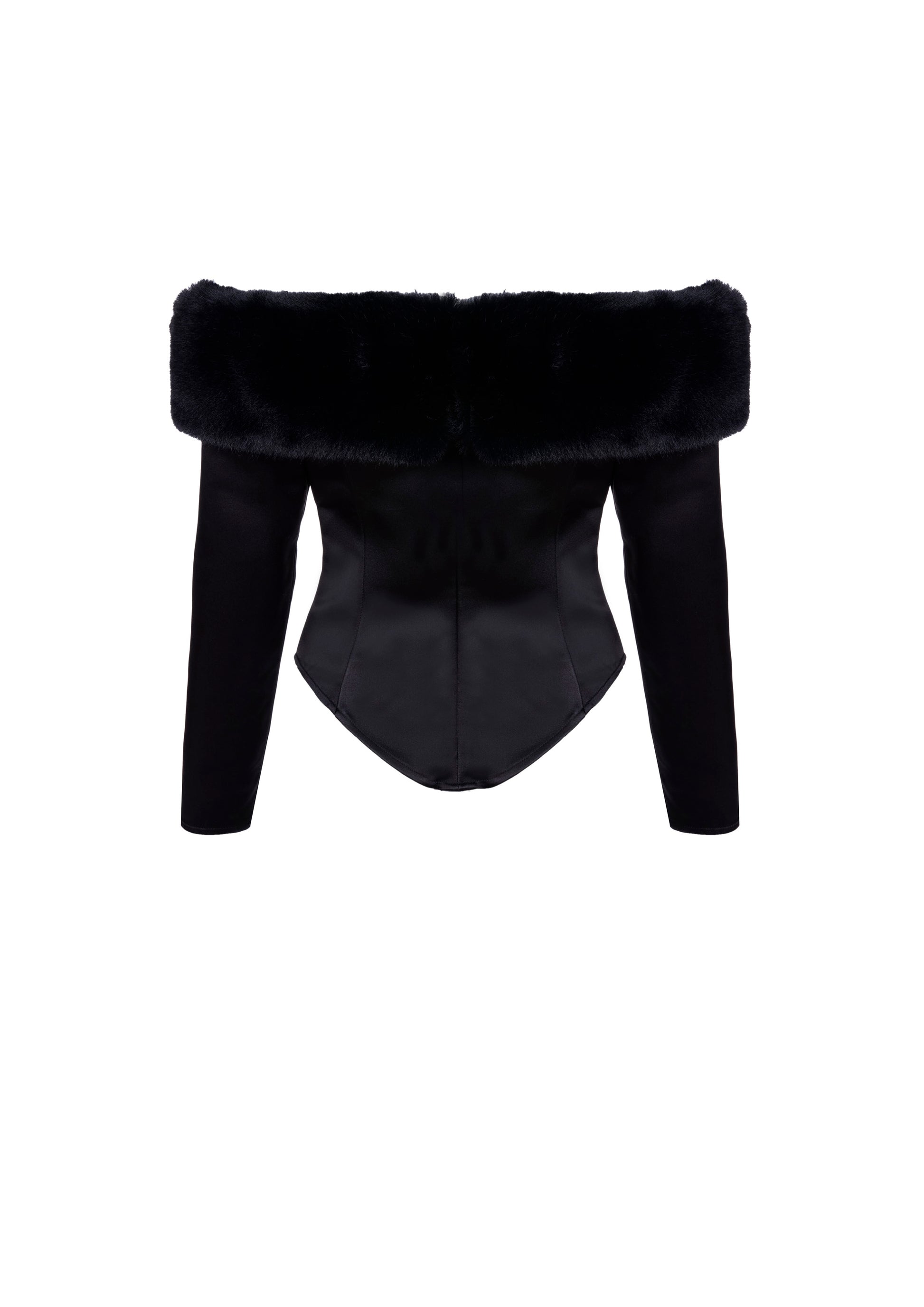 Duchess satin silk with fake fur neckline. Center back invisible zip closure.
