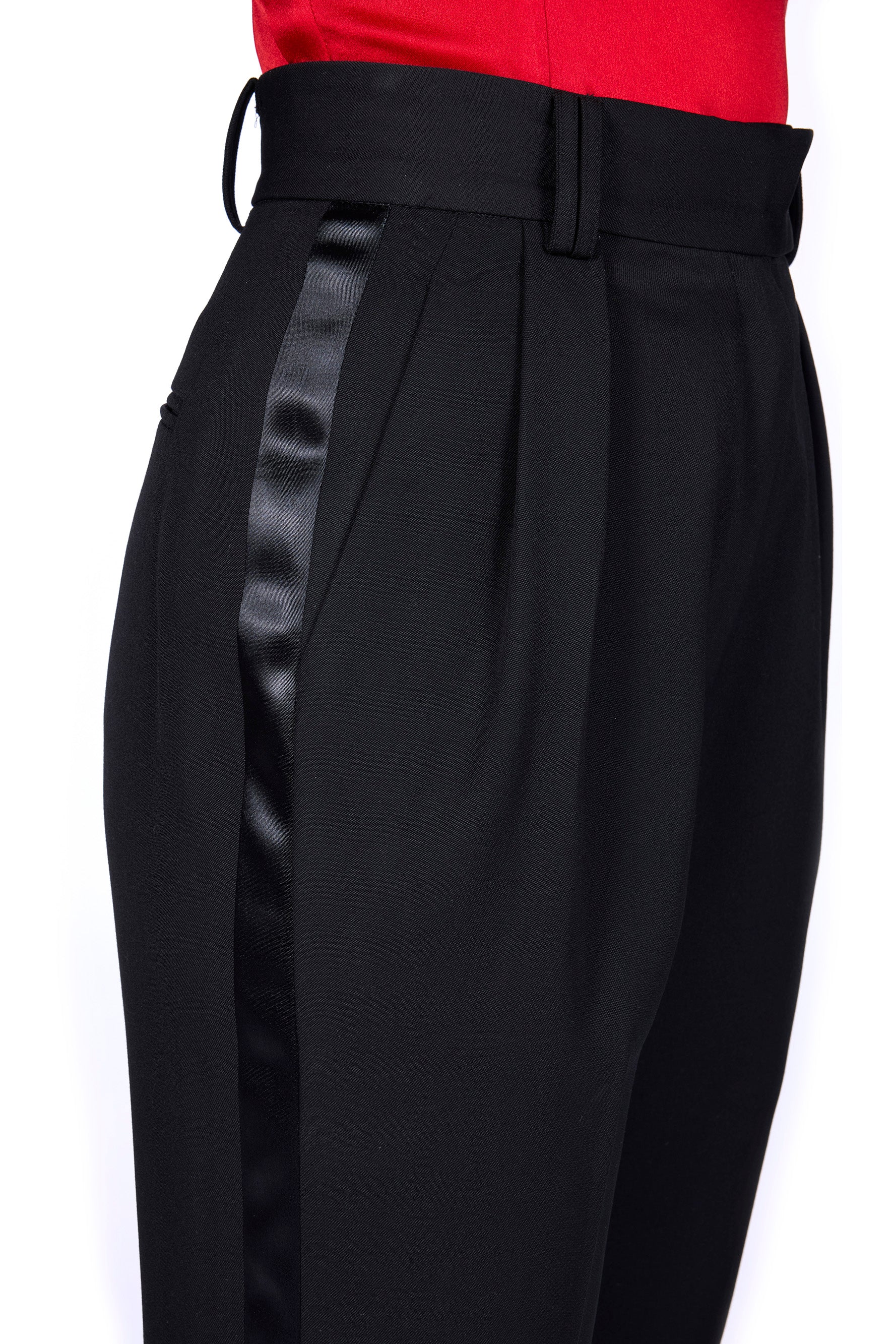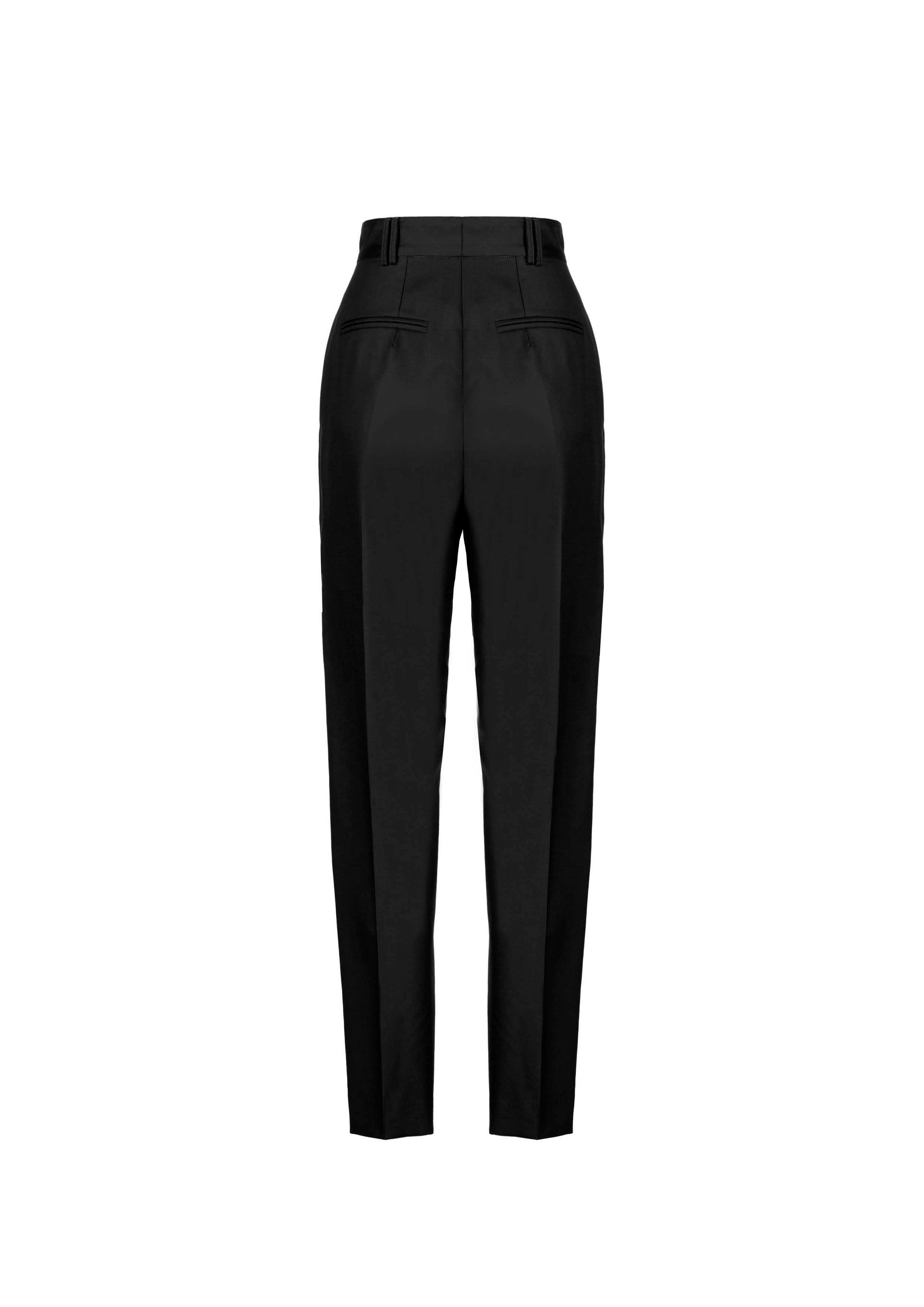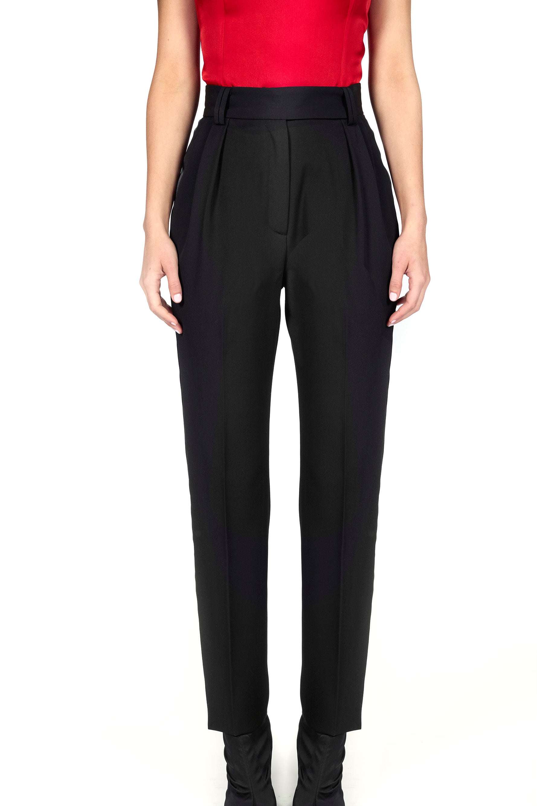 High-rise carrot-cut tuxedo pants with pleated leg, tapered at the ankle and cut in virgin wool. Concealed hooks and zip fastening at front.