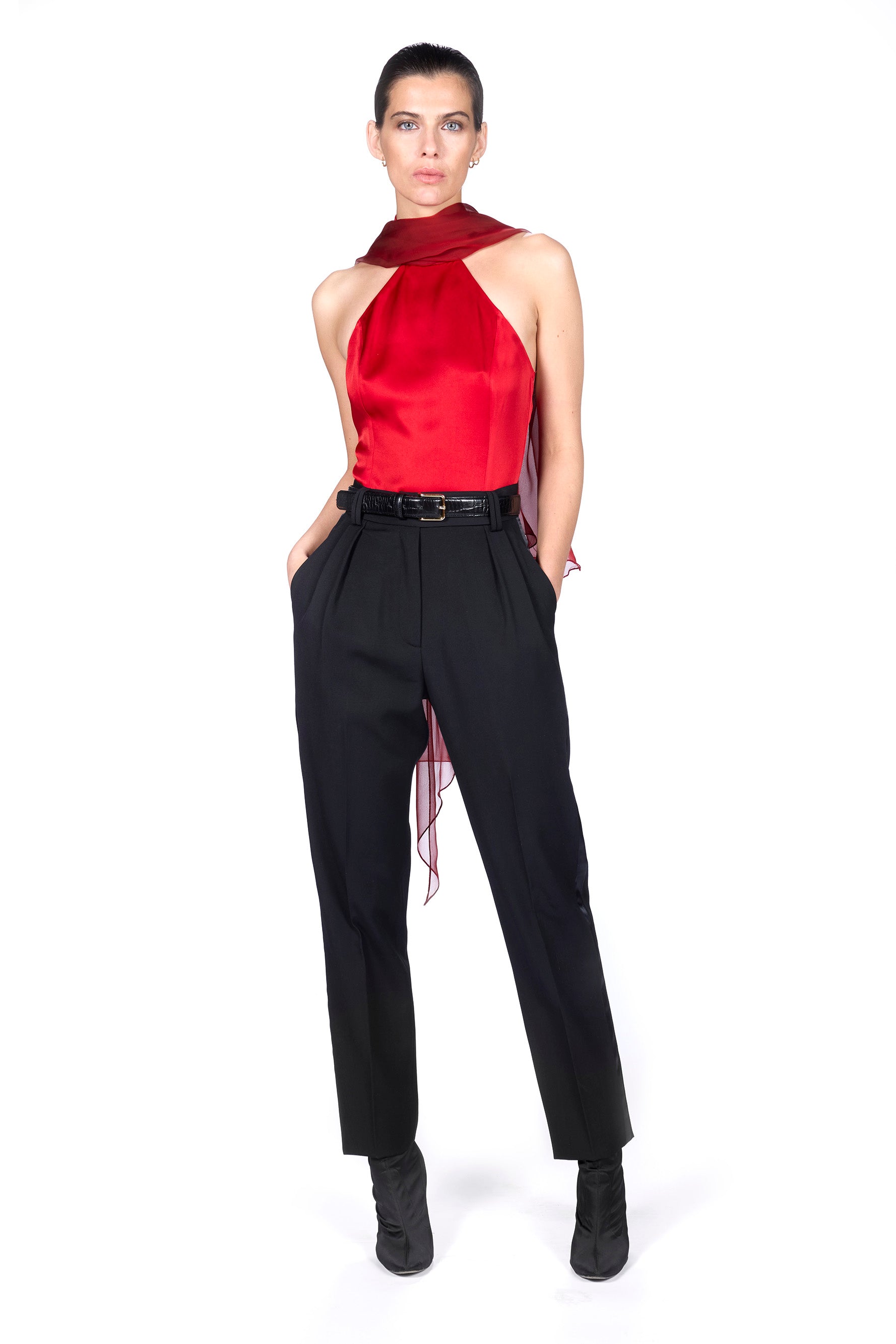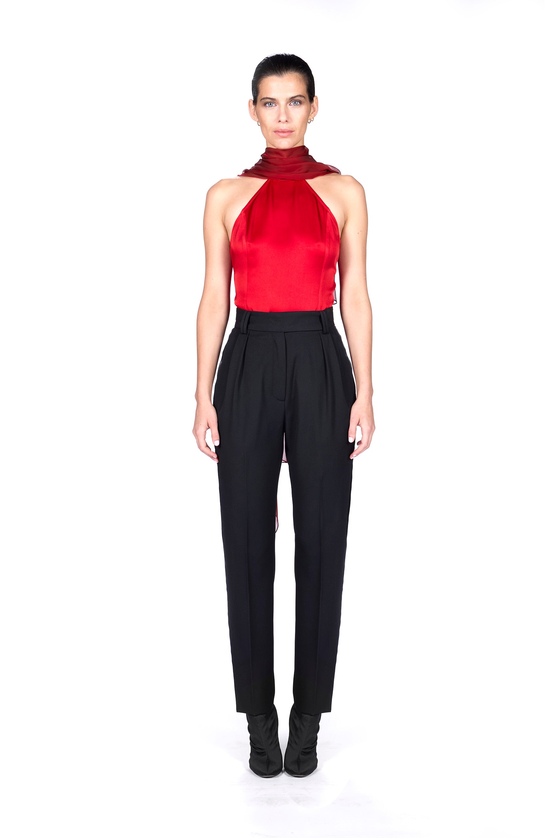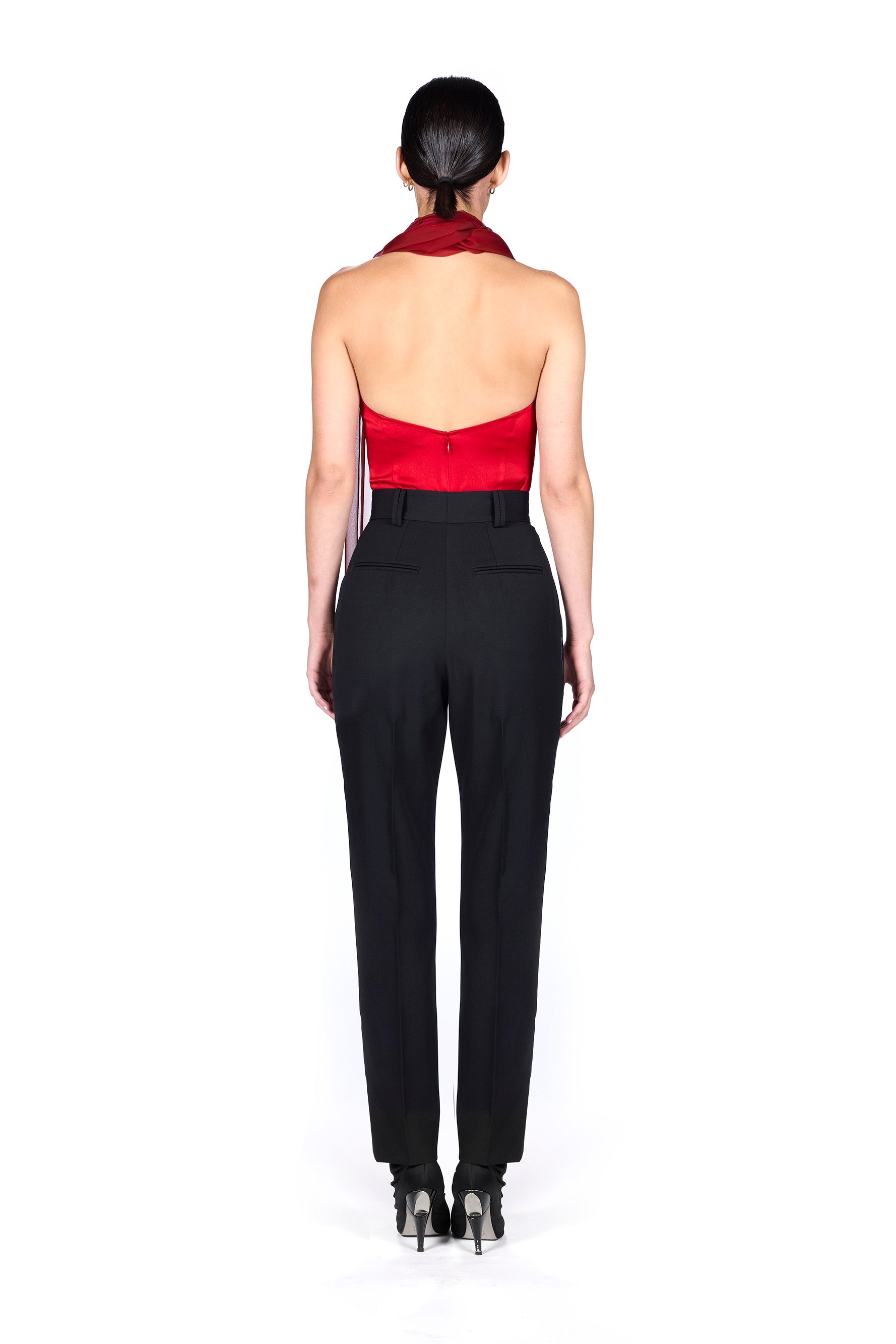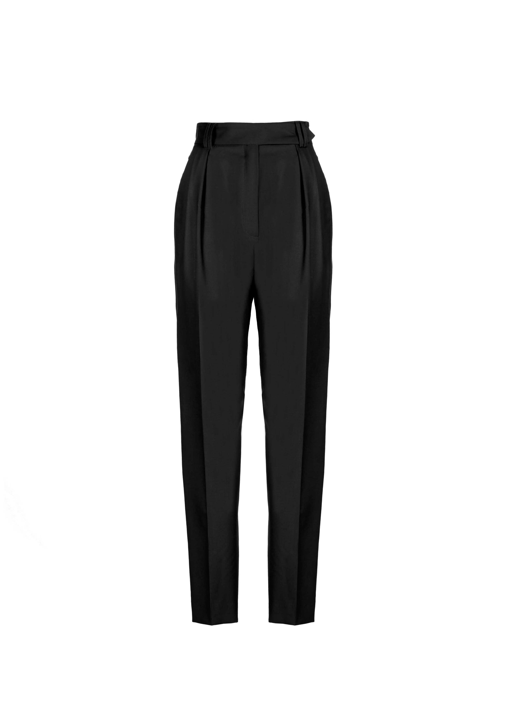 High-rise carrot-cut tuxedo pants with pleated leg, tapered at the ankle and cut in virgin wool. Concealed hooks and zip fastening at front.