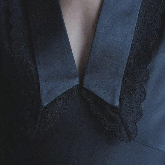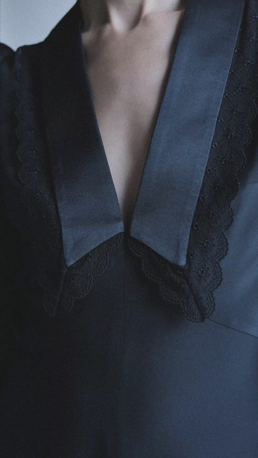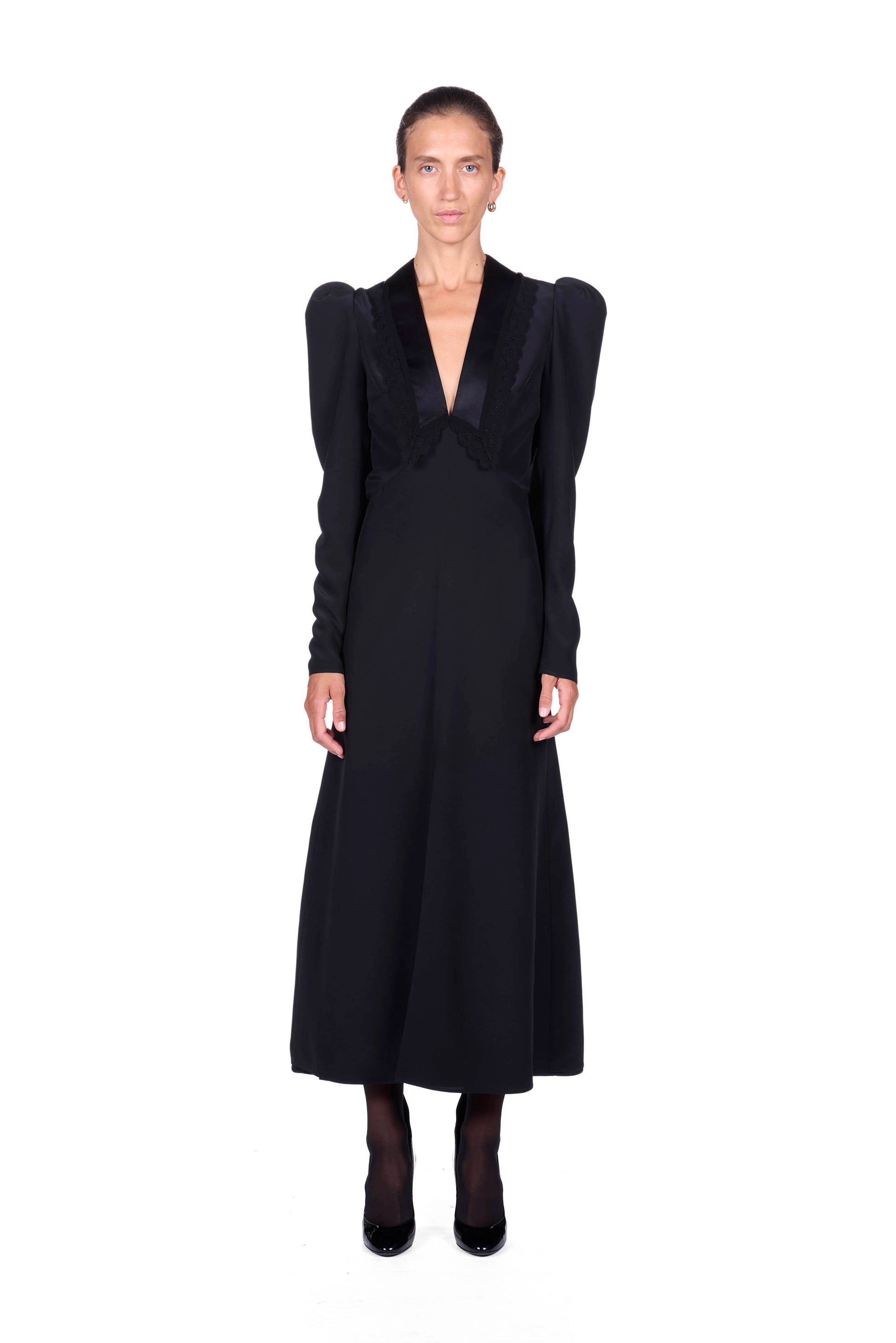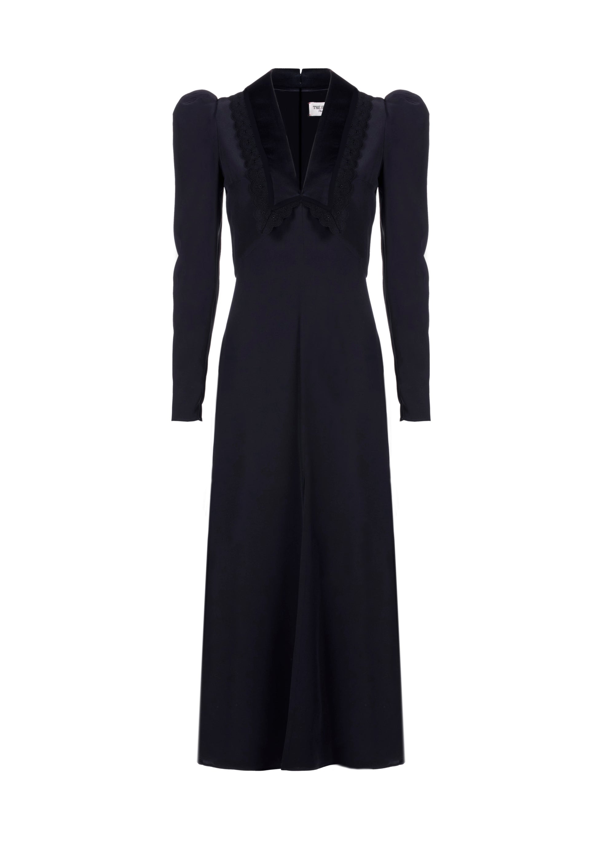Silk midi dress with puffed shoulders and deep collar with Japanese lace detail. Center back invisible zip closure.