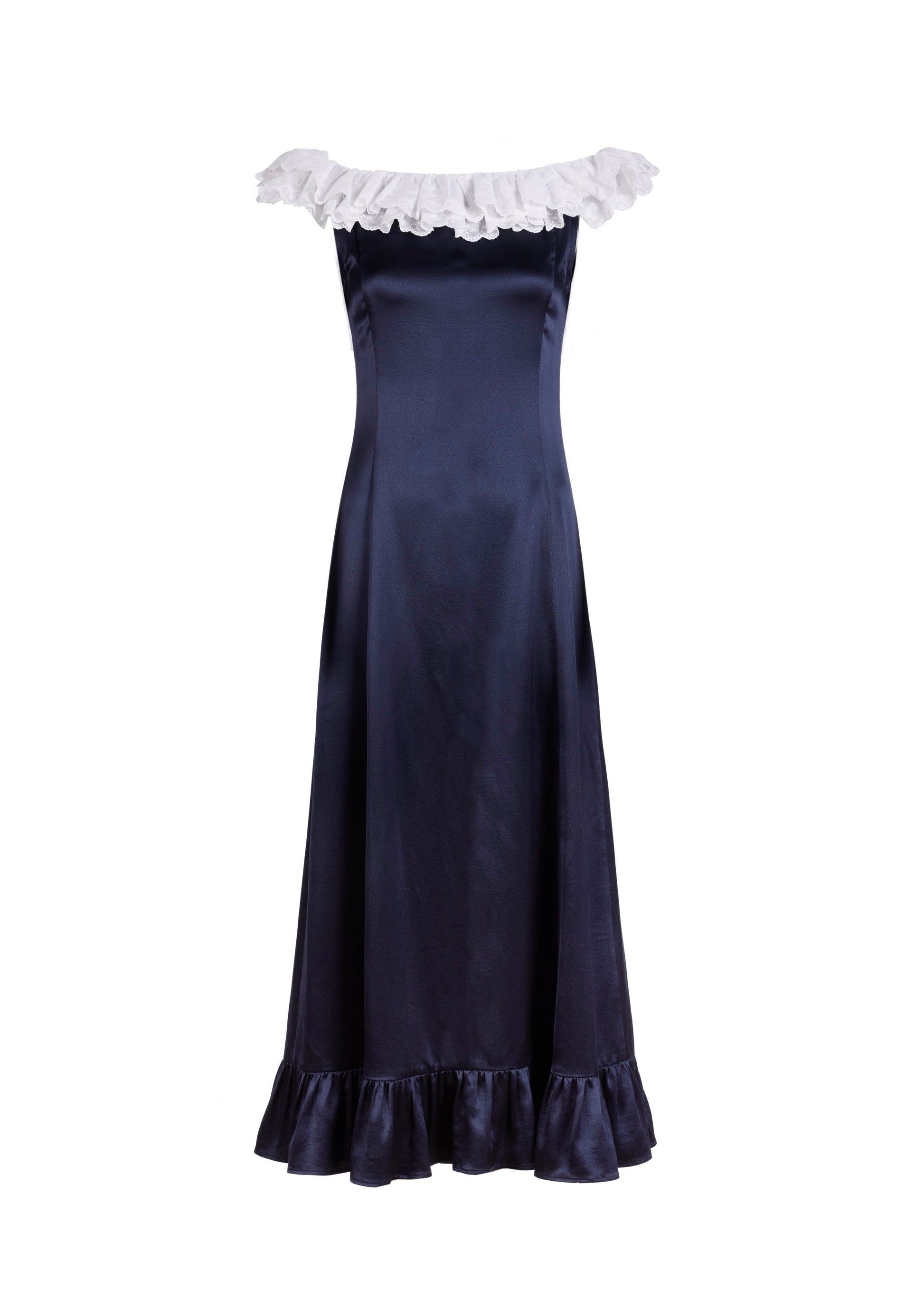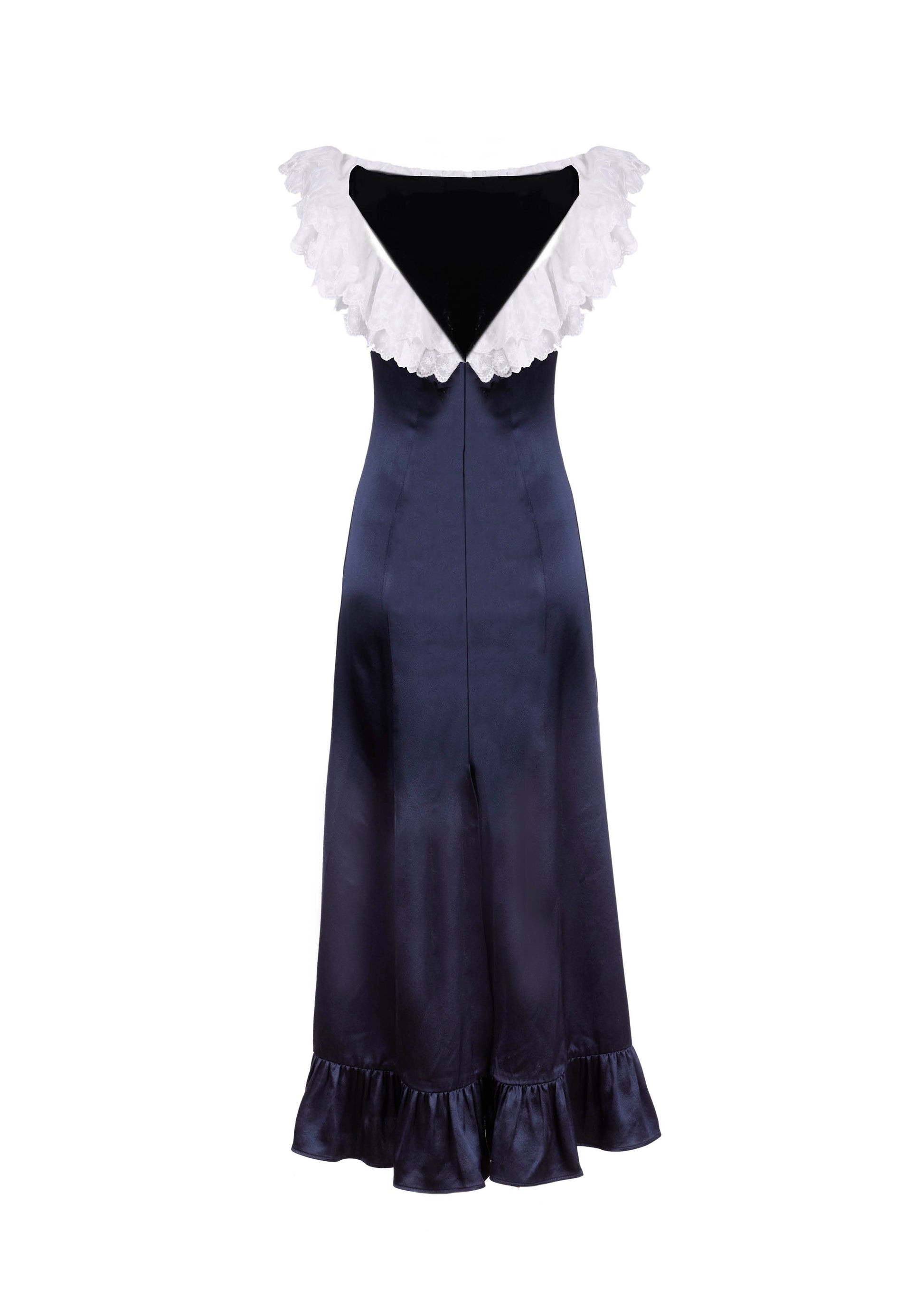 Silk midi dress with Japanese lace neckline and open back with sharp slit. Center back invisible zip closure.